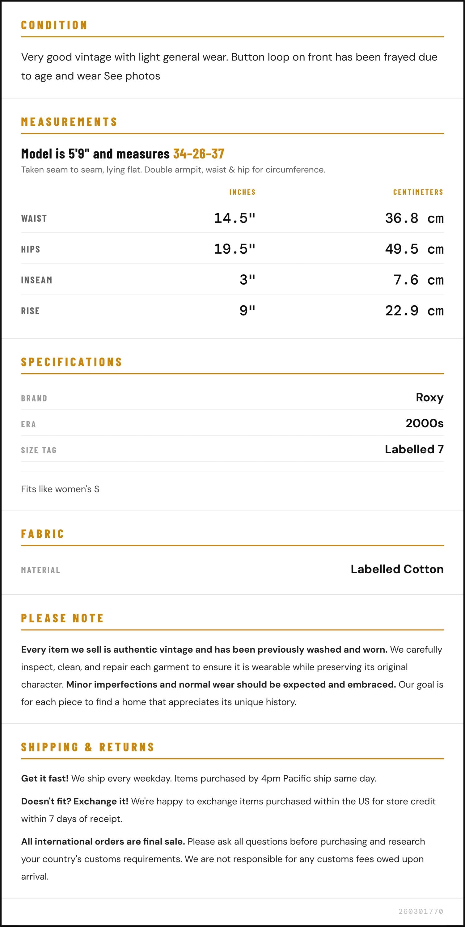 Vintage denim was usually made without any stretch, unlike modern jeans. Check the measurements to ensure proper fit, and remember to give yourself a little wiggle room in the waist and hips, depending on your preferred fit.