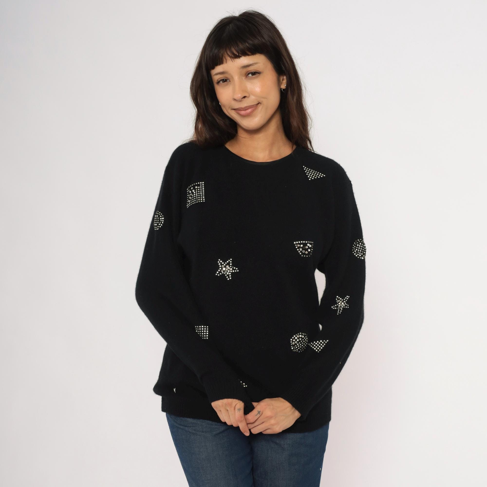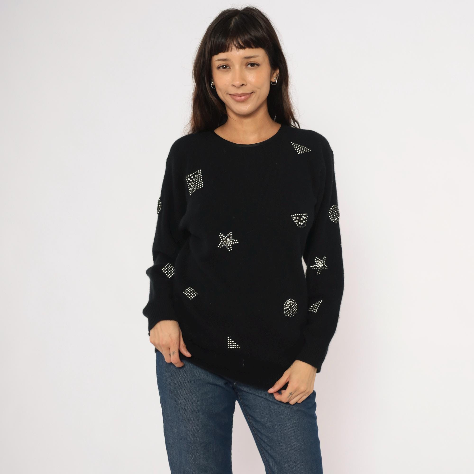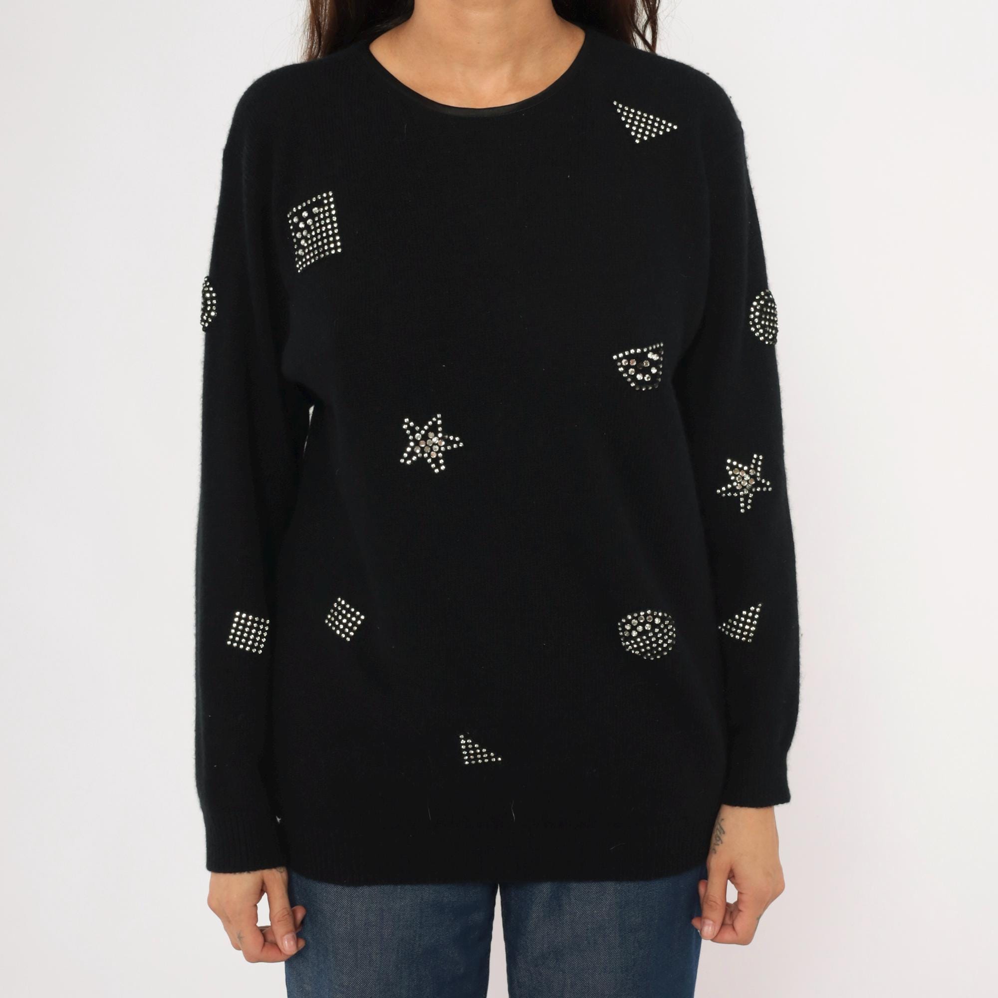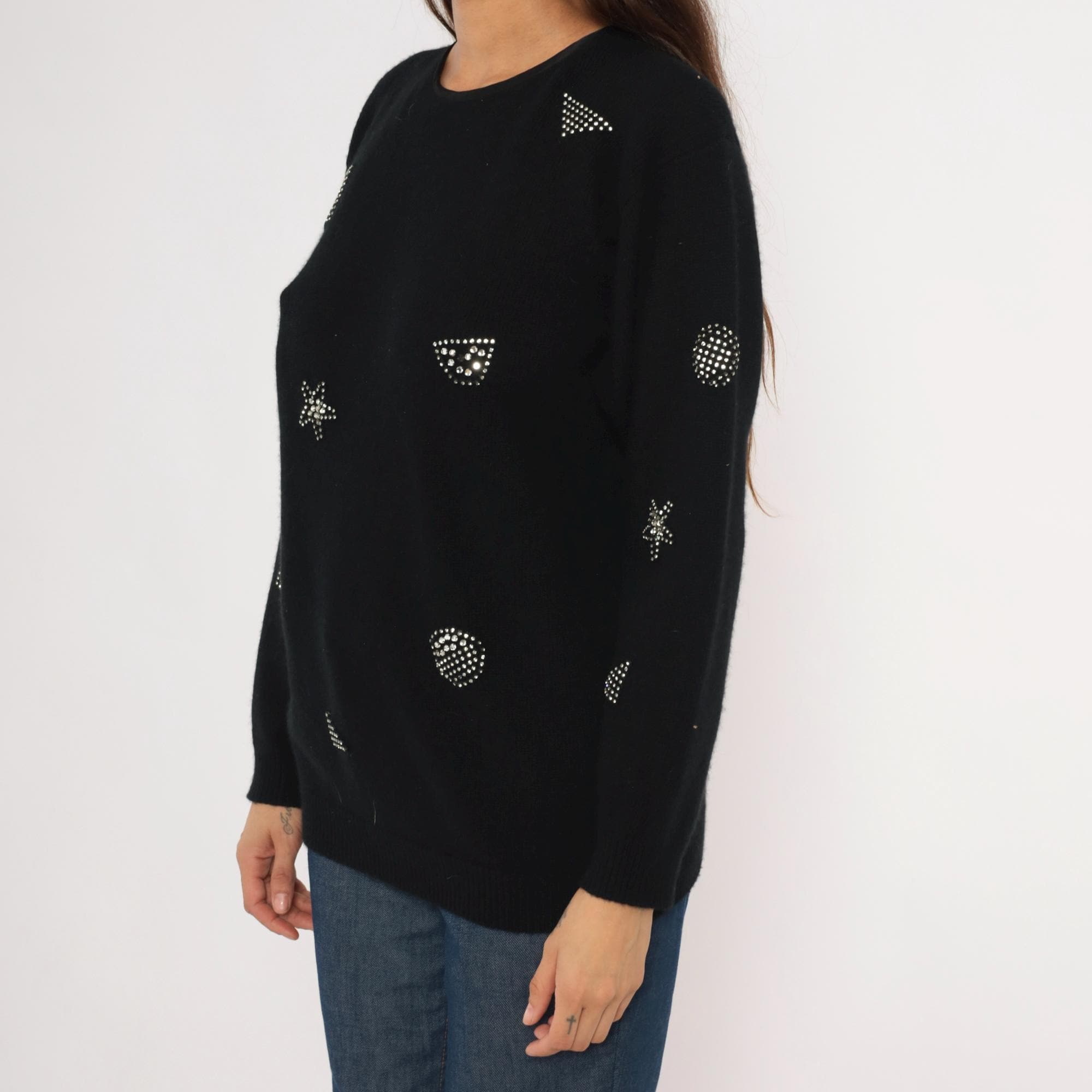 80s black crewneck pullover from Adrienne Vittadini with scattered rhinestone studs arranged in geometric shapes including stars, squares, circles, and triangles across the front, back, and sleeves. Round neckline with button closure at the upper back. Ribbed cuffs and hem, relaxed fit through the body with a slightly longer tunic-length silhouette.