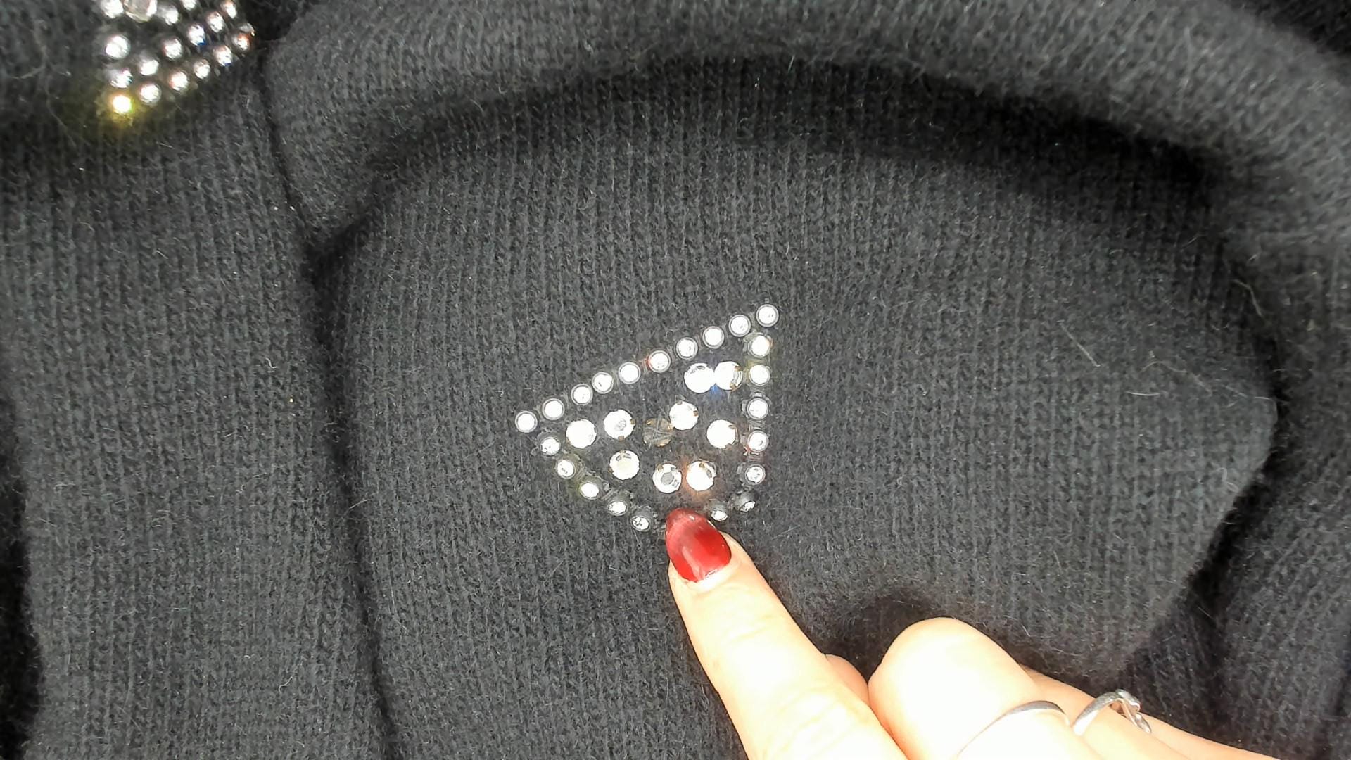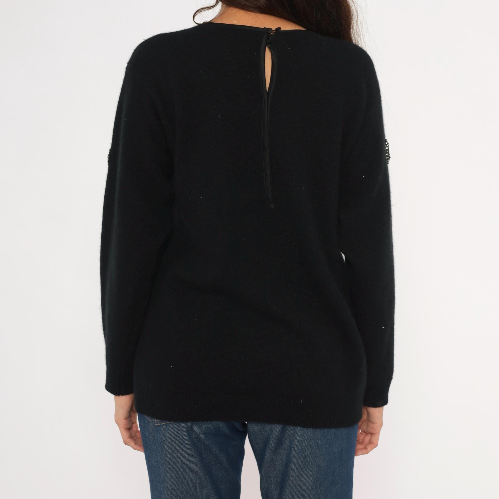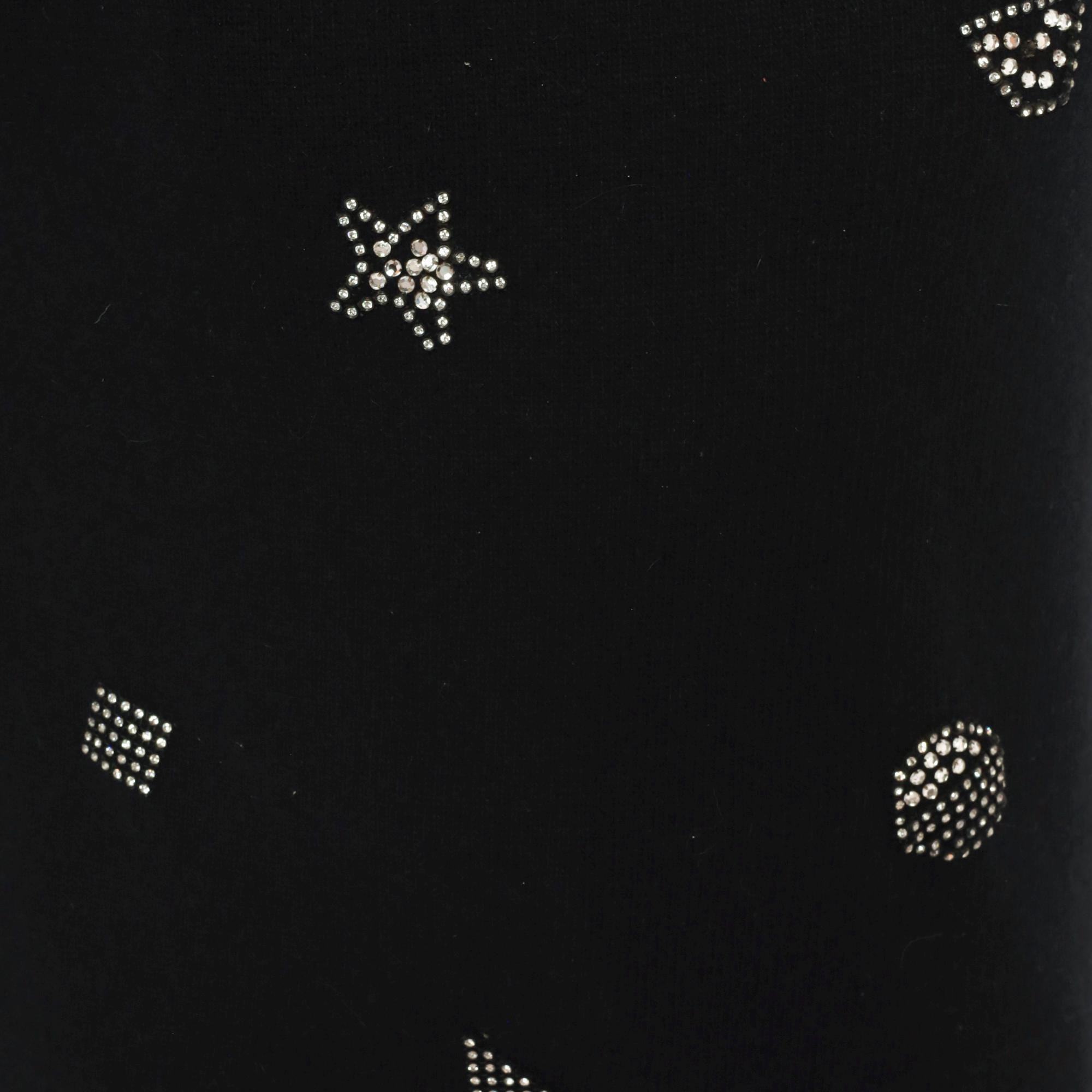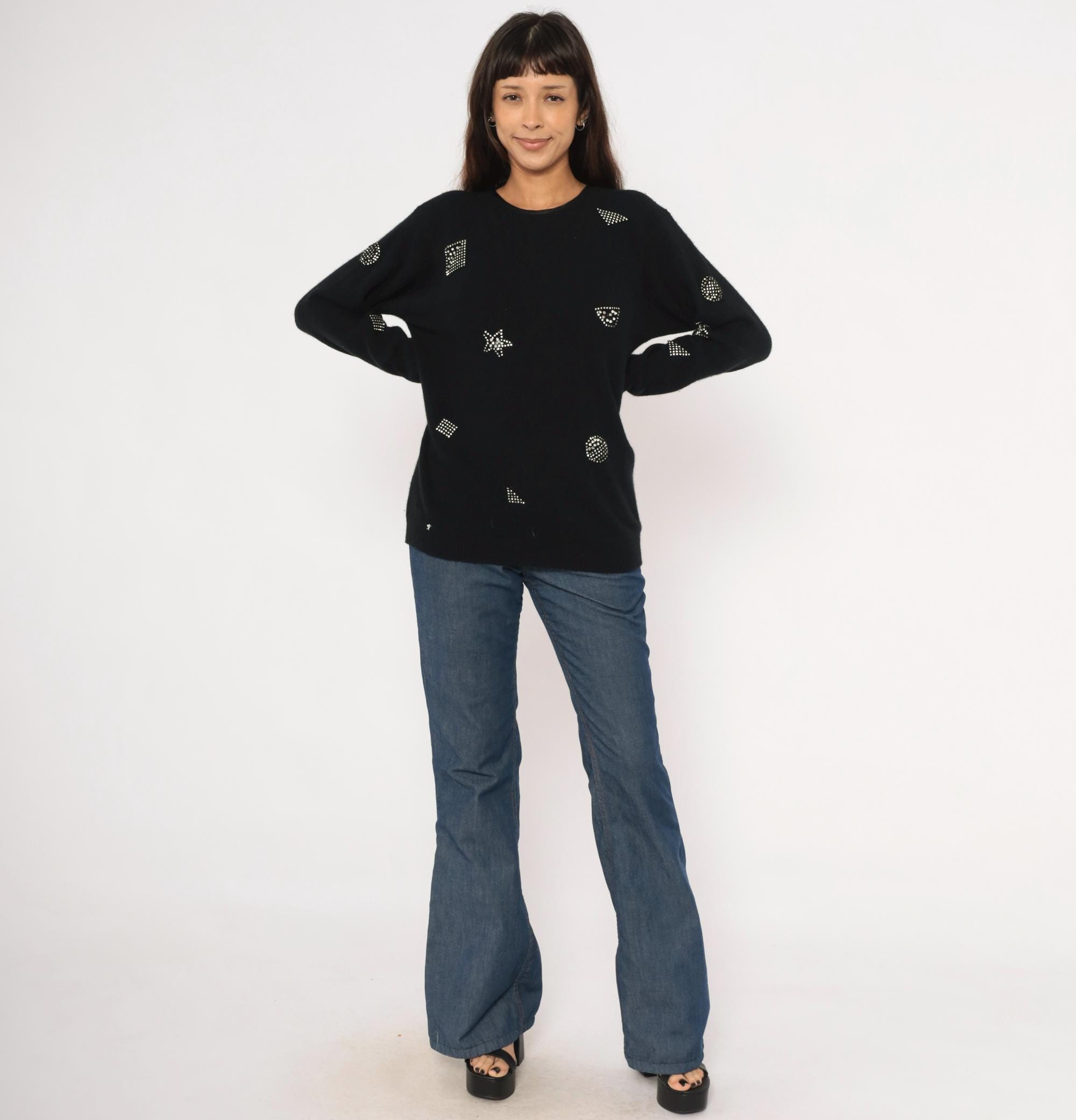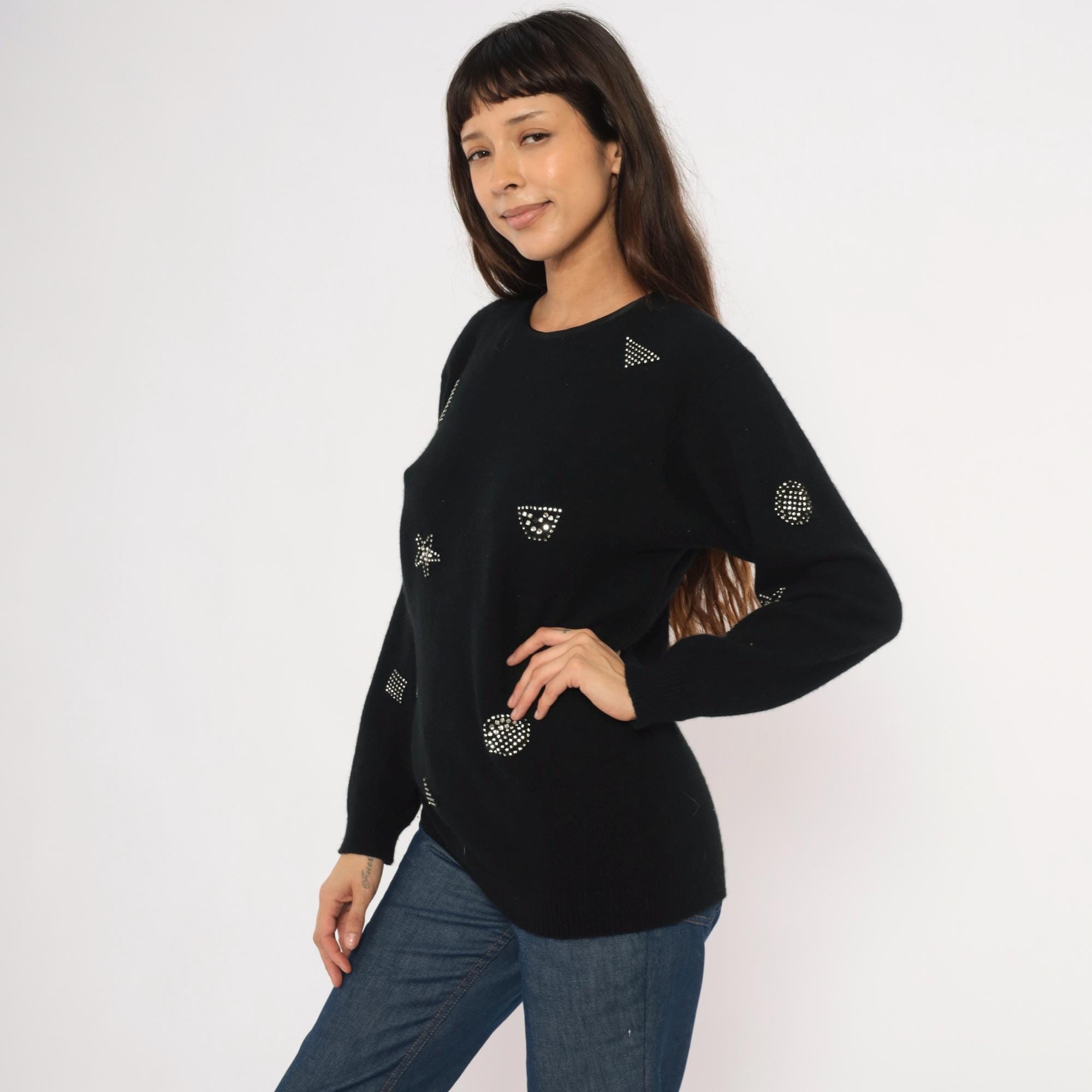 80s black crewneck pullover from Adrienne Vittadini with scattered rhinestone studs arranged in geometric shapes including stars, squares, circles, and triangles across the front, back, and sleeves. Round neckline with button closure at the upper back. Ribbed cuffs and hem, relaxed fit through the body with a slightly longer tunic-length silhouette.