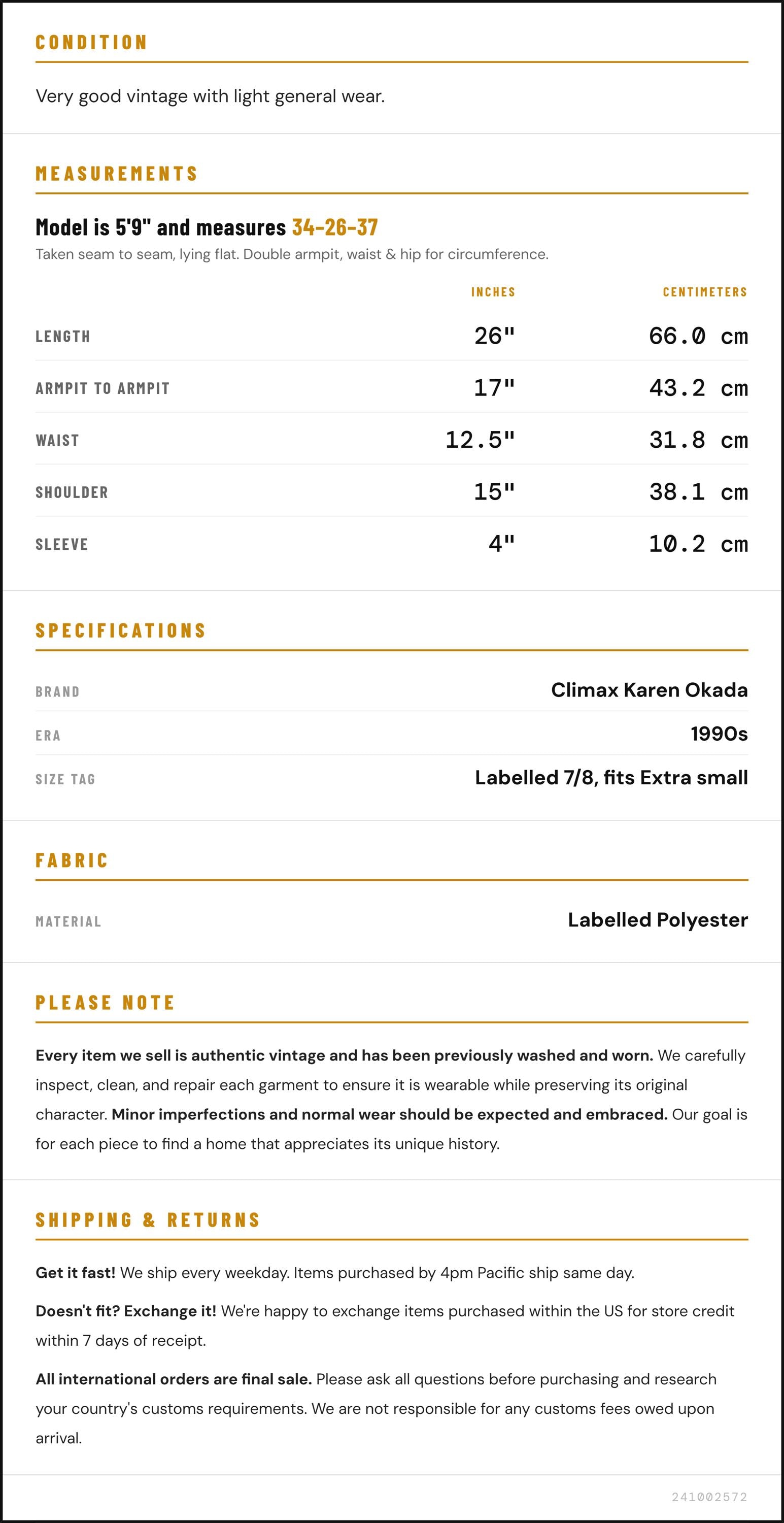 Measurements are taken laying flat and should be doubled where applicable. The "best fits" size is just an estimate, and vintage sizing can vary from modern sizing. Please use measurements to ensure proper fit. The best thing to do is measure a similar item of your own, and compare. When an item has stretch, we will list the unstretched dimensions with the stretched measurement afterwards.