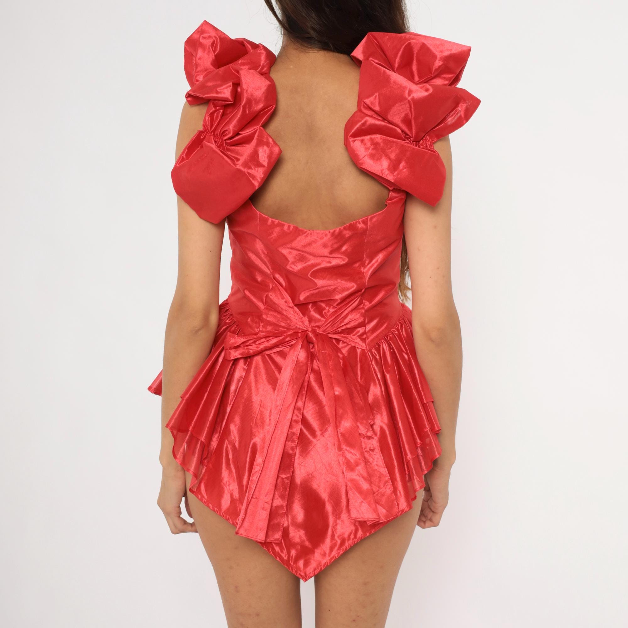 90s red satin corset-style top from Climax Karen Okada with a sweetheart neckline and structured fitted bodice. Large sculptural ruffle shoulder straps, rhinestone-look button front closure, and a pointed peplum hem with gathered ruffle detail at the waist. Open back with a tie closure at the lower back.