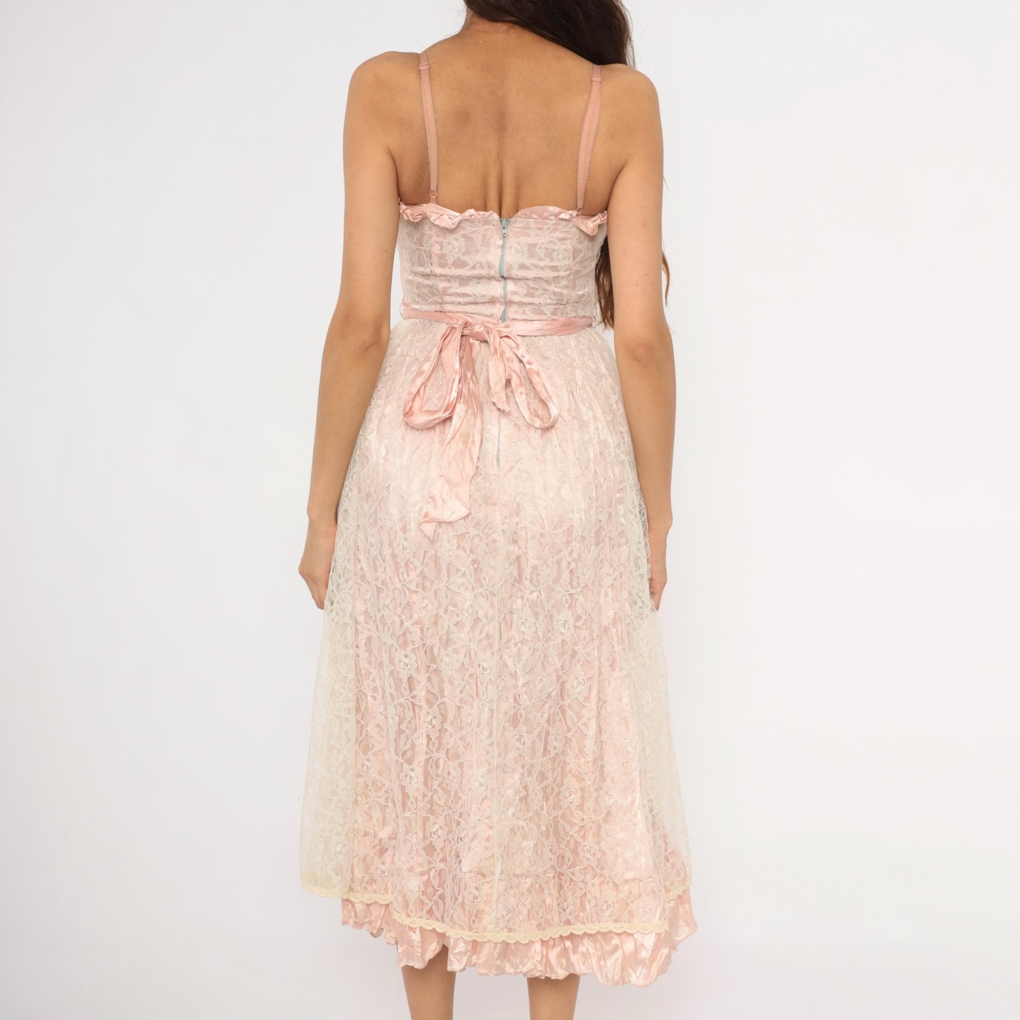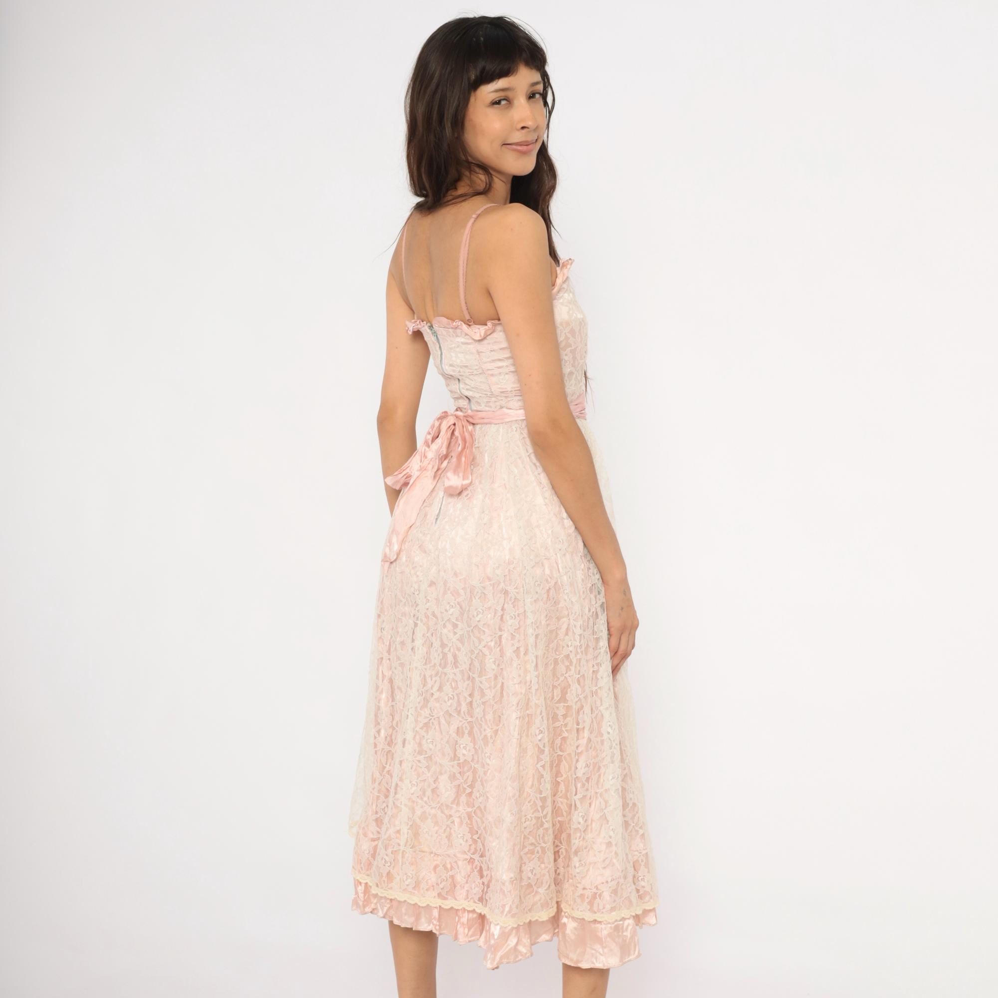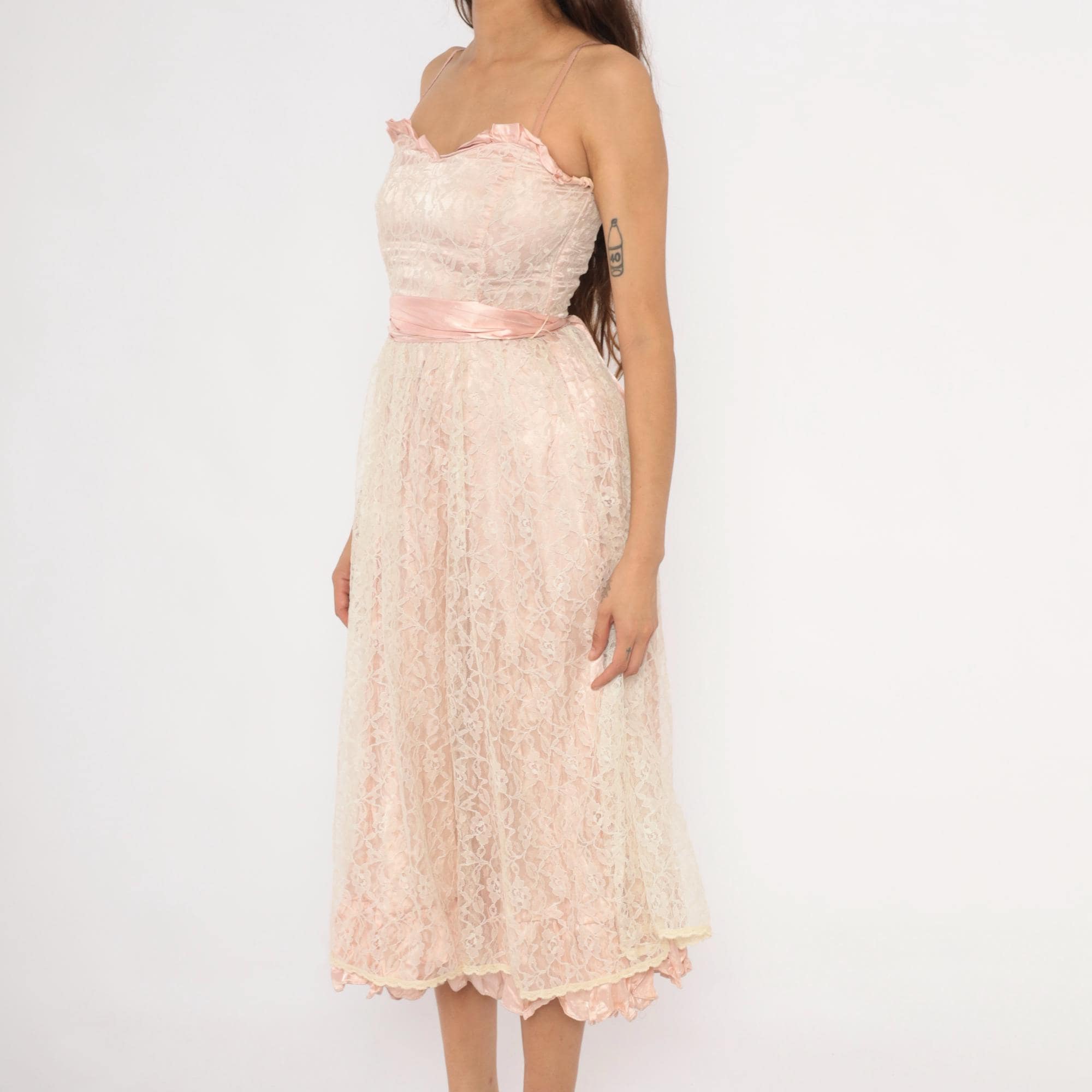 60s blush pink lace midi dress with a sweetheart neckline trimmed in satin ruffles and thin spaghetti straps. Fitted bodice with a wide satin waistband that ties into a bow at the back, and a back zipper closure.