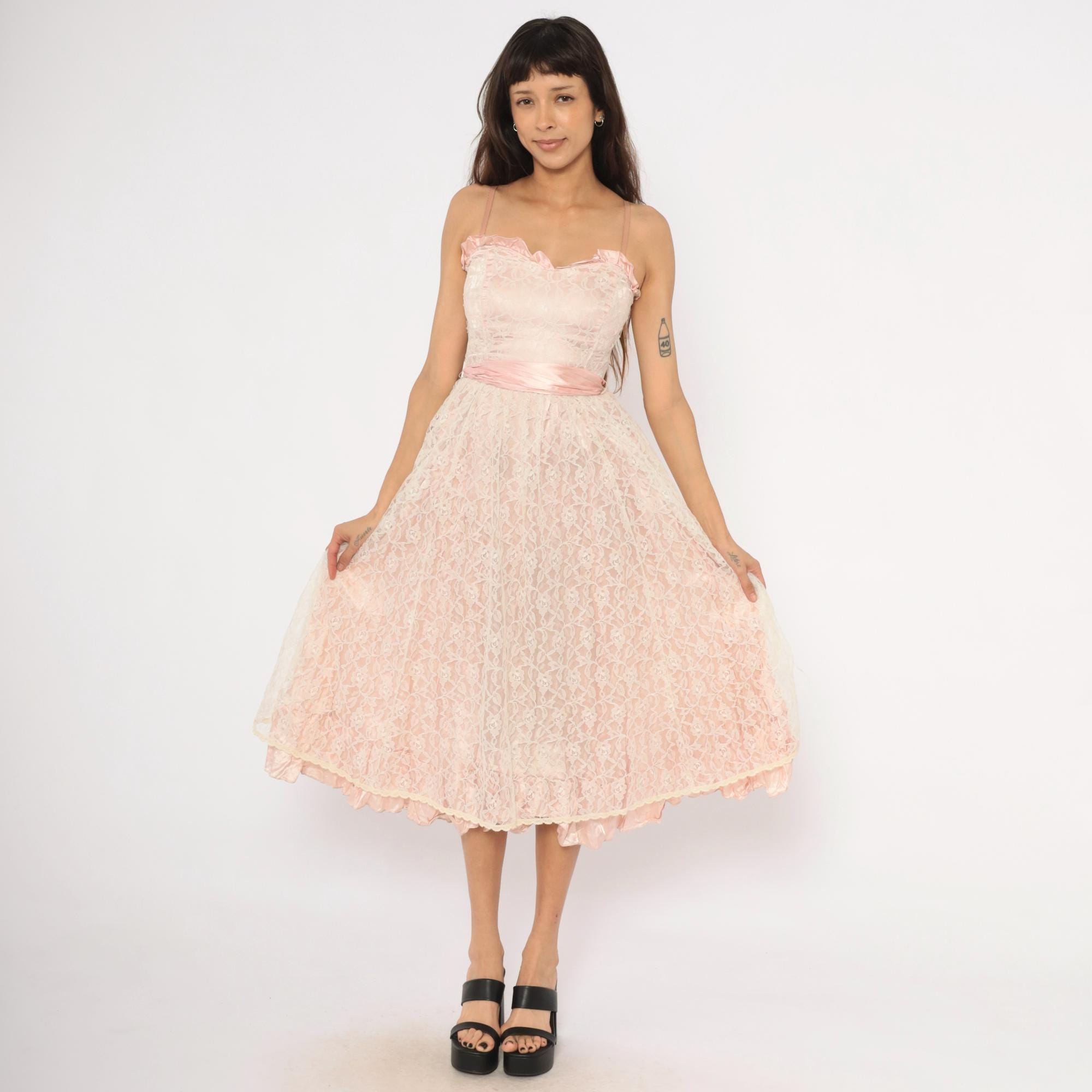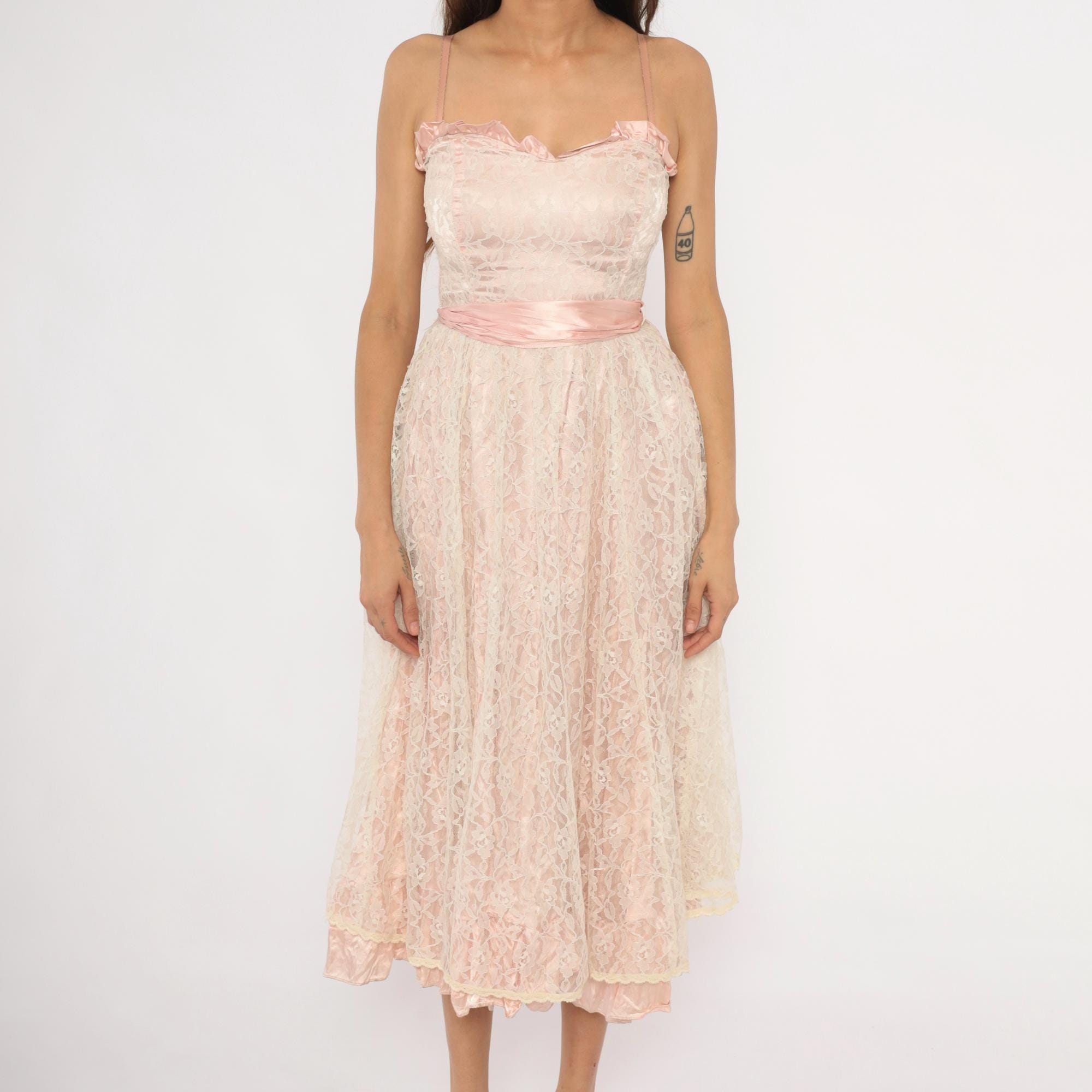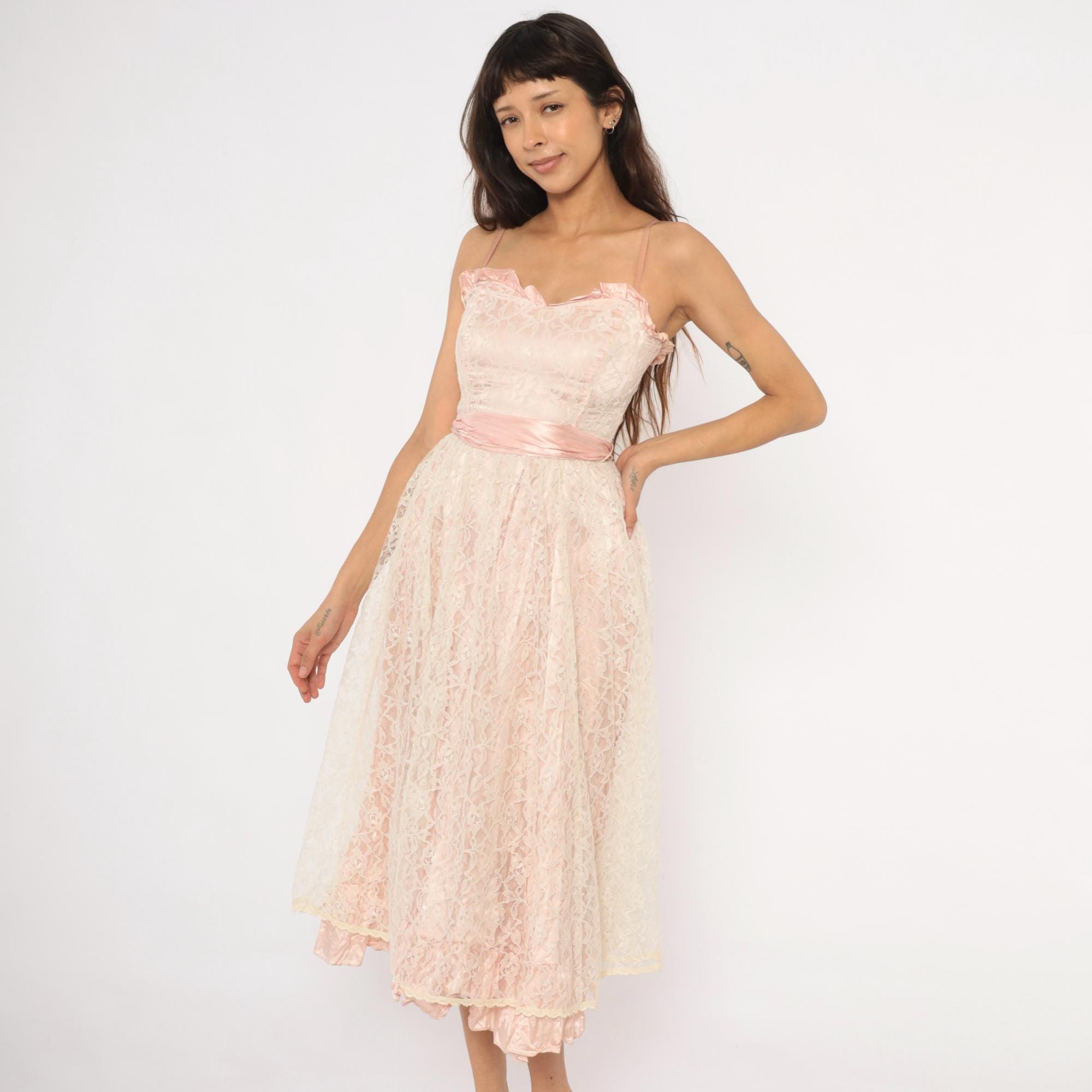 60s blush pink lace midi dress with a sweetheart neckline trimmed in satin ruffles and thin spaghetti straps. Fitted bodice with a wide satin waistband that ties into a bow at the back, and a back zipper closure.