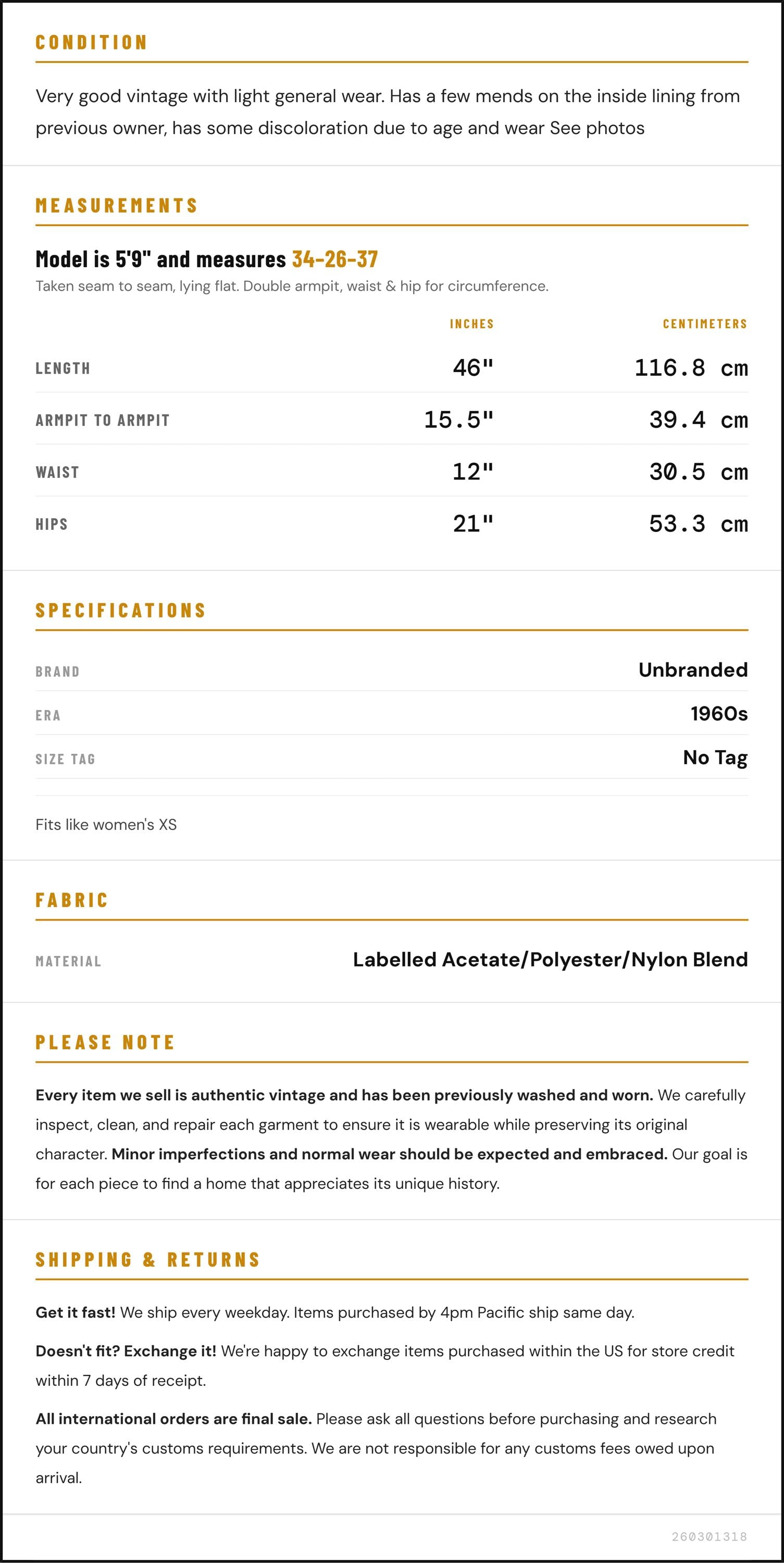 Taken from seam to seam while the garment is lying flat. Double the armpit, waist, and hip measurements.