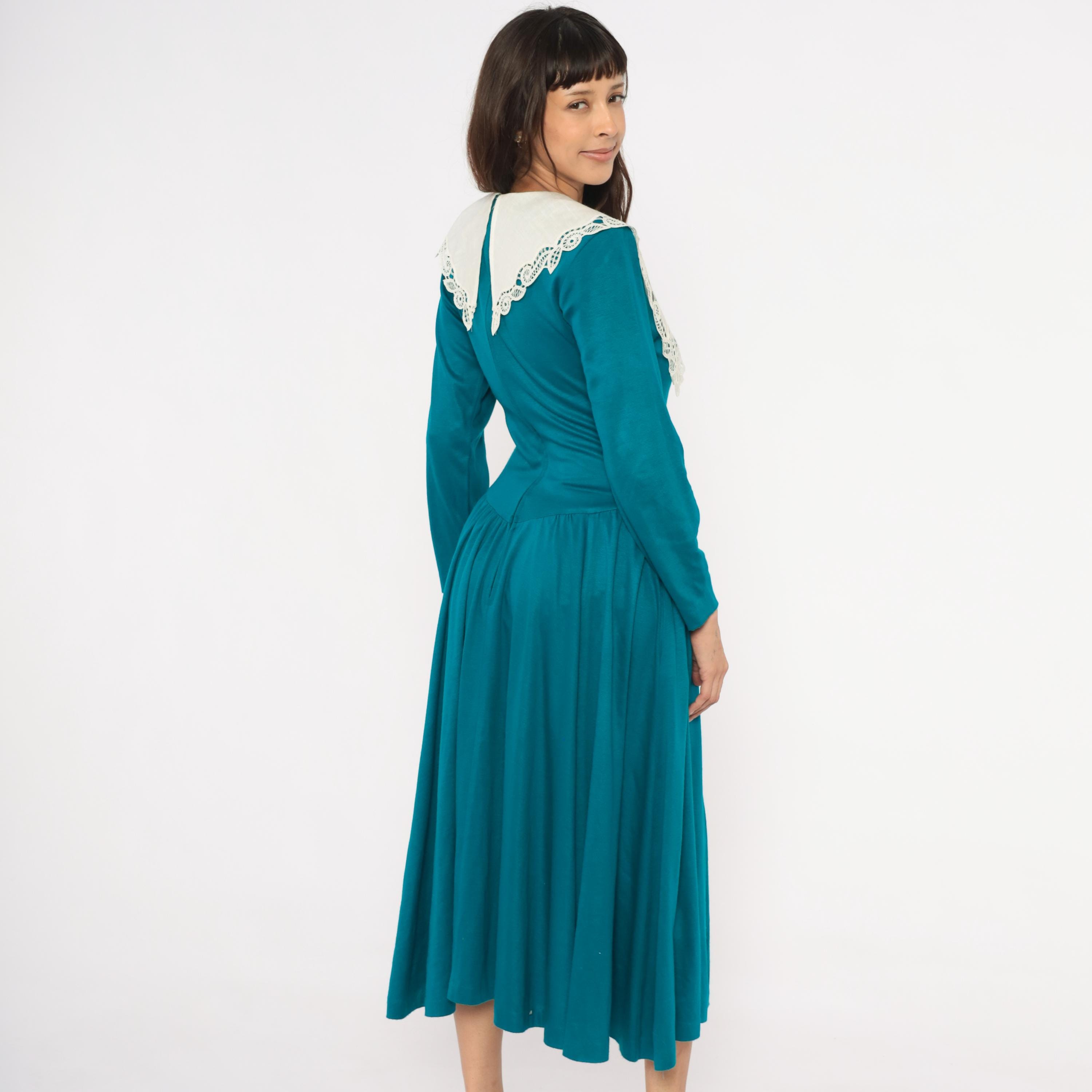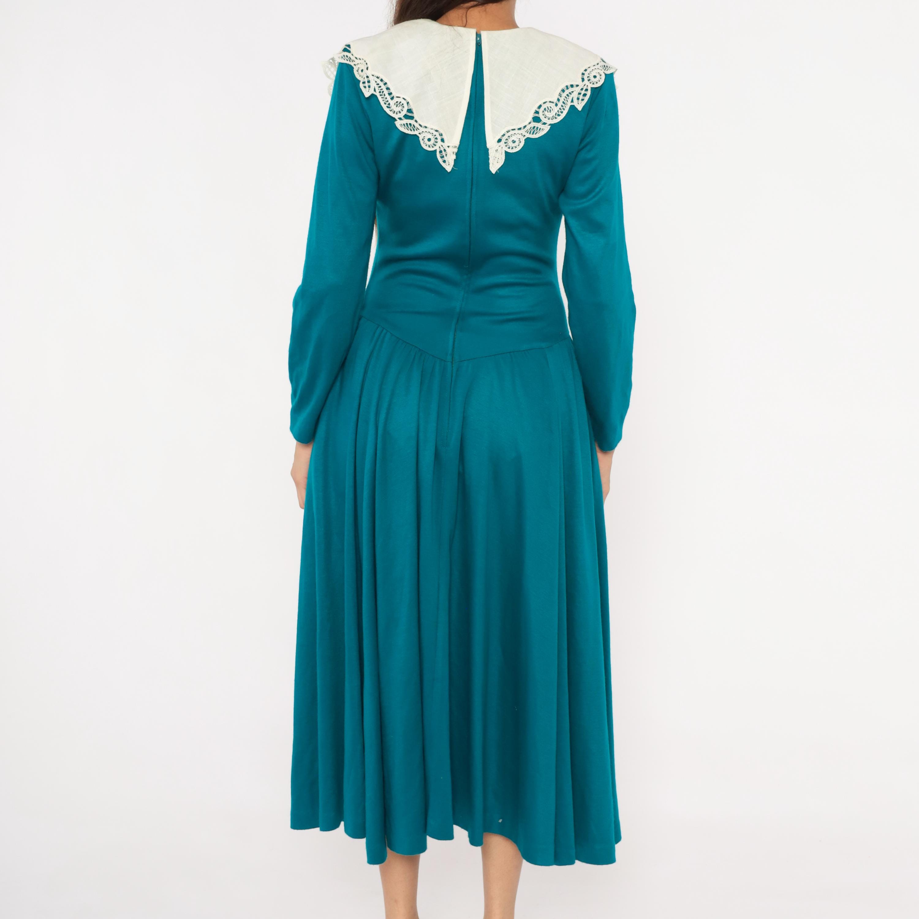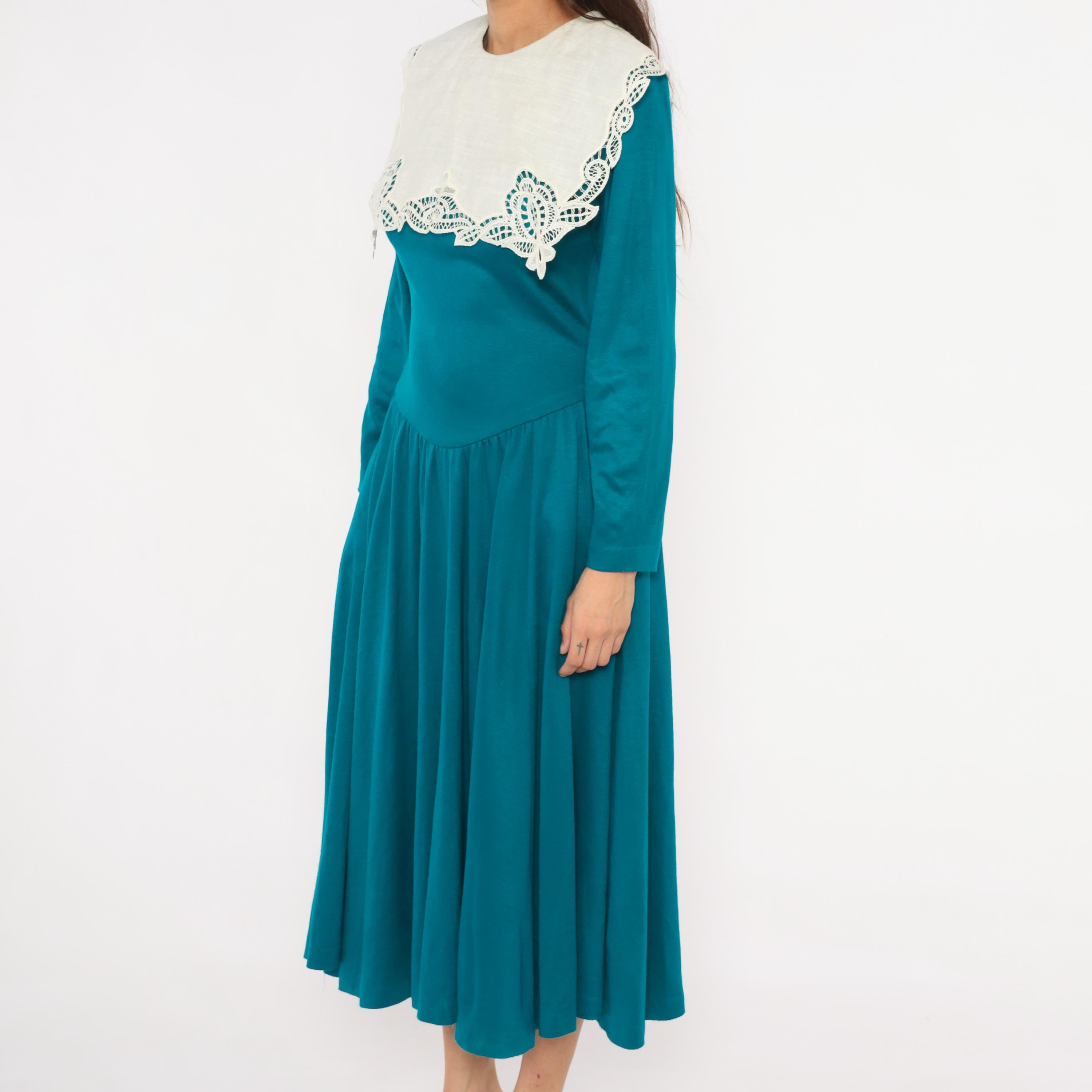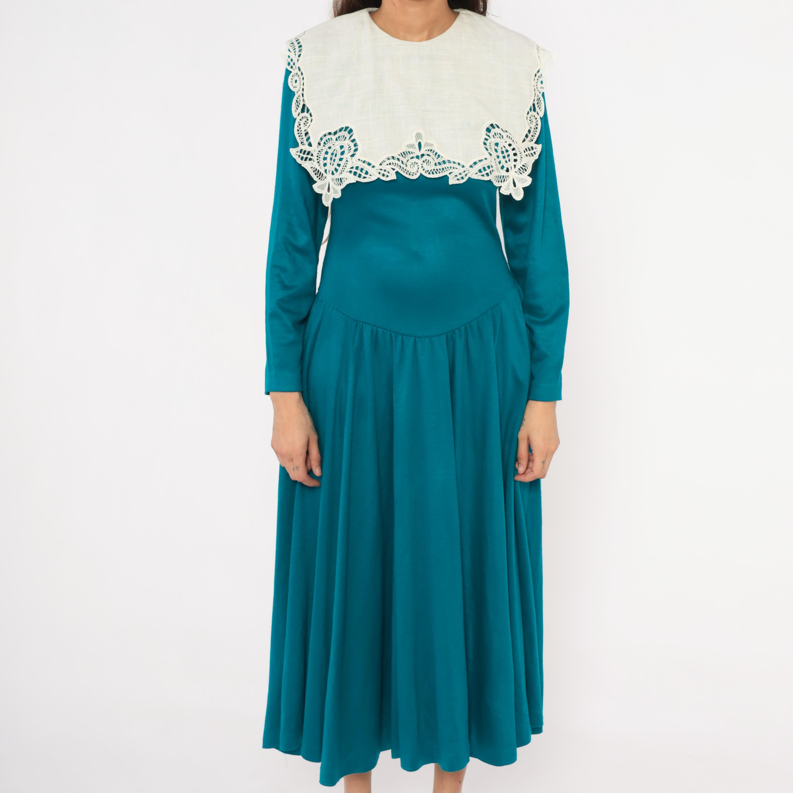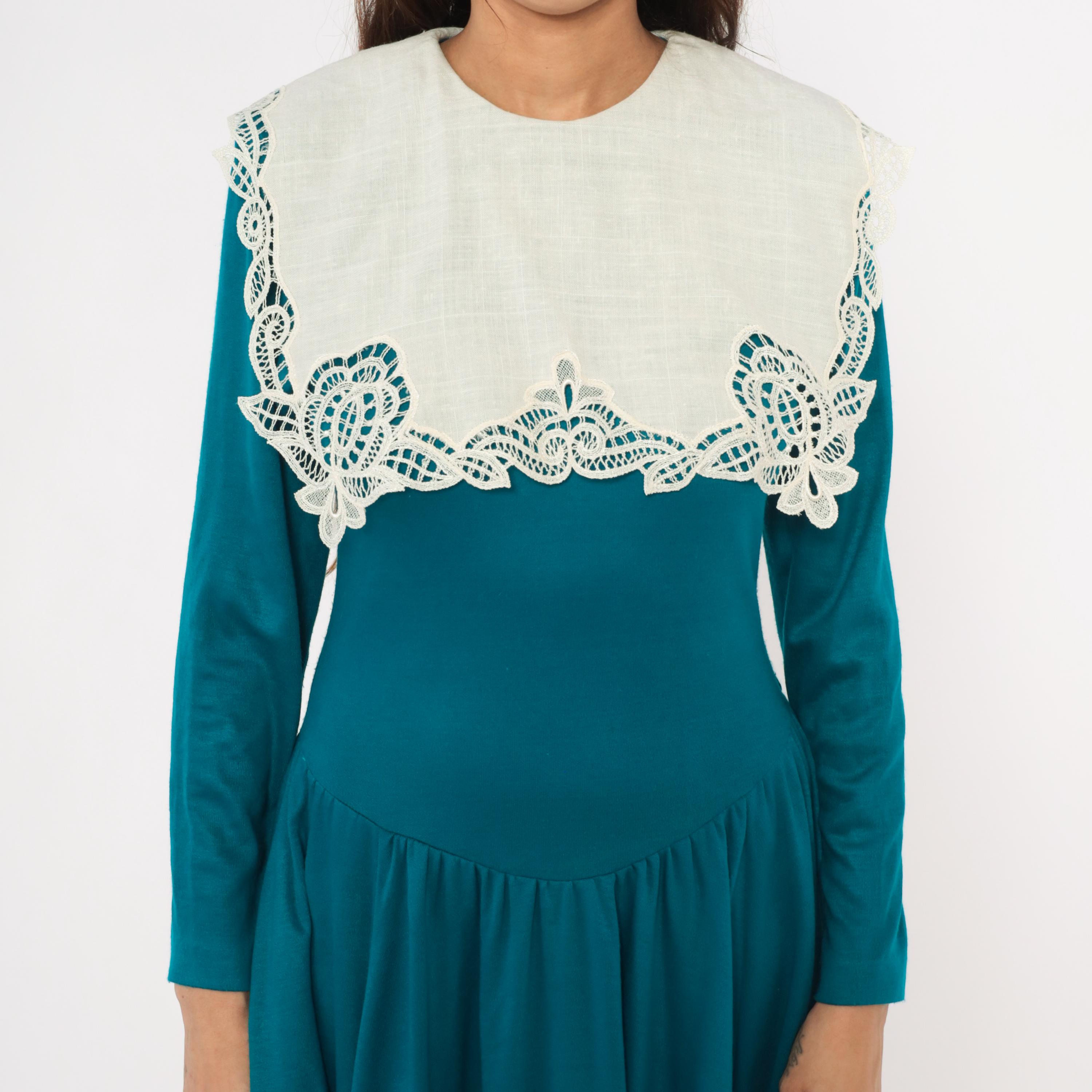 80s teal dress from Expo with an oversized cream bib collar trimmed in scalloped cutwork lace along the edges. Fitted bodice with long sleeves, dropped waist, and a gathered full skirt falling to mid-calf length. Back zipper closure and side seam pockets.