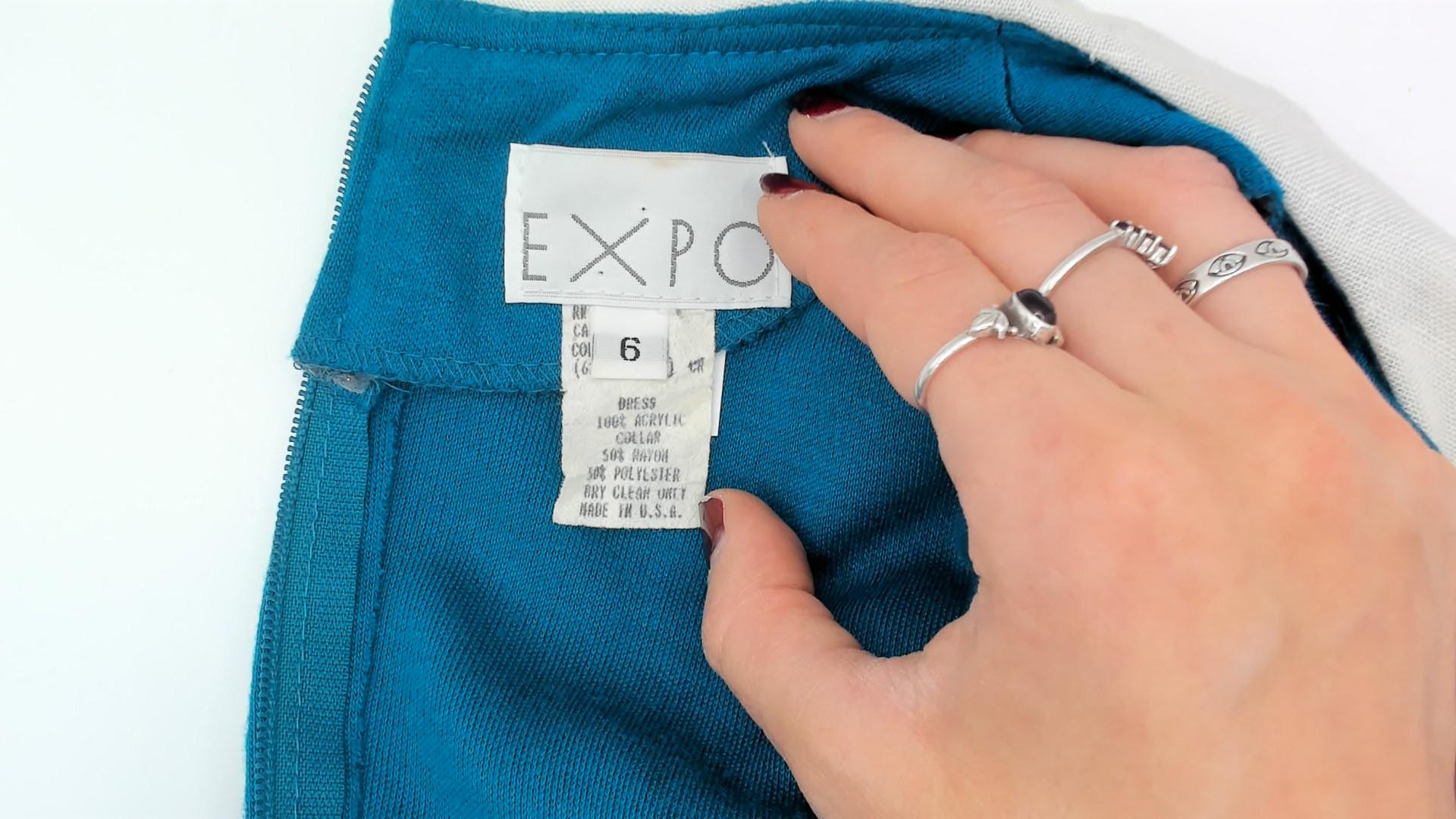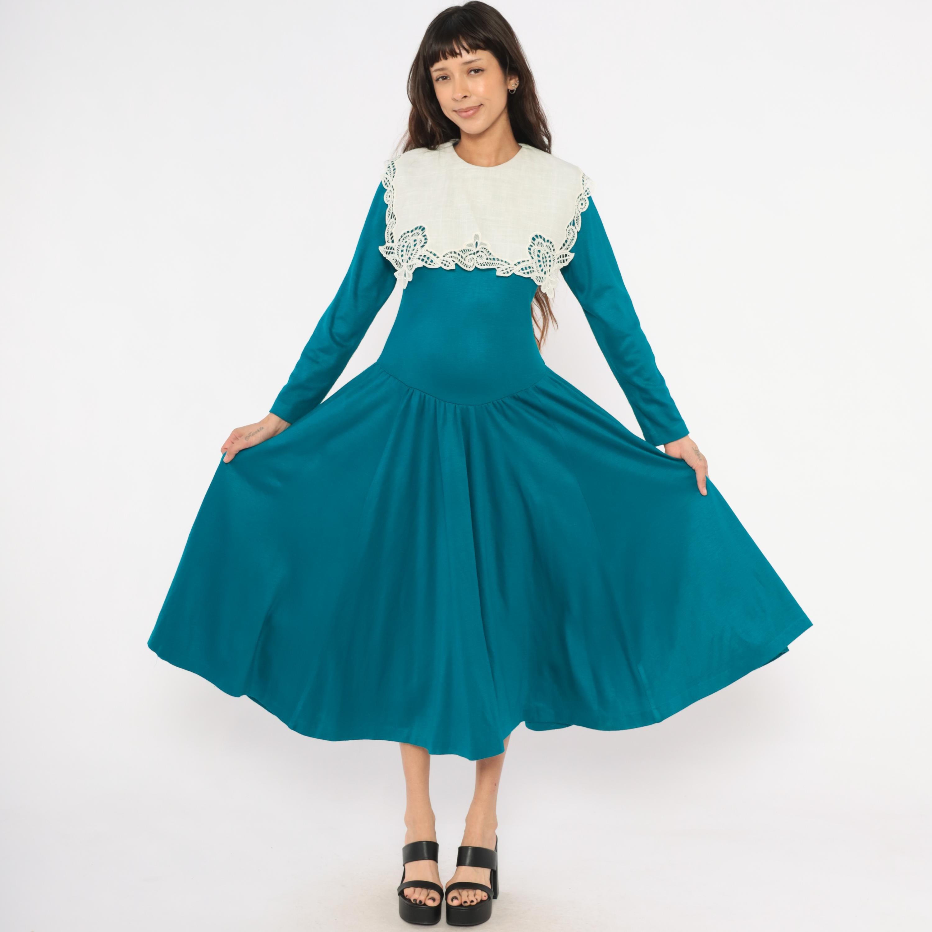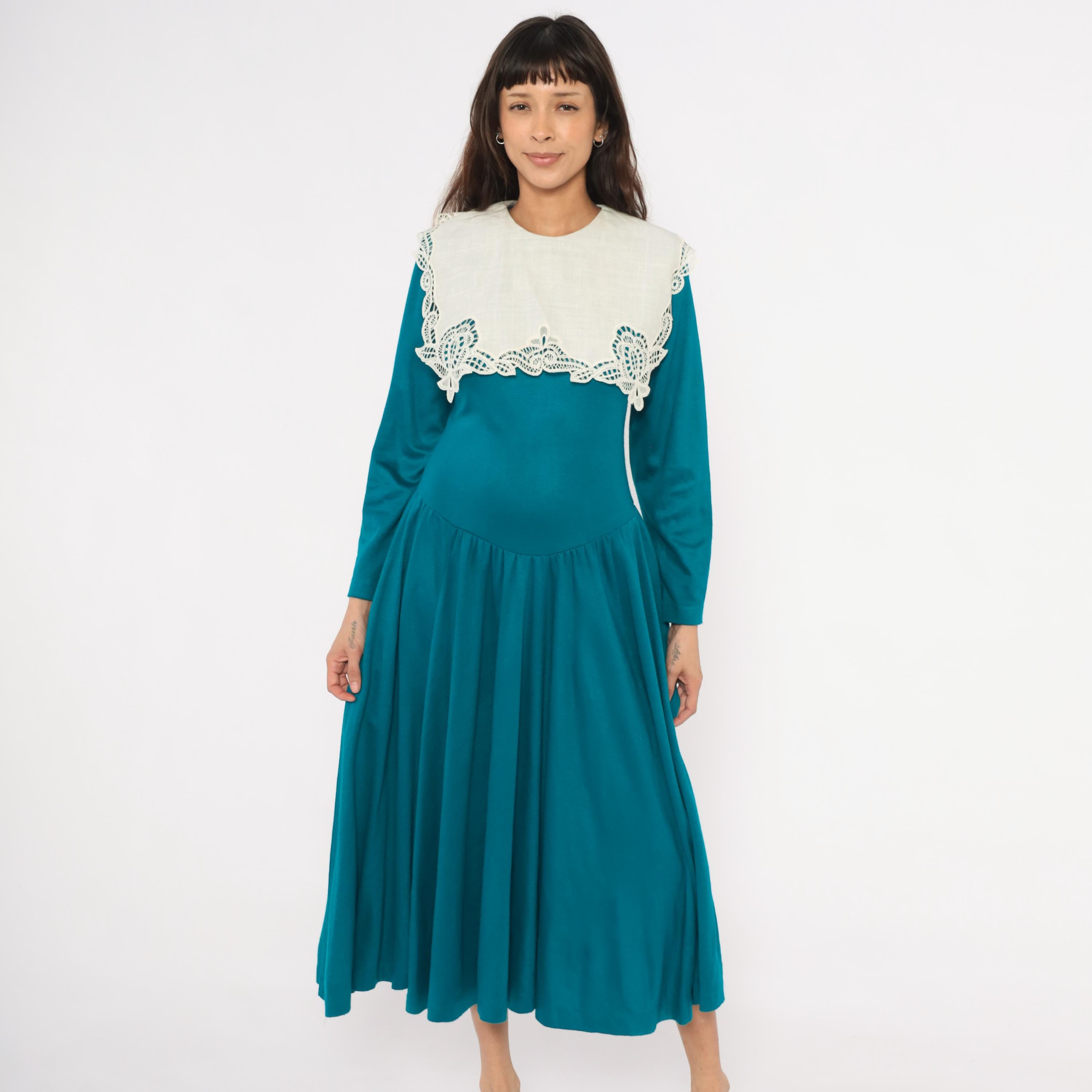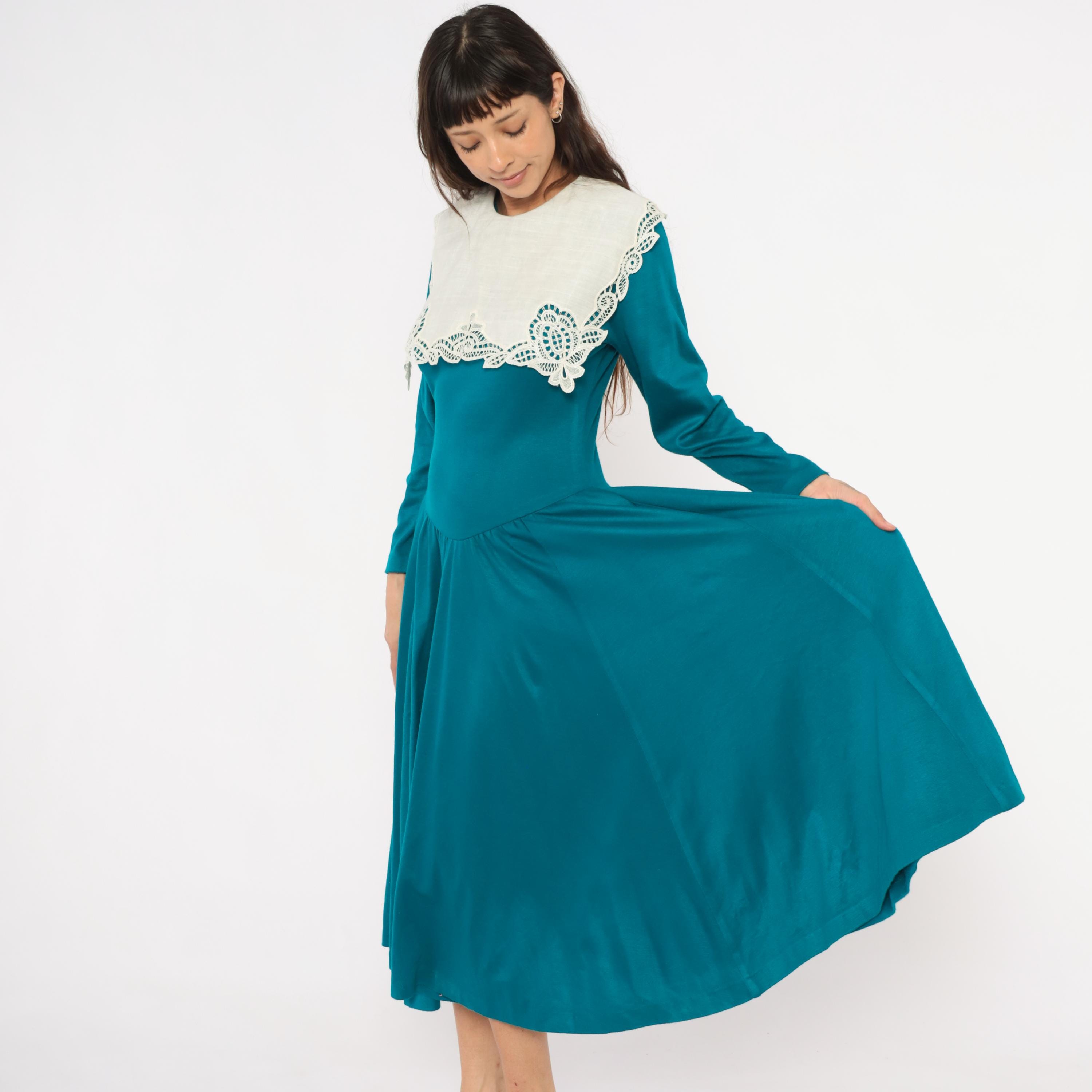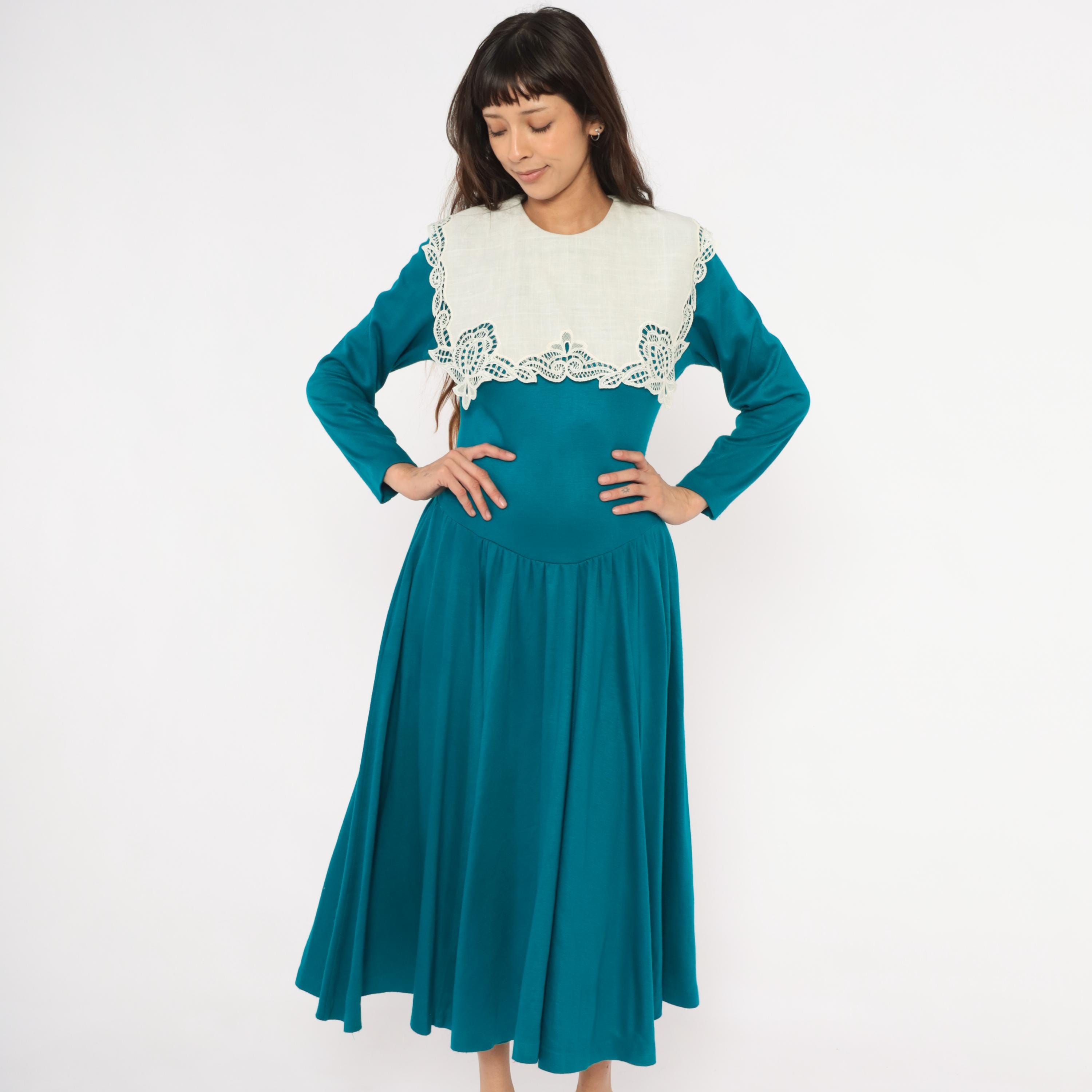 80s teal dress from Expo with an oversized cream bib collar trimmed in scalloped cutwork lace along the edges. Fitted bodice with long sleeves, dropped waist, and a gathered full skirt falling to mid-calf length. Back zipper closure and side seam pockets.
