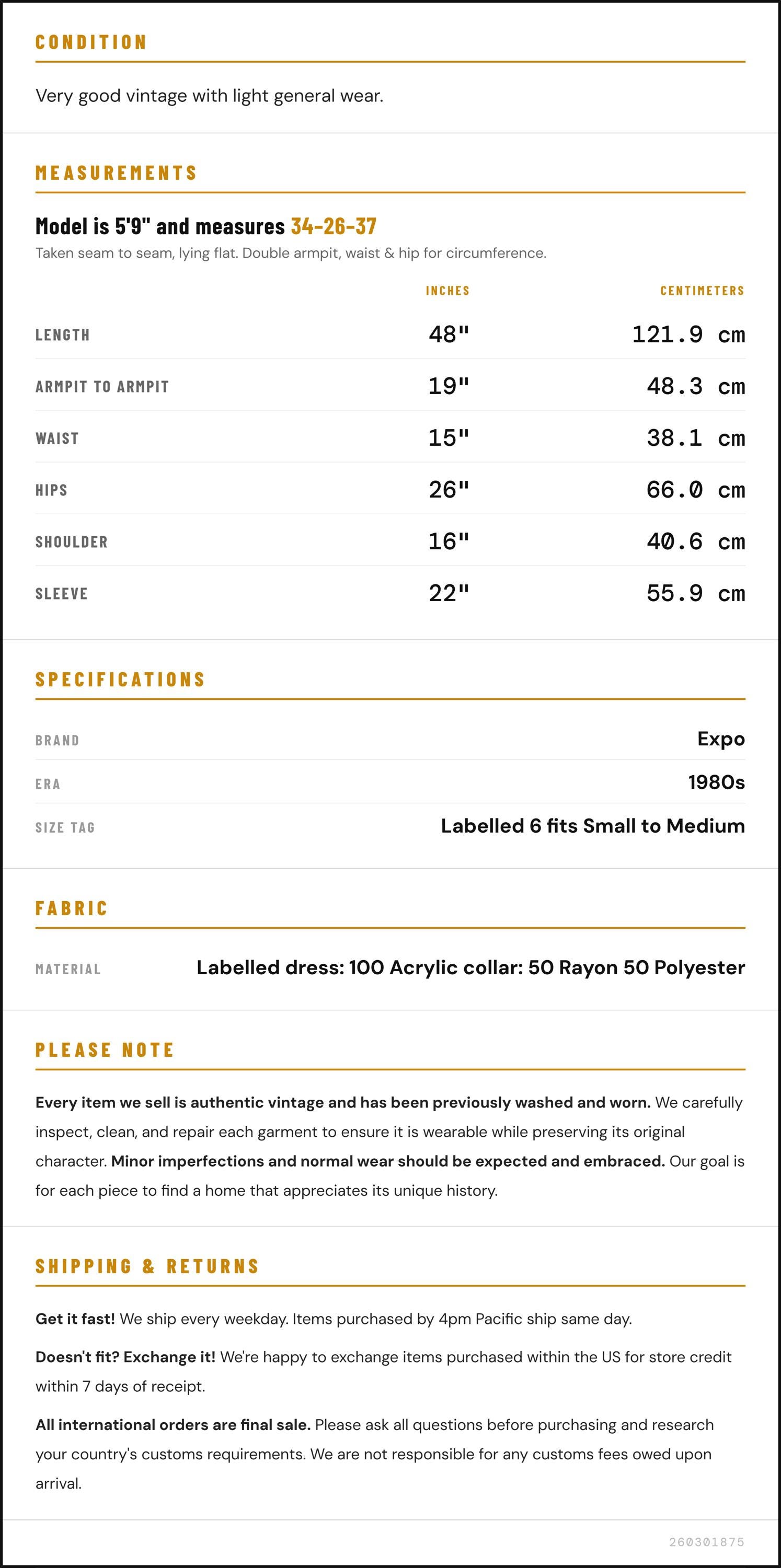 Material: Labelled dress: 100 Acrylic collar: 50 Rayon 50 Polyester