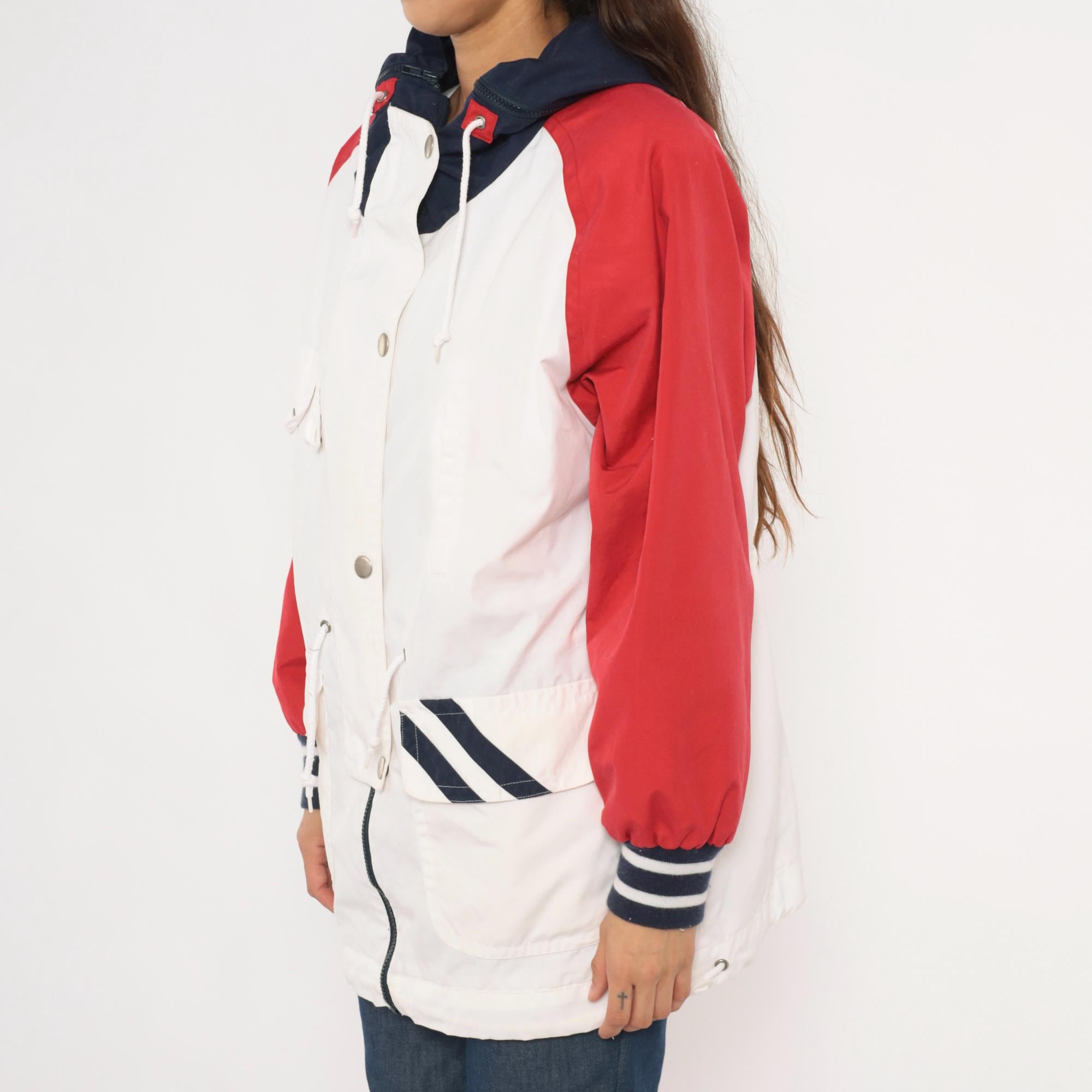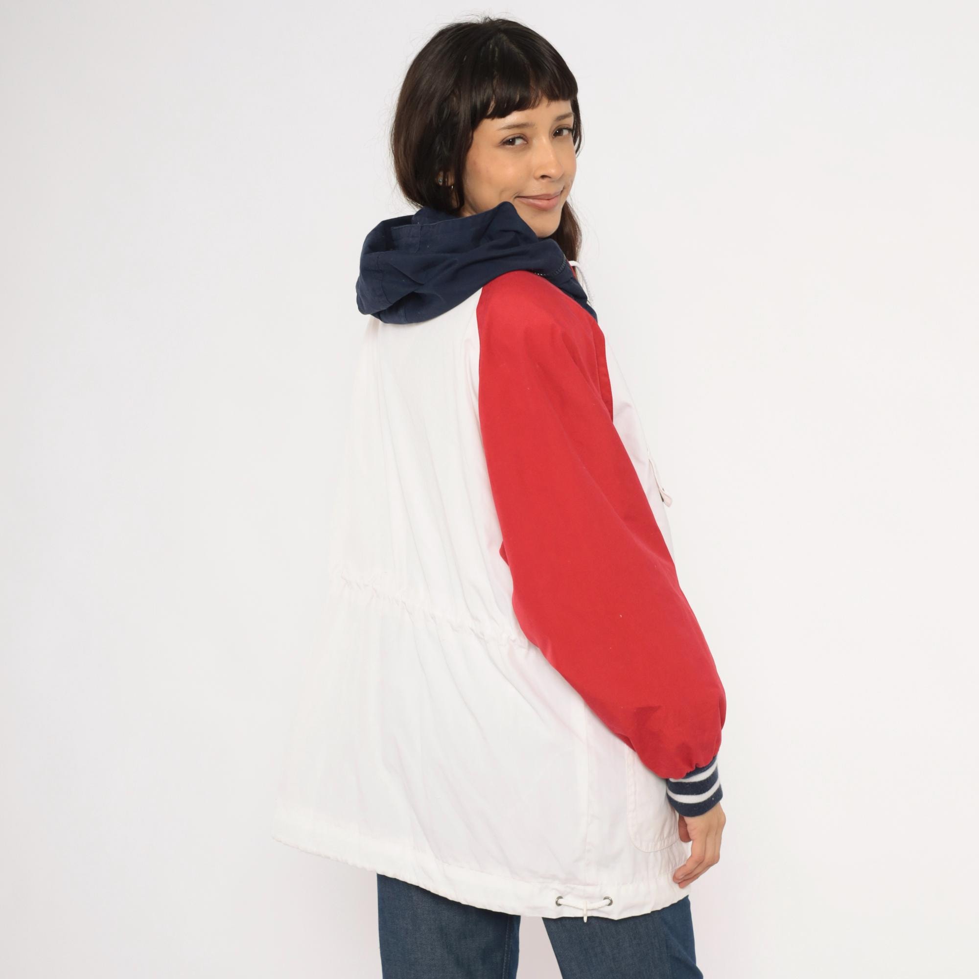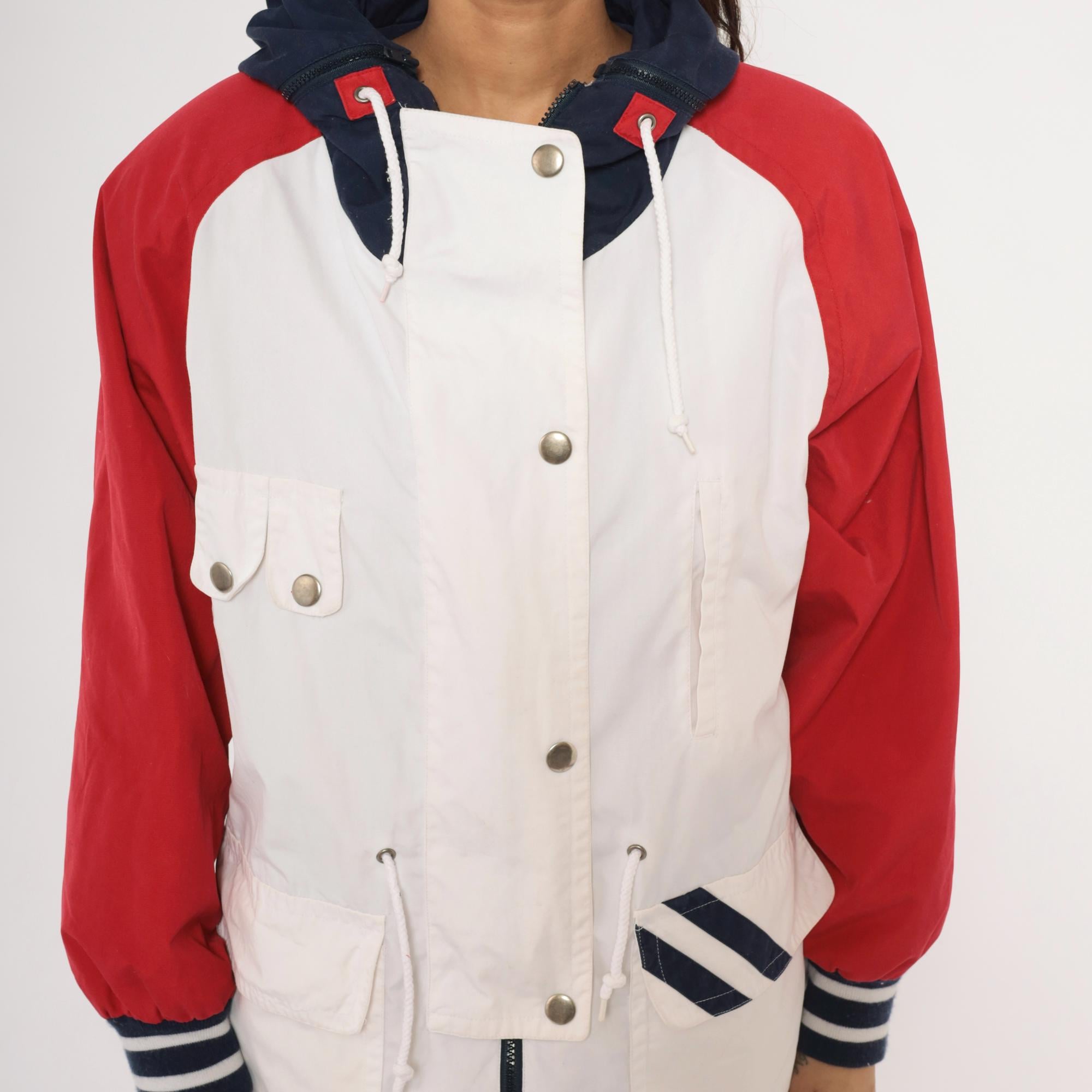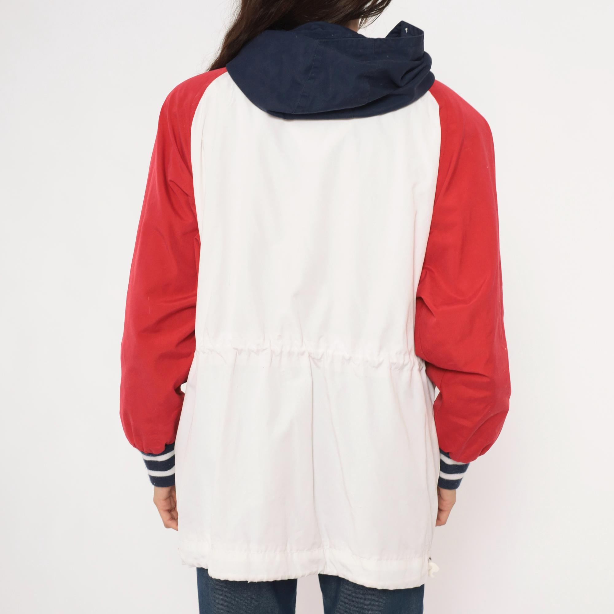 90s colorblock windbreaker from Mulberry Street with a white body, red raglan sleeves, and a navy hood with drawstring closure. Snap front placket over a full-length zipper, chest flap pocket, and lower patch pockets with snap closures. Drawstring cinch at the waist, navy and white striped ribbed cuffs, and red tab details at the hood attachment points.