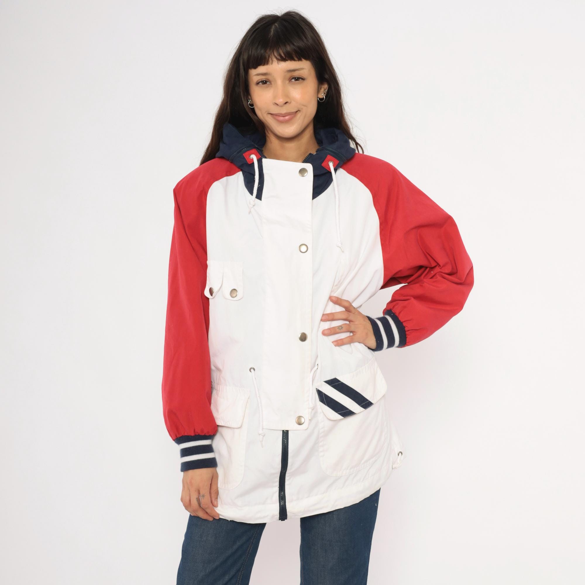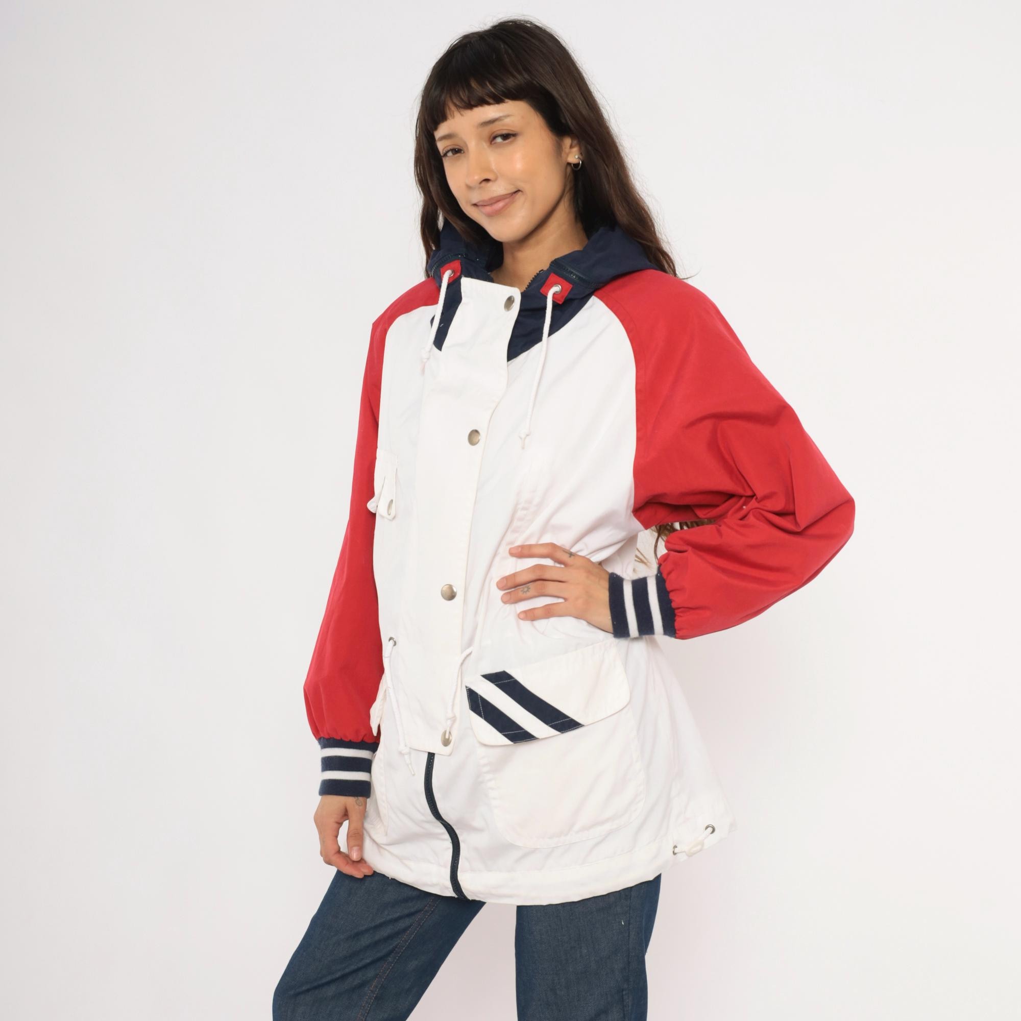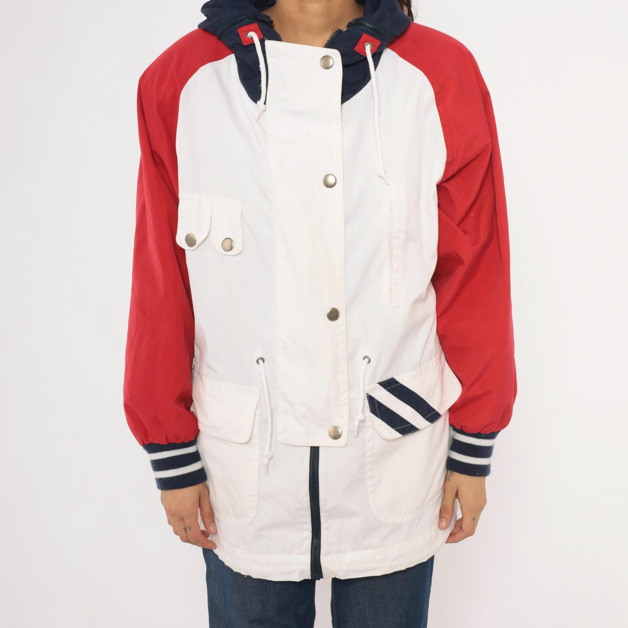90s colorblock windbreaker from Mulberry Street with a white body, red raglan sleeves, and a navy hood with drawstring closure. Snap front placket over a full-length zipper, chest flap pocket, and lower patch pockets with snap closures. Drawstring cinch at the waist, navy and white striped ribbed cuffs, and red tab details at the hood attachment points.