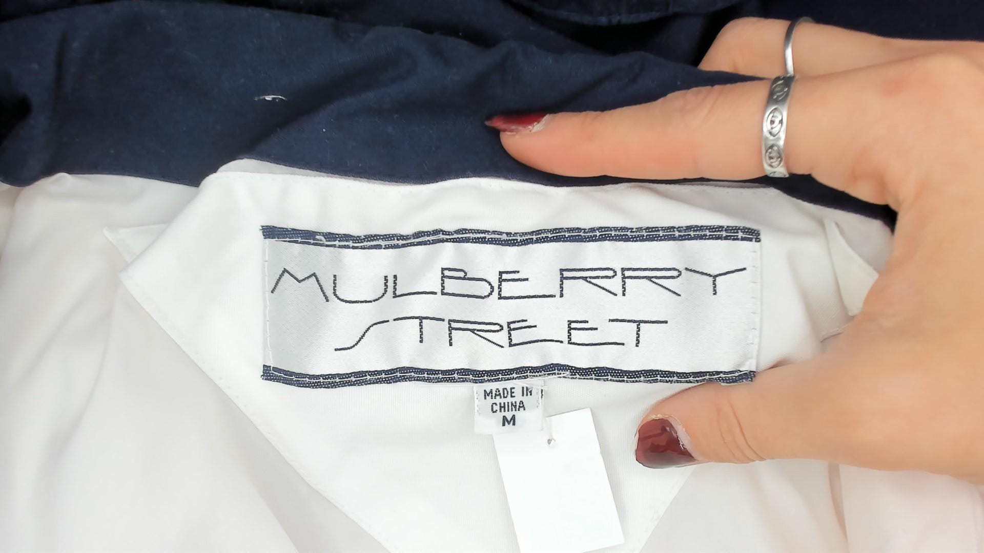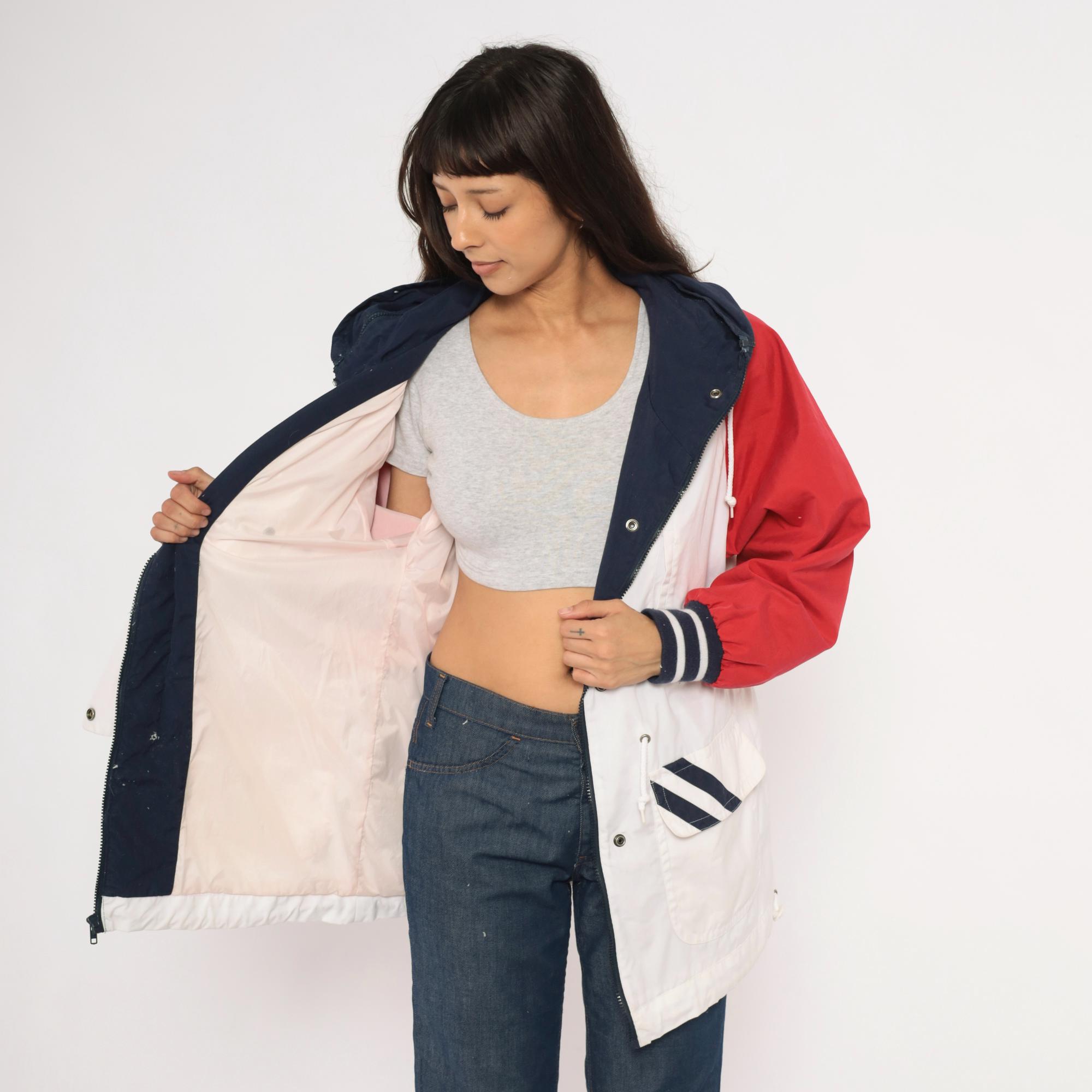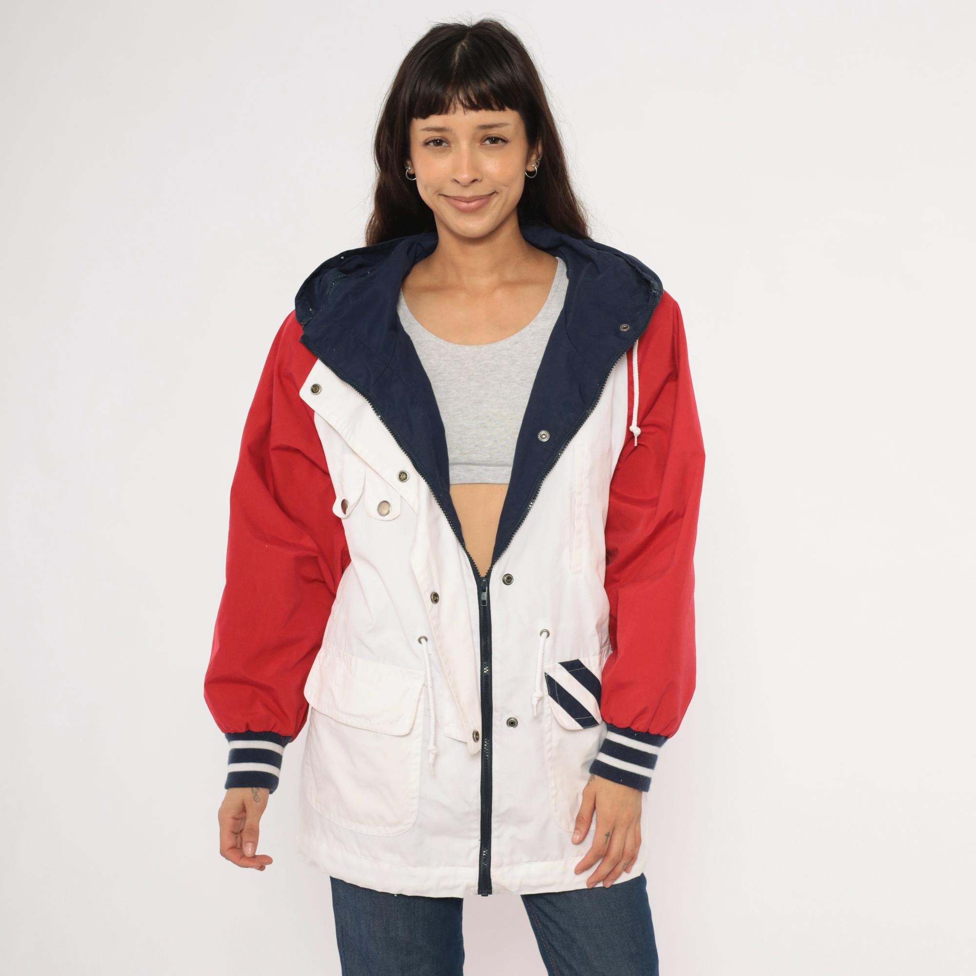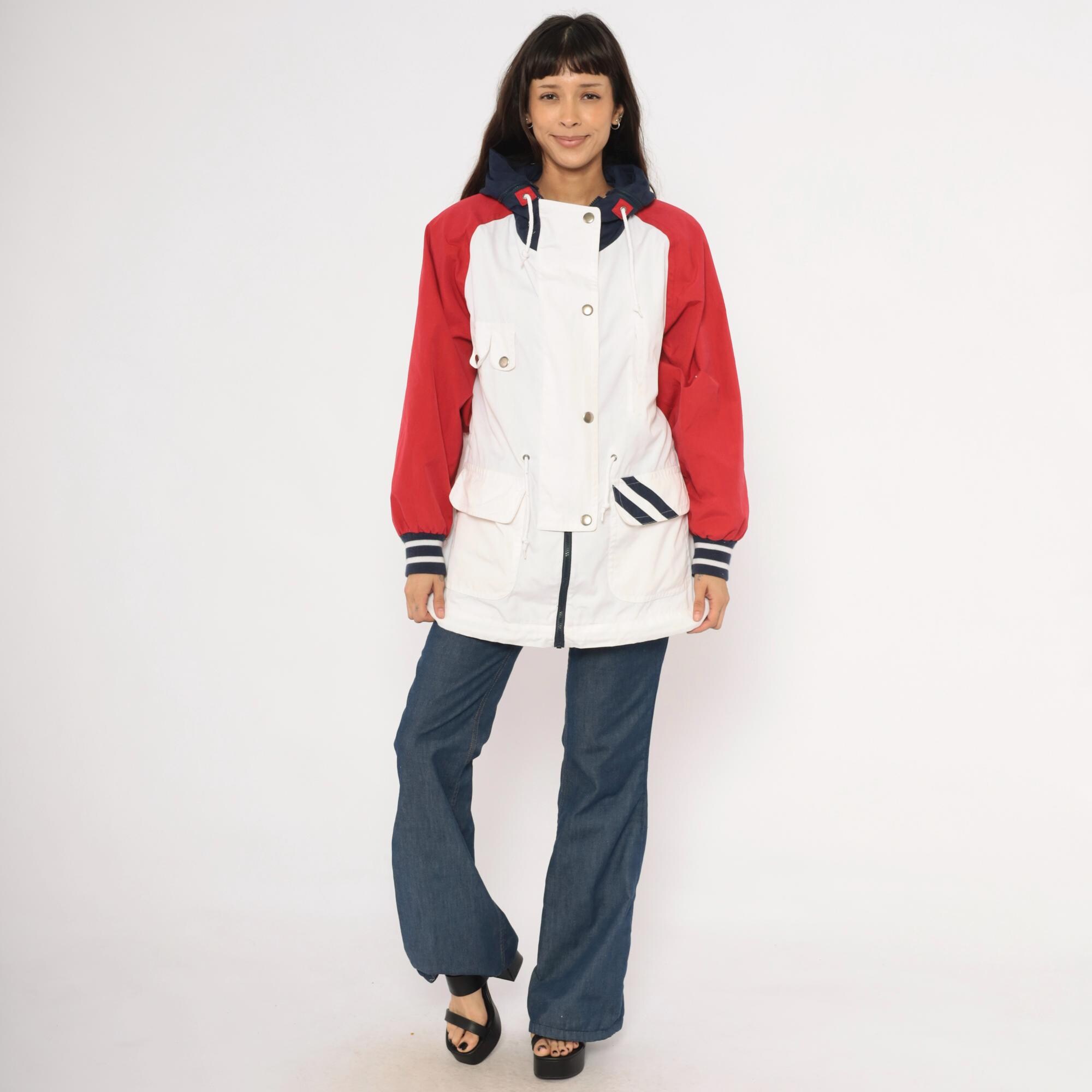 90s colorblock windbreaker from Mulberry Street with a white body, red raglan sleeves, and a navy hood with drawstring closure. Snap front placket over a full-length zipper, chest flap pocket, and lower patch pockets with snap closures. Drawstring cinch at the waist, navy and white striped ribbed cuffs, and red tab details at the hood attachment points.