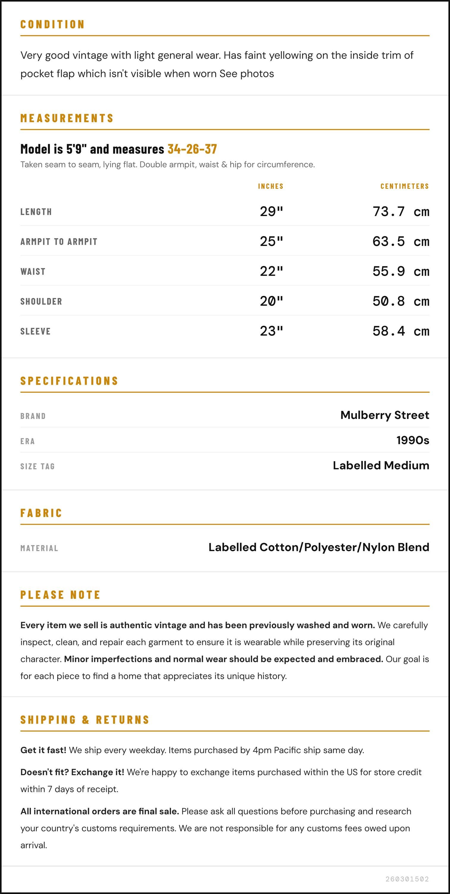 Condition: Very good vintage with light general wear. Has faint yellowing on the inside trim of pocket flap which isn't visible when worn See photos