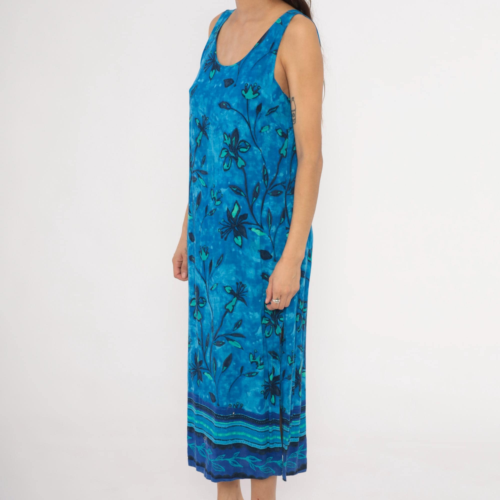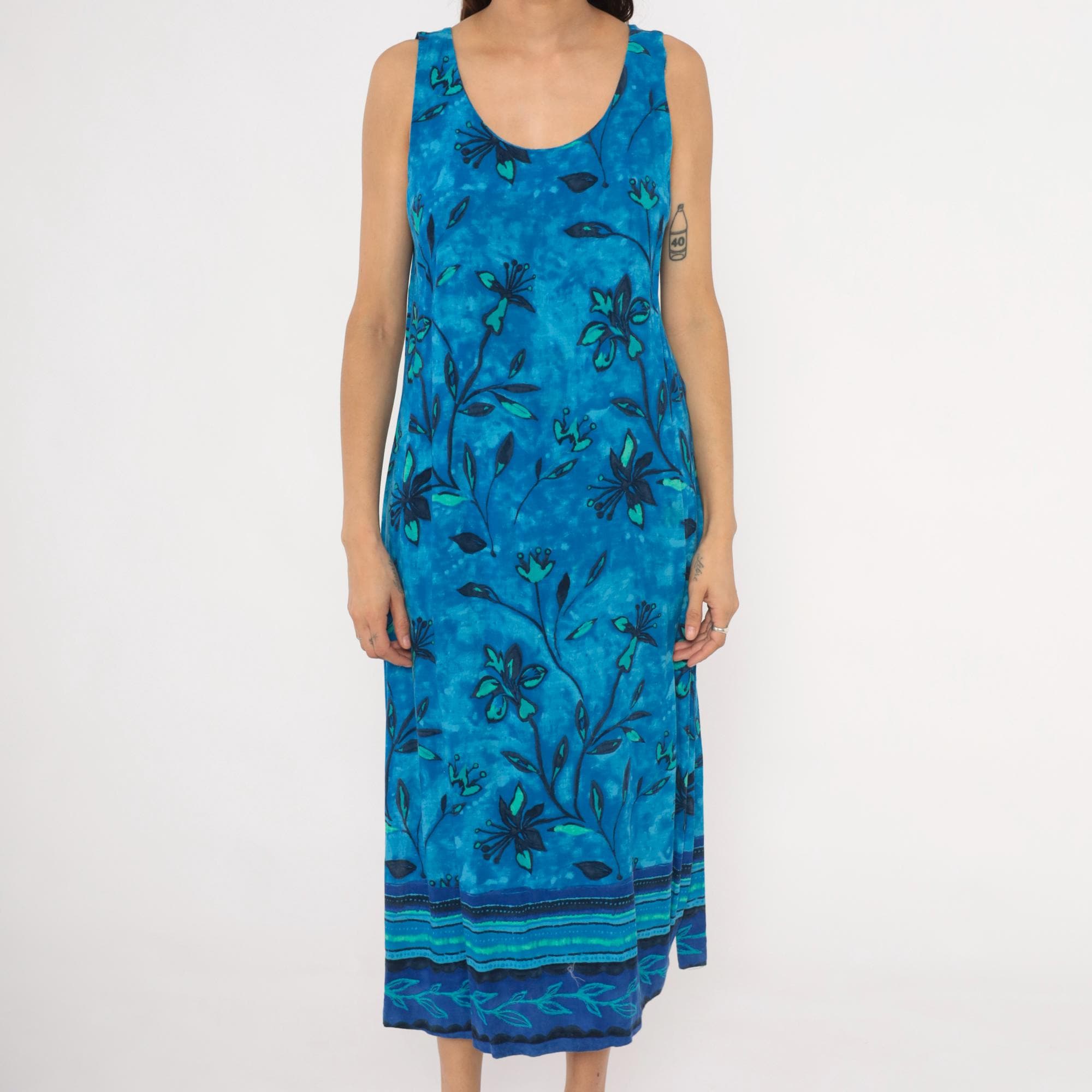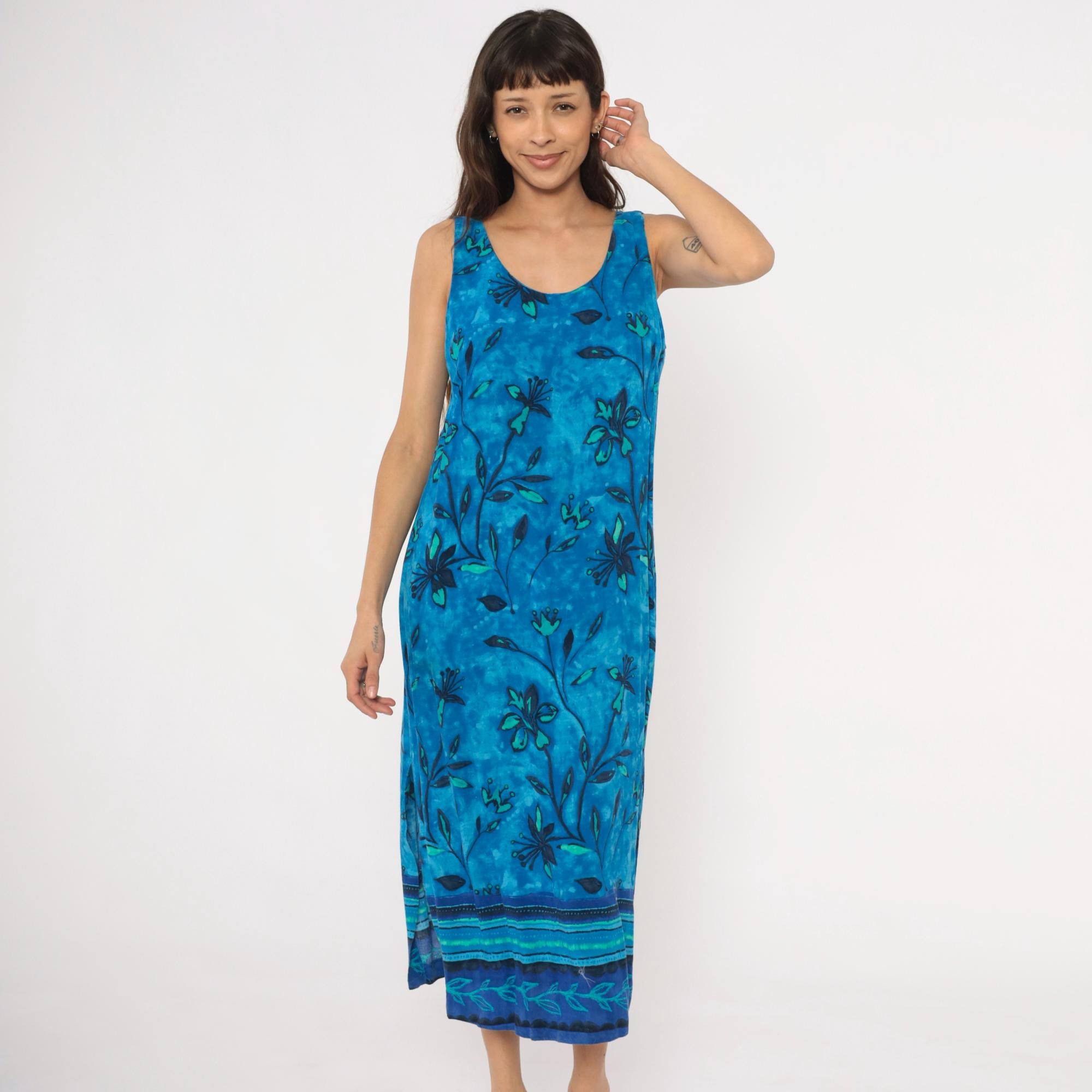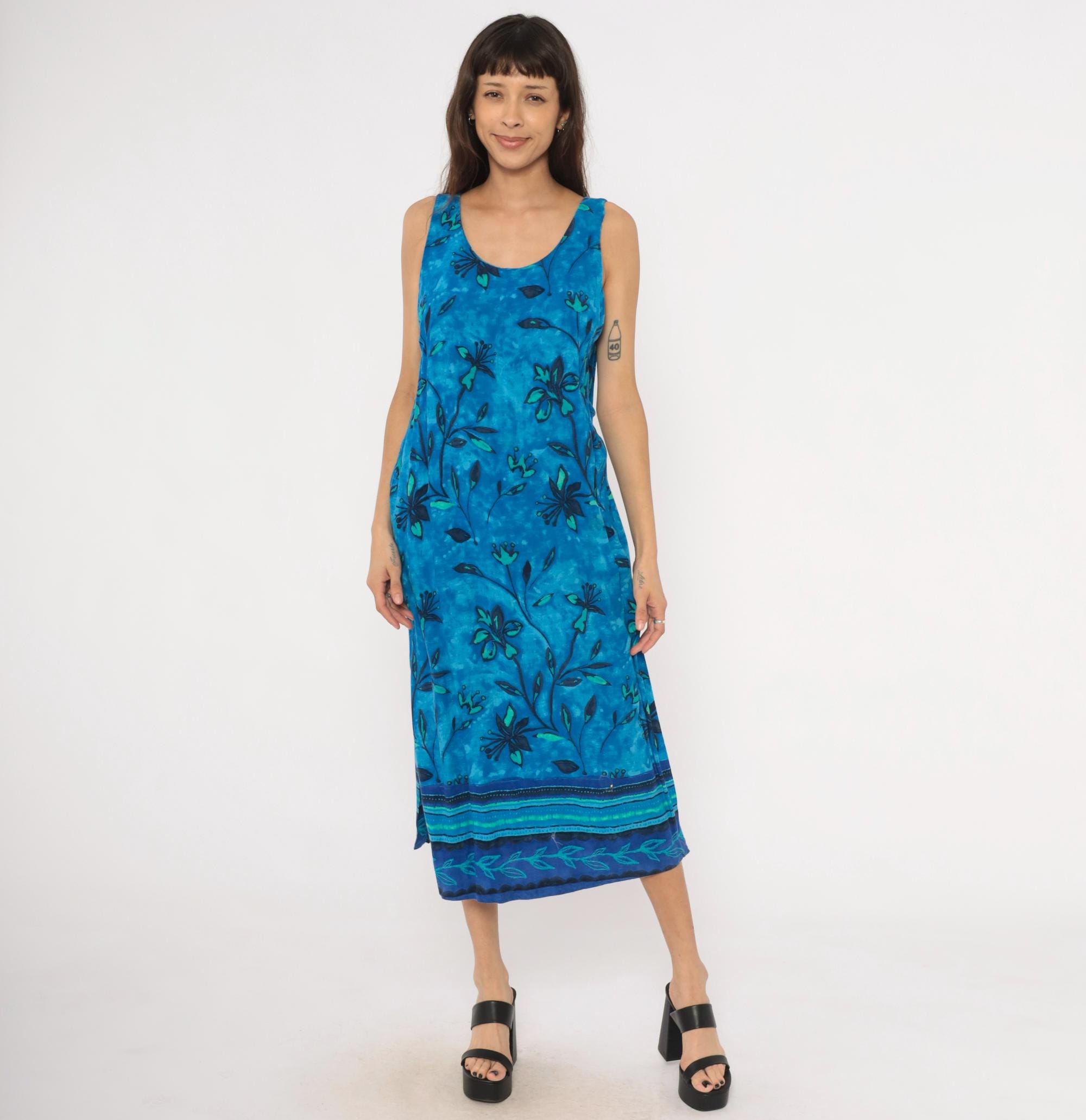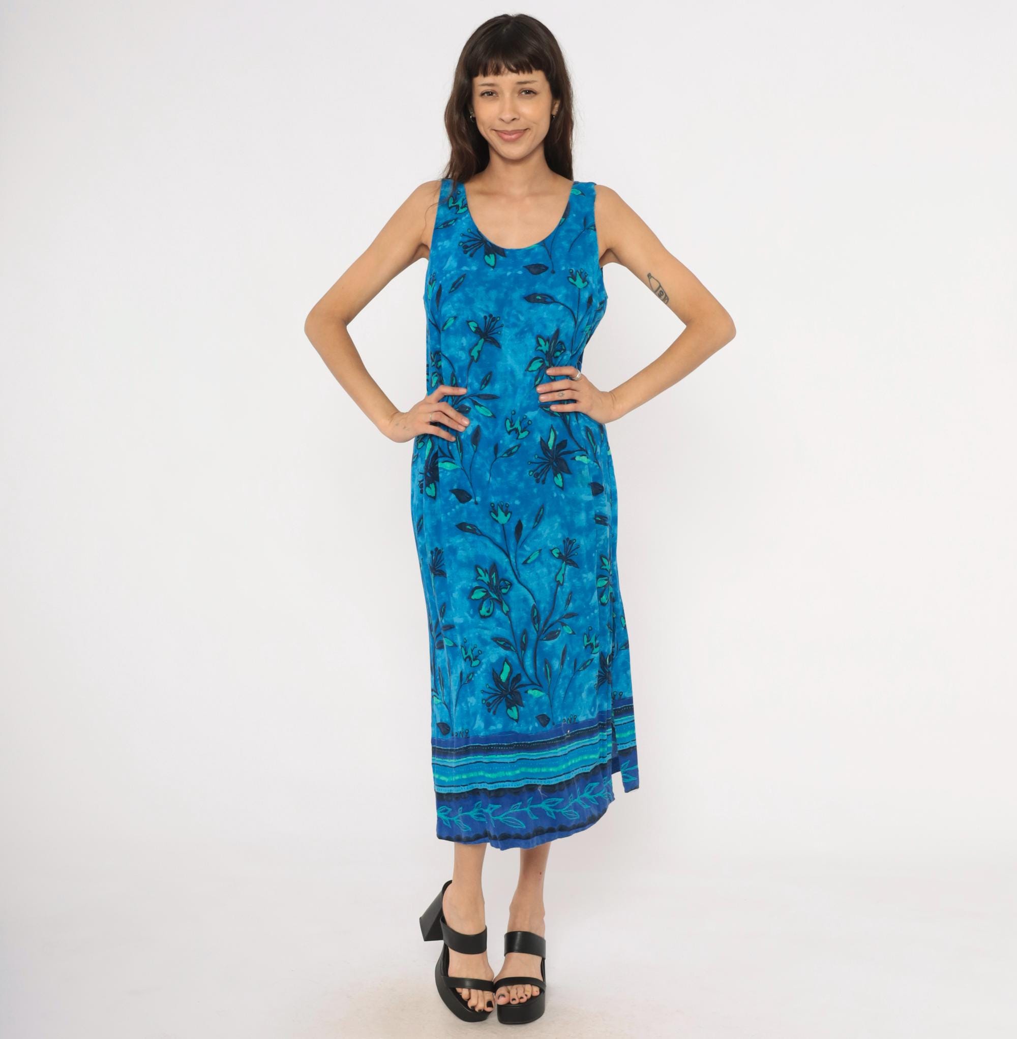 90s blue batik-style tank dress with an allover floral vine and leaf print in navy, teal, and cerulean tones against a mottled azure background. Scoop neckline front and back, sleeveless cut with wide tank straps, and a straight column silhouette falling to mid-calf length.