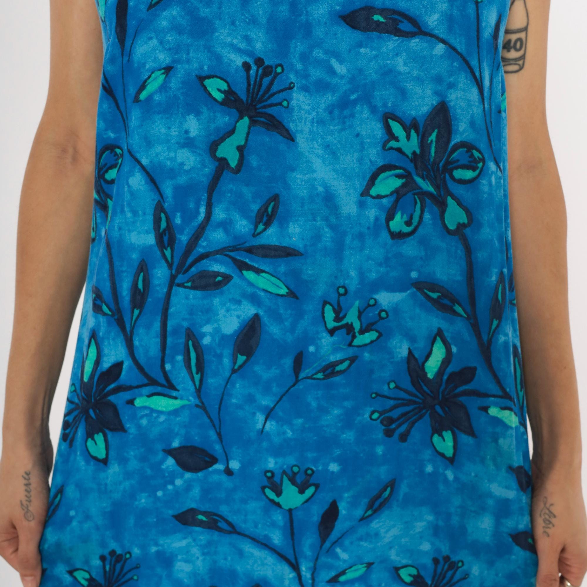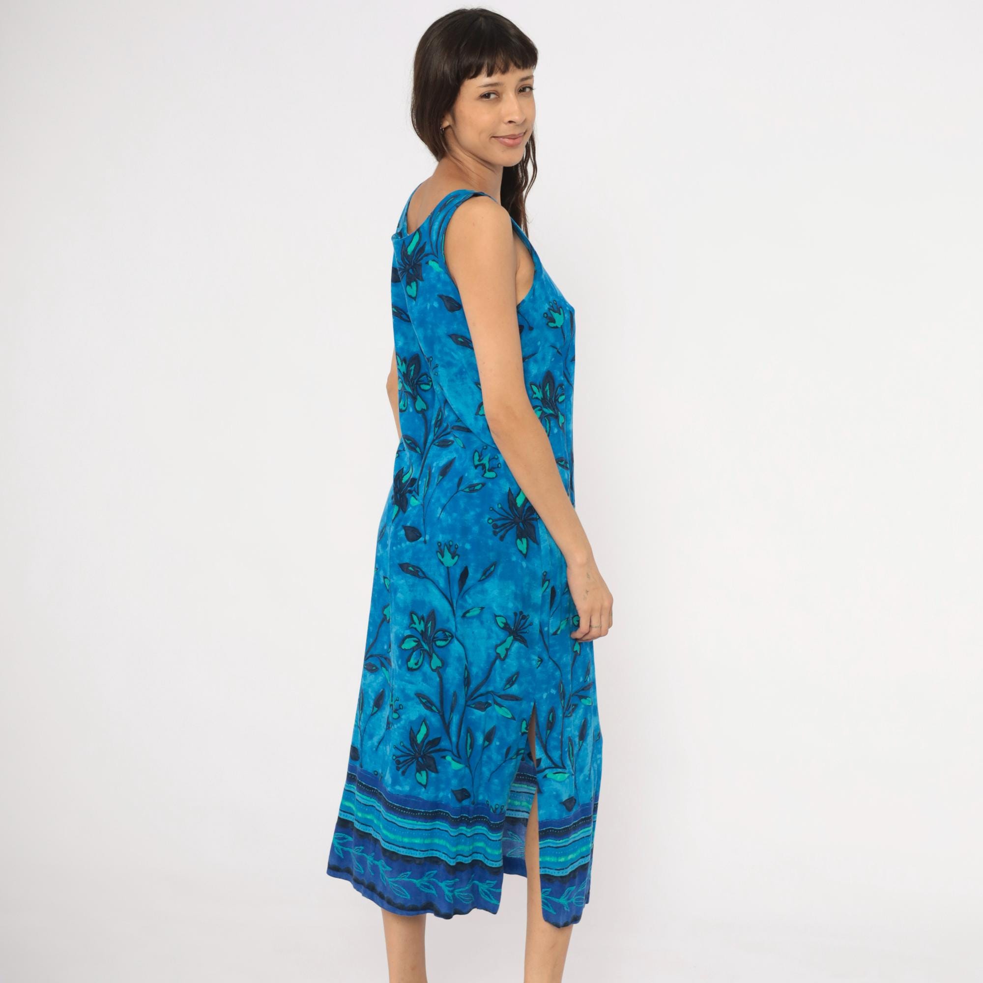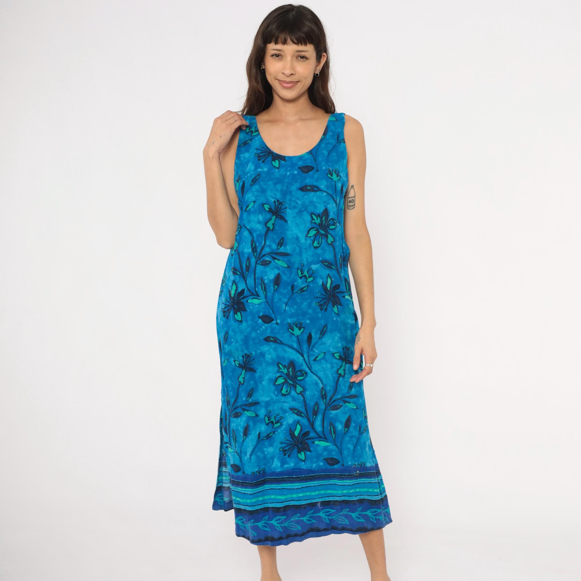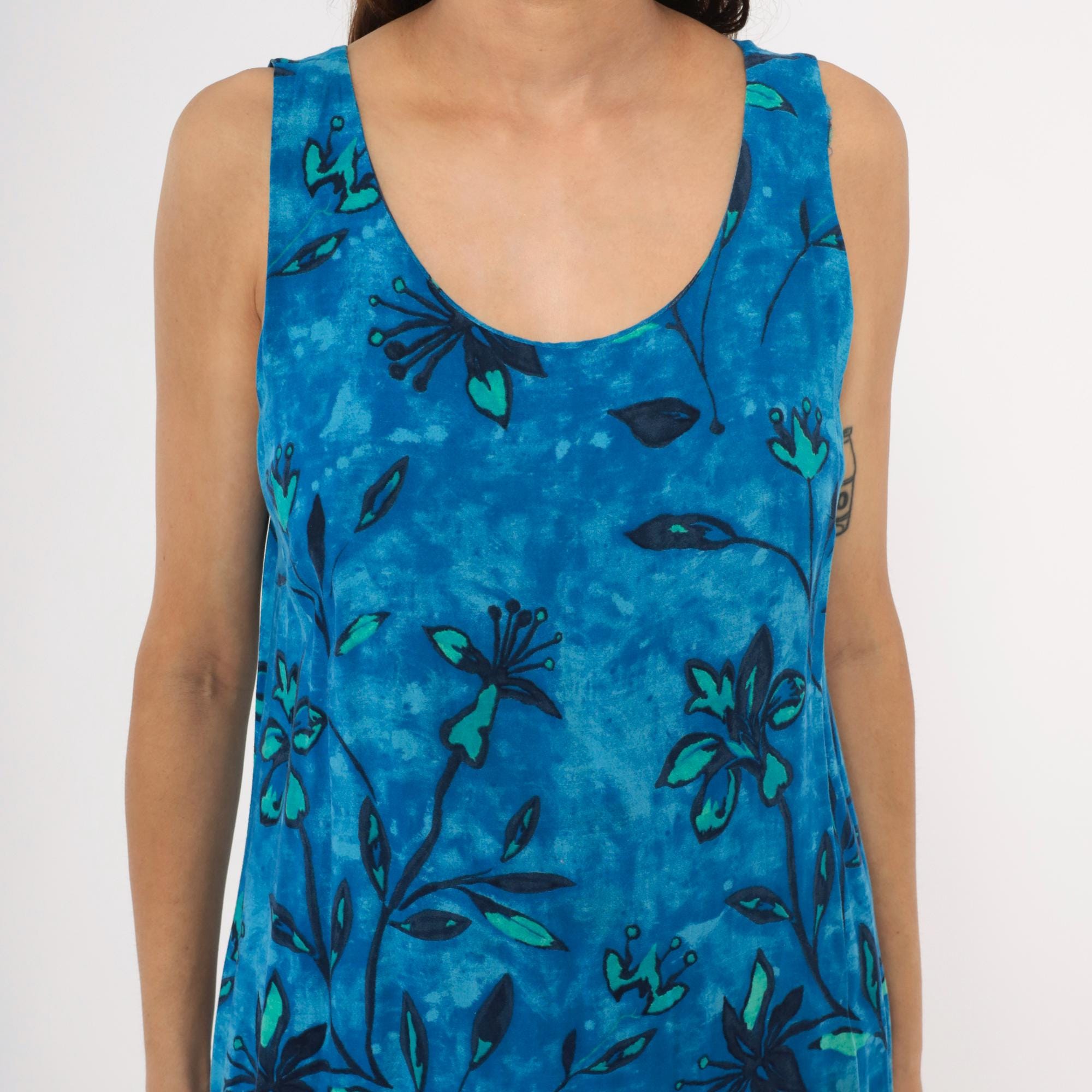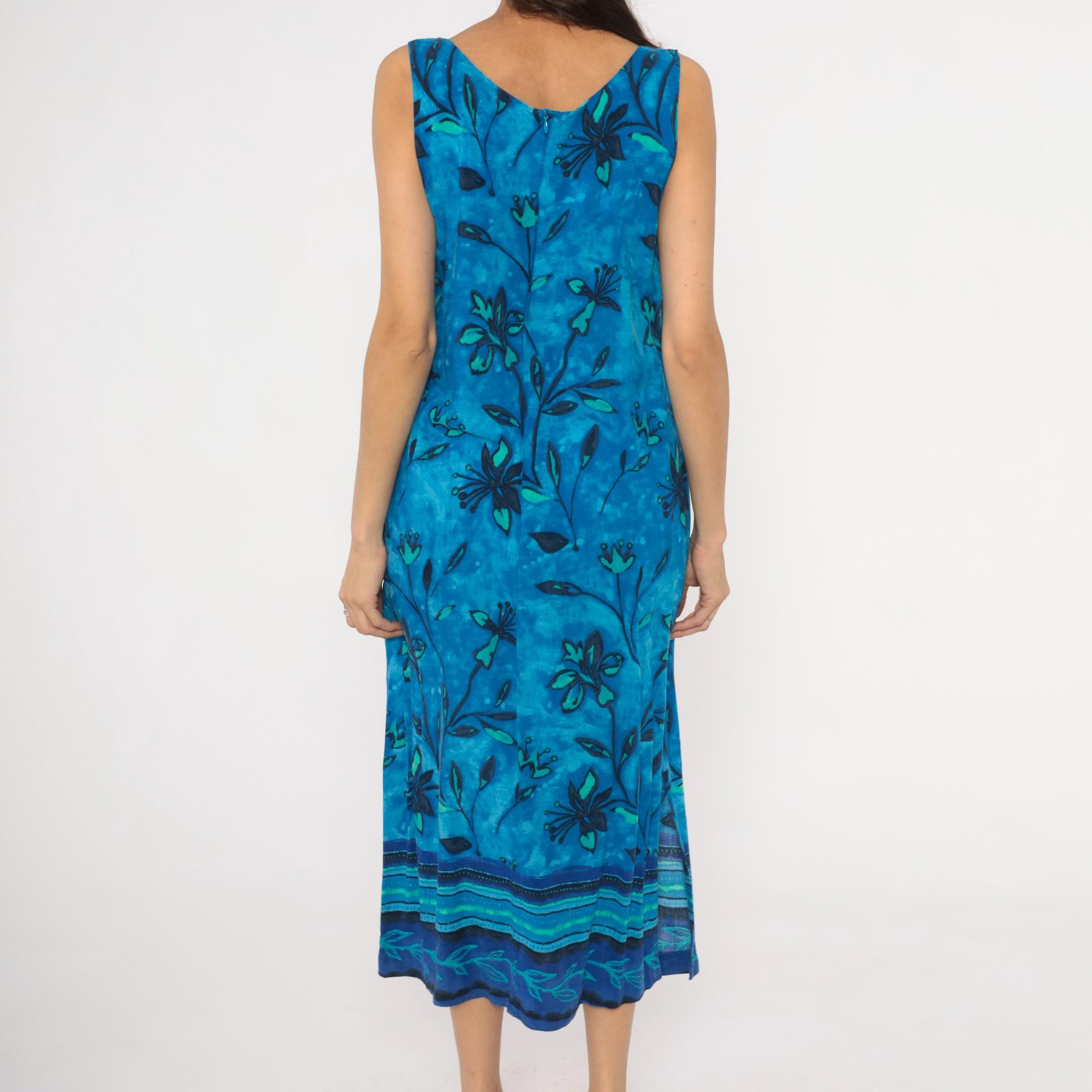 90s blue batik-style tank dress with an allover floral vine and leaf print in navy, teal, and cerulean tones against a mottled azure background. Scoop neckline front and back, sleeveless cut with wide tank straps, and a straight column silhouette falling to mid-calf length.
