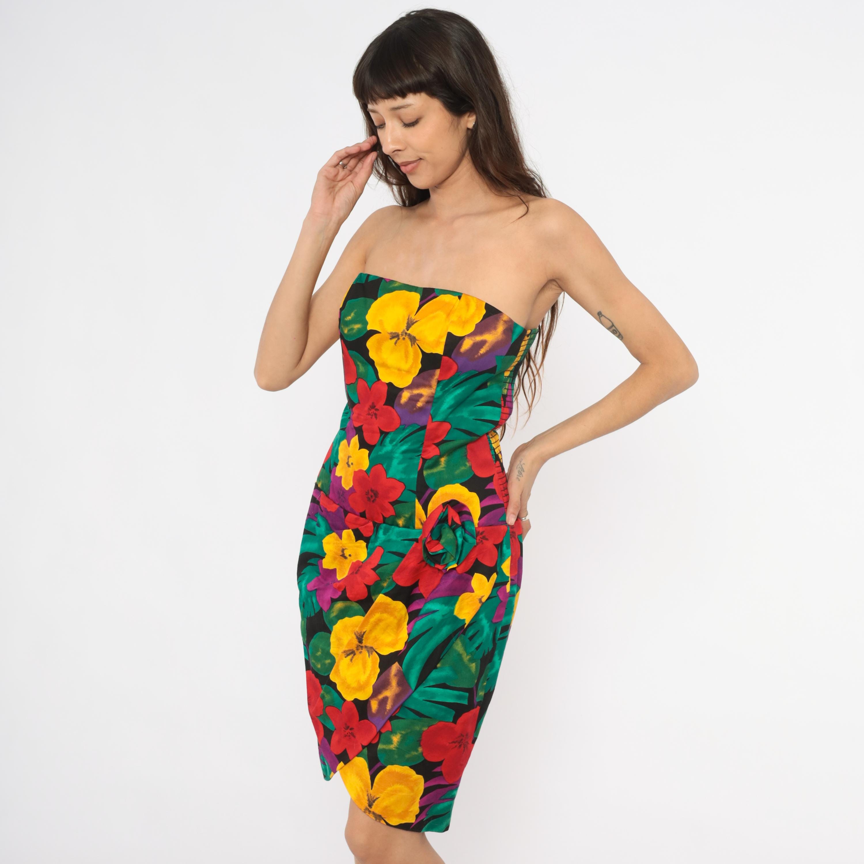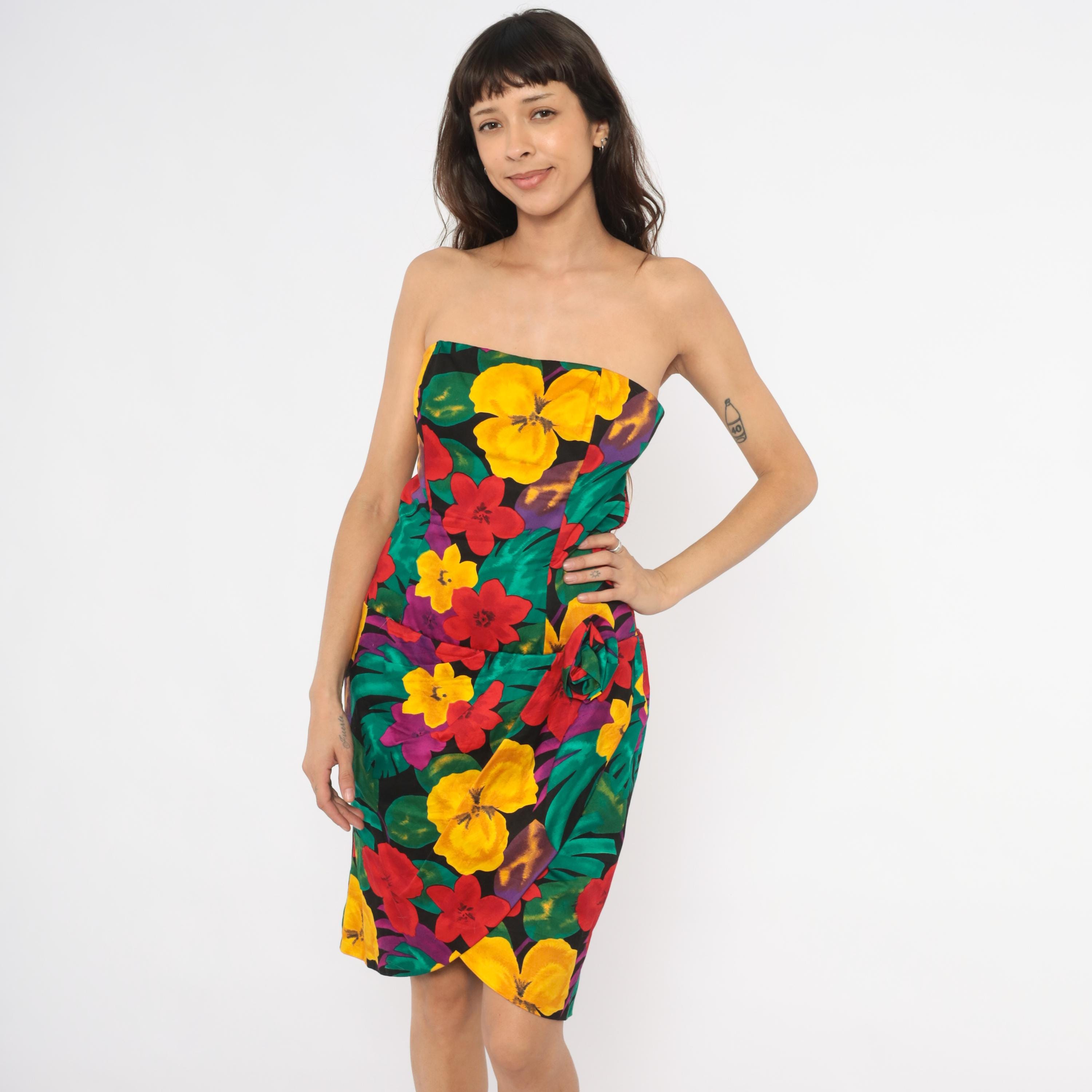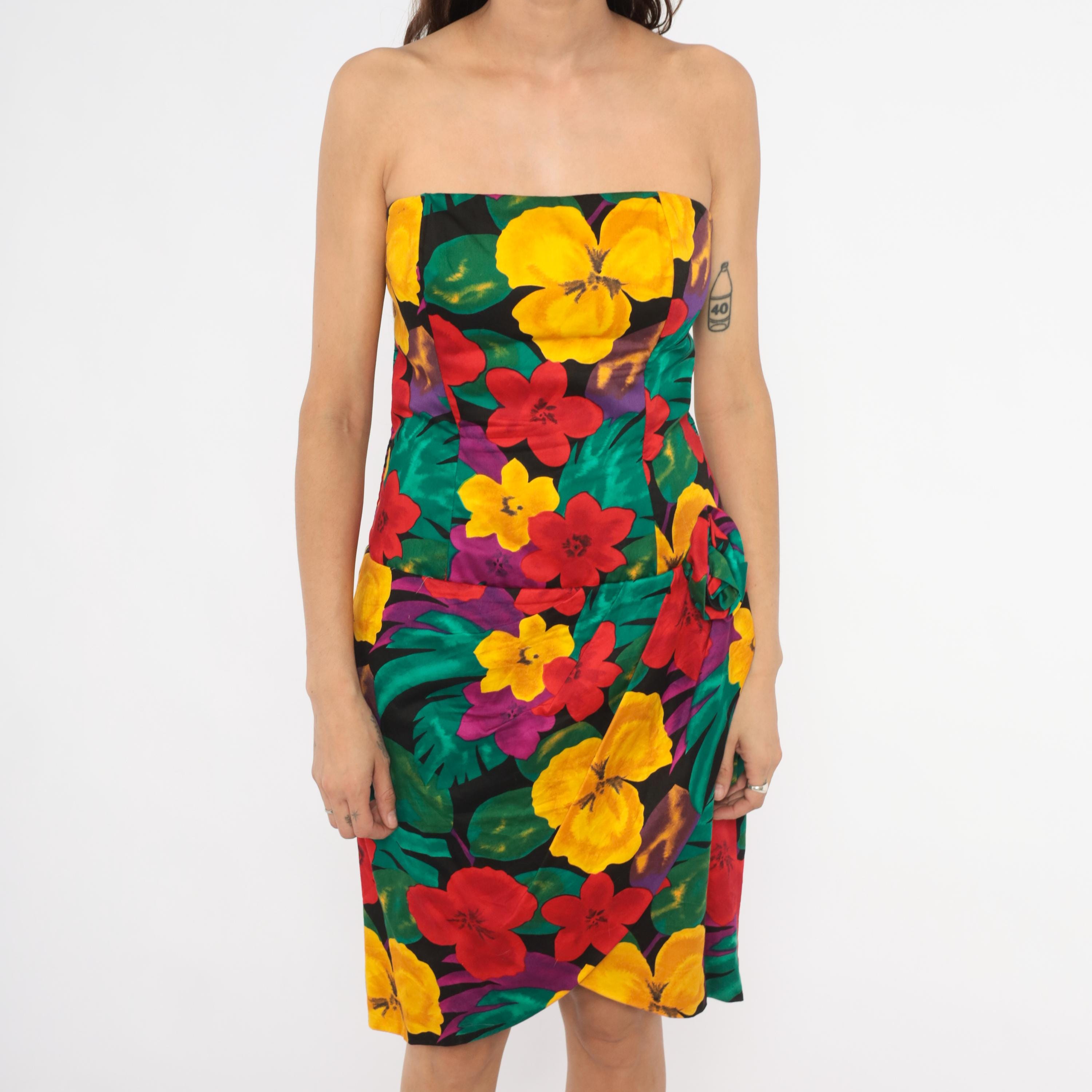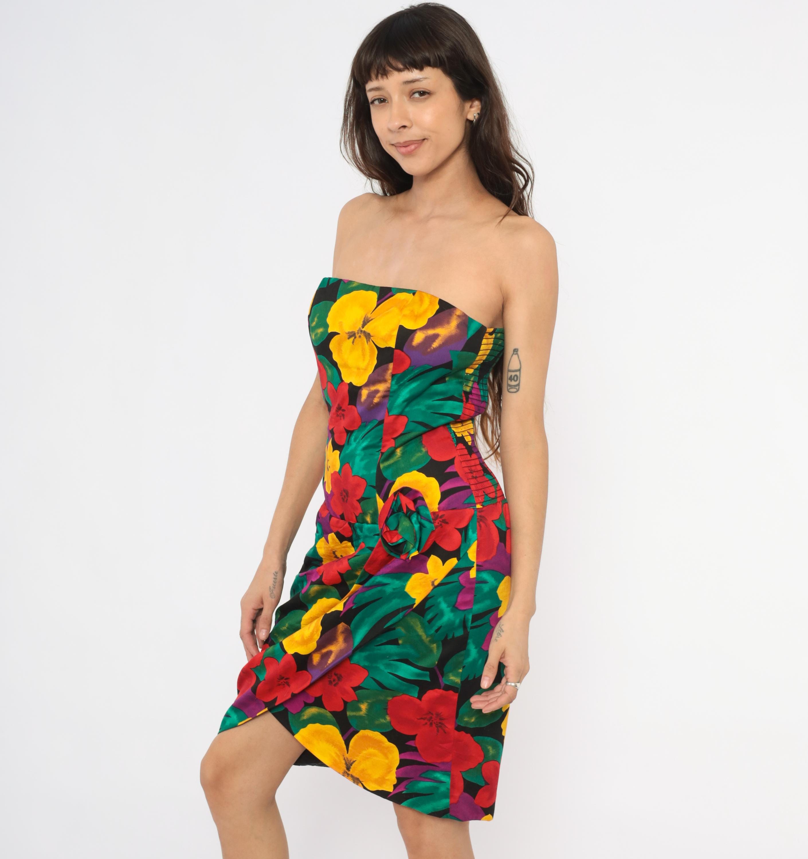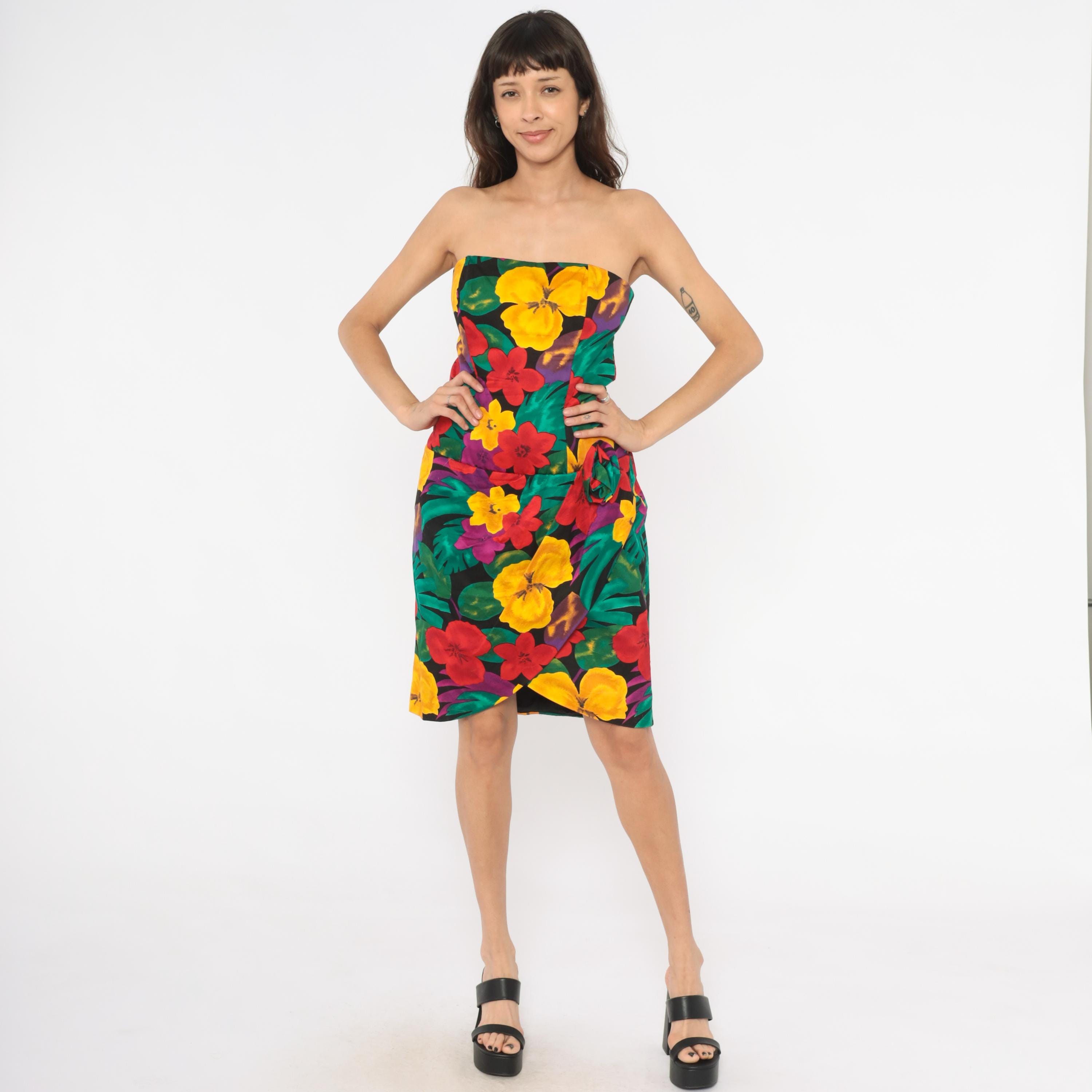 90s strapless dress with a bold tropical floral print in yellow, red, magenta, and green against a black background. Fitted tube bodice with a straight neckline and back zipper closure. Sarong-style wrap skirt at the hip with a knee-length hem. Hibiscus and plumeria flowers layered over green palm leaves and foliage throughout.