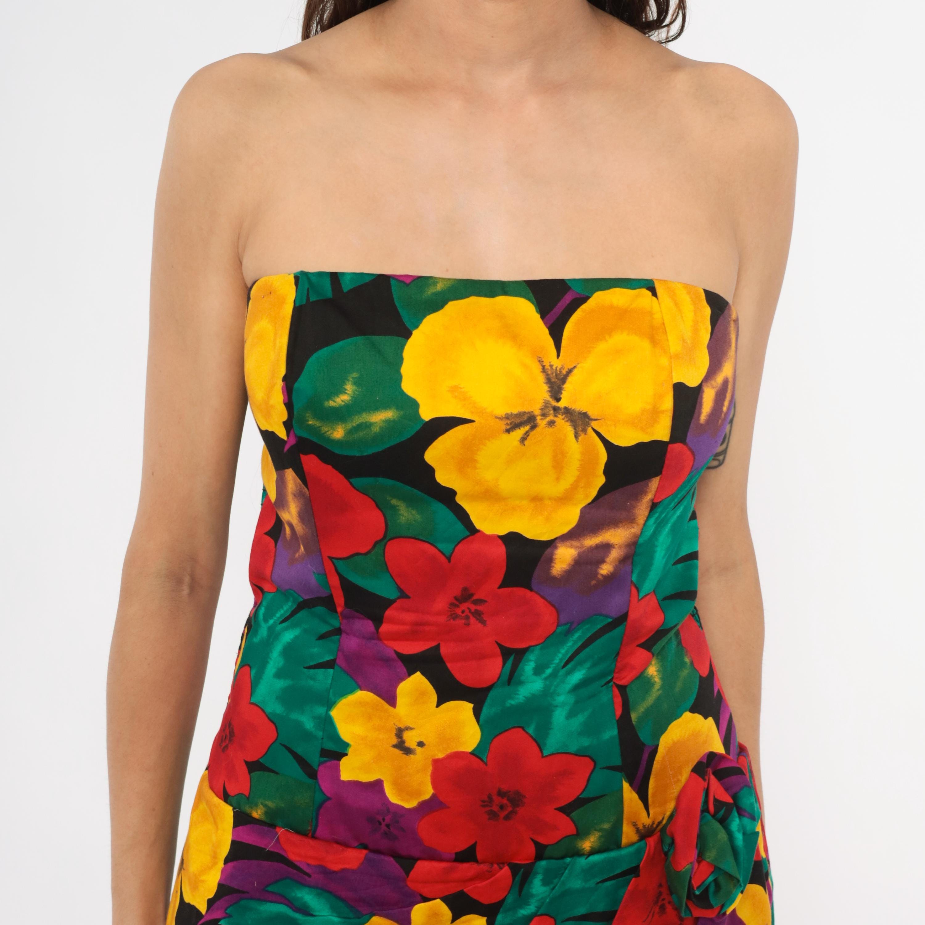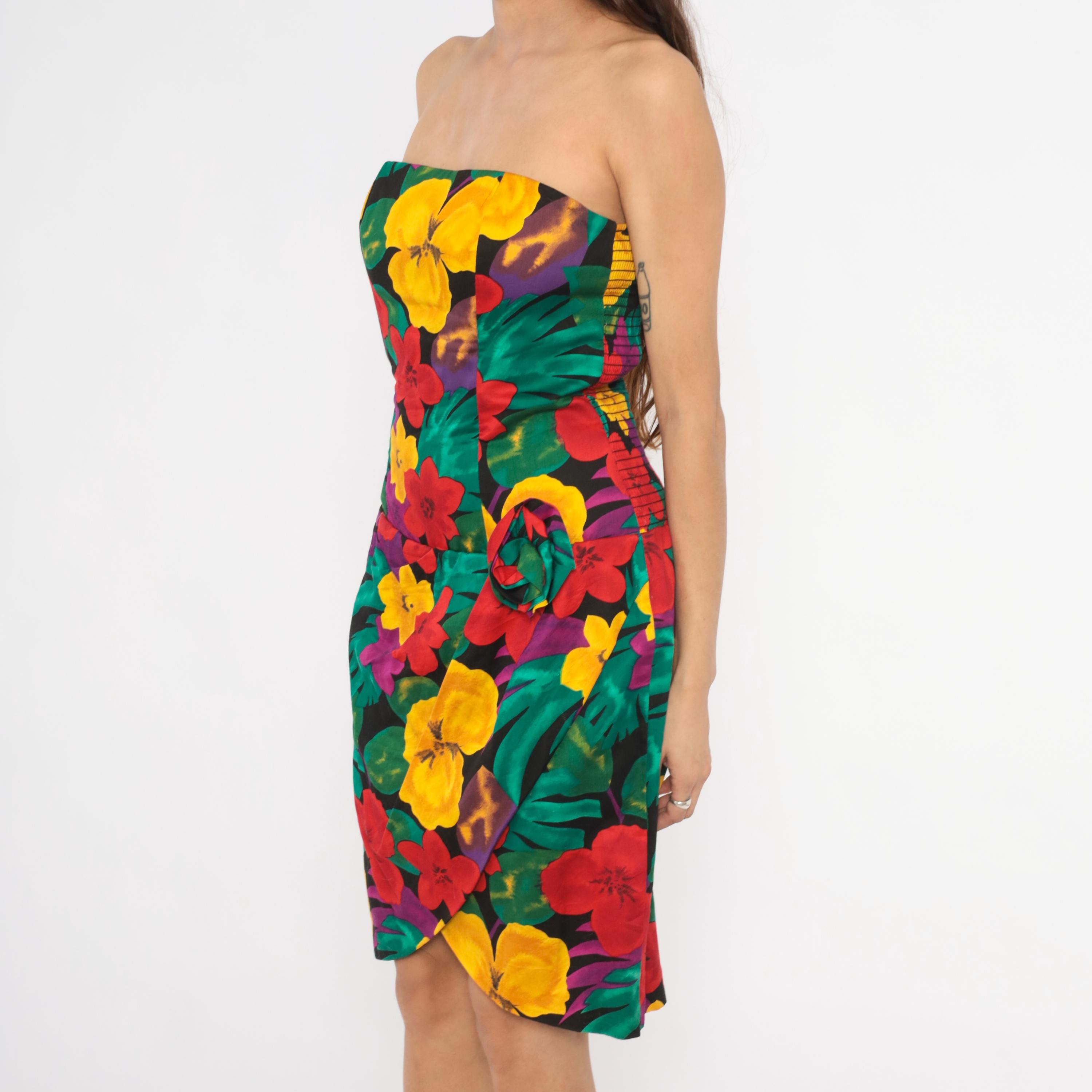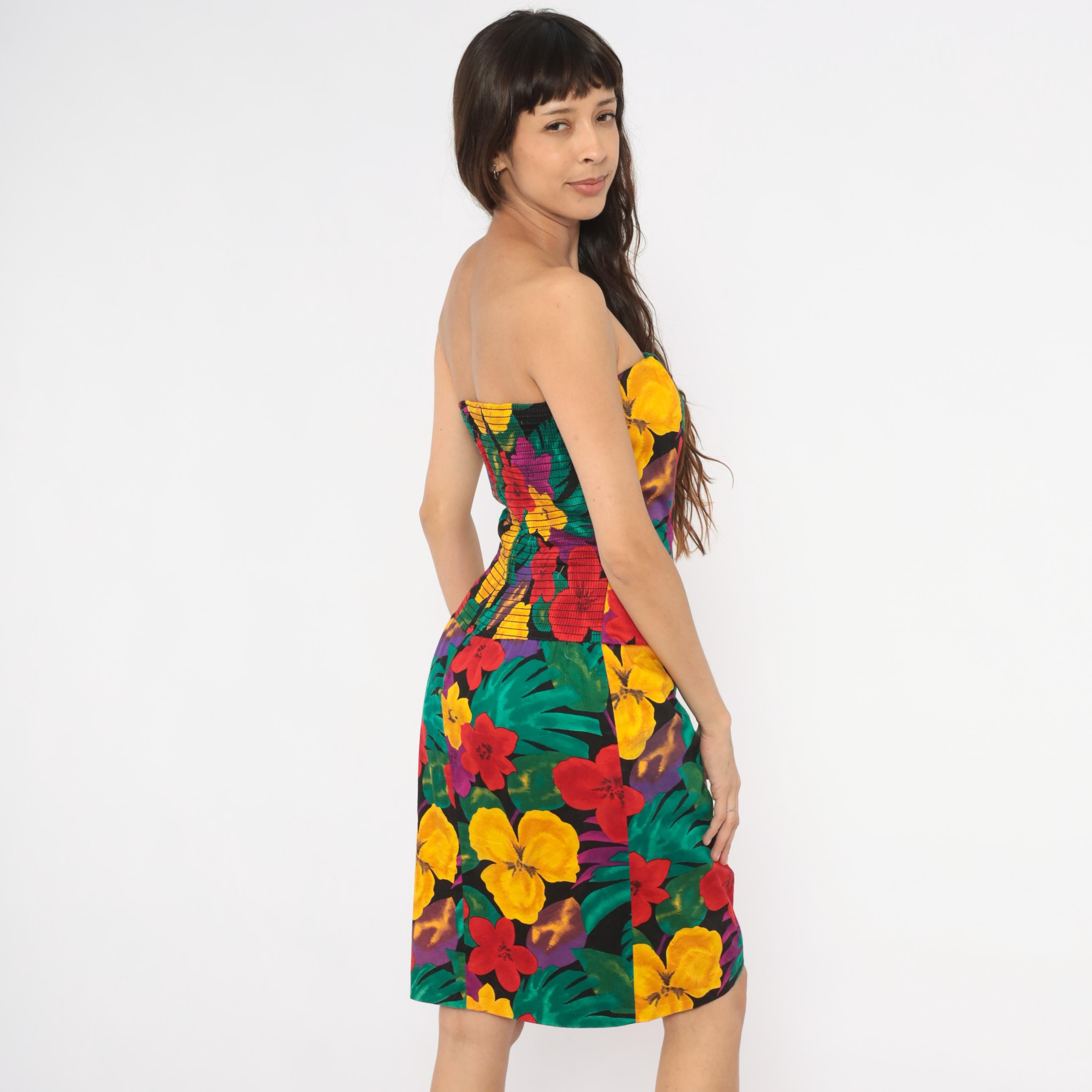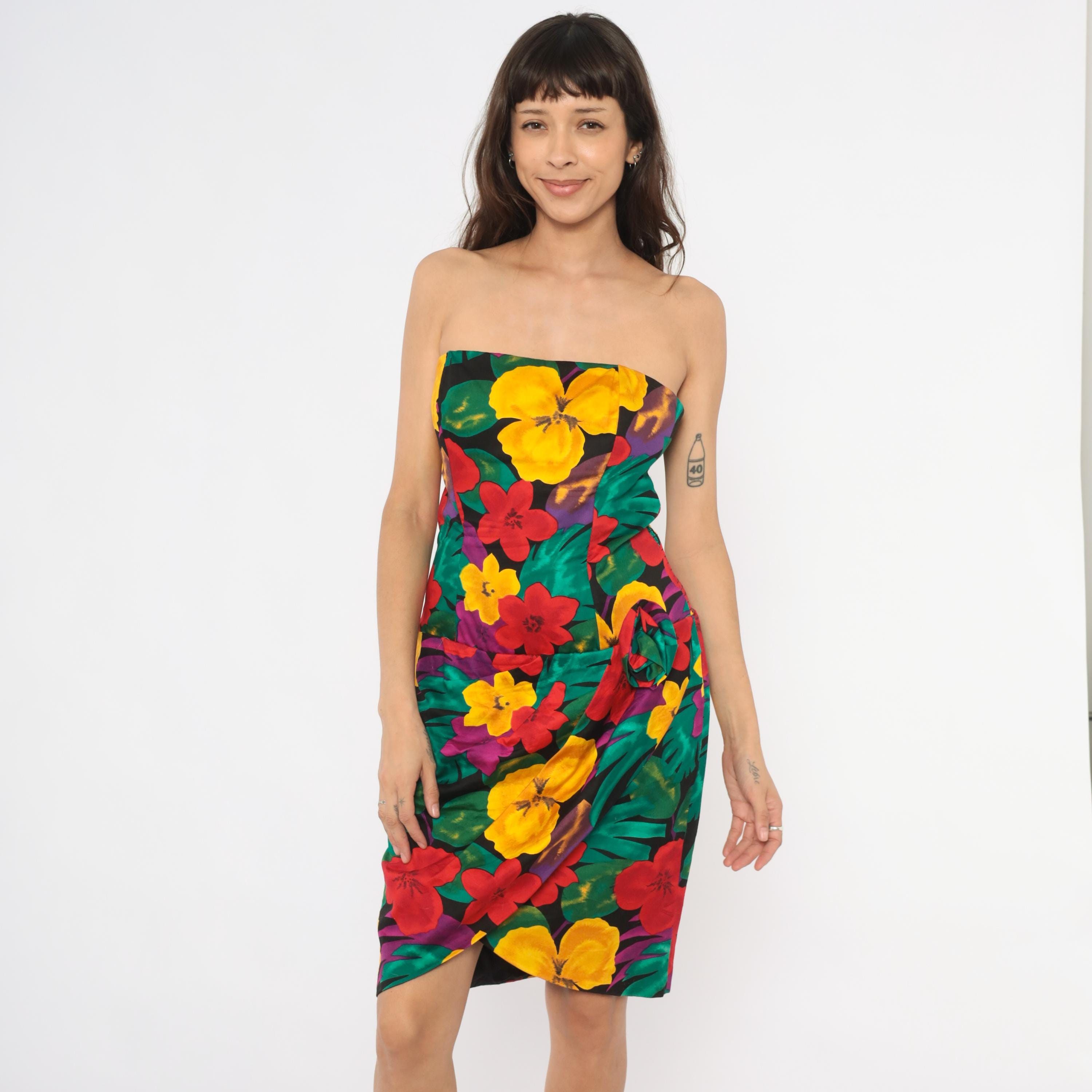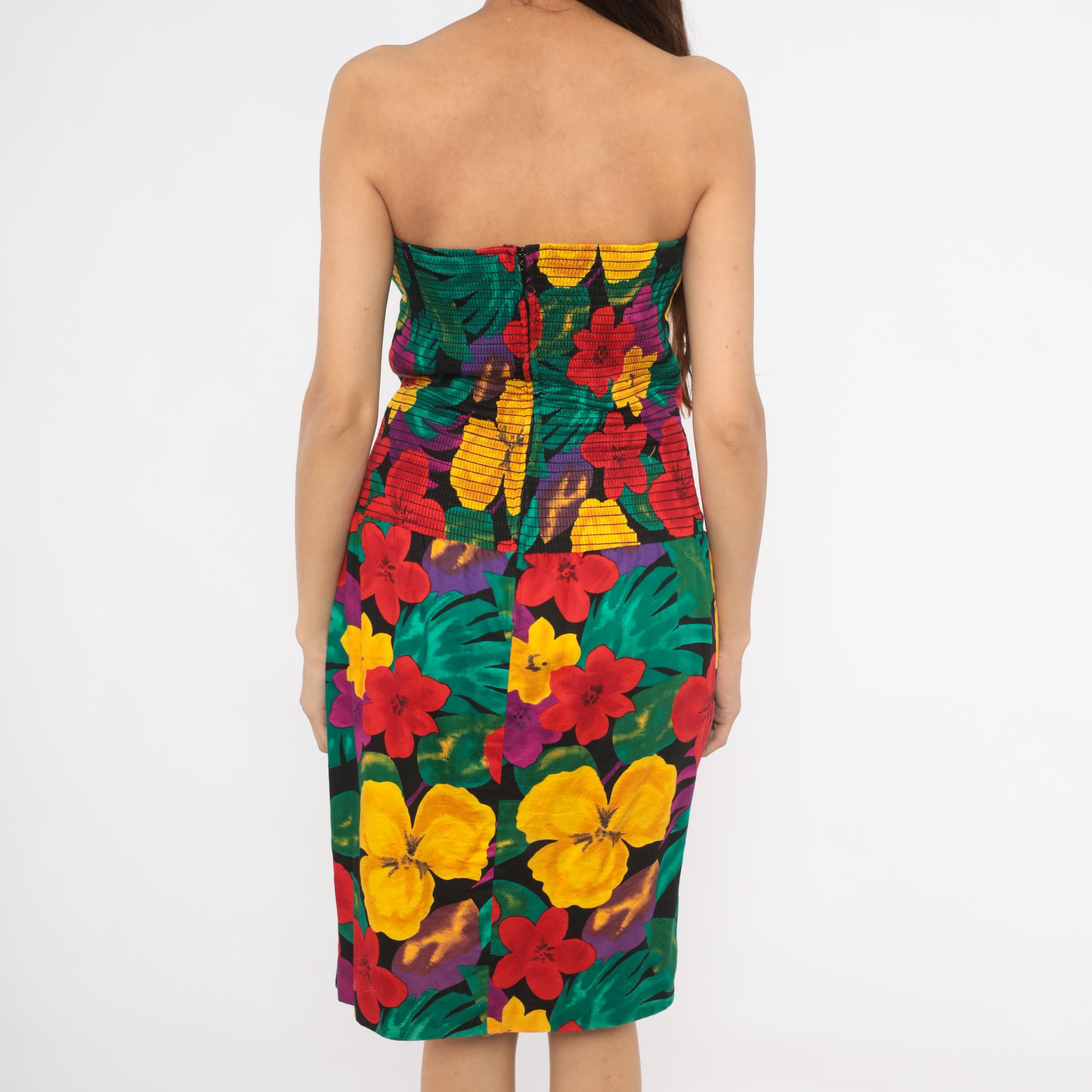 90s strapless dress with a bold tropical floral print in yellow, red, magenta, and green against a black background. Fitted tube bodice with a straight neckline and back zipper closure. Sarong-style wrap skirt at the hip with a knee-length hem. Hibiscus and plumeria flowers layered over green palm leaves and foliage throughout.