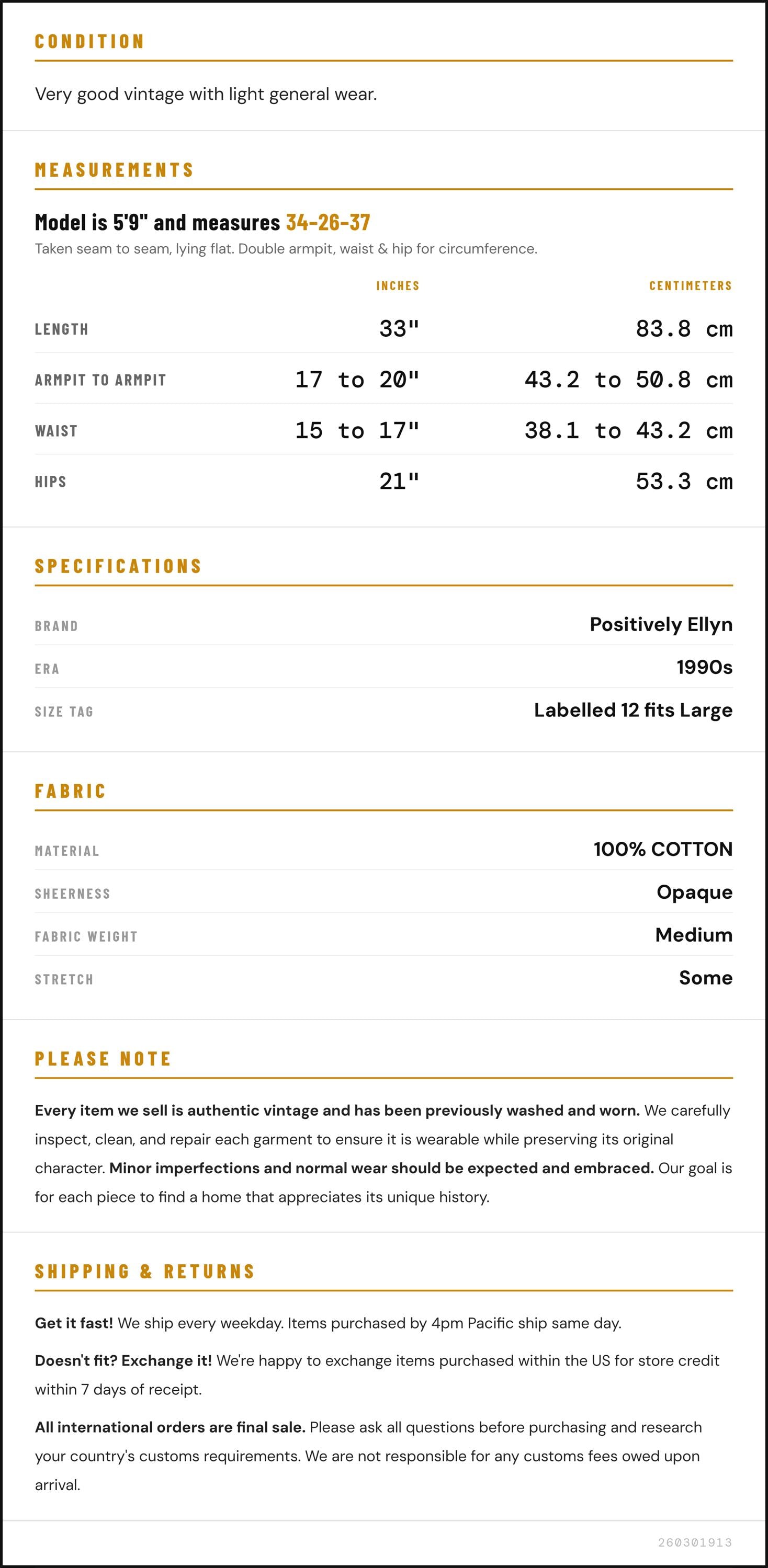 Vintage denim was usually made without any stretch, unlike modern jeans. Check the measurements to ensure proper fit, and remember to give yourself a little wiggle room in the waist and hips, depending on your preferred fit.