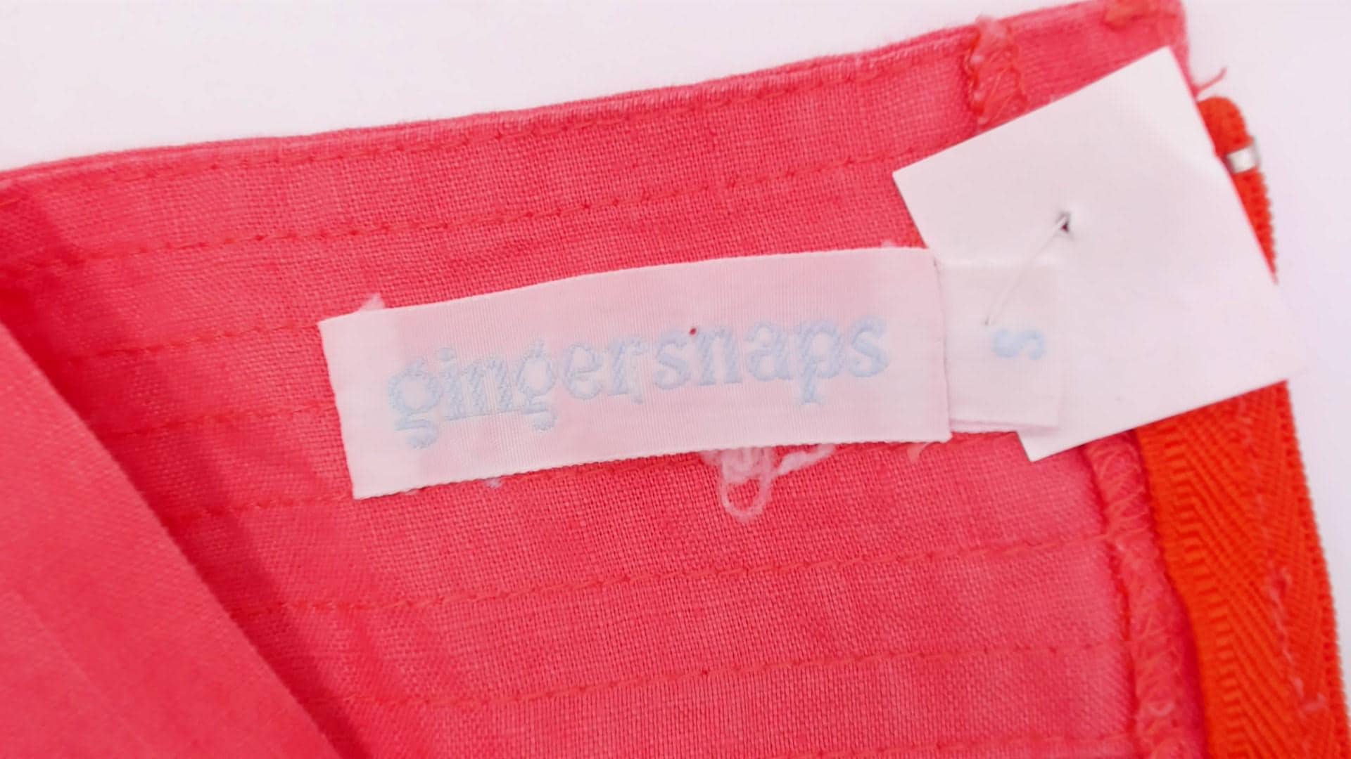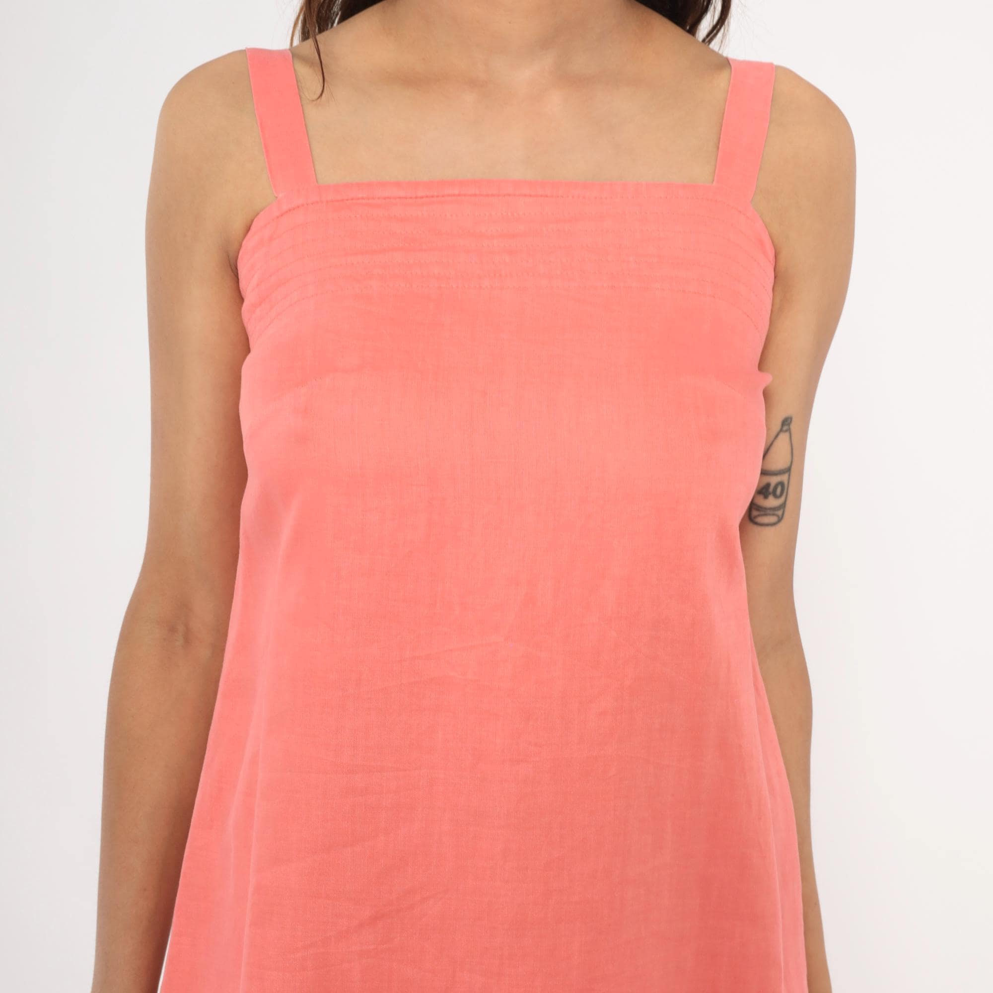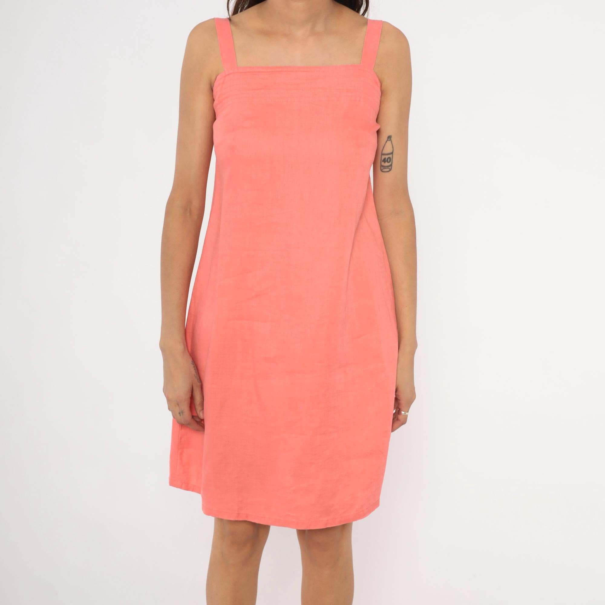 Coral salmon sundress with wide flat straps and a square neckline across the front and back. Pintucked horizontal rows run across the upper bodice. Straight A-line shift silhouette with a back zipper closure, hitting at knee length.