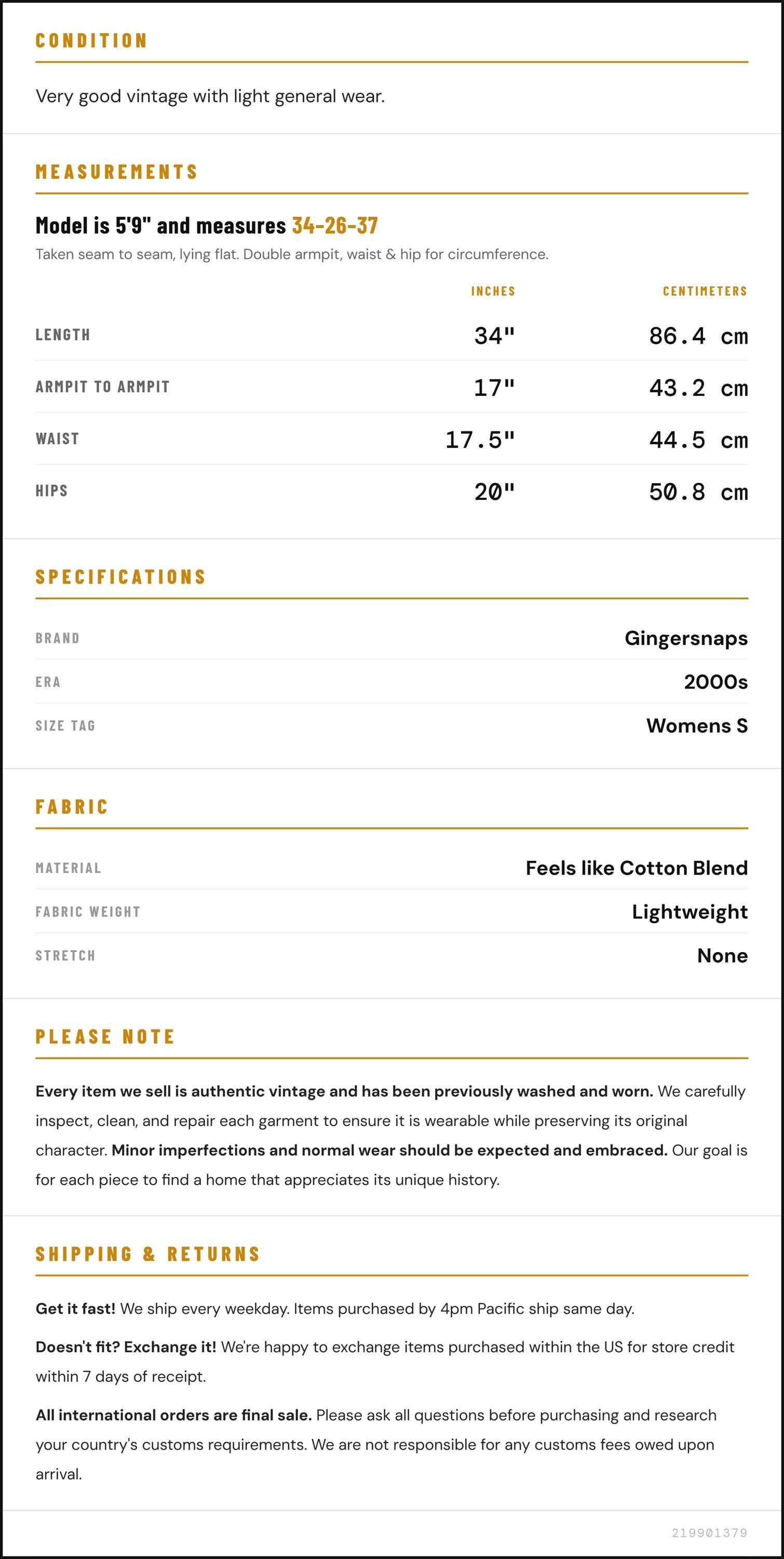 Vintage denim was usually made without any stretch, unlike modern jeans. Check the measurements to ensure proper fit, and remember to give yourself a little wiggle room in the waist and hips, depending on your preferred fit.