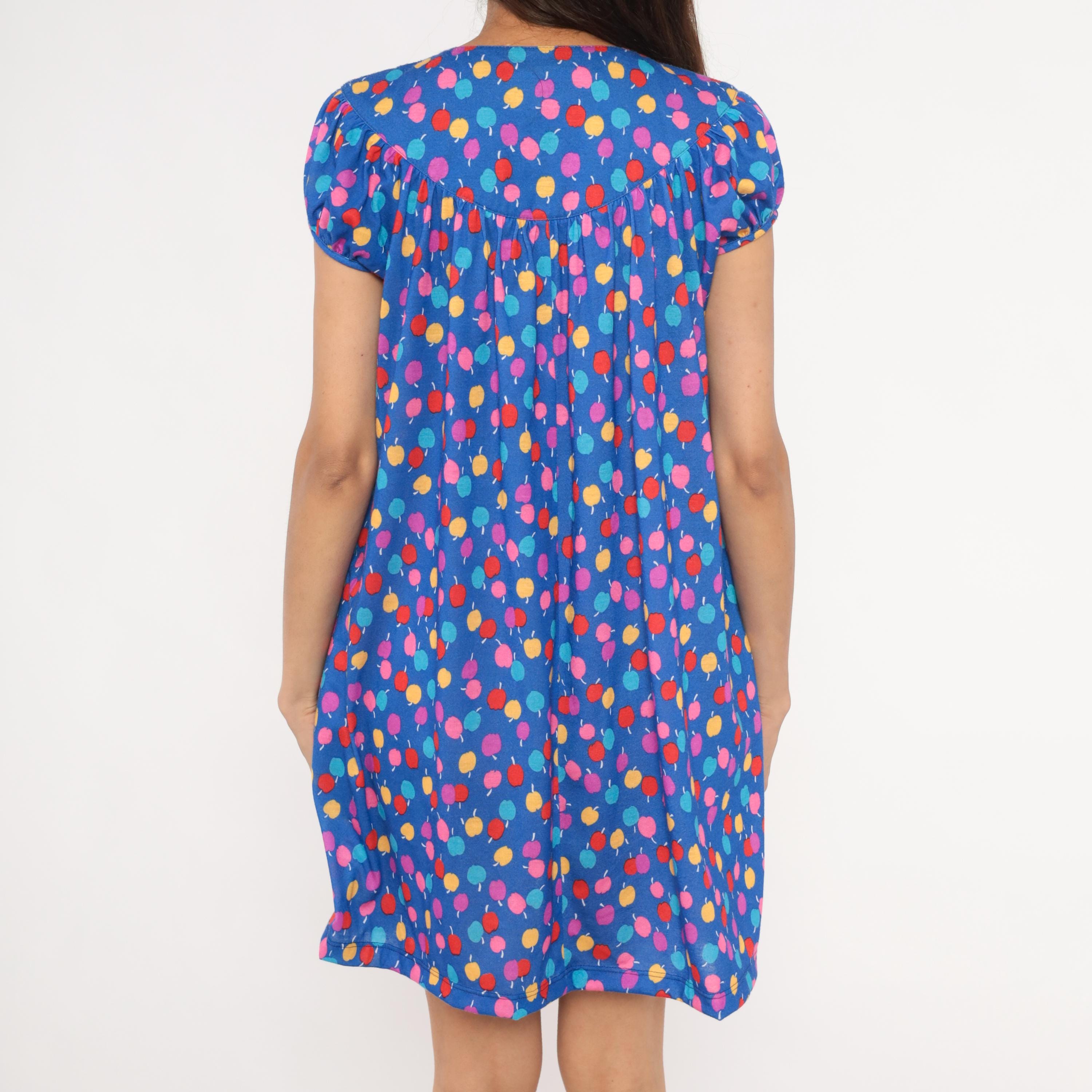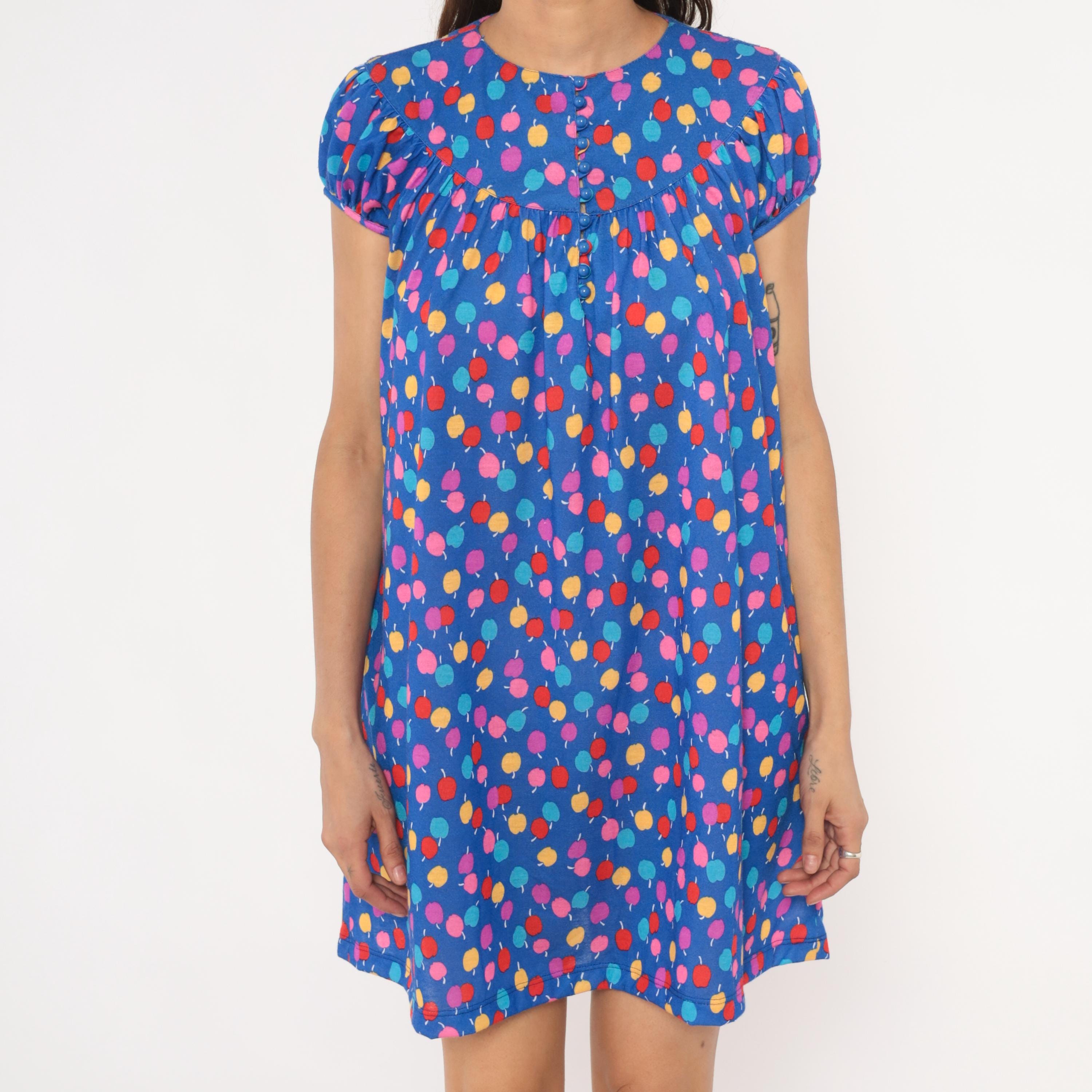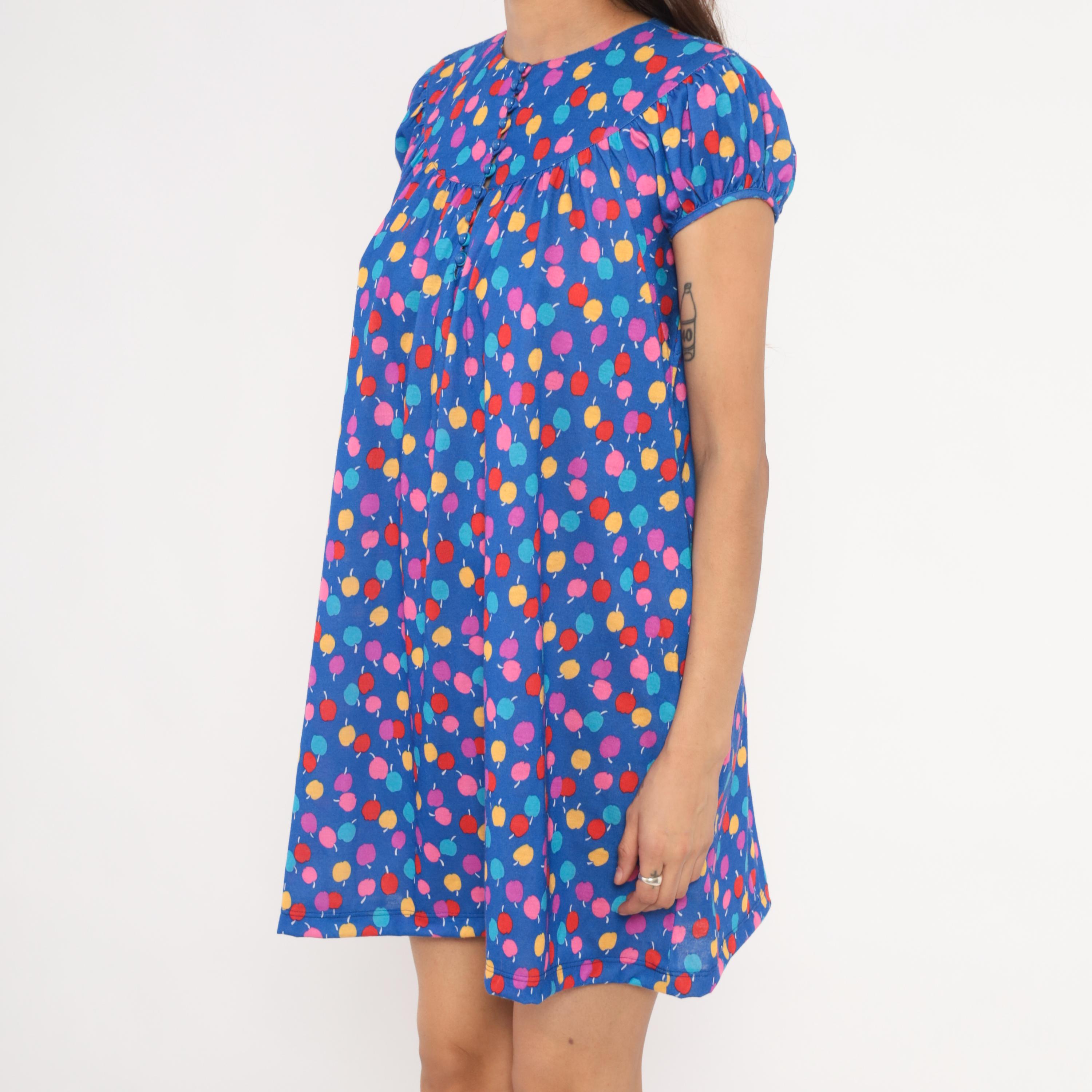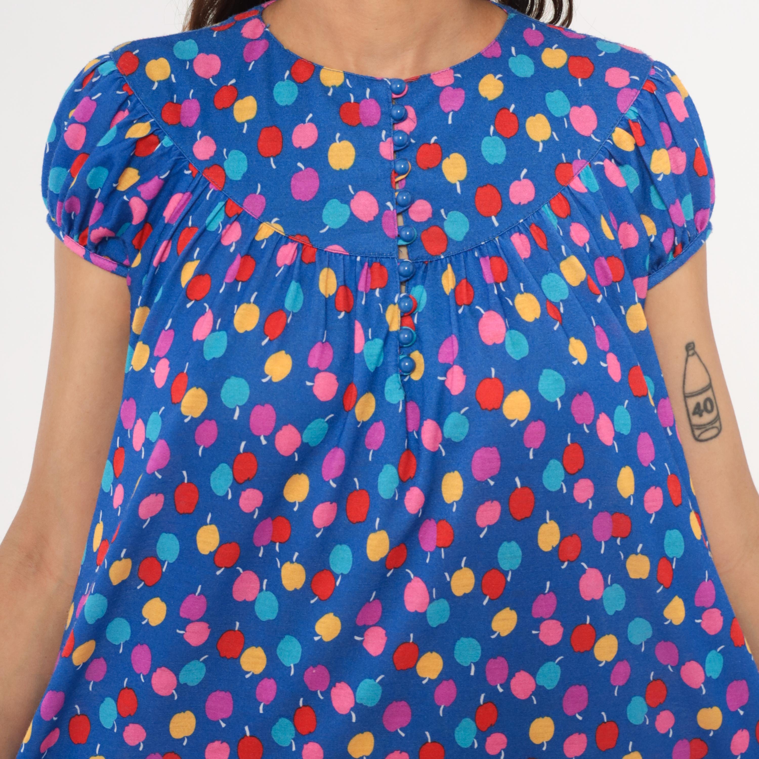 Blue babydoll dress with an allover apple print in pink, red, magenta, teal, and orange on a cobalt background. Round neckline with partial button front closure and gathered yoke, puff cap sleeves with elastic cuffs. A-line silhouette from the gathered bodice through the skirt, hitting above the knee.