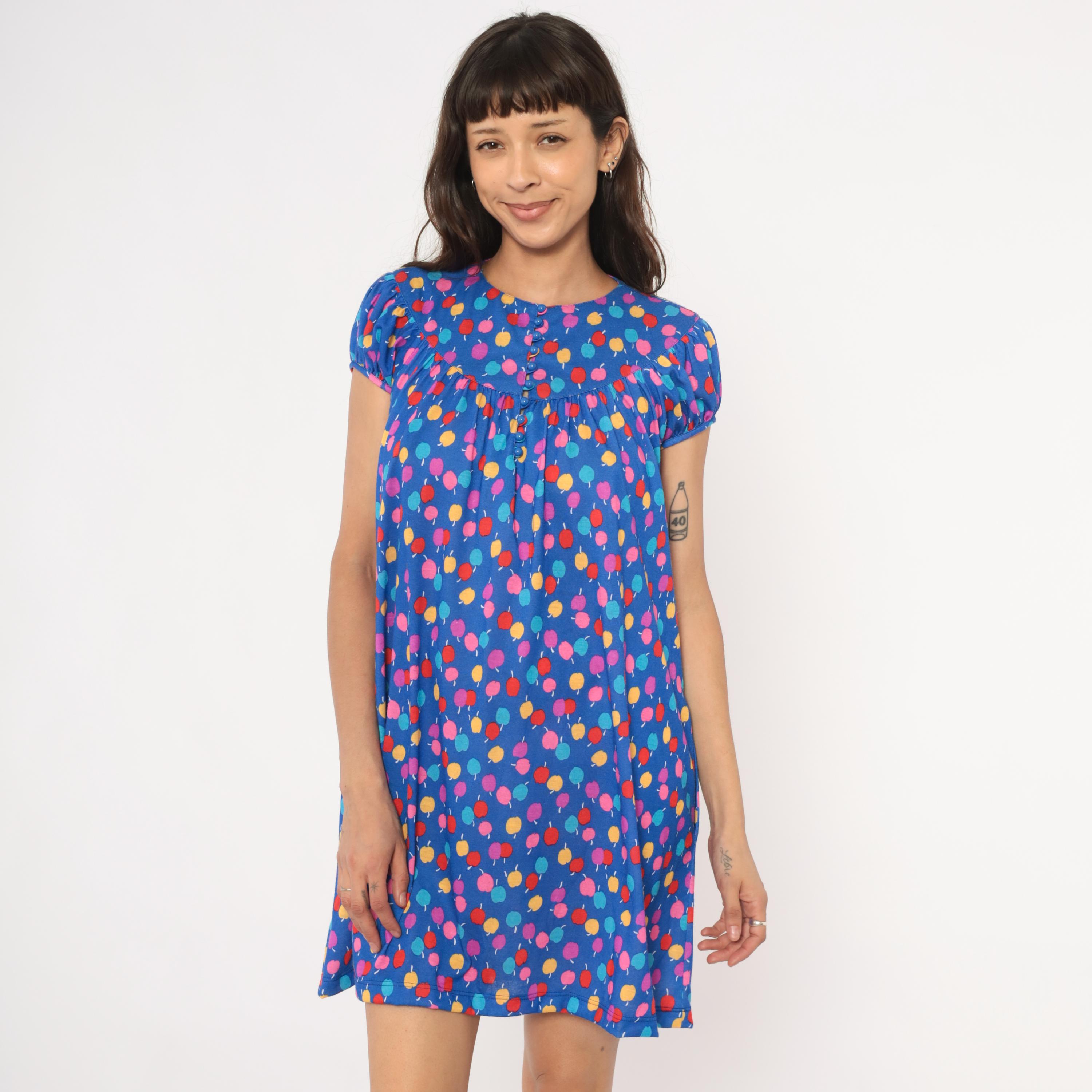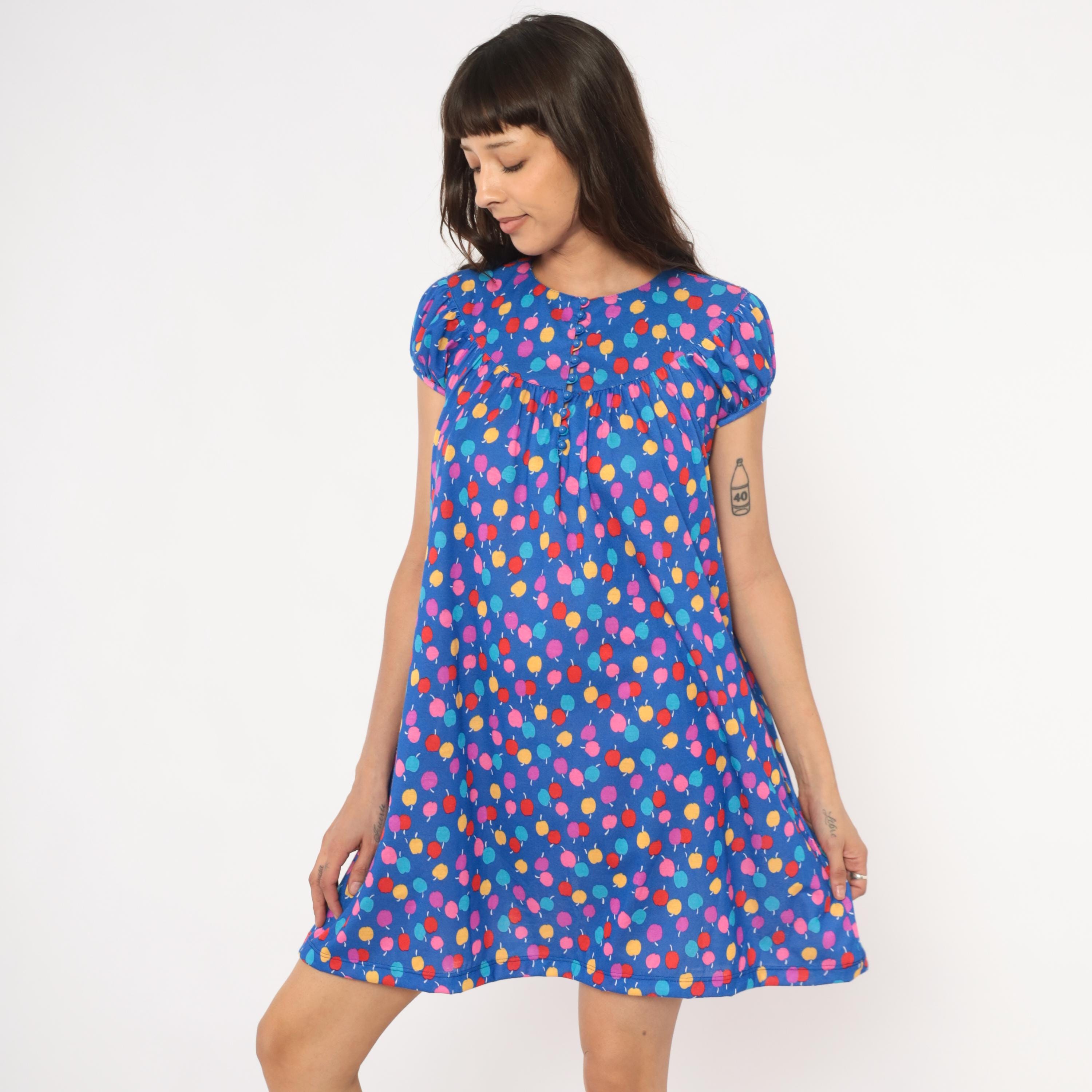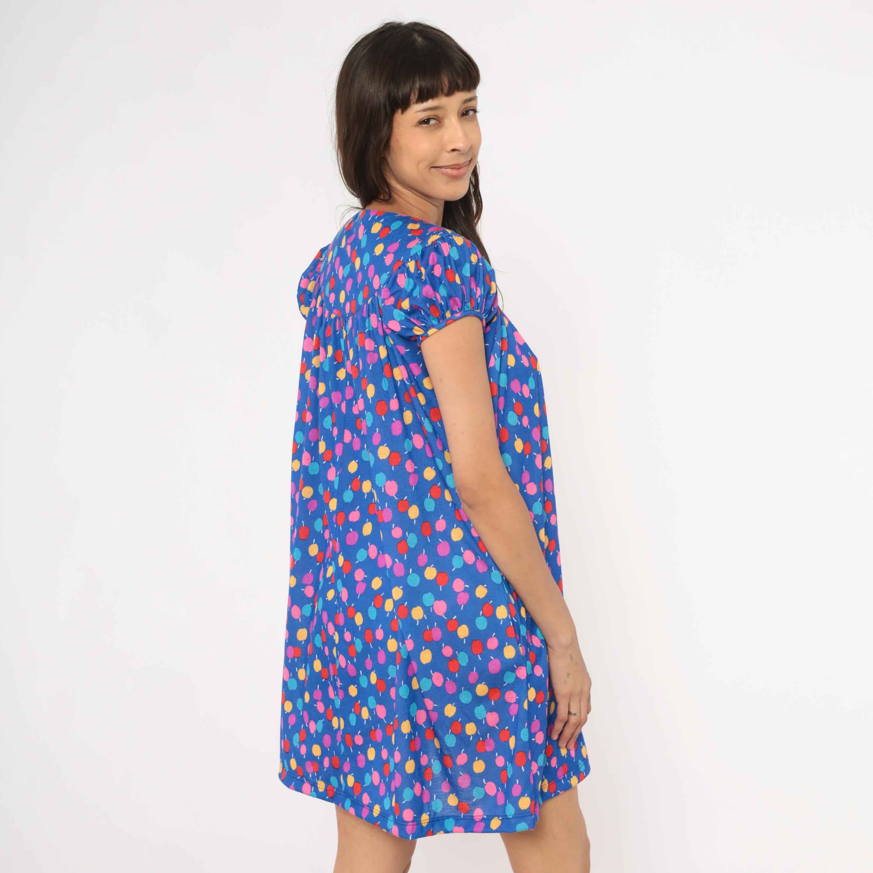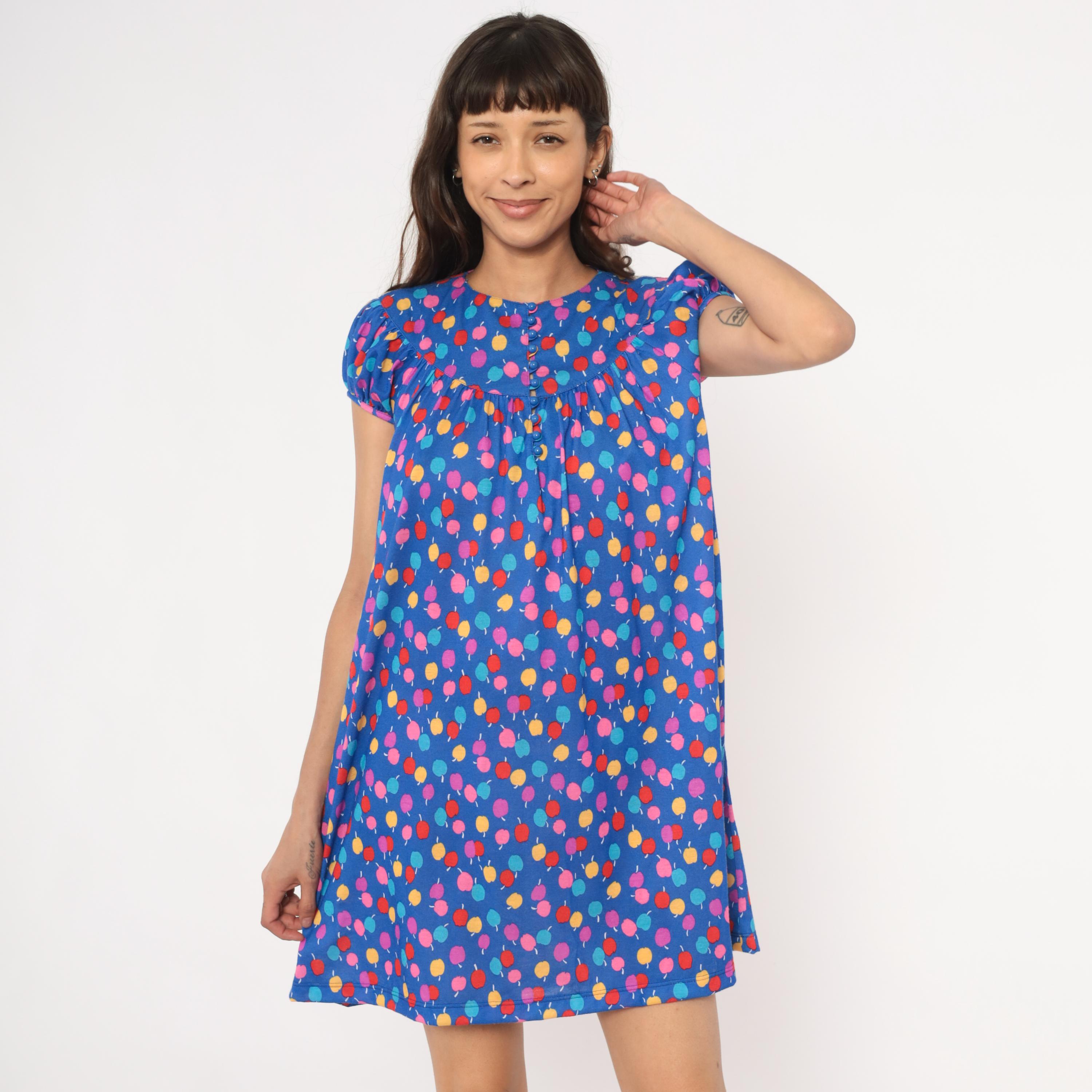 Blue babydoll dress with an allover apple print in pink, red, magenta, teal, and orange on a cobalt background. Round neckline with partial button front closure and gathered yoke, puff cap sleeves with elastic cuffs. A-line silhouette from the gathered bodice through the skirt, hitting above the knee.