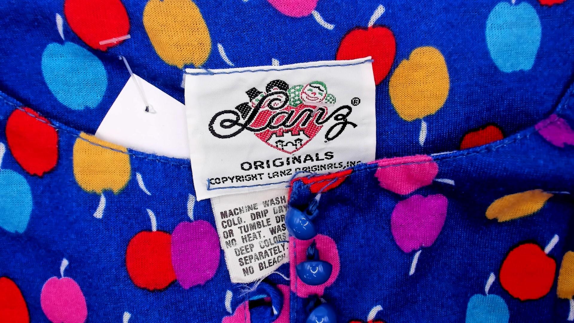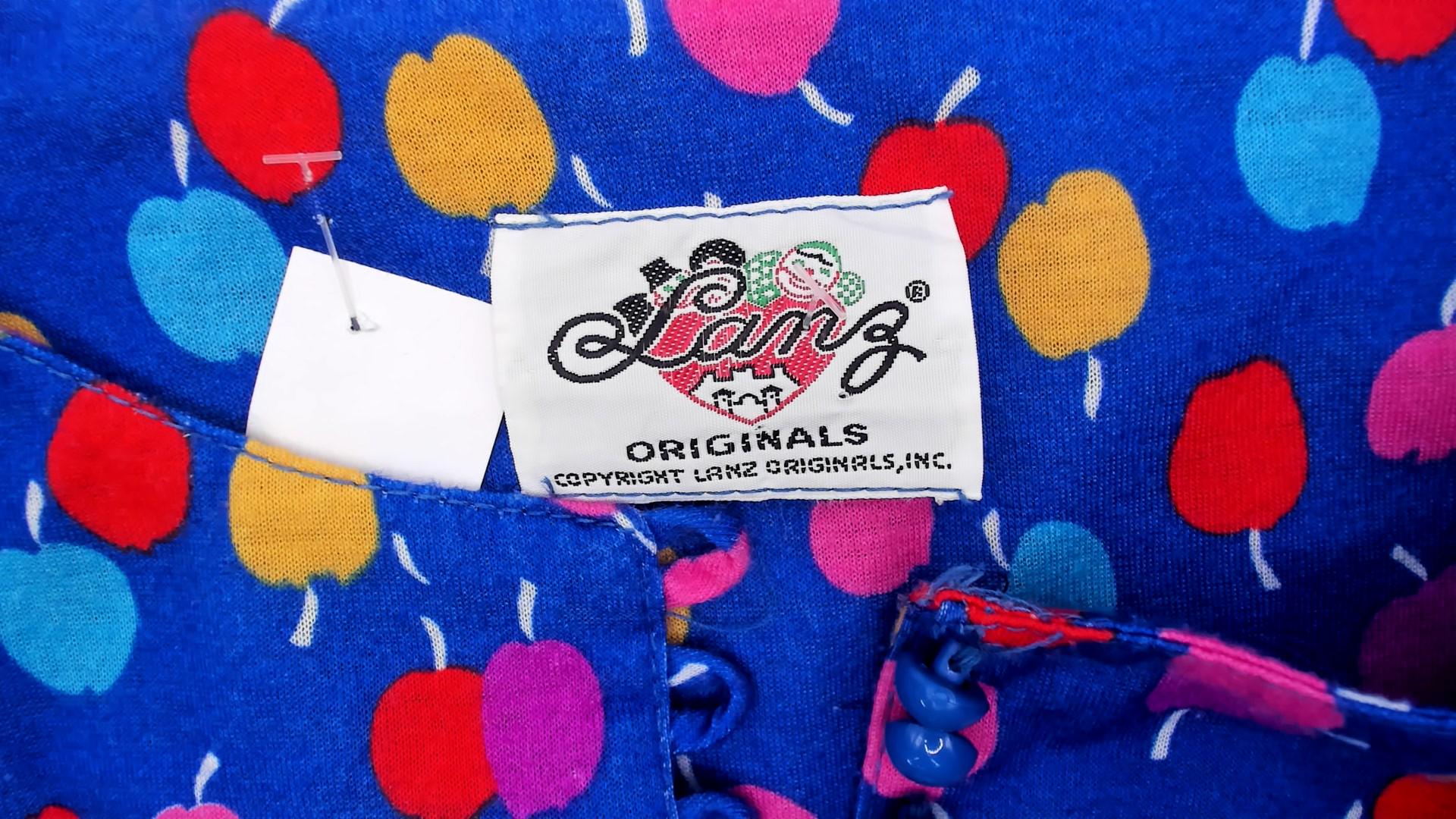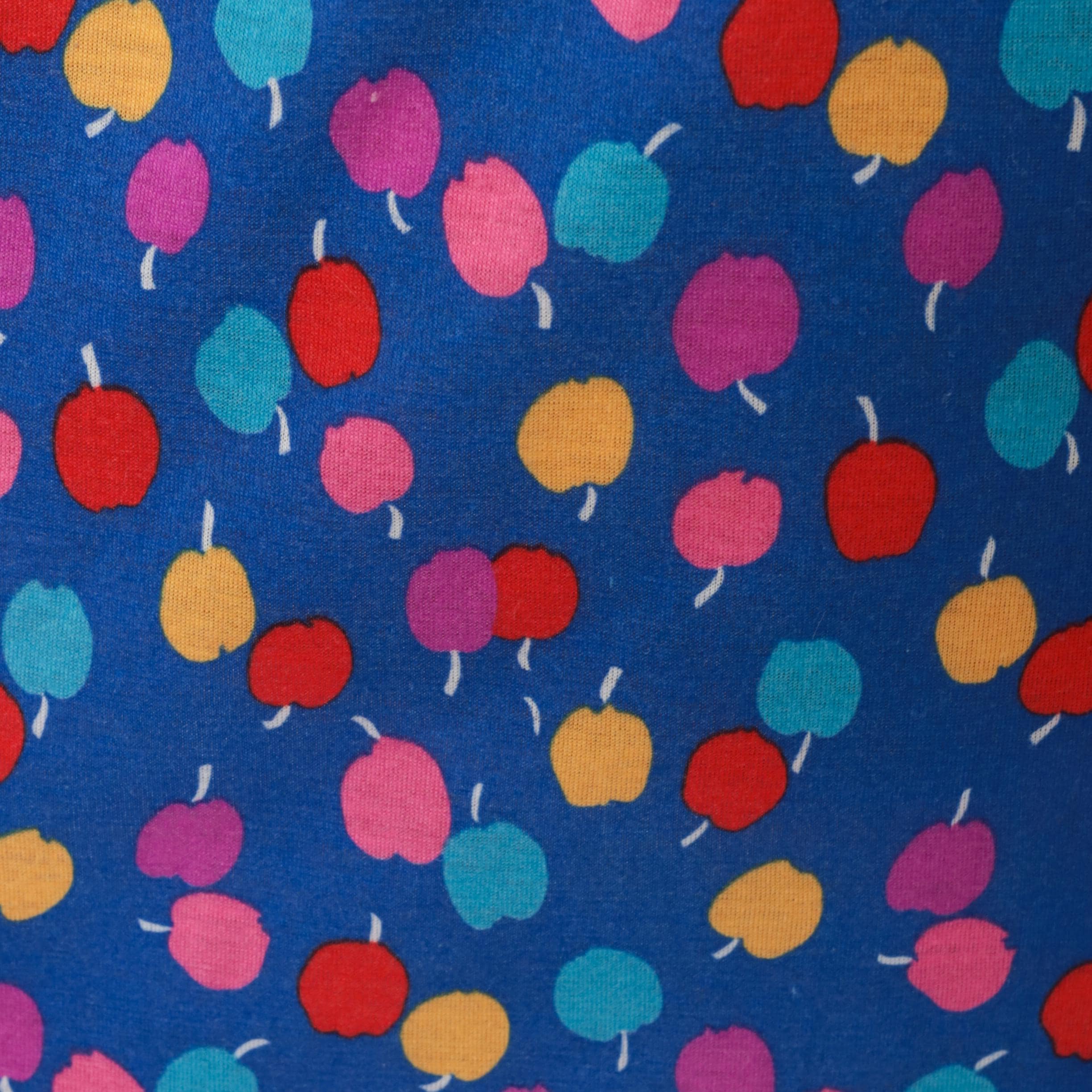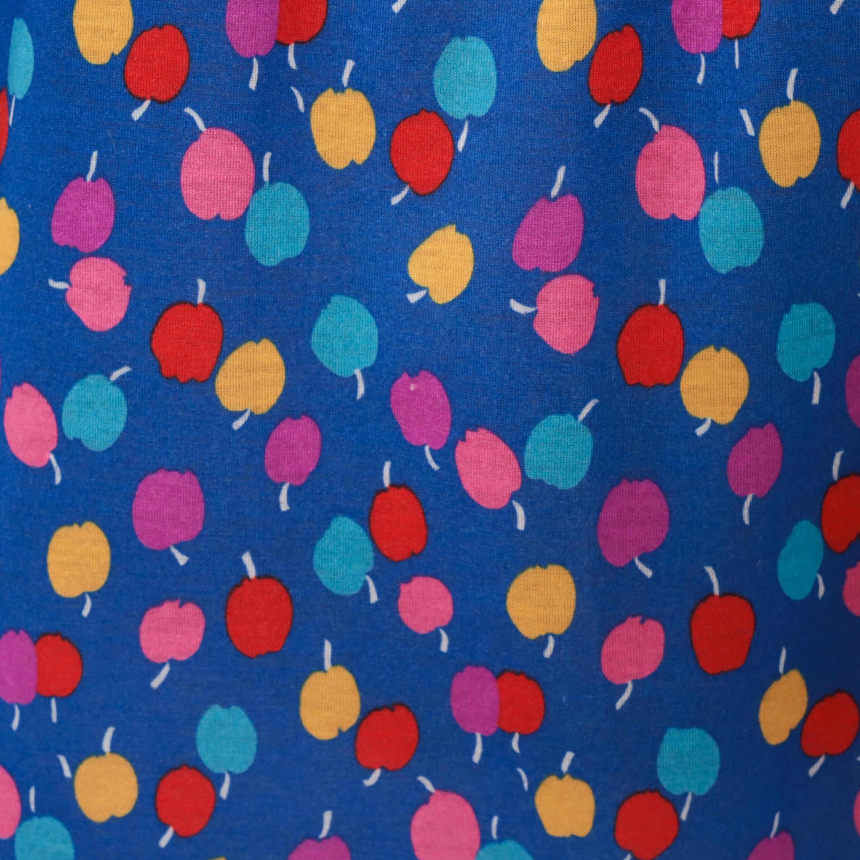 Blue babydoll dress with an allover apple print in pink, red, magenta, teal, and orange on a cobalt background. Round neckline with partial button front closure and gathered yoke, puff cap sleeves with elastic cuffs. A-line silhouette from the gathered bodice through the skirt, hitting above the knee.