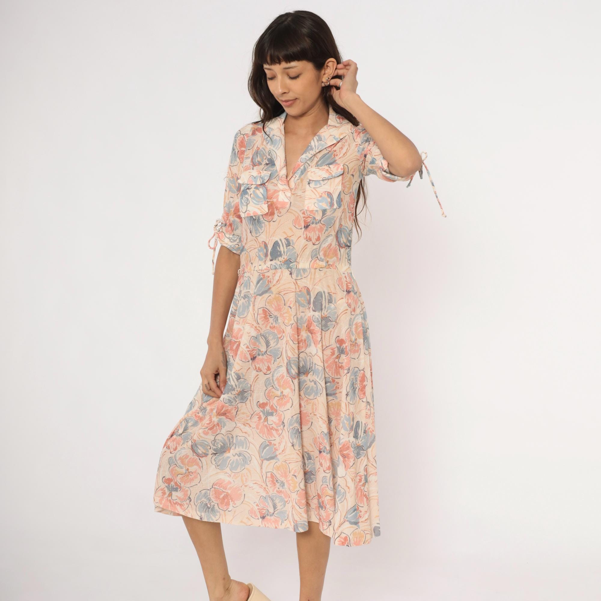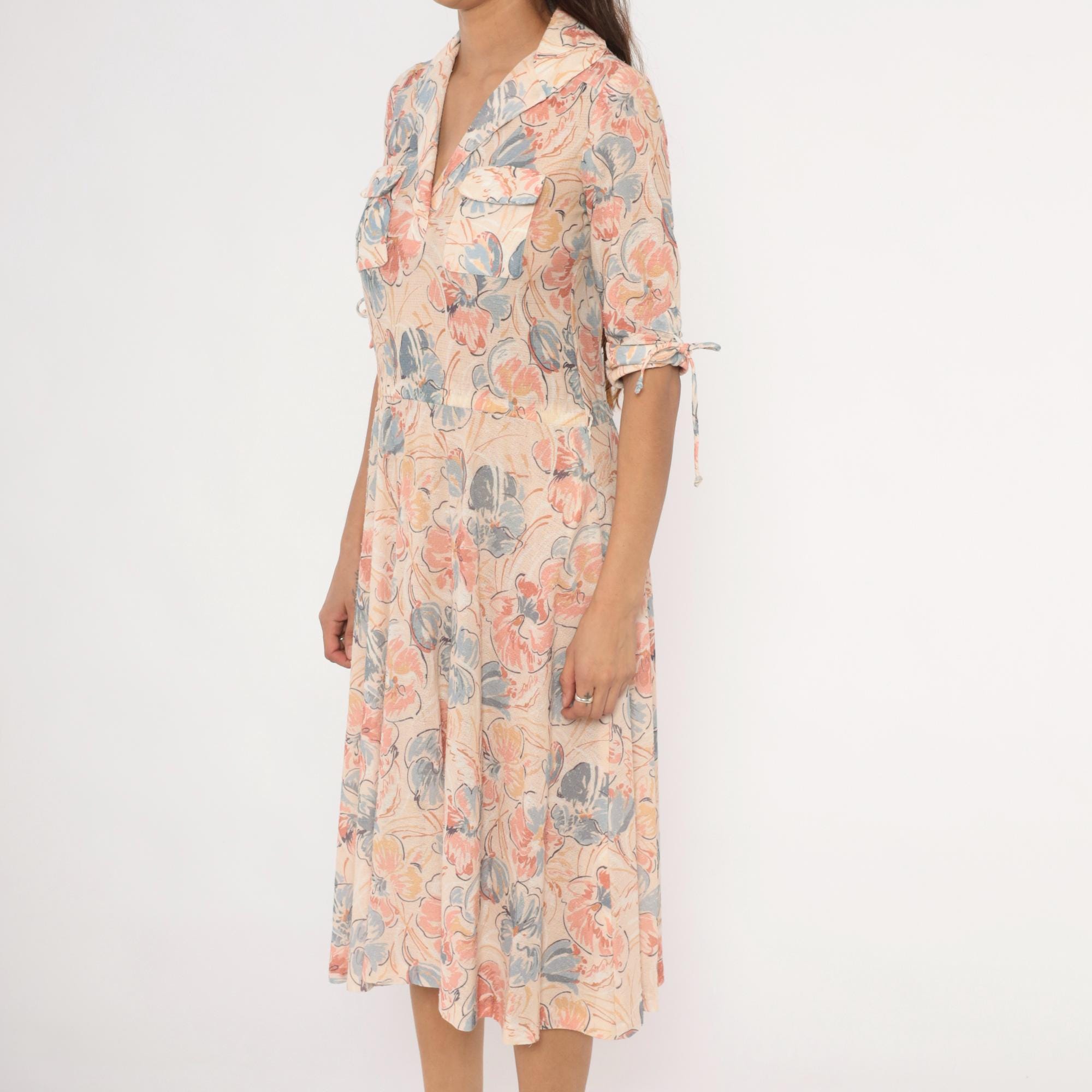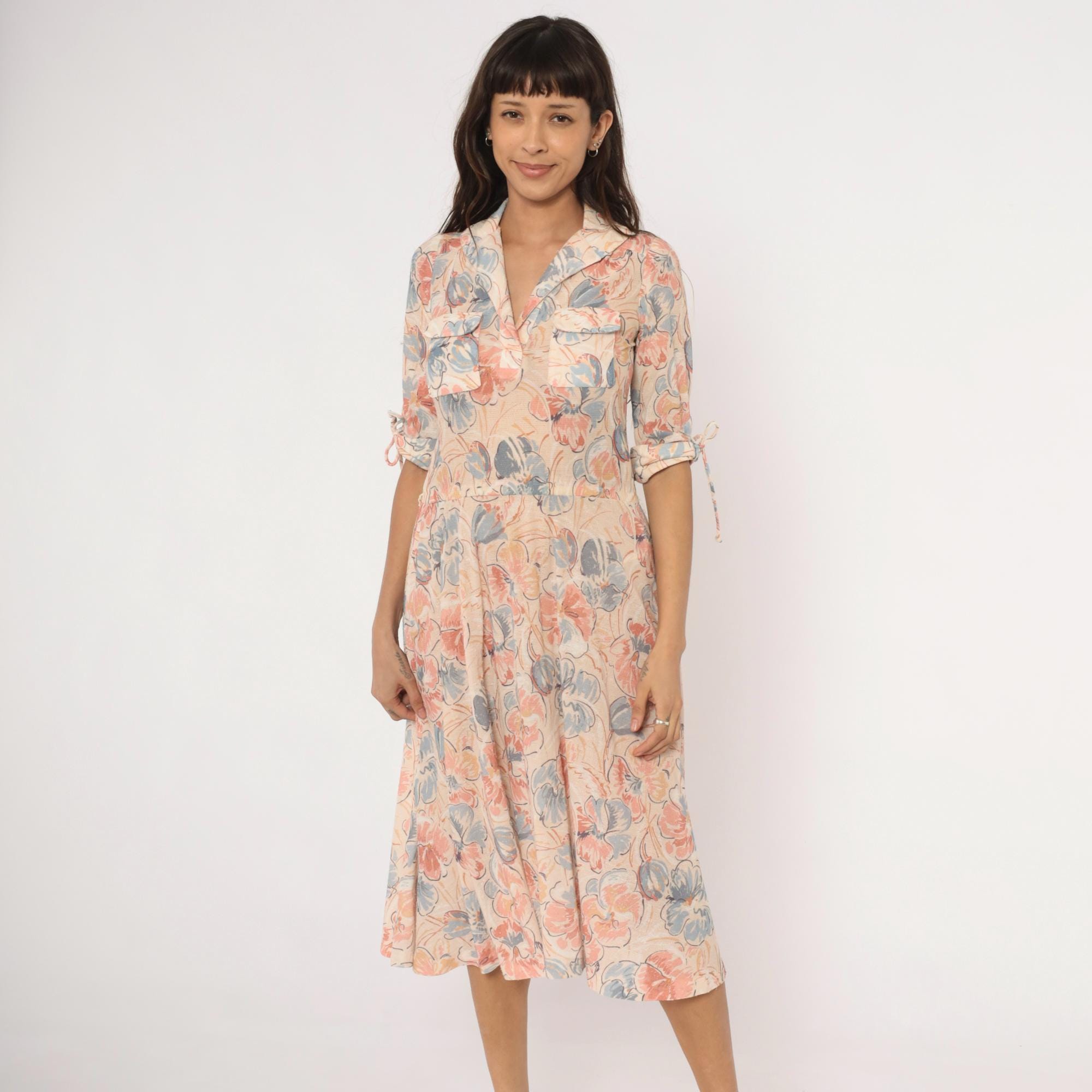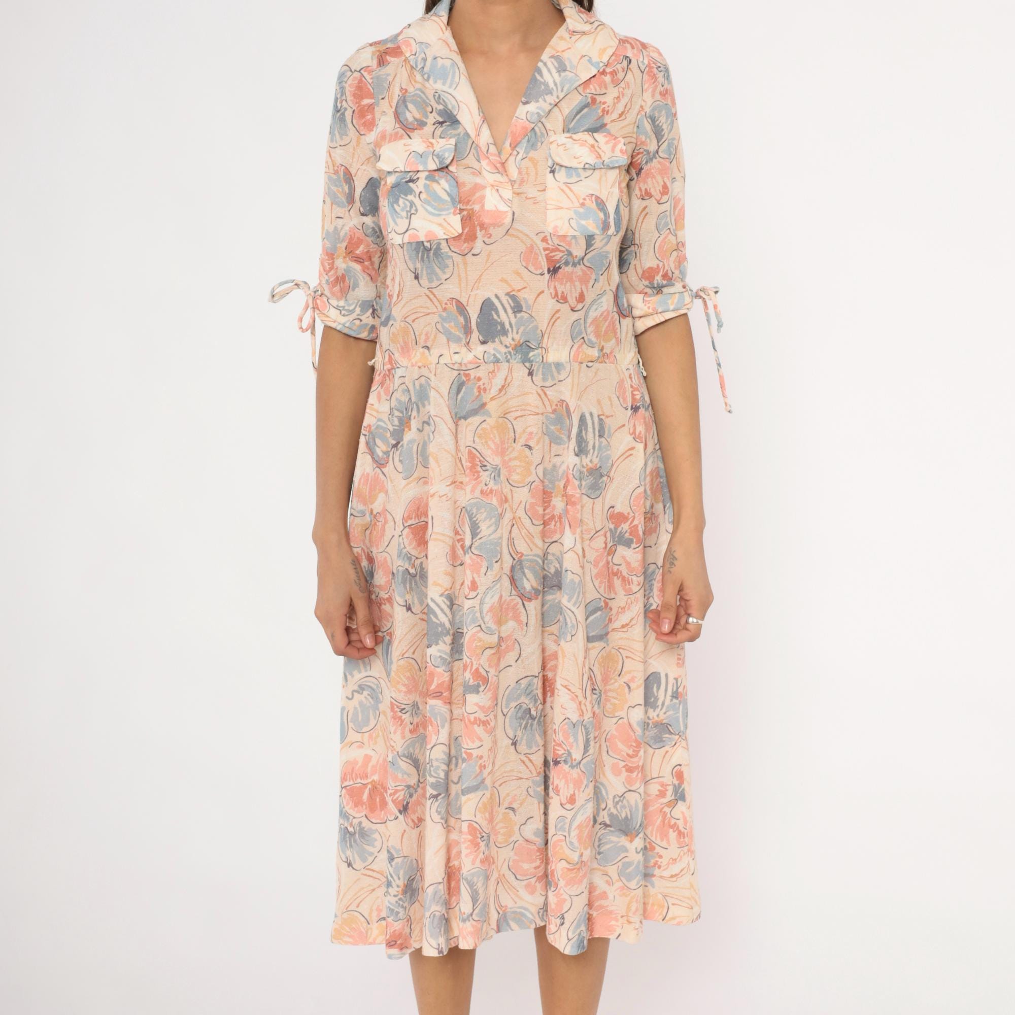 Watercolor floral midi dress in blush, dusty blue, and peach tones on a cream base, with a notched lapel collar and V neckline. Half sleeves with fabric tie details at the cuffs, two front flap chest pockets, and a fitted waist with an A-line skirt.