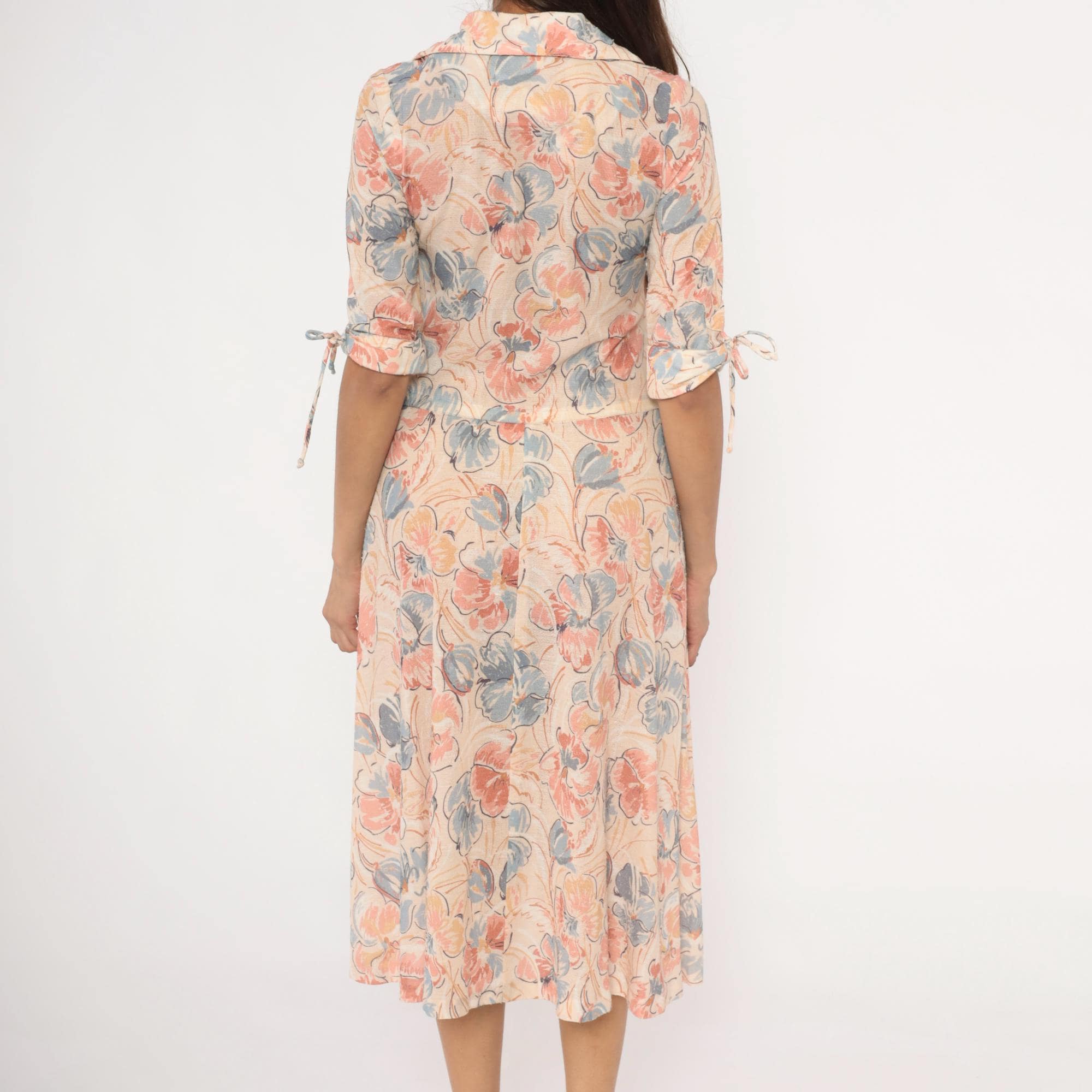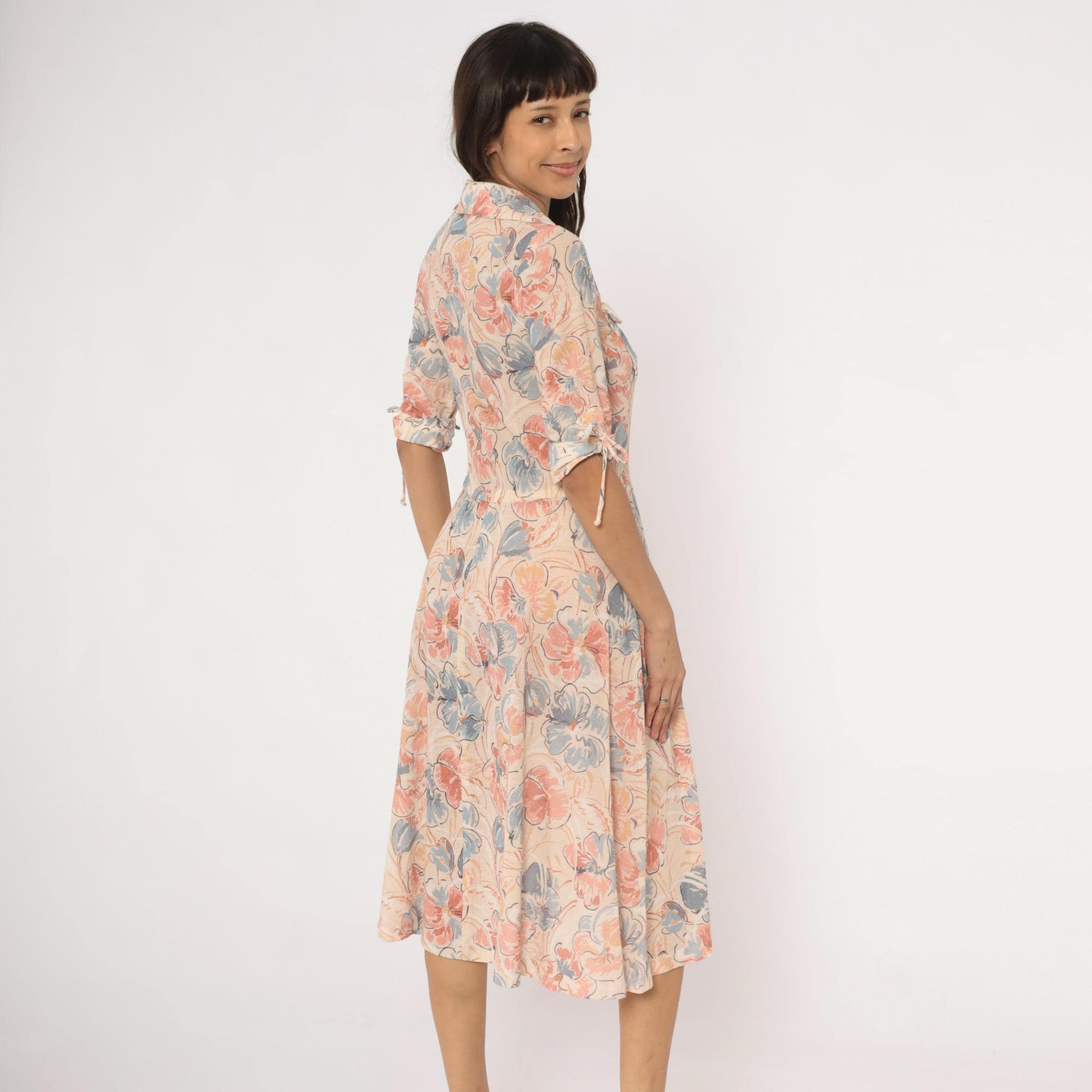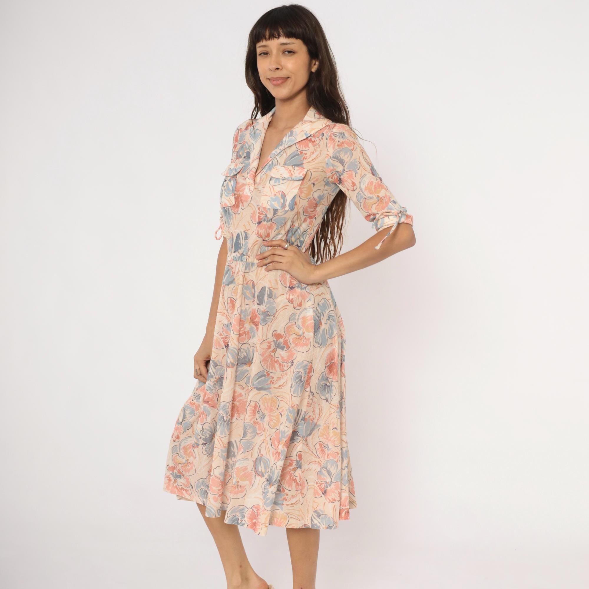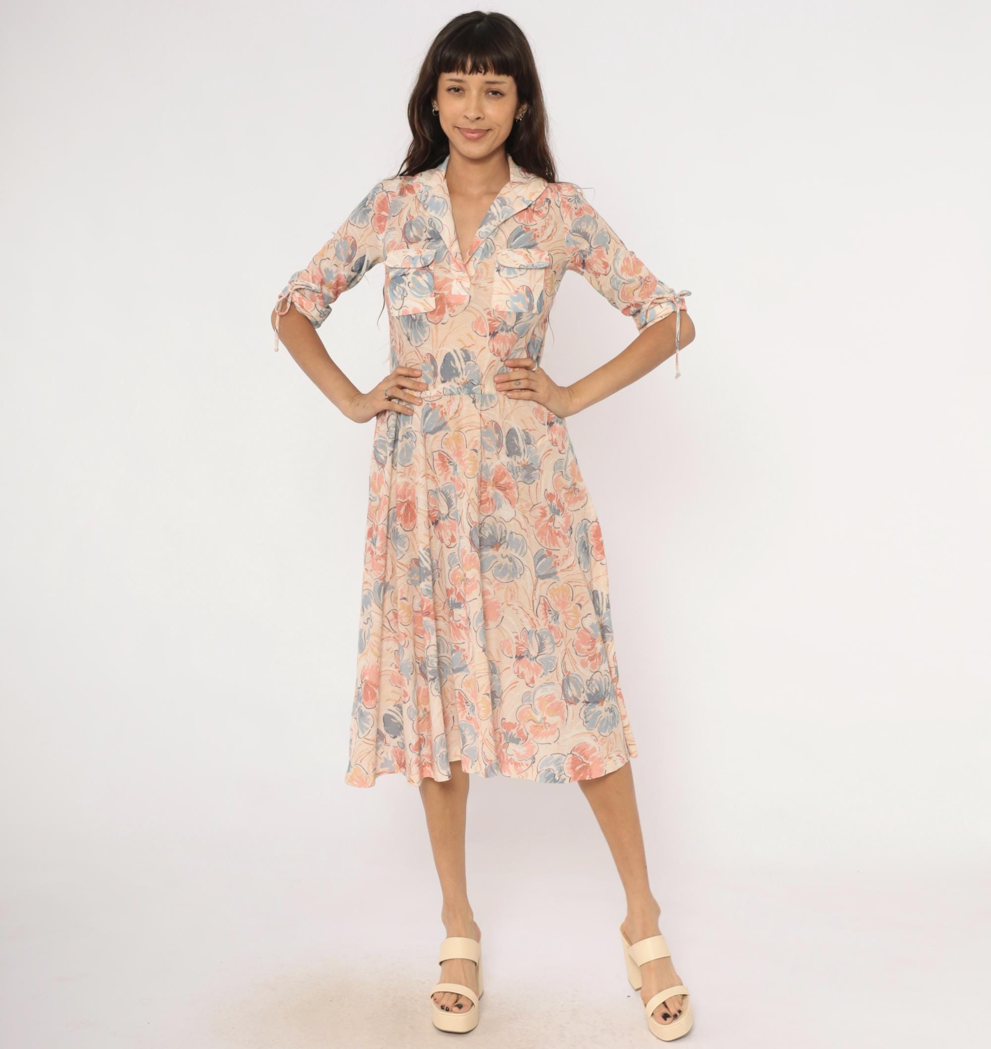 Watercolor floral midi dress in blush, dusty blue, and peach tones on a cream base, with a notched lapel collar and V neckline. Half sleeves with fabric tie details at the cuffs, two front flap chest pockets, and a fitted waist with an A-line skirt.