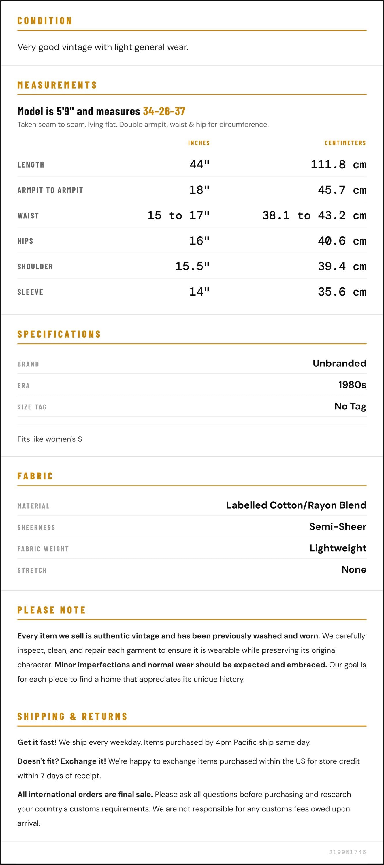 Measurements are taken laying flat and should be doubled where applicable. The "best fits" size is just an estimate, and vintage sizing can vary from modern sizing. Please use measurements to ensure proper fit. The best thing to do is measure a similar item of your own, and compare. When an item has stretch, we will list the unstretched dimensions with the stretched measurement afterwards.