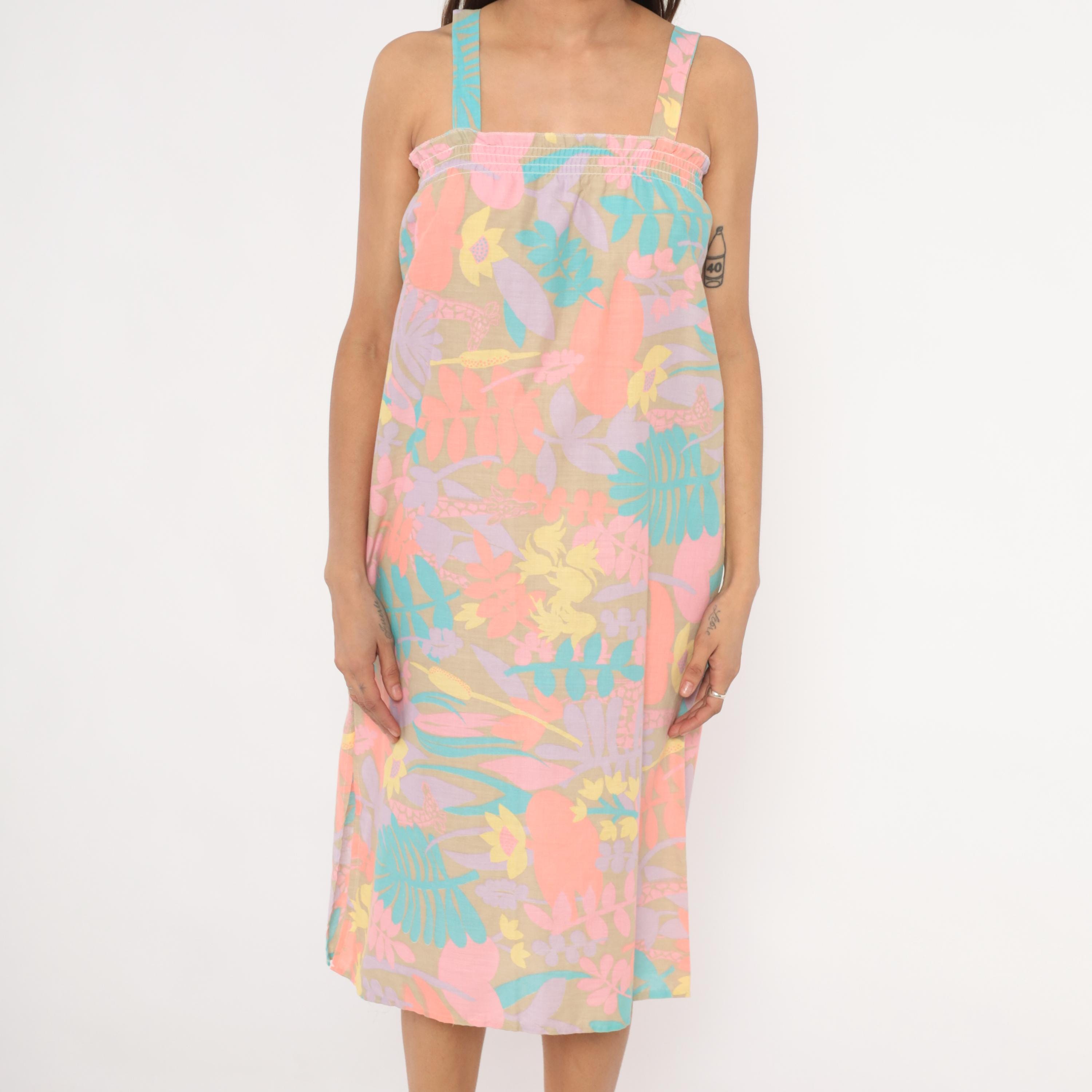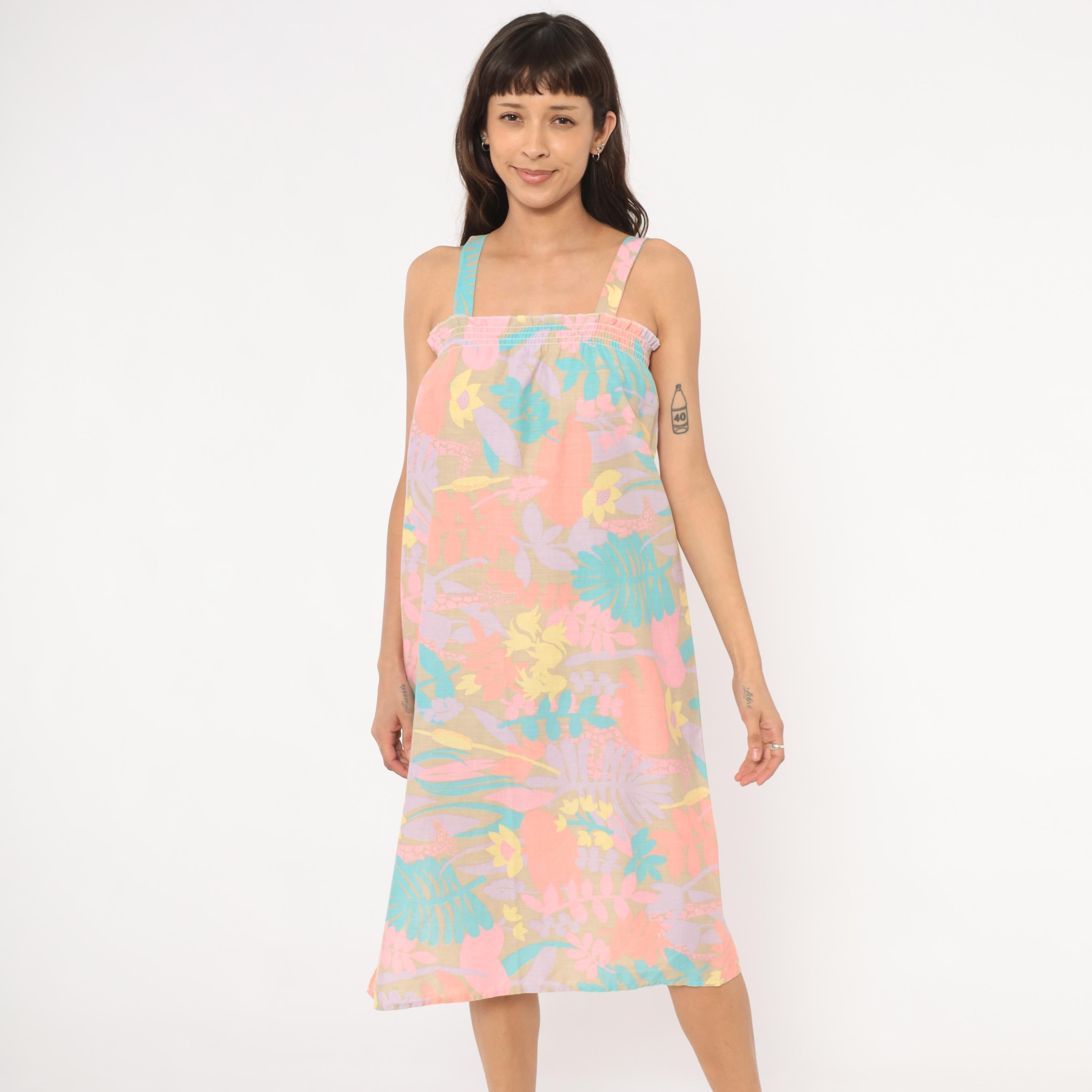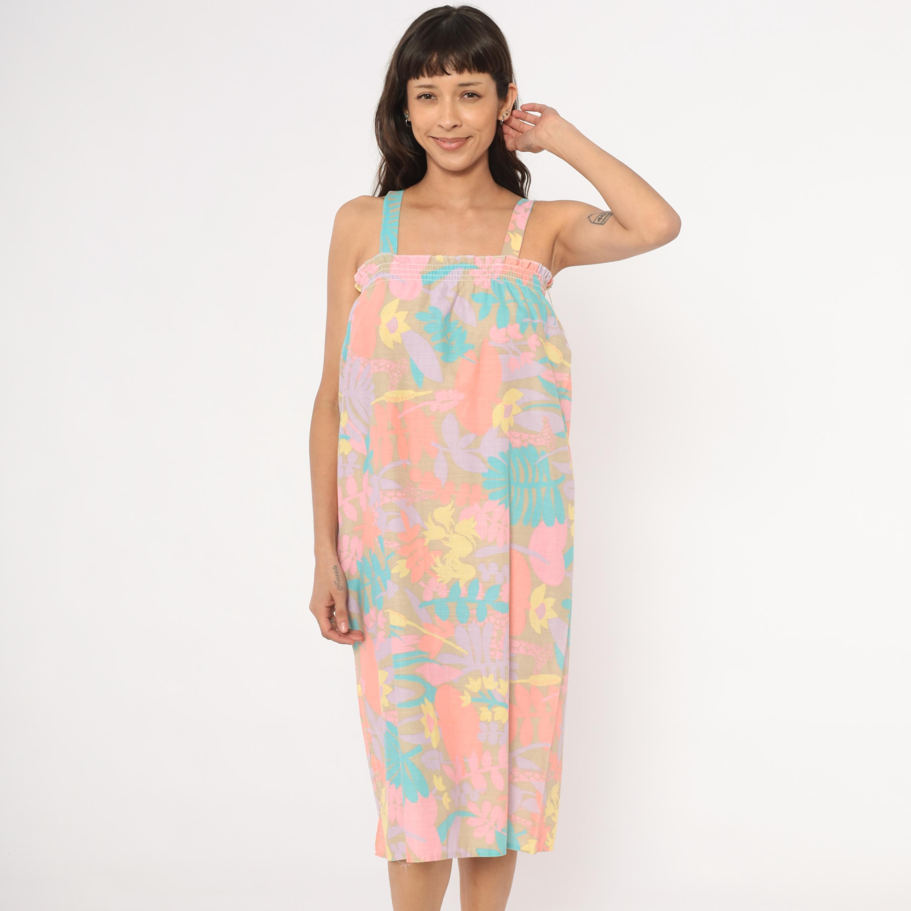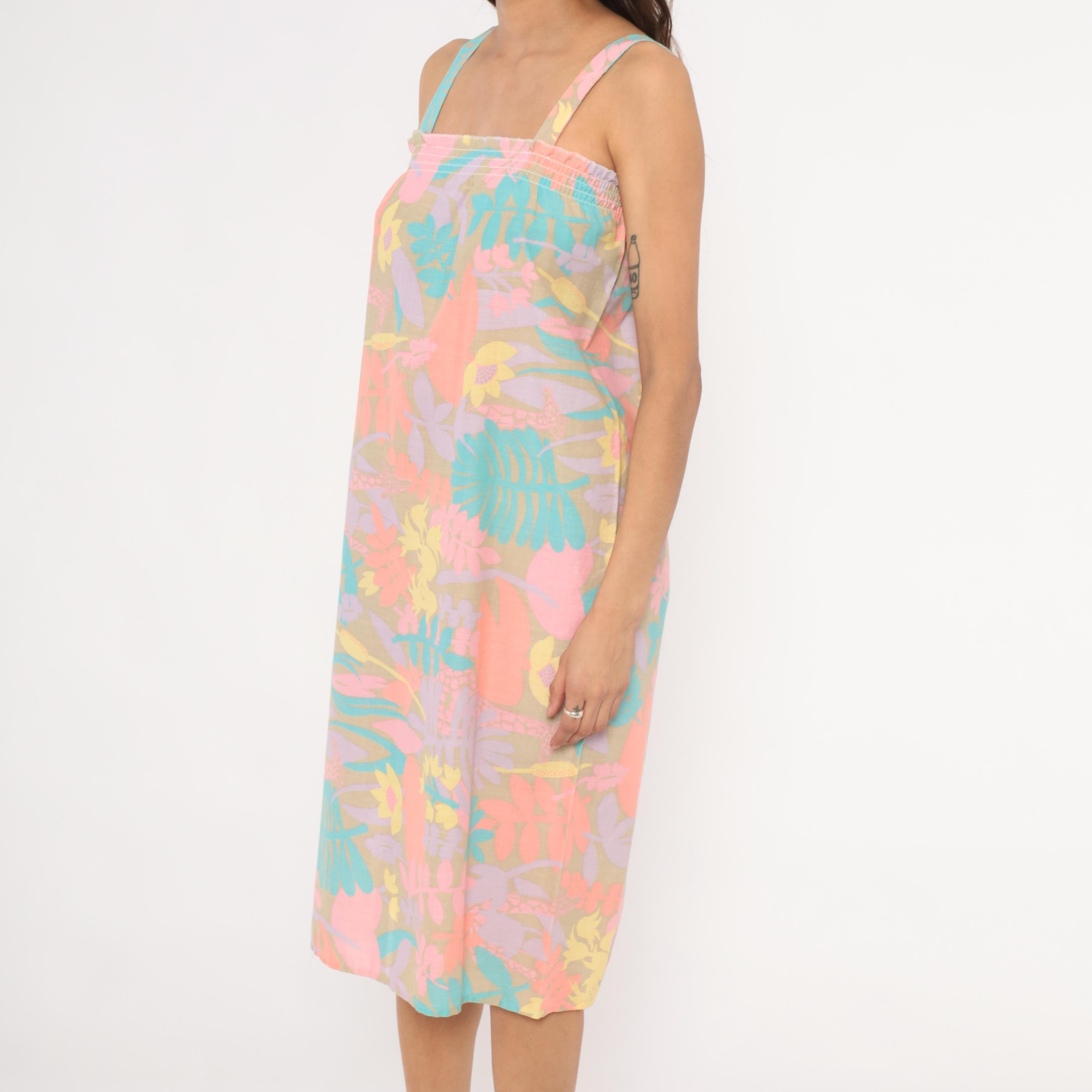 80s pastel tropical sundress with an allover print of large-scale flowers, giraffes, ferns, and palm fronds in coral, salmon, lavender, teal, and yellow against a muted olive-tan ground. Smocked elastic bodice with ruffled upper edge and wide fixed shoulder straps.