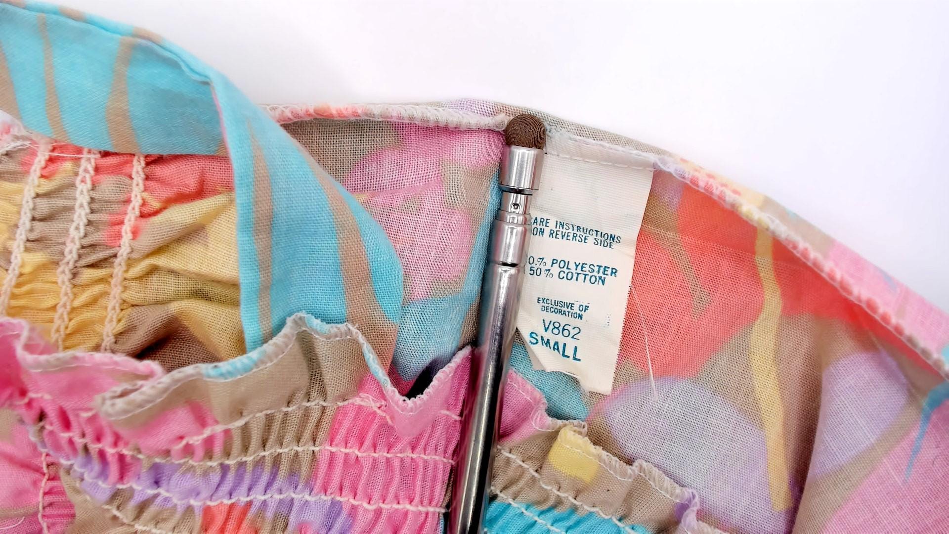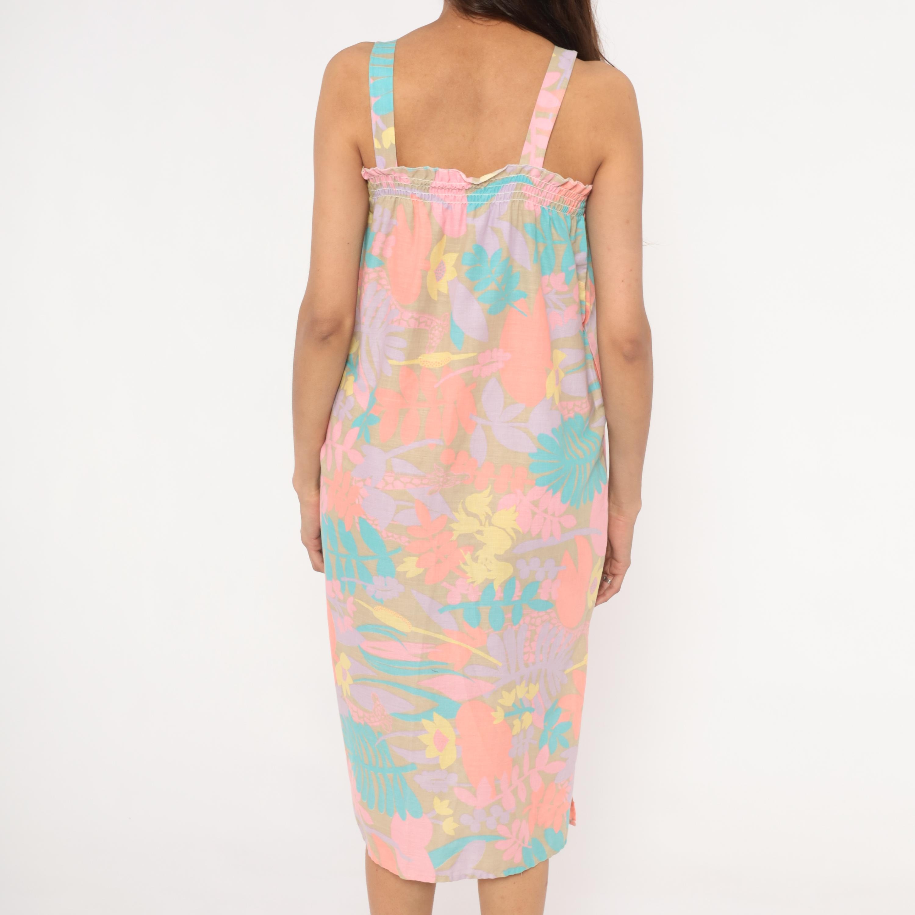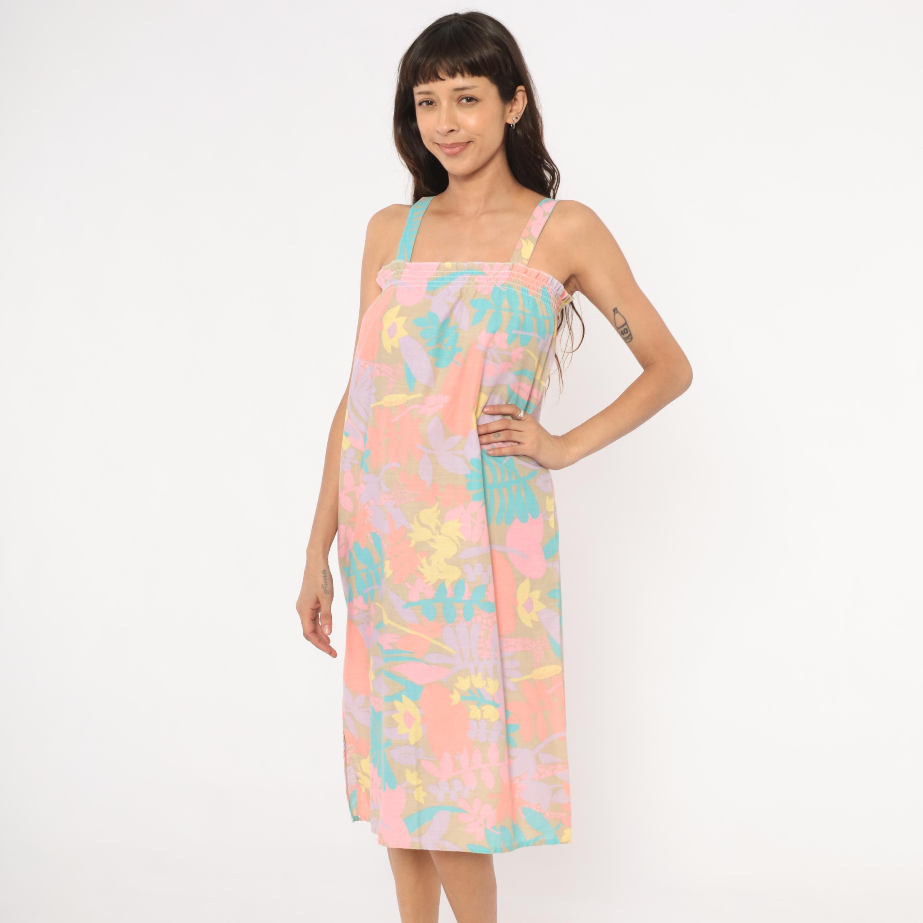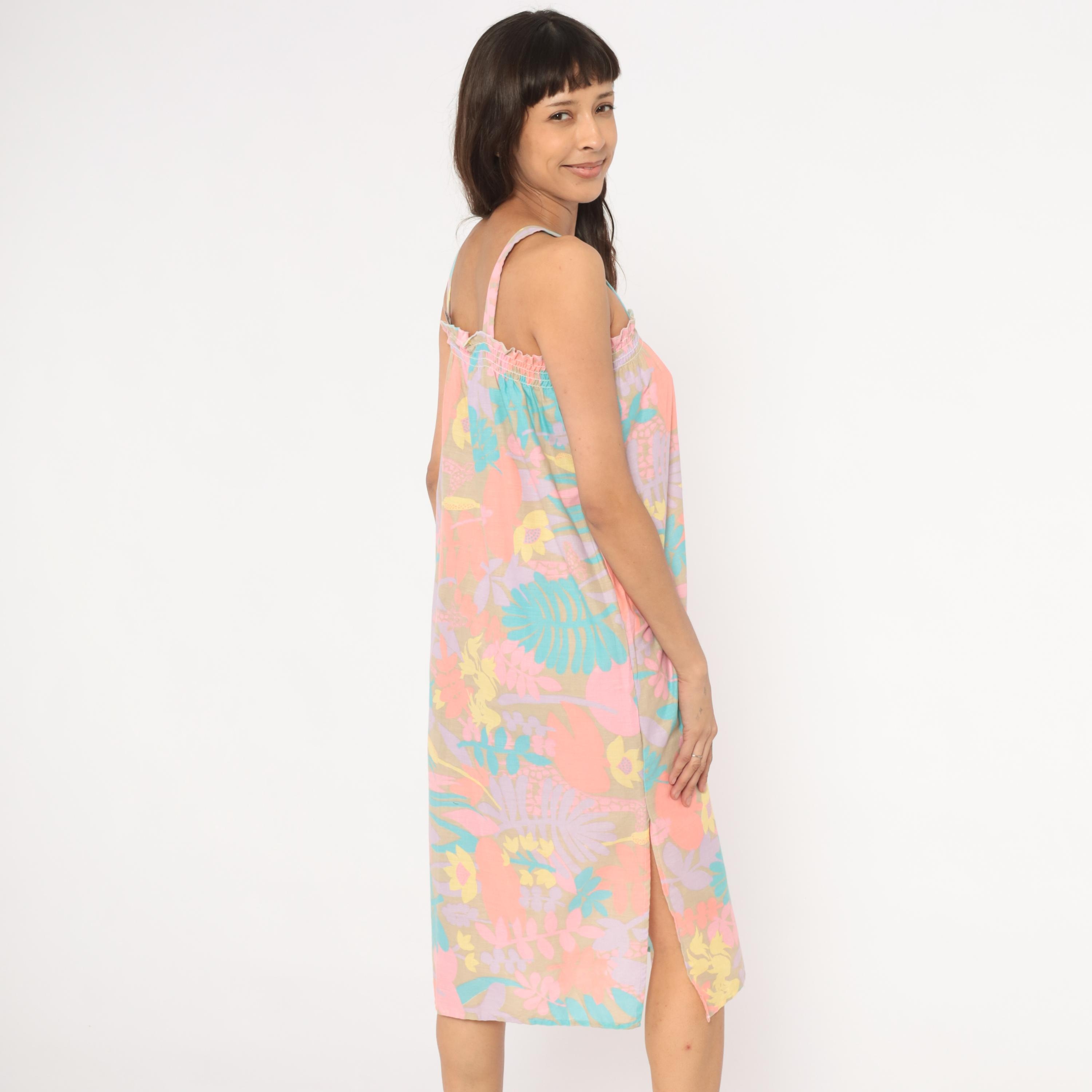 80s pastel tropical sundress with an allover print of large-scale flowers, giraffes, ferns, and palm fronds in coral, salmon, lavender, teal, and yellow against a muted olive-tan ground. Smocked elastic bodice with ruffled upper edge and wide fixed shoulder straps.