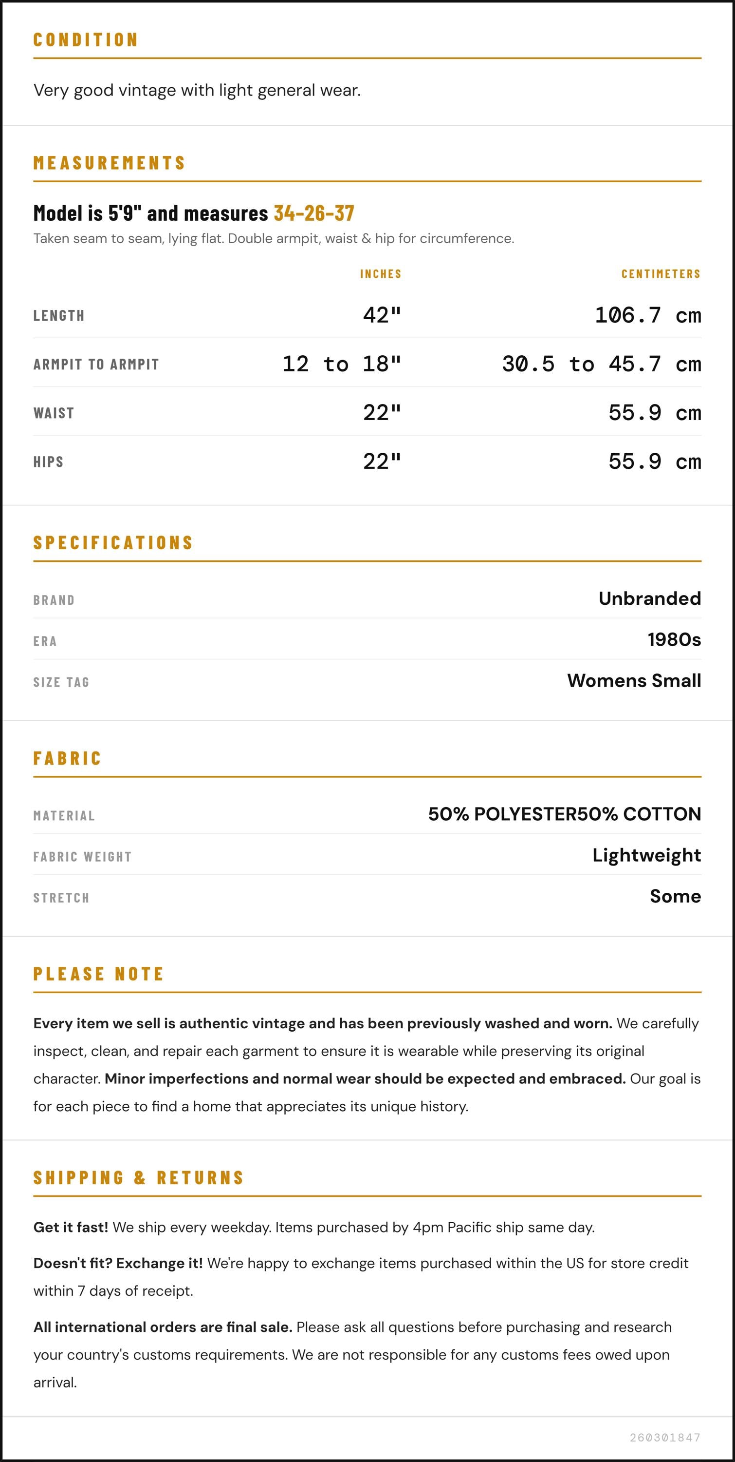 Vintage denim was usually made without any stretch, unlike modern jeans. Check the measurements to ensure proper fit, and remember to give yourself a little wiggle room in the waist and hips, depending on your preferred fit.