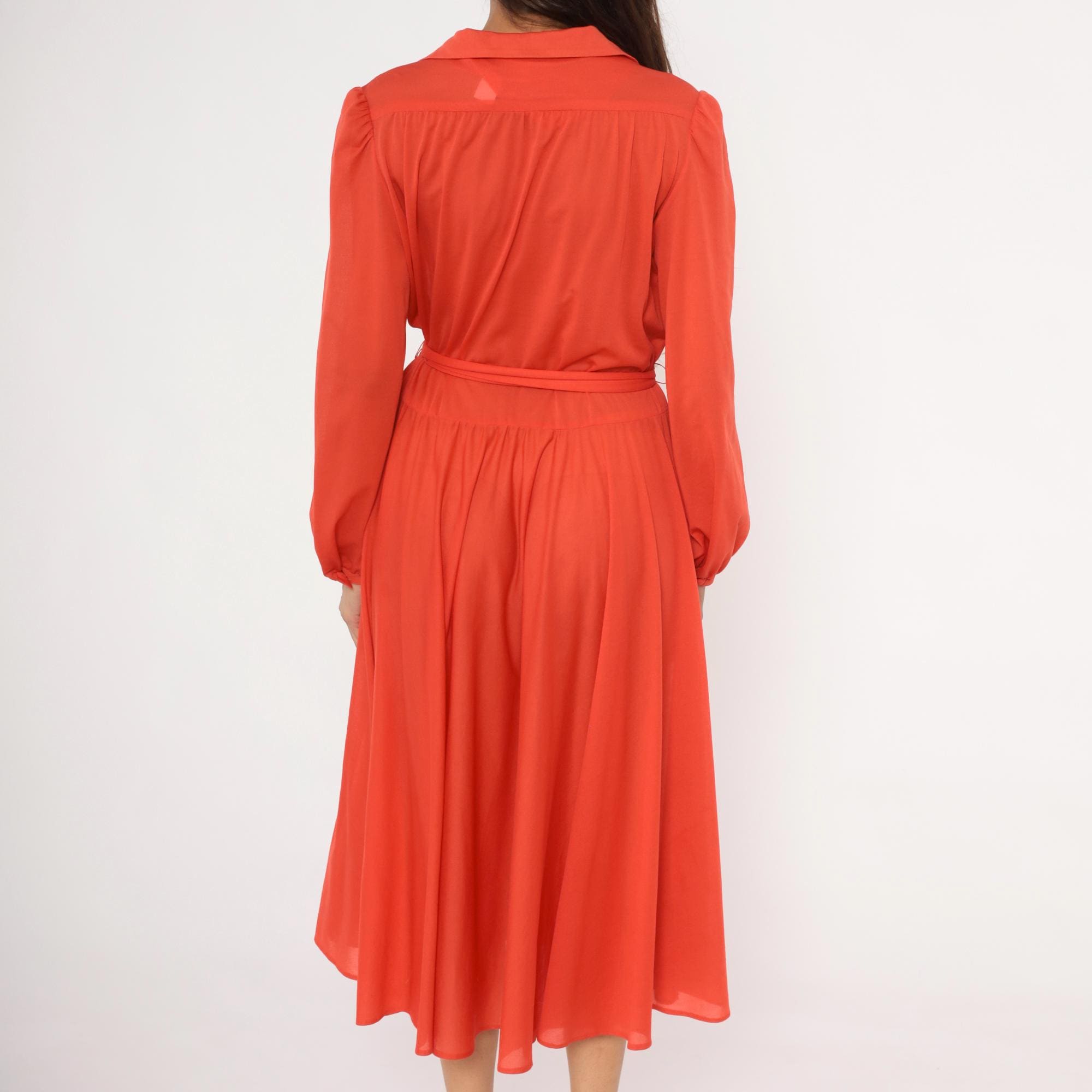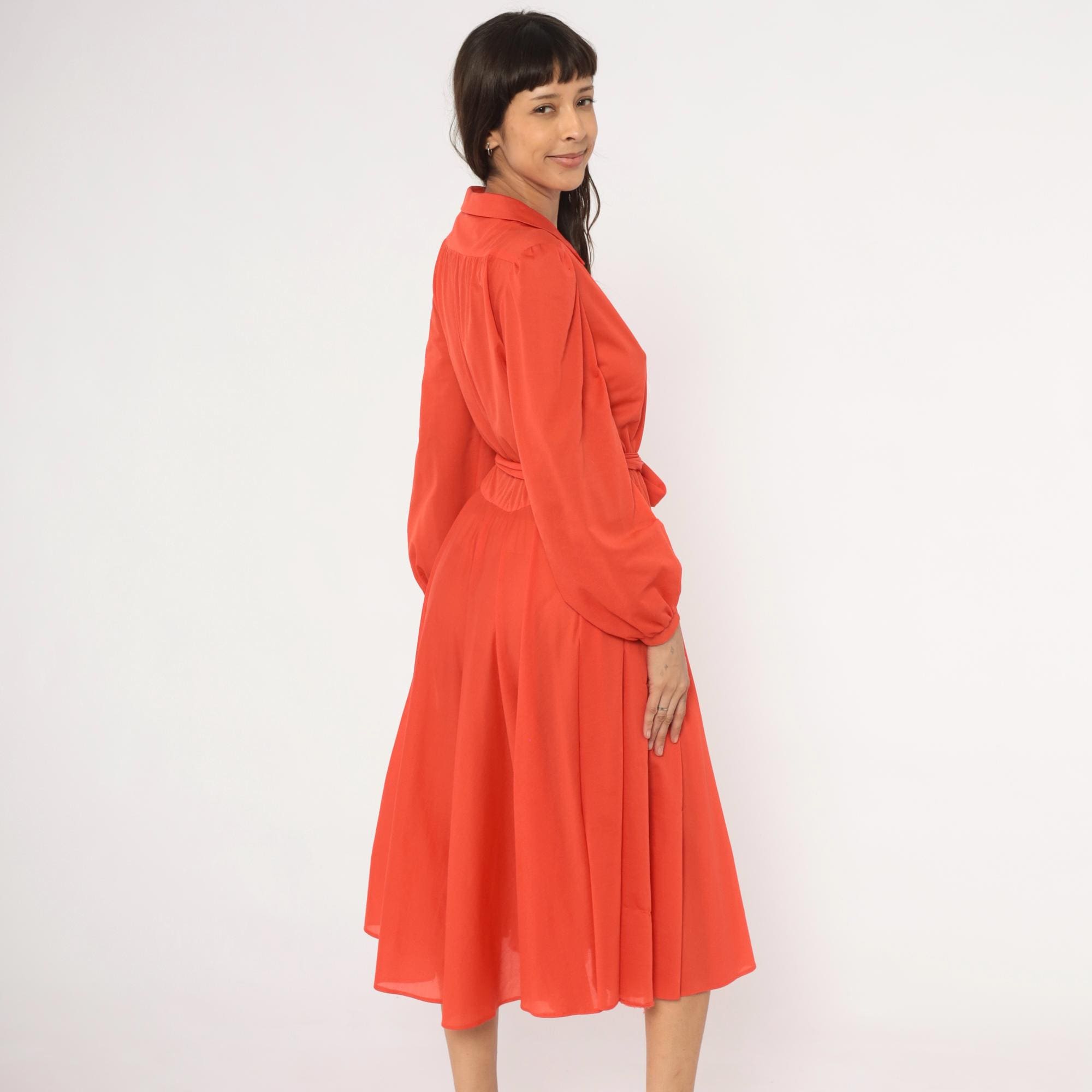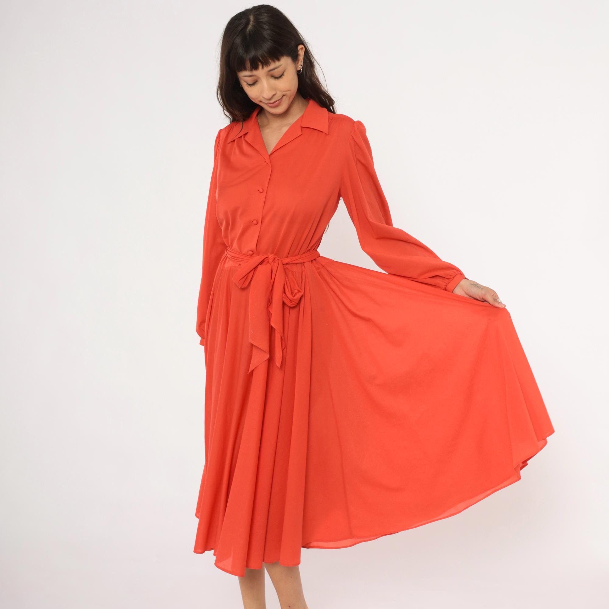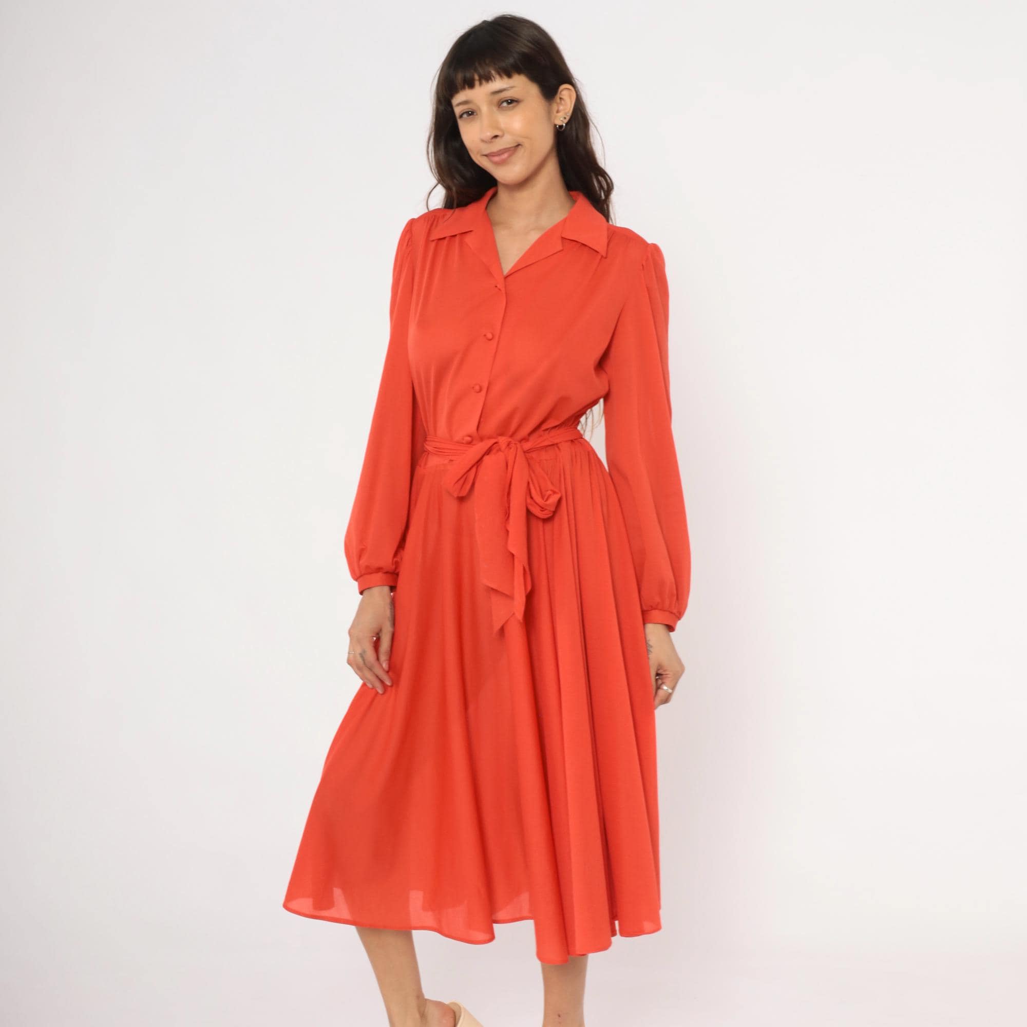 Coral 70s shirtdress with a notched spread collar, button front closure, and self-tie fabric belt at the waist. Bishop sleeves with buttoned cuffs and gathered shoulders. Full gathered A-line skirt falls to mid-calf length in a semi-sheer tangerine-toned fabric.