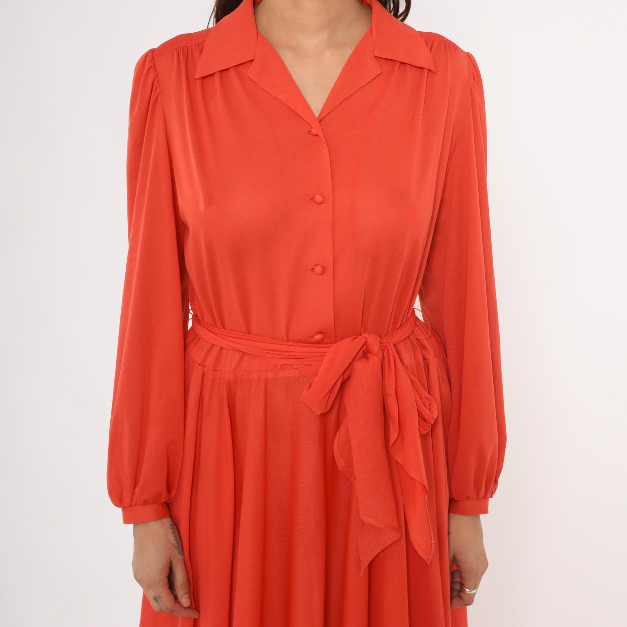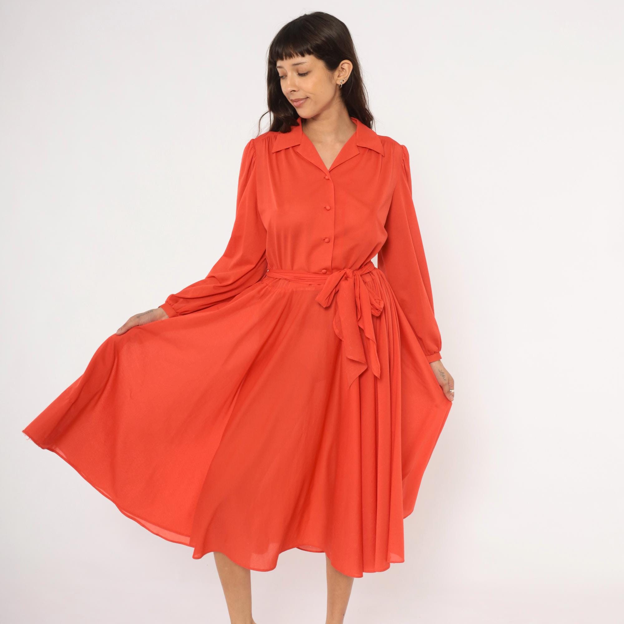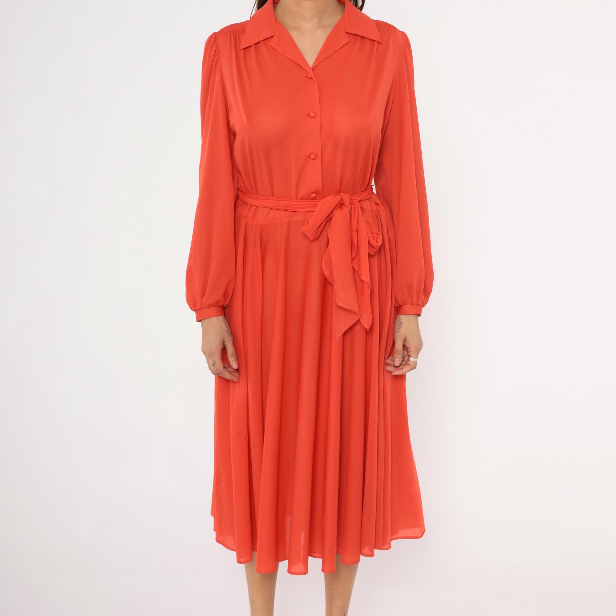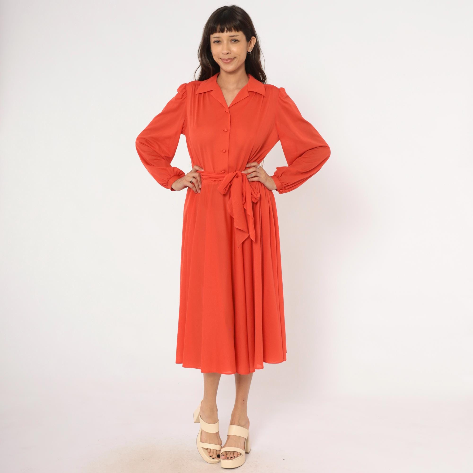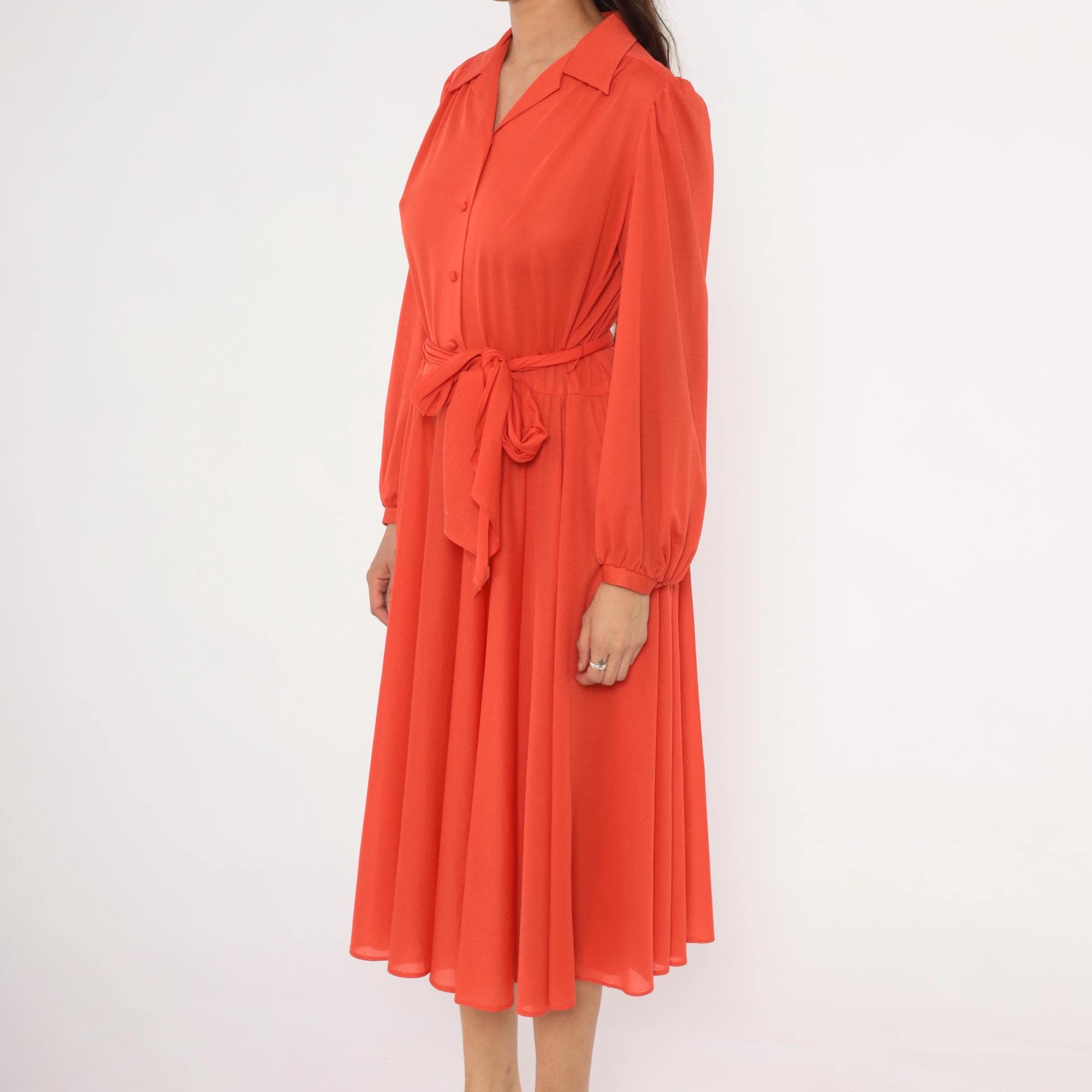 Coral 70s shirtdress with a notched spread collar, button front closure, and self-tie fabric belt at the waist. Bishop sleeves with buttoned cuffs and gathered shoulders. Full gathered A-line skirt falls to mid-calf length in a semi-sheer tangerine-toned fabric.