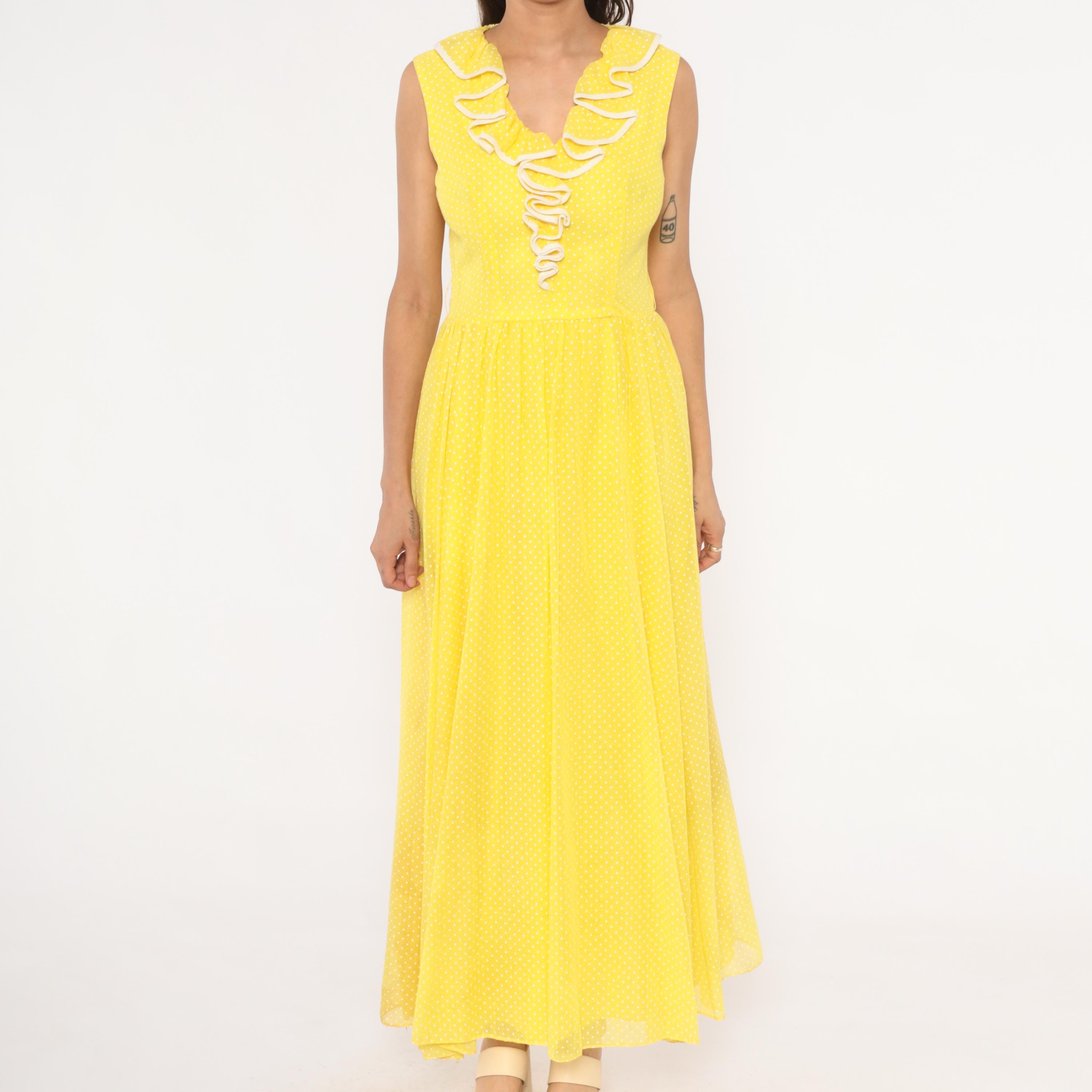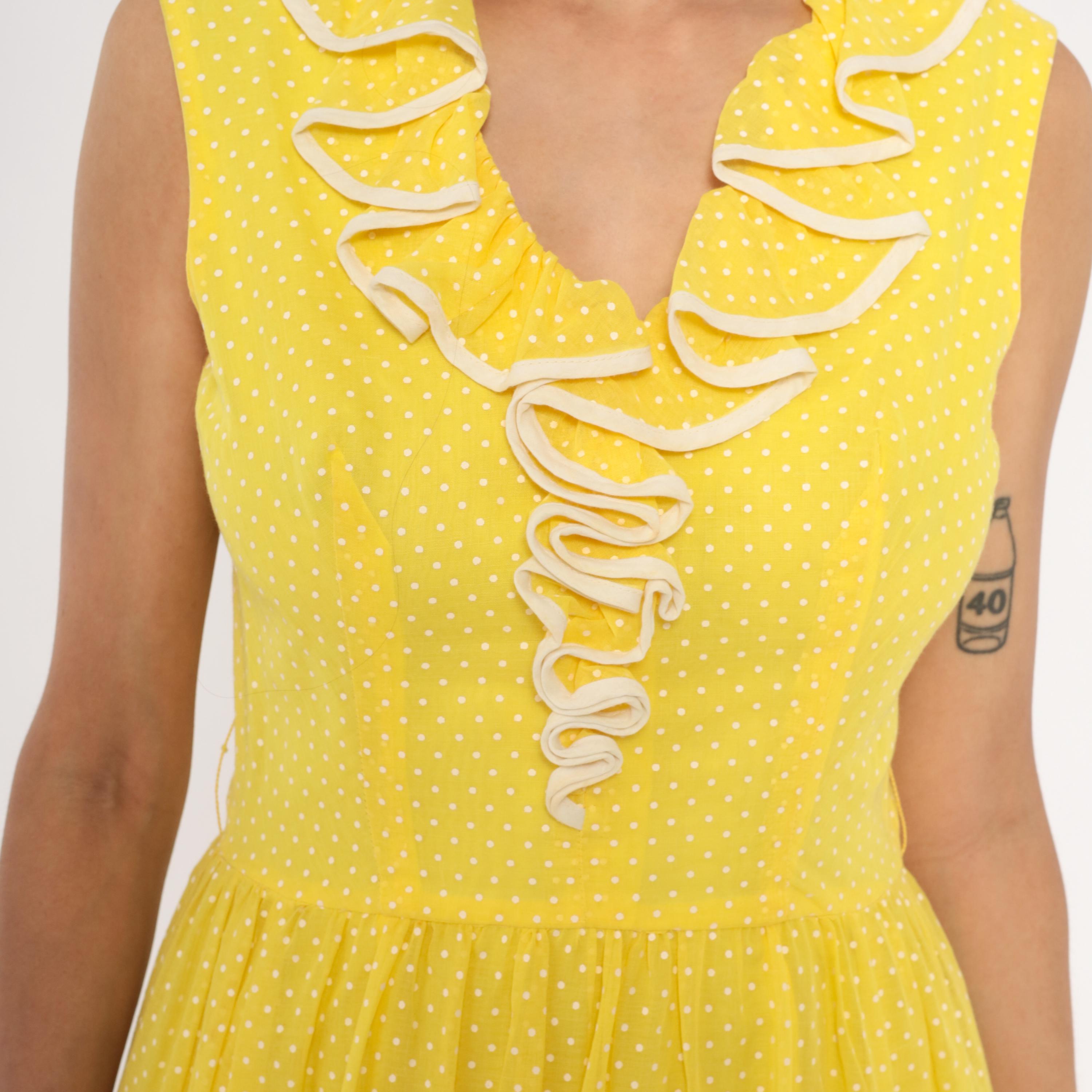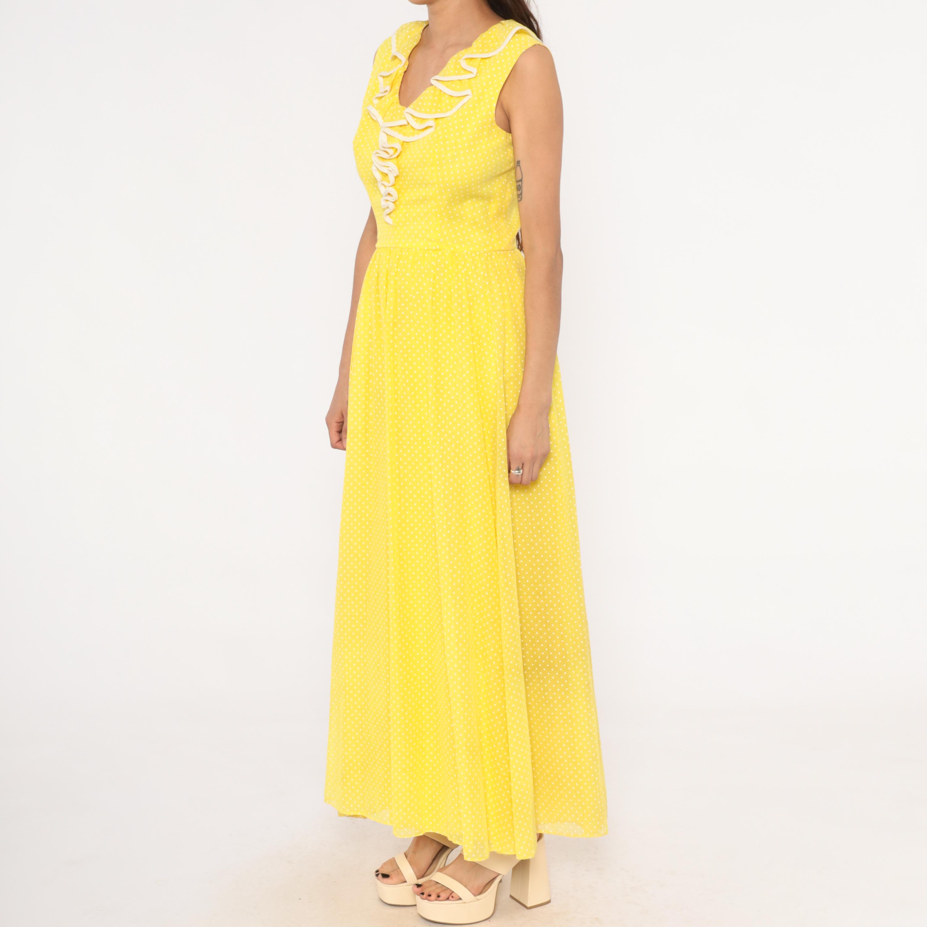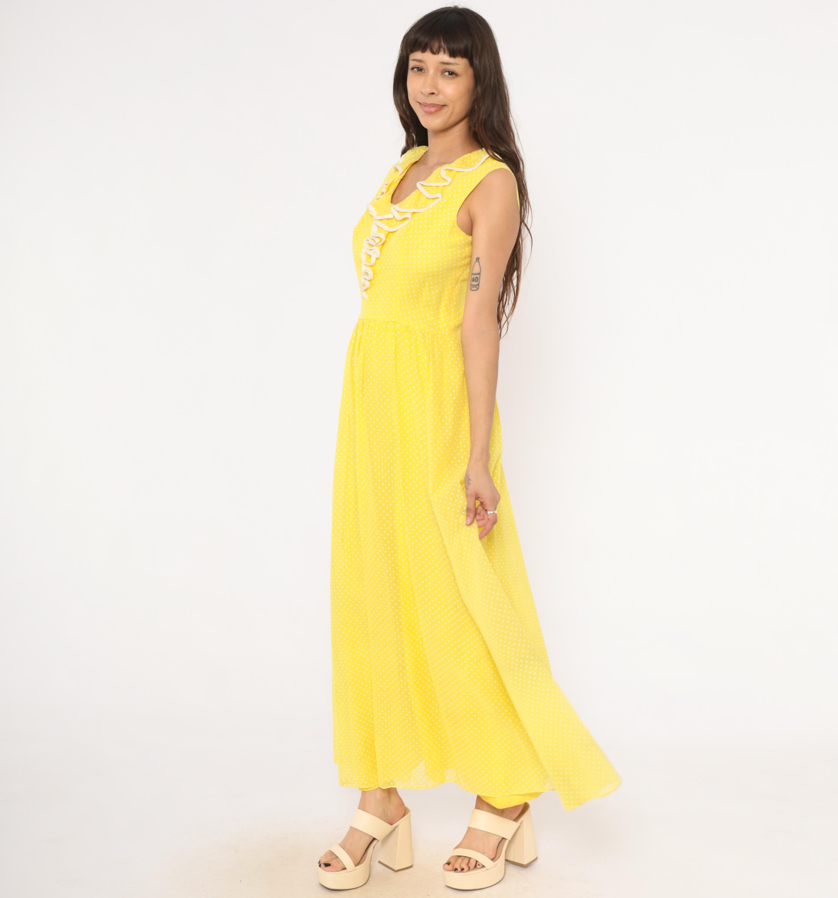 70s yellow and white polka dot maxi dress with a ruffled V-neckline trimmed in white edging that continues down the center front bodice. Sleeveless fitted bodice with a natural waistline and gathered A-line skirt in a sheer dotted fabric over a matching lining.