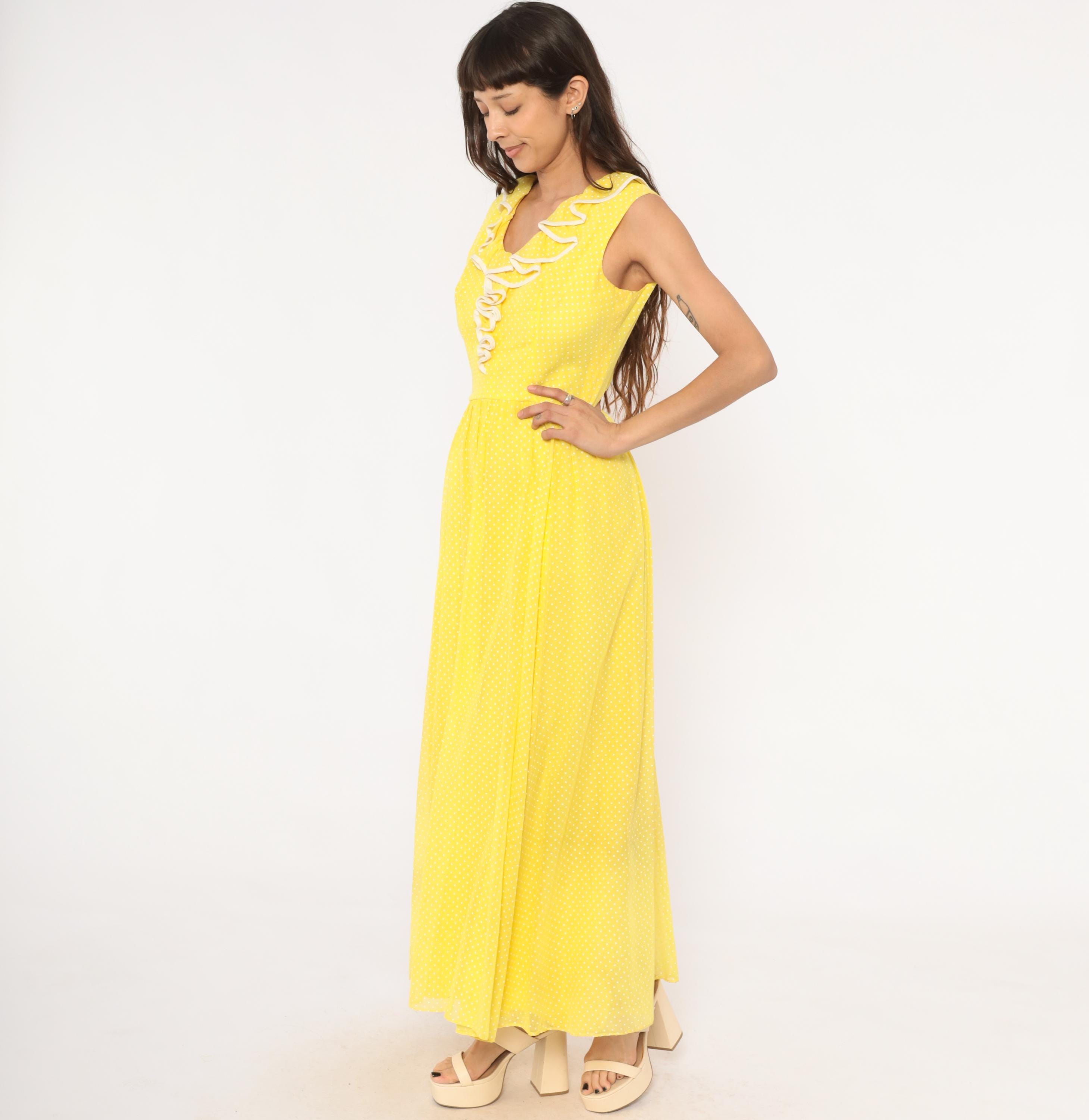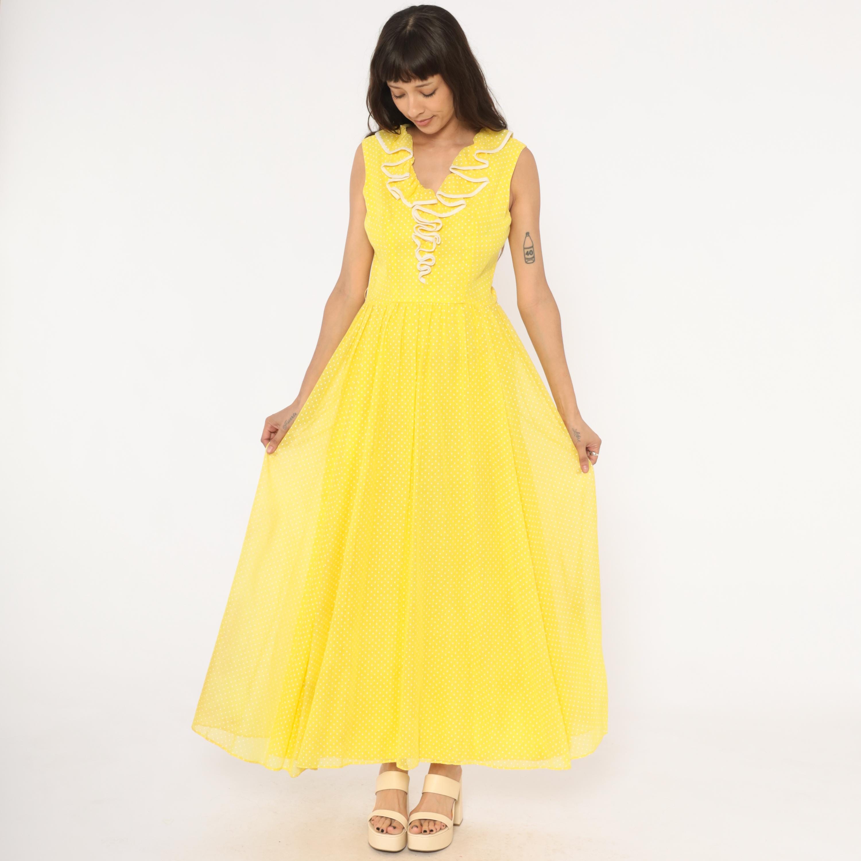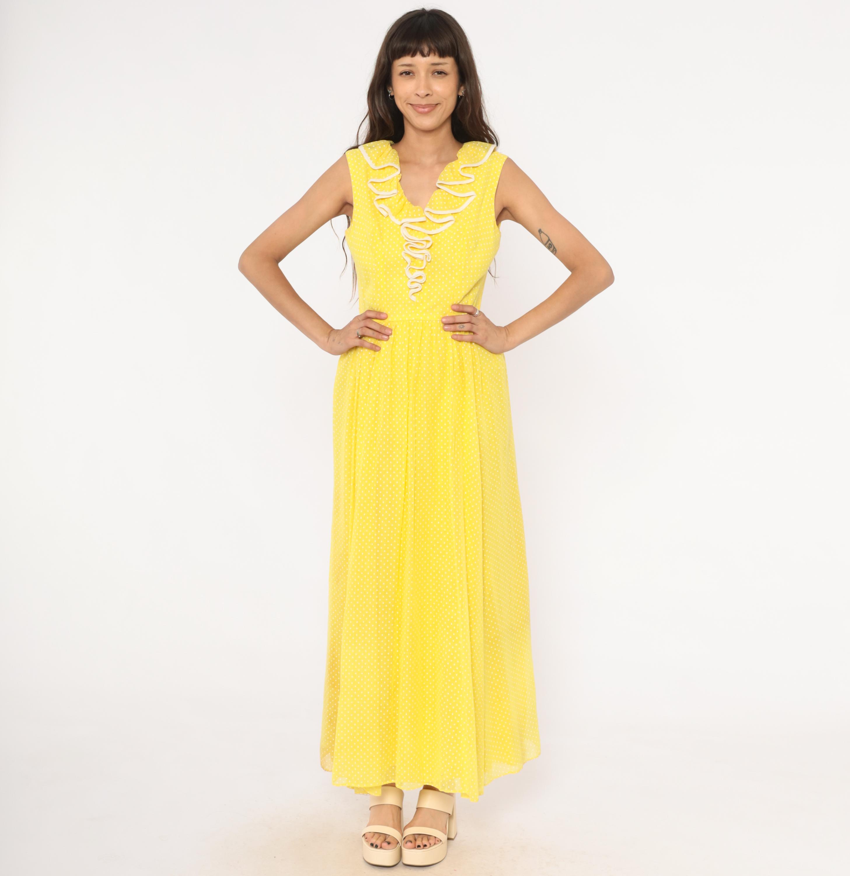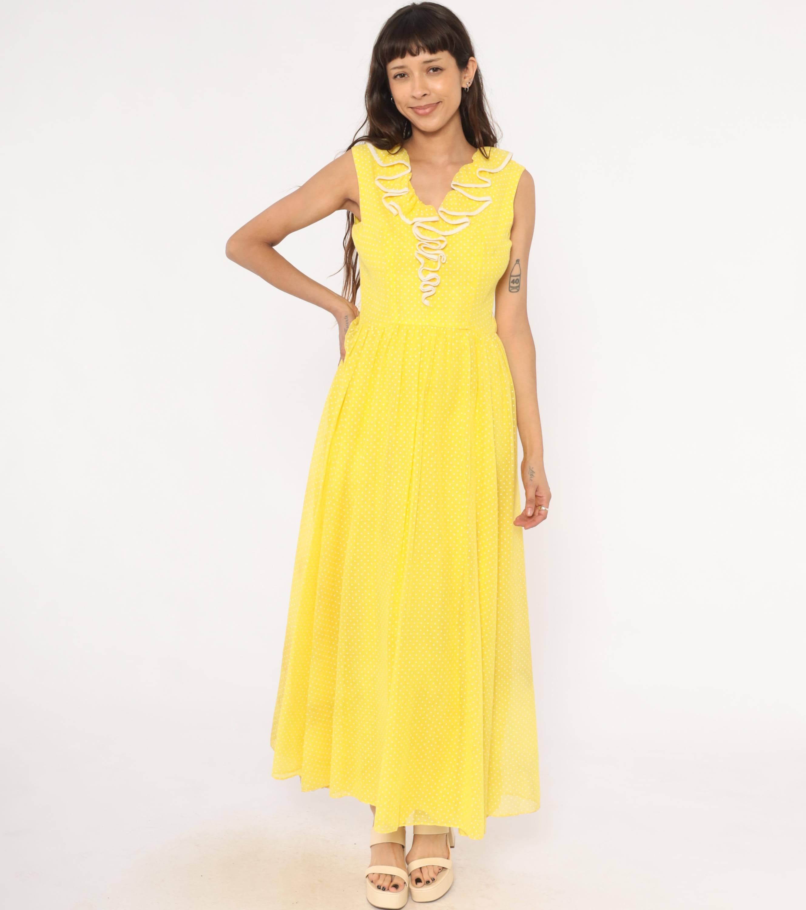 70s yellow and white polka dot maxi dress with a ruffled V-neckline trimmed in white edging that continues down the center front bodice. Sleeveless fitted bodice with a natural waistline and gathered A-line skirt in a sheer dotted fabric over a matching lining.