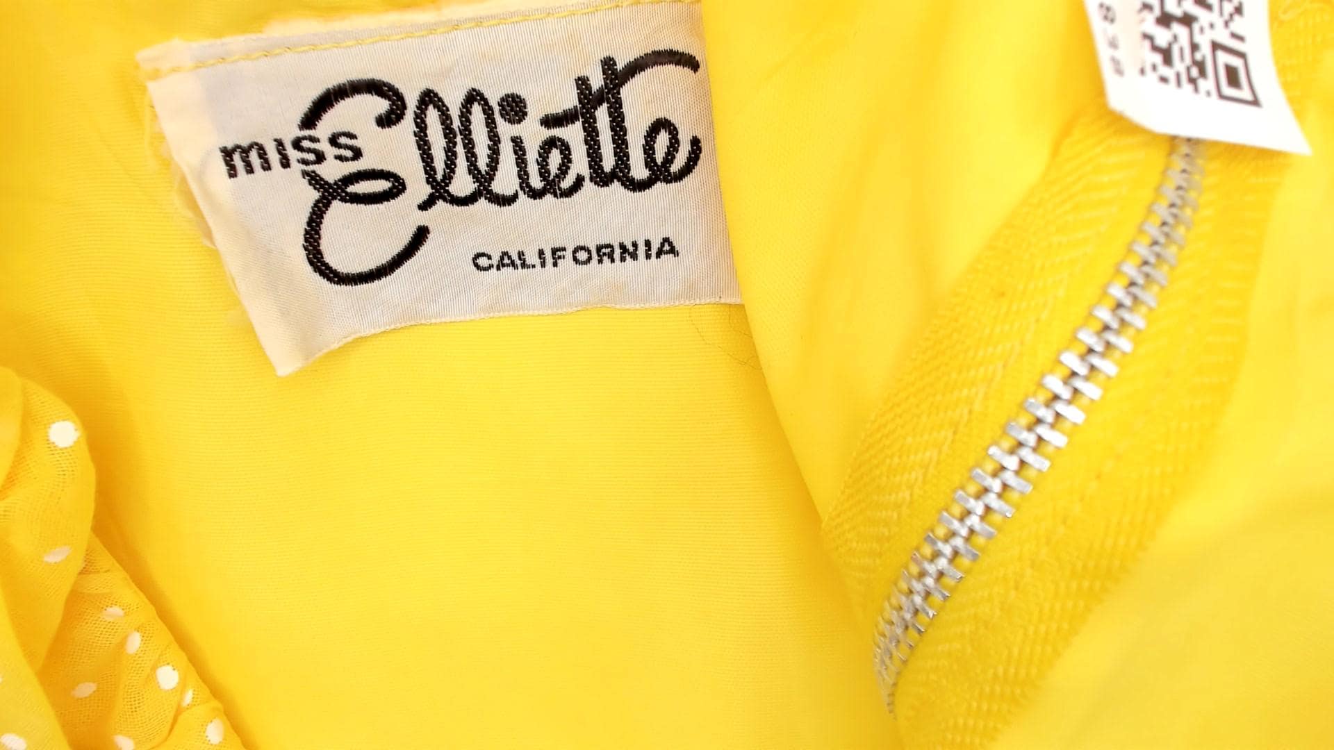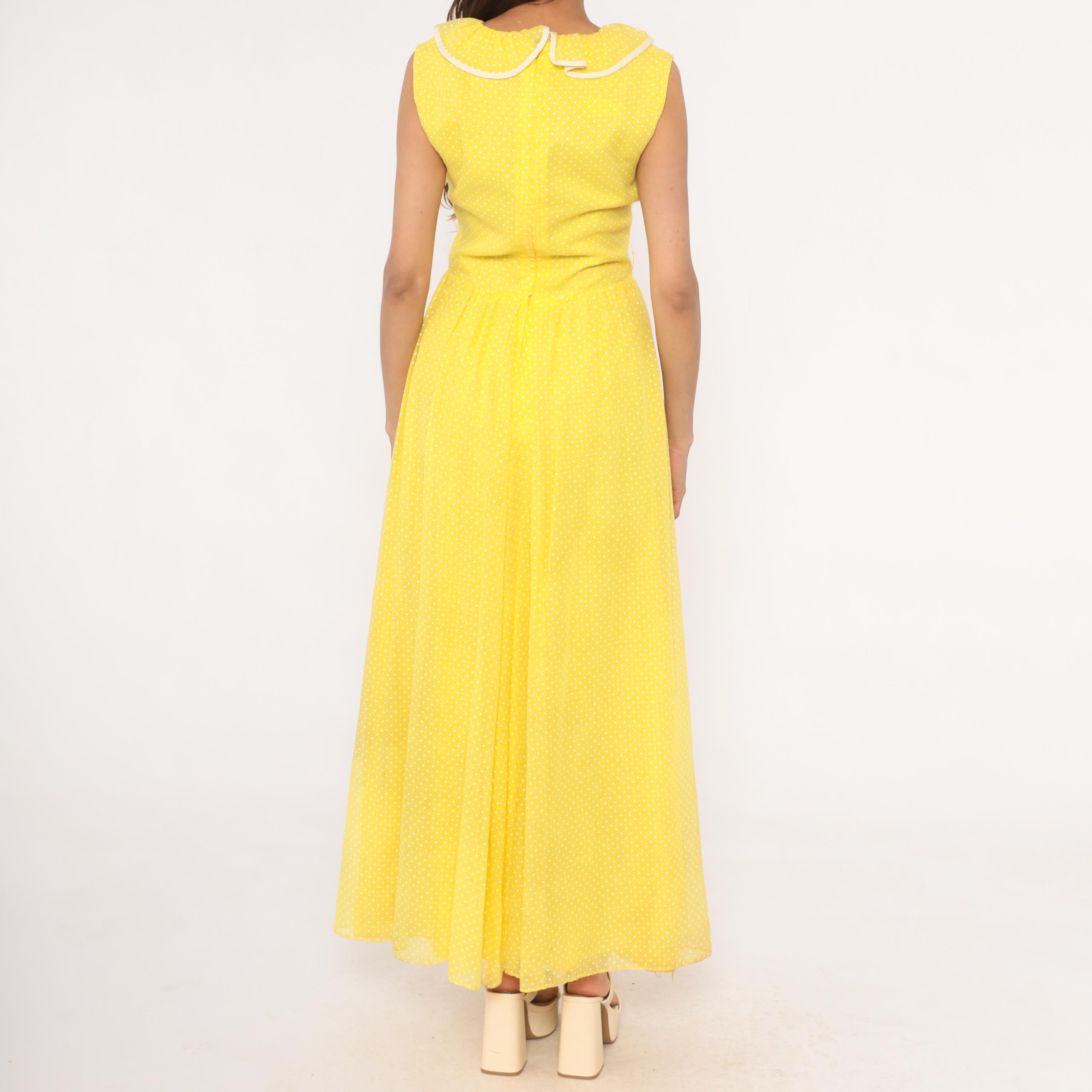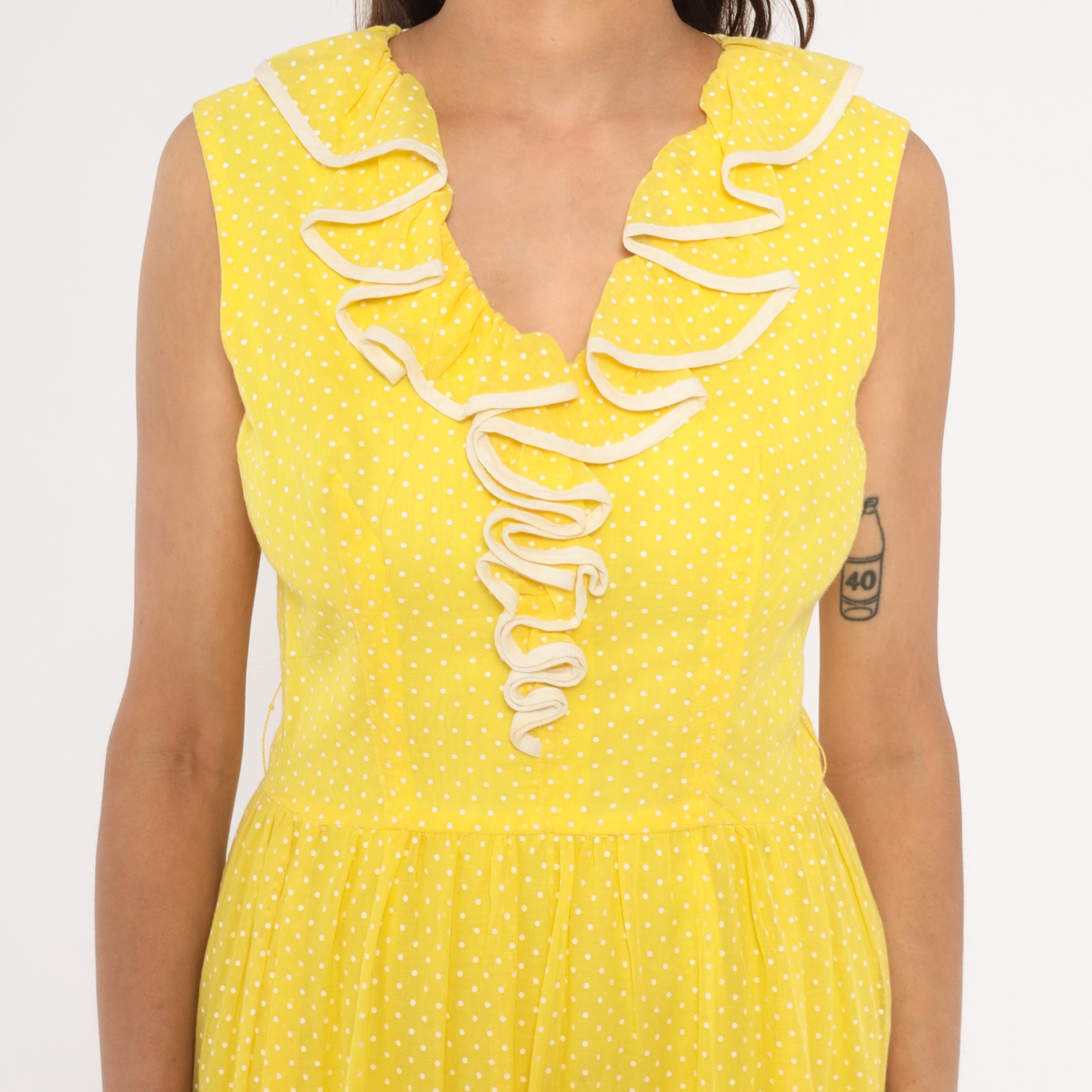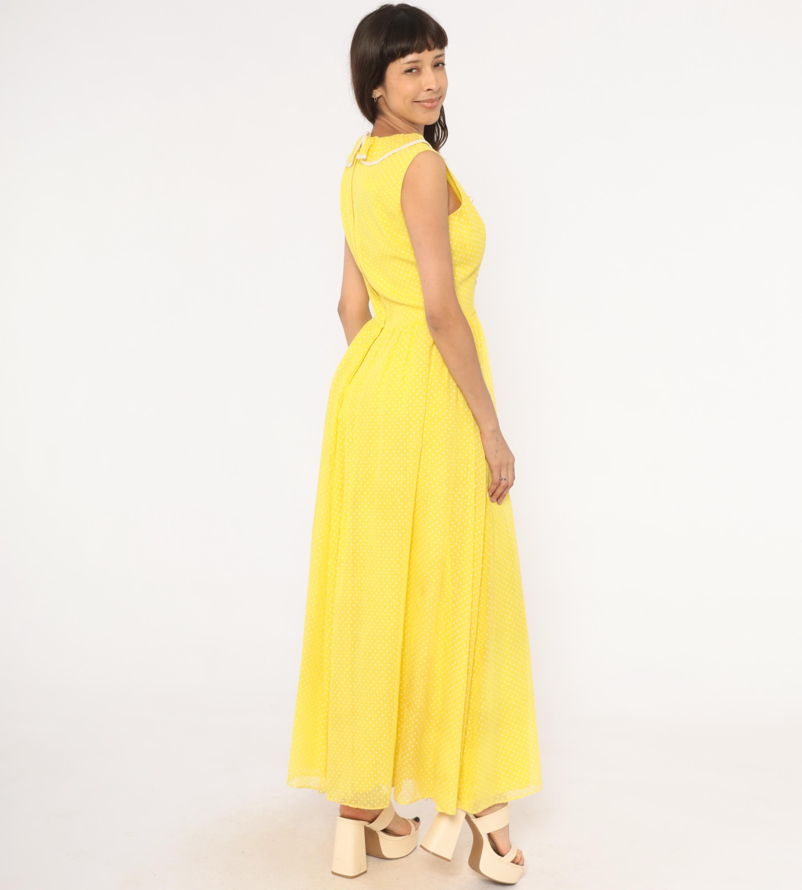 70s yellow and white polka dot maxi dress with a ruffled V-neckline trimmed in white edging that continues down the center front bodice. Sleeveless fitted bodice with a natural waistline and gathered A-line skirt in a sheer dotted fabric over a matching lining.