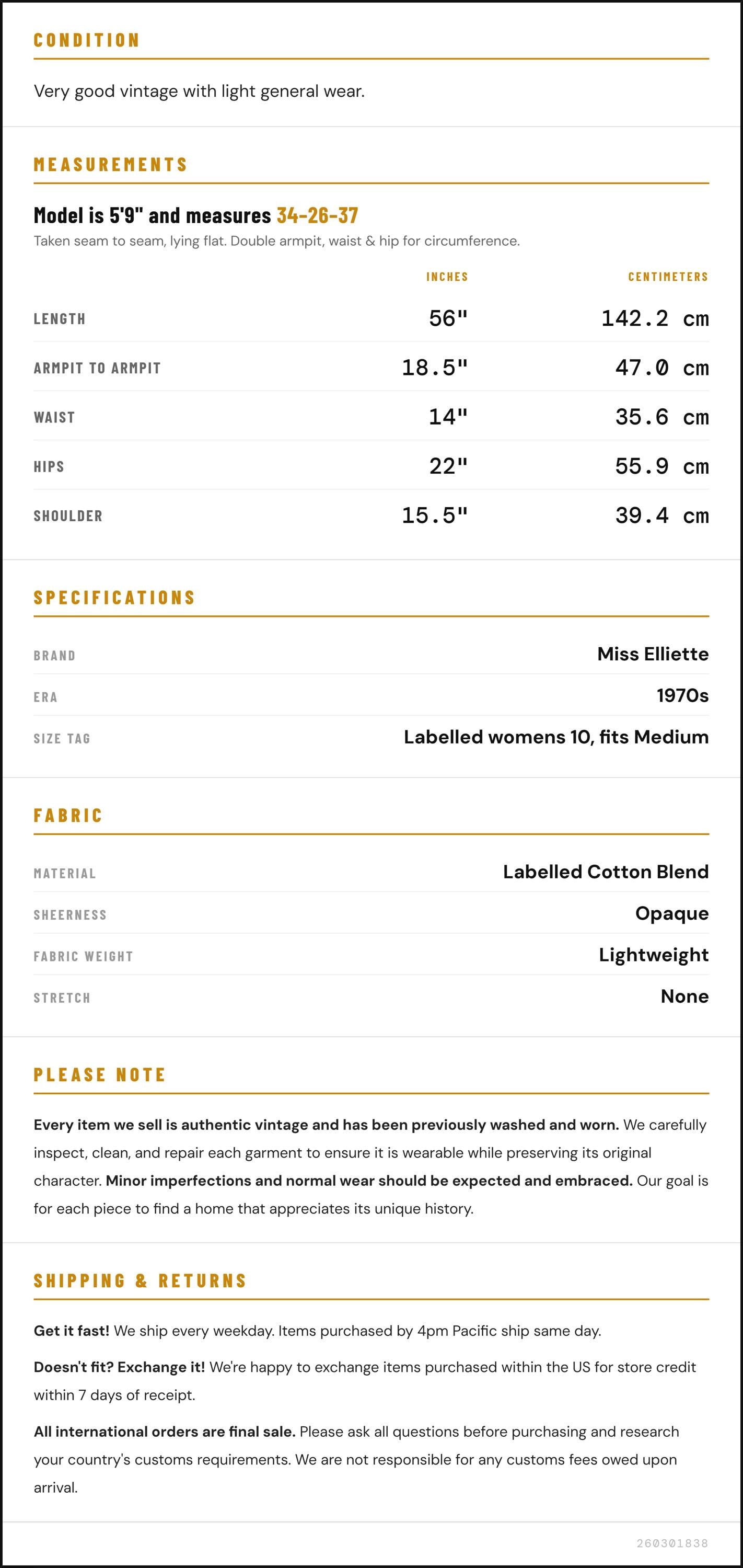 Vintage denim was usually made without any stretch, unlike modern jeans. Check the measurements to ensure proper fit, and remember to give yourself a little wiggle room in the waist and hips, depending on your preferred fit.
