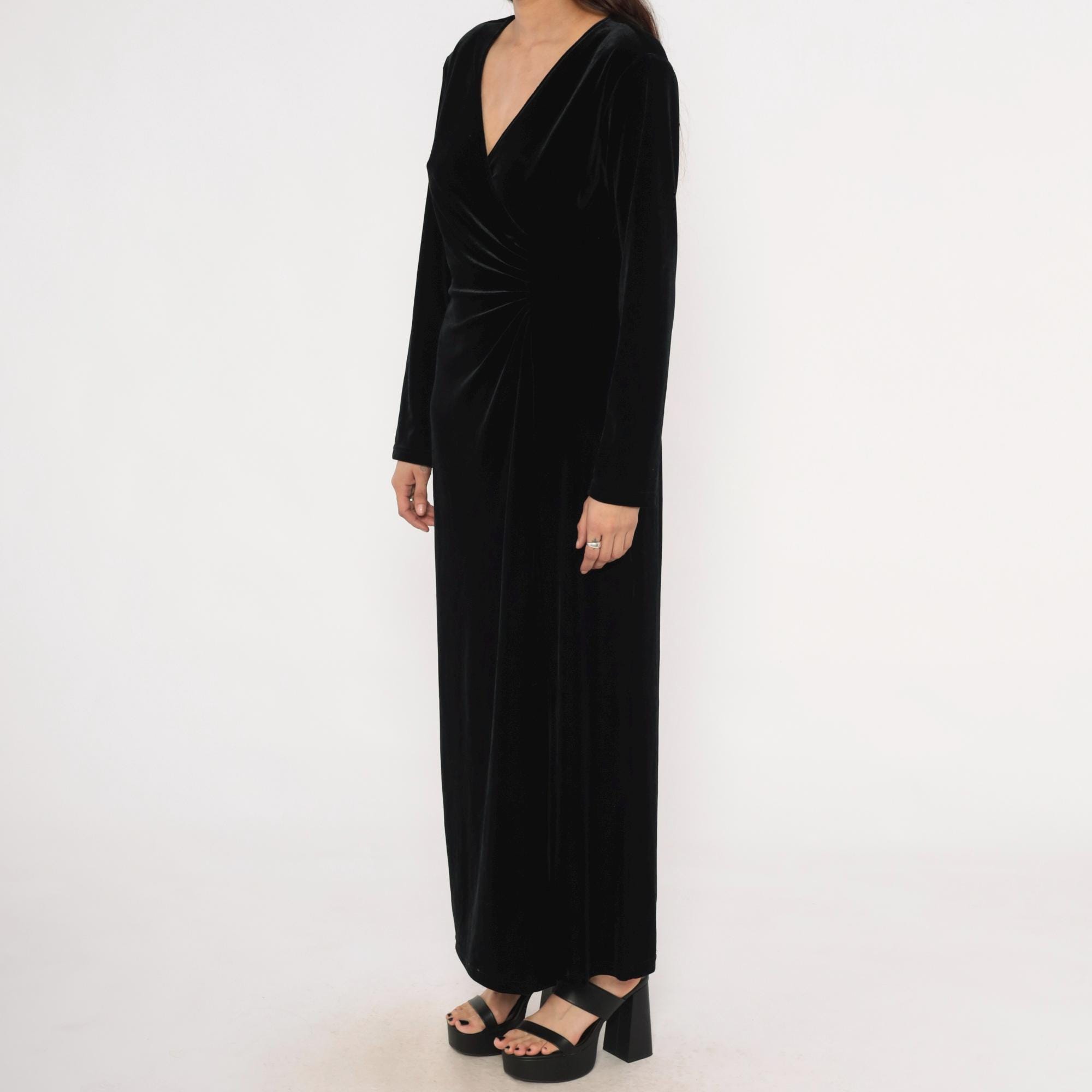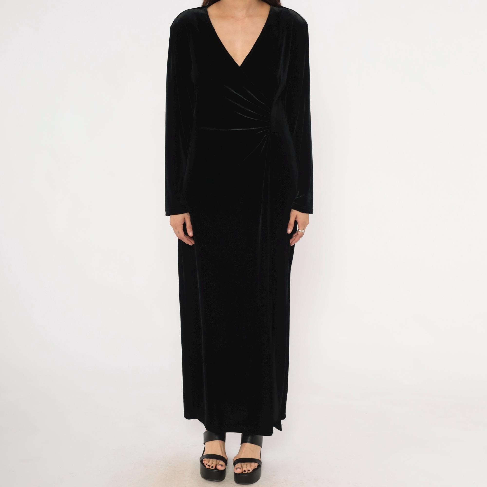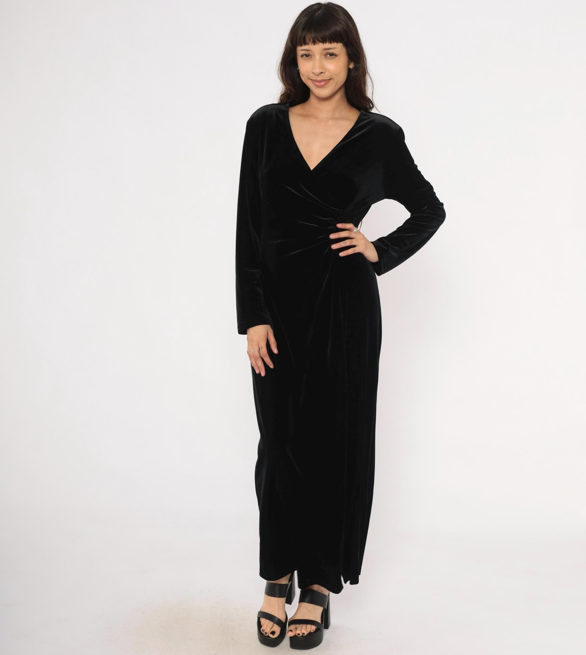 Black velvet maxi dress with a faux wrap surplice V-neckline and long sleeves. Ruched gathering at the left waist with fabric draping diagonally across the bodice. Straight column silhouette, ankle length, with a clean back and no visible closures.