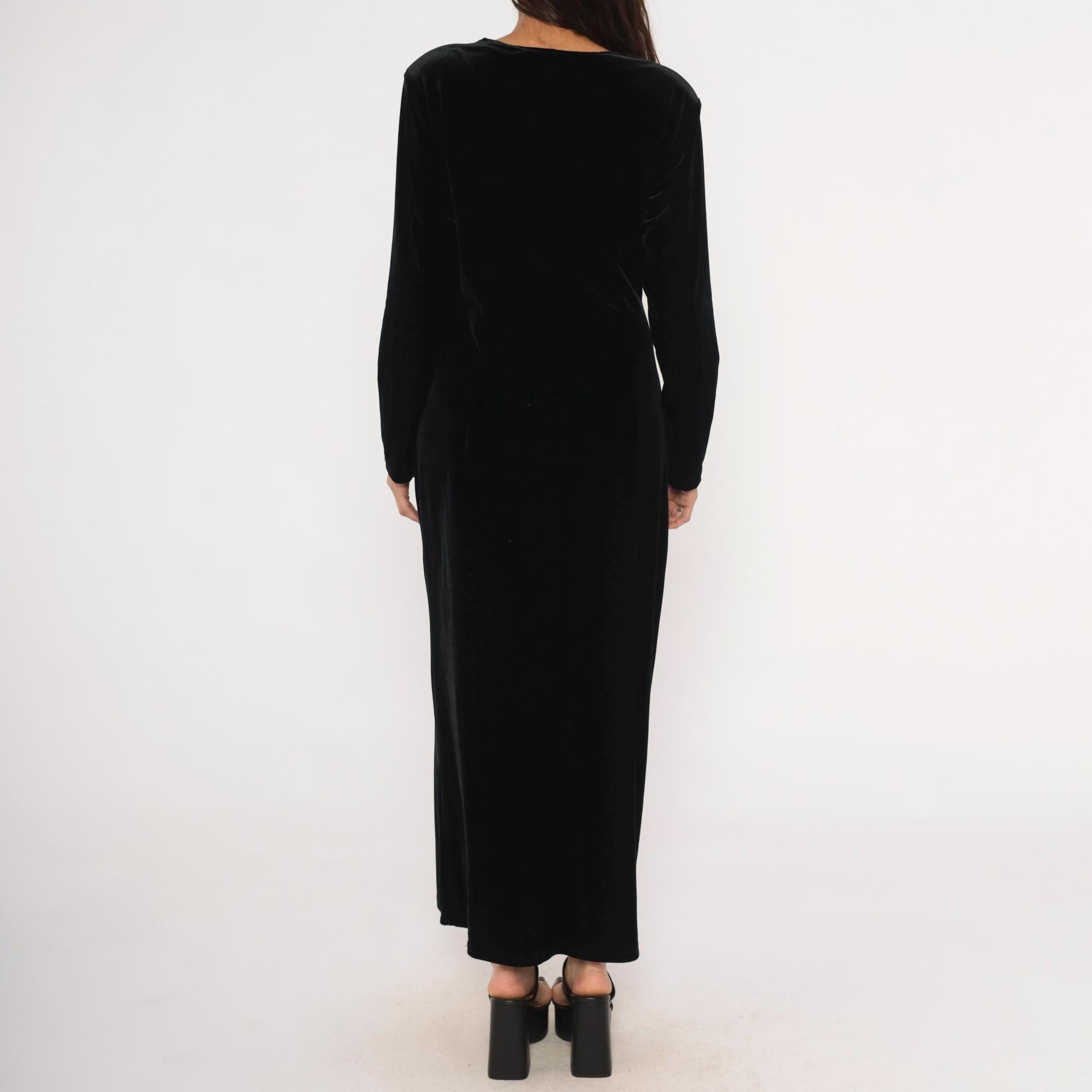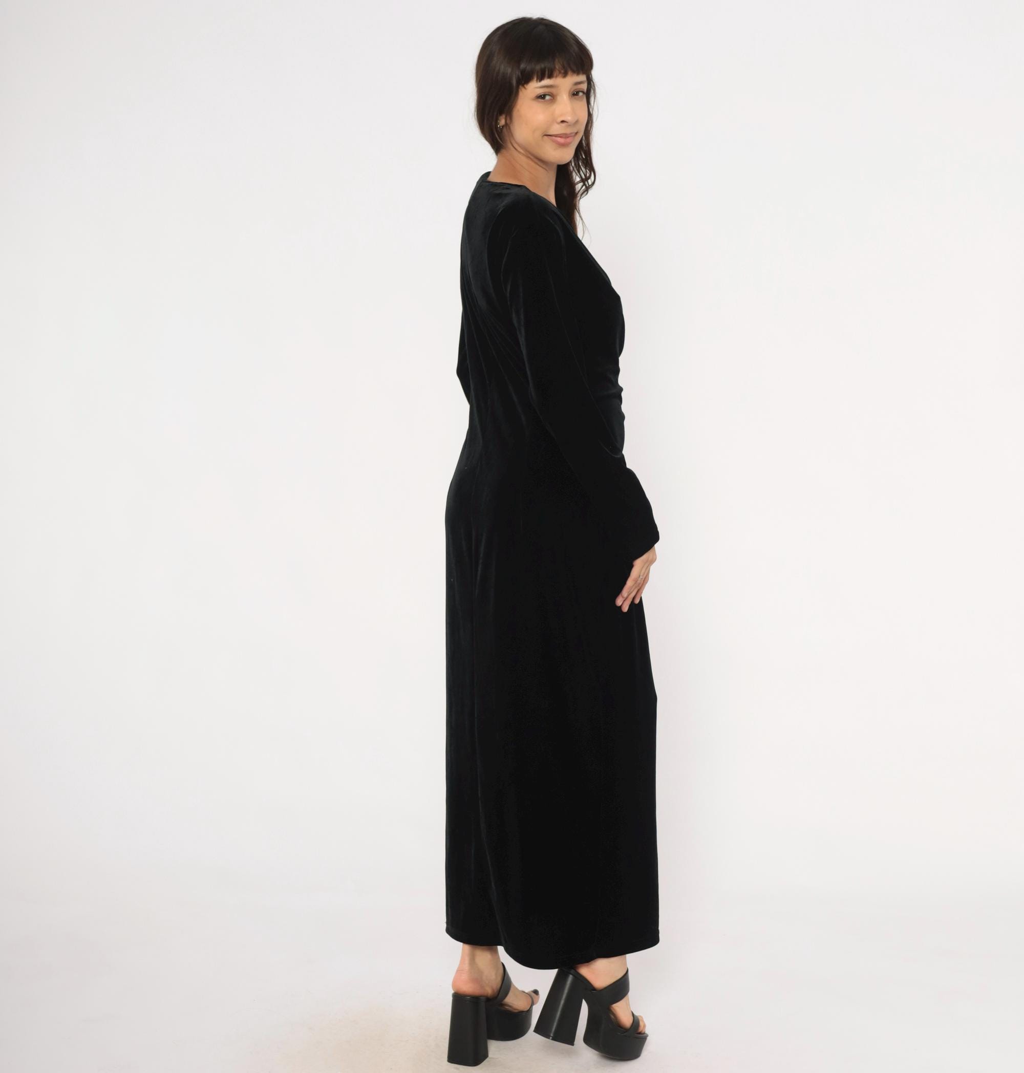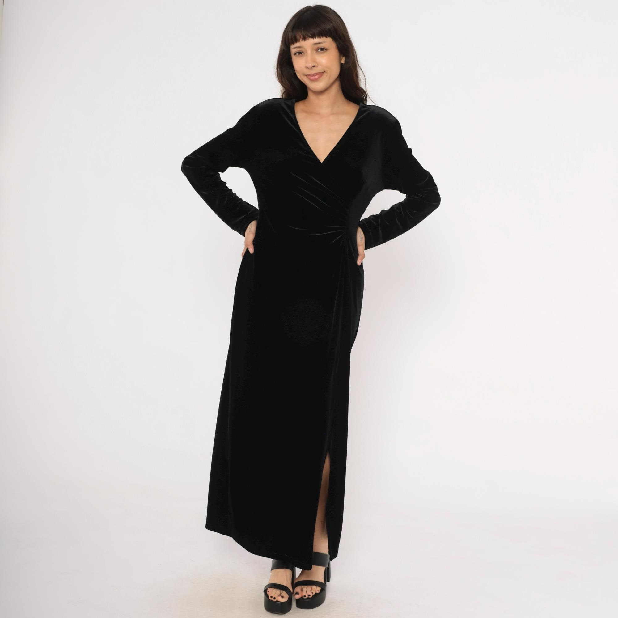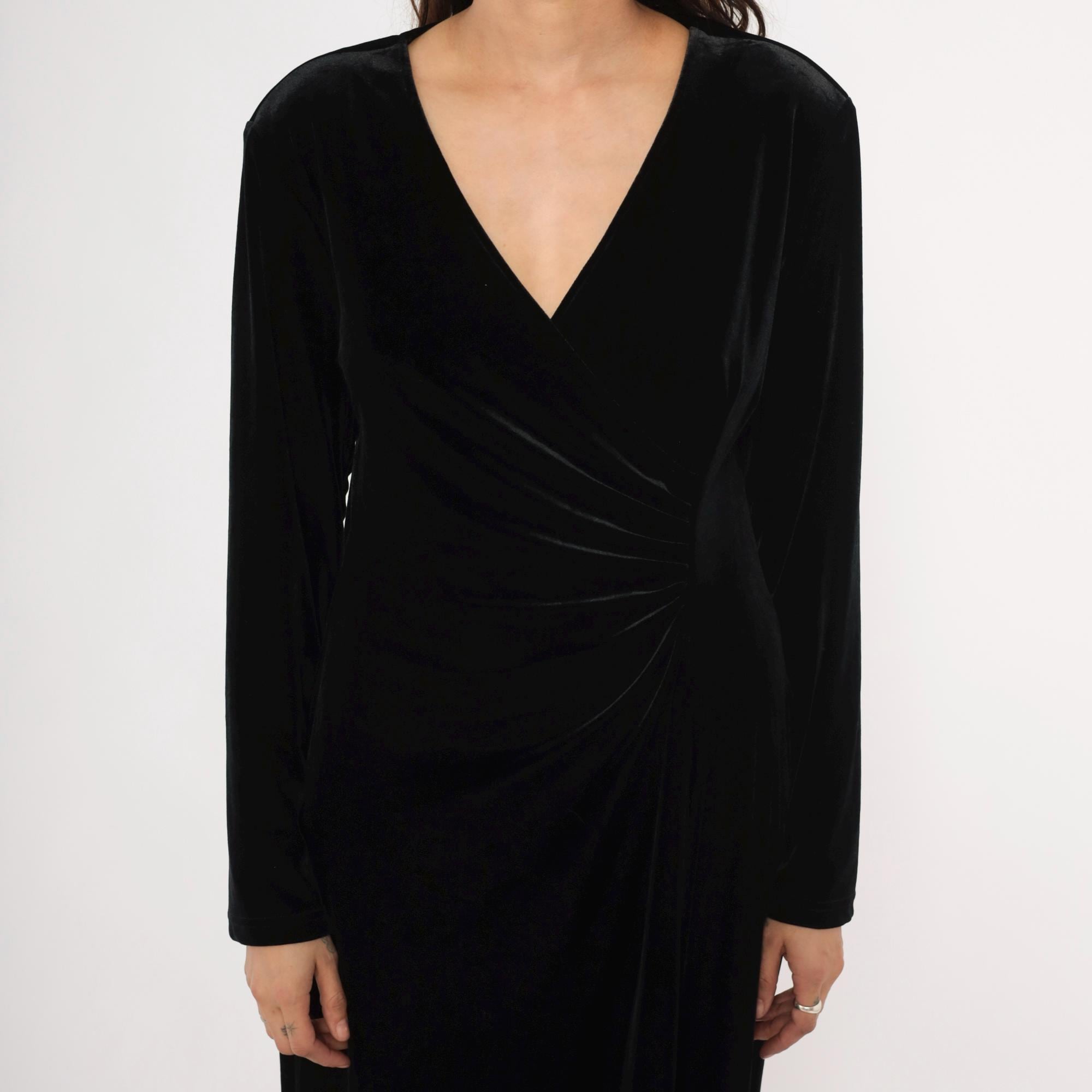 Black velvet maxi dress with a faux wrap surplice V-neckline and long sleeves. Ruched gathering at the left waist with fabric draping diagonally across the bodice. Straight column silhouette, ankle length, with a clean back and no visible closures.