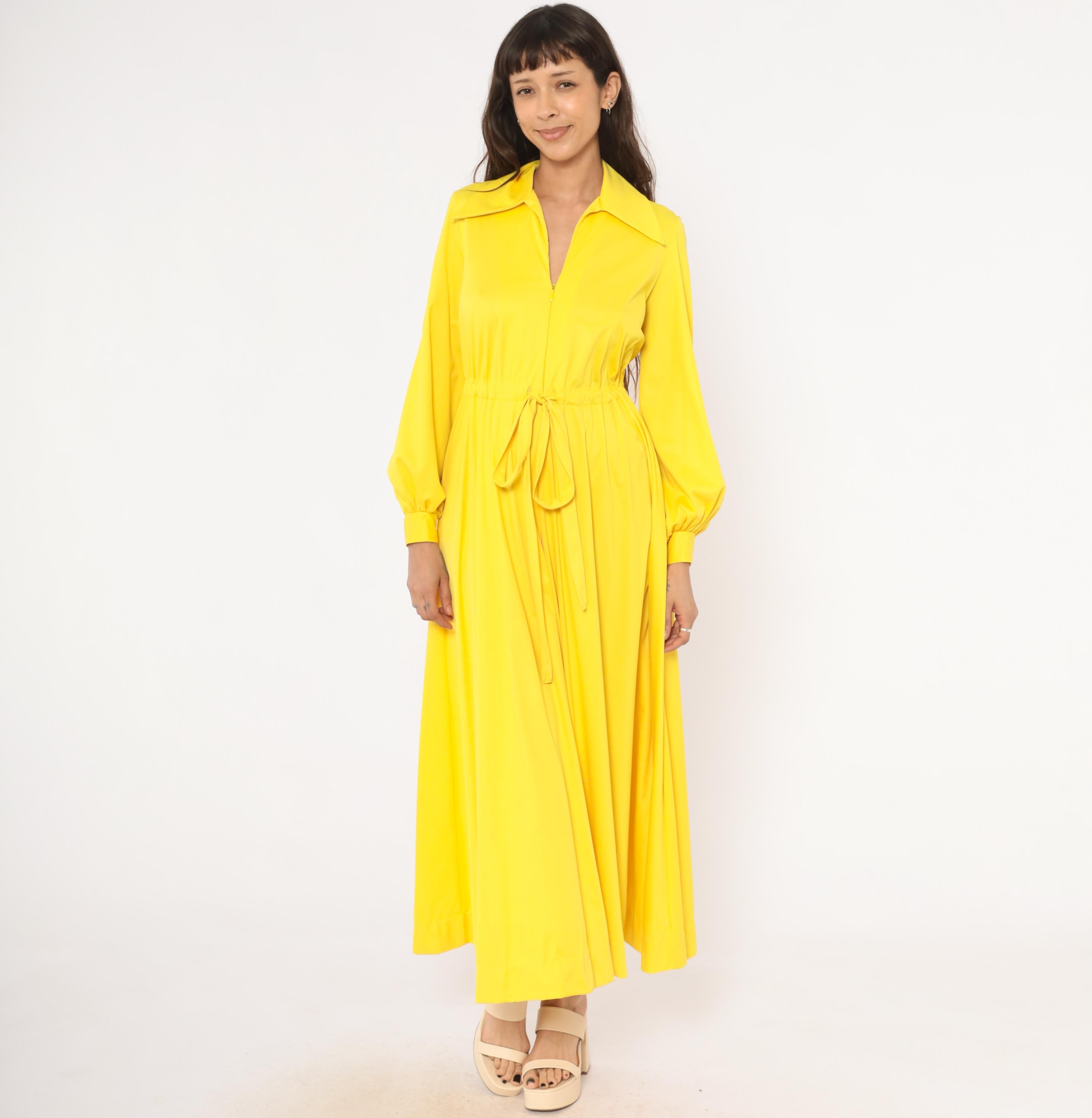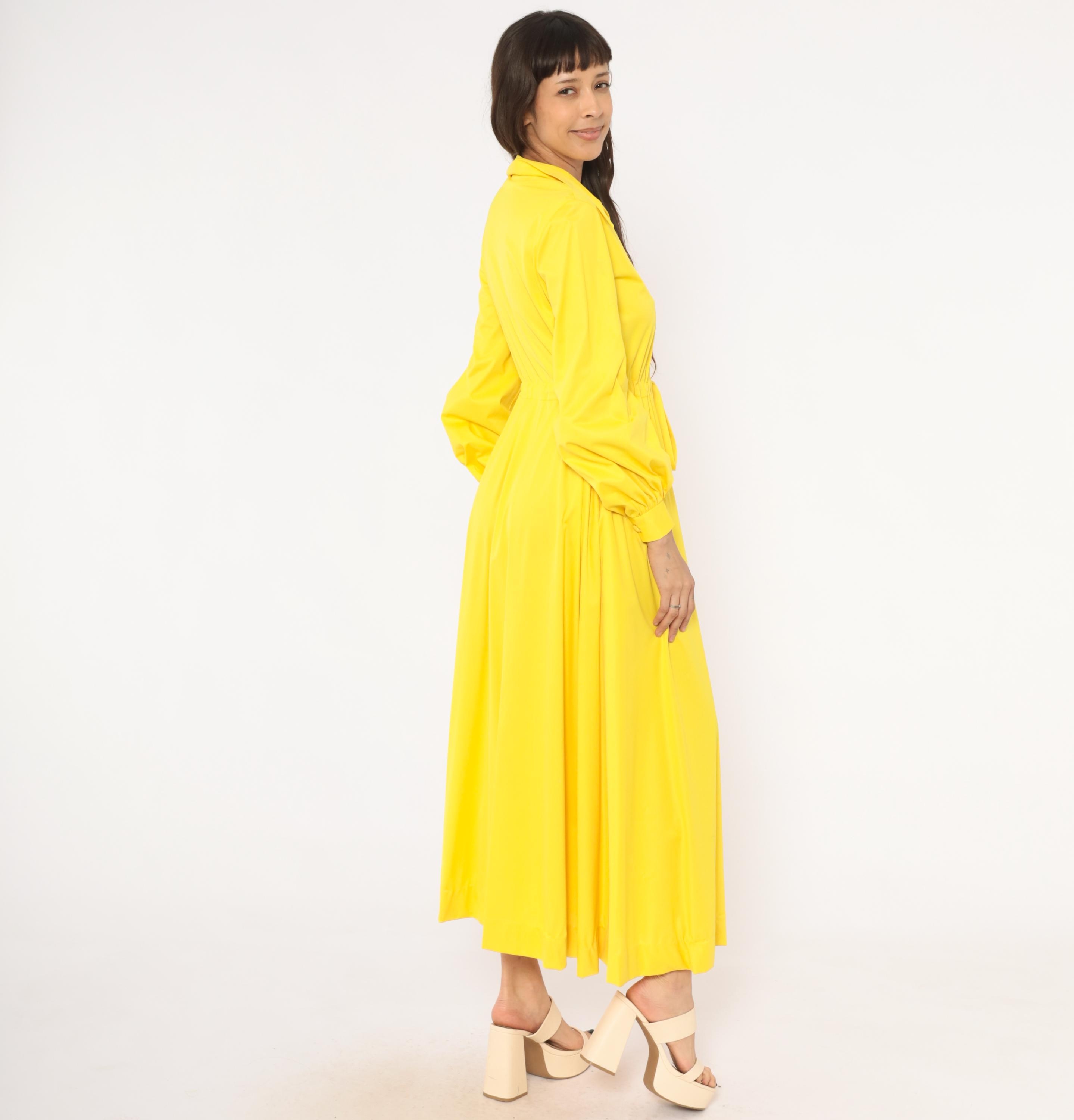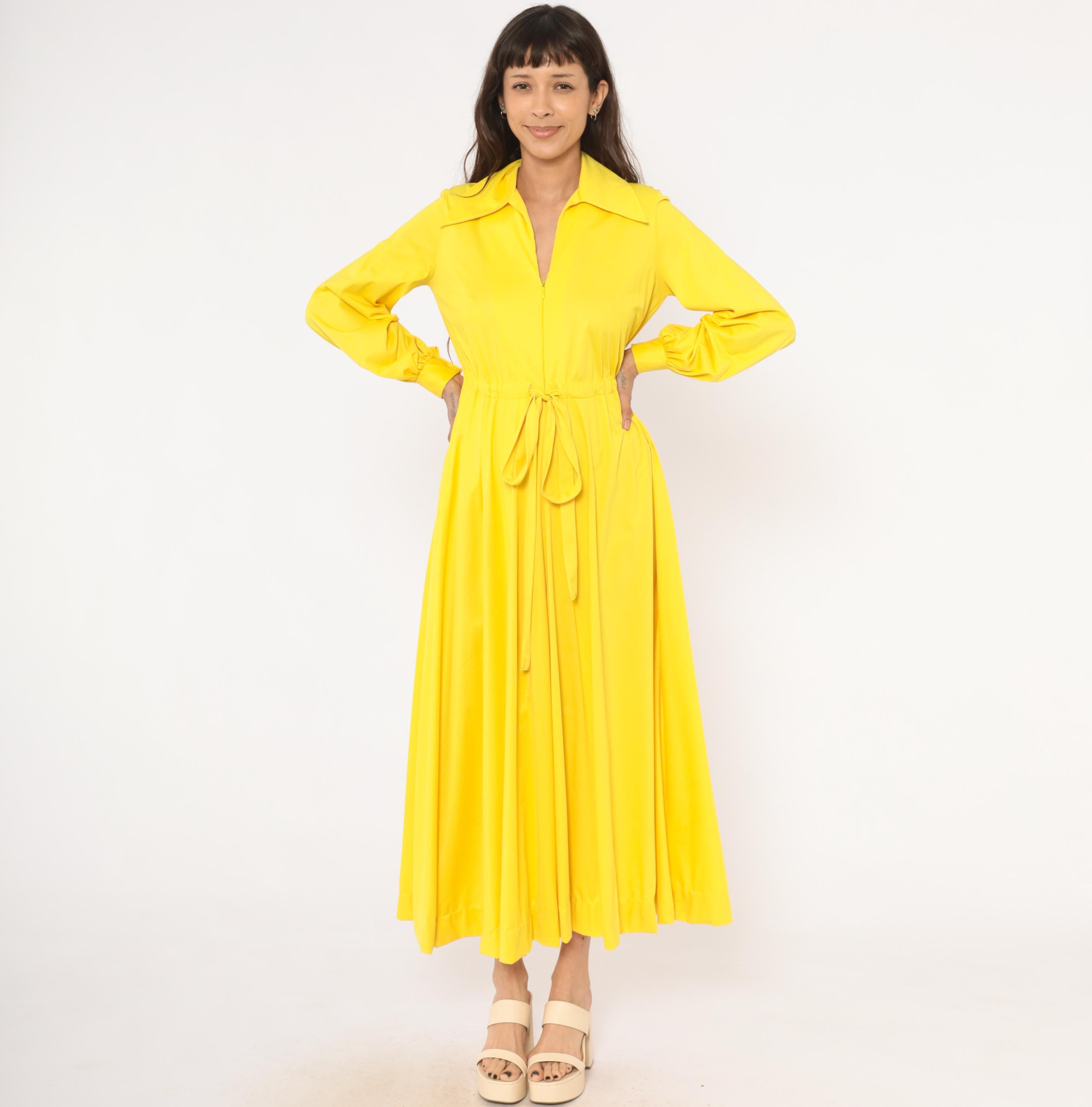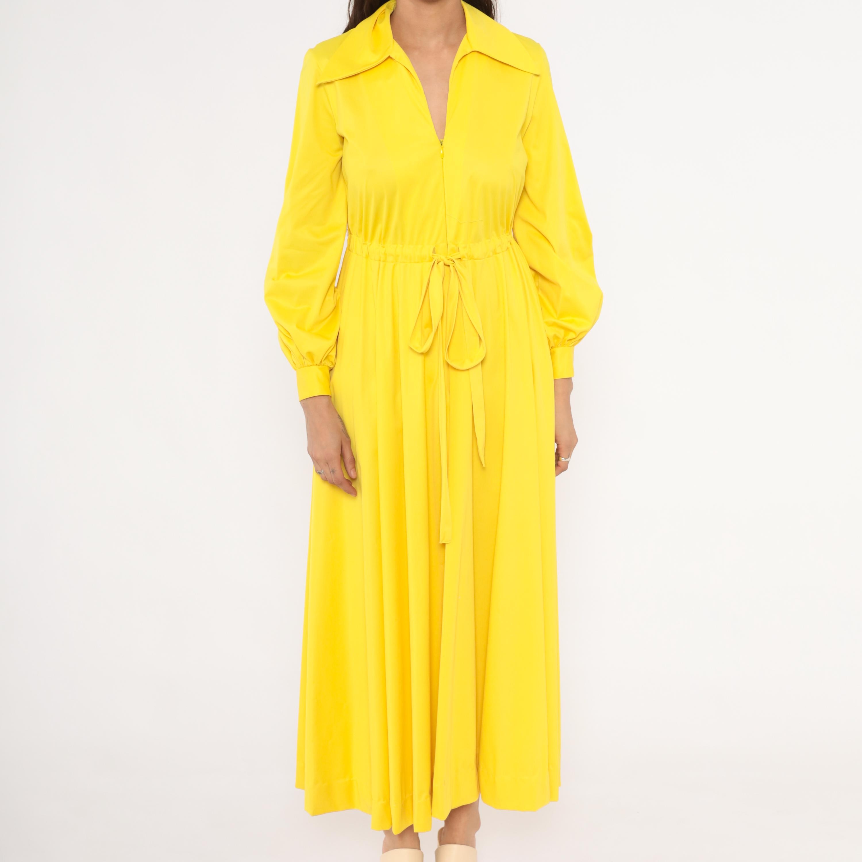 70s yellow maxi dress with a wide pointed collar and front zip closure from neckline to waist. Long balloon sleeves with fitted cuffs, elasticized drawstring waist with a front tie. Full gathered A-line skirt with a sweeping hem, in a bright lemon and butter gold tone.