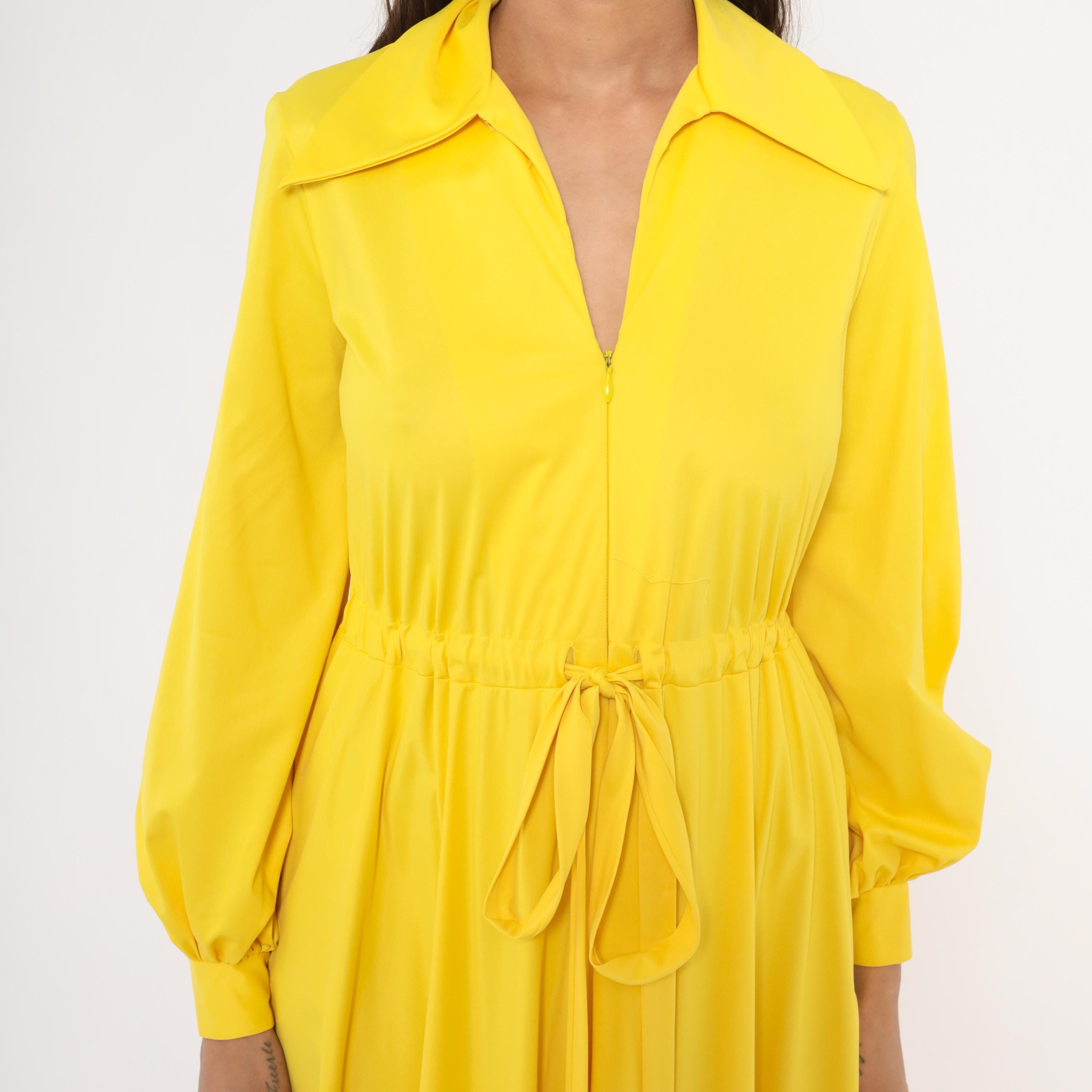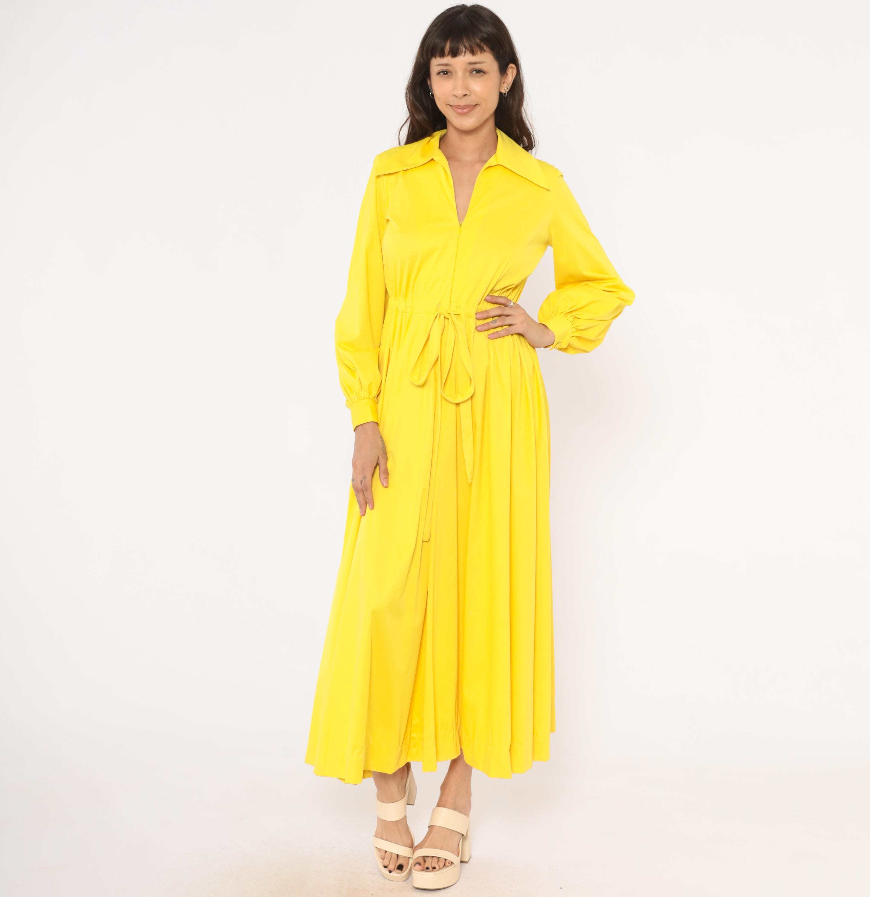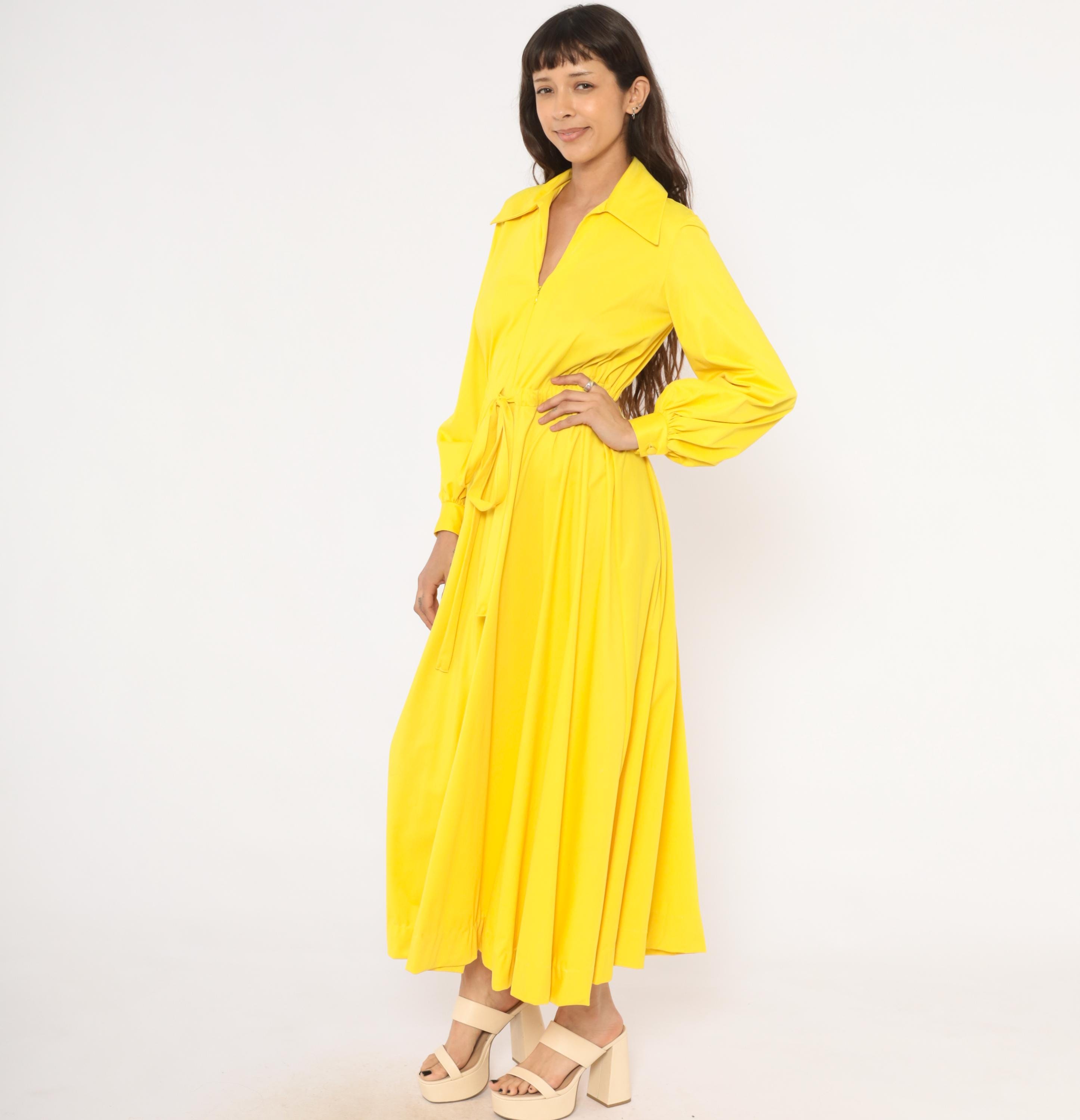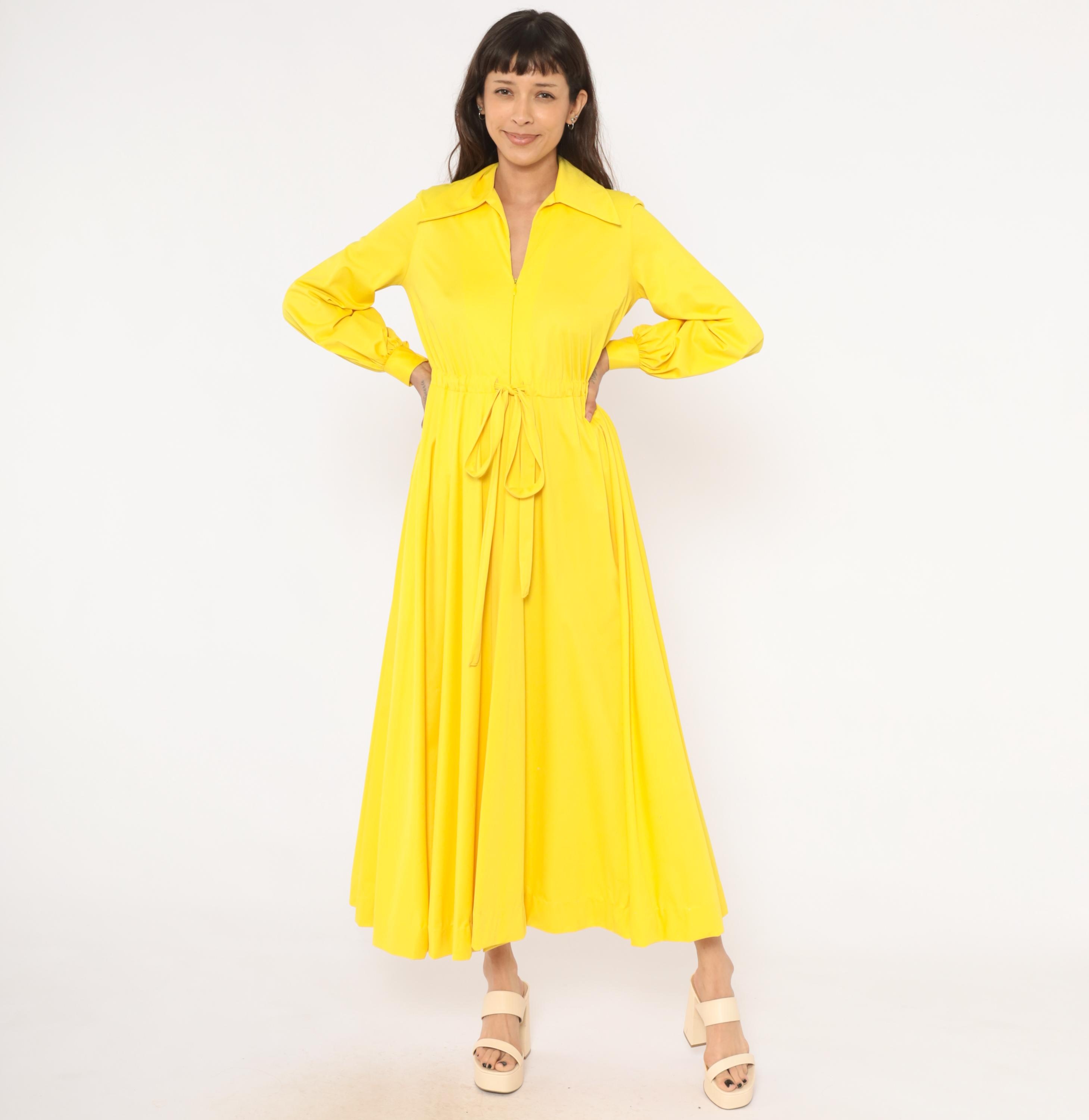 70s yellow maxi dress with a wide pointed collar and front zip closure from neckline to waist. Long balloon sleeves with fitted cuffs, elasticized drawstring waist with a front tie. Full gathered A-line skirt with a sweeping hem, in a bright lemon and butter gold tone.