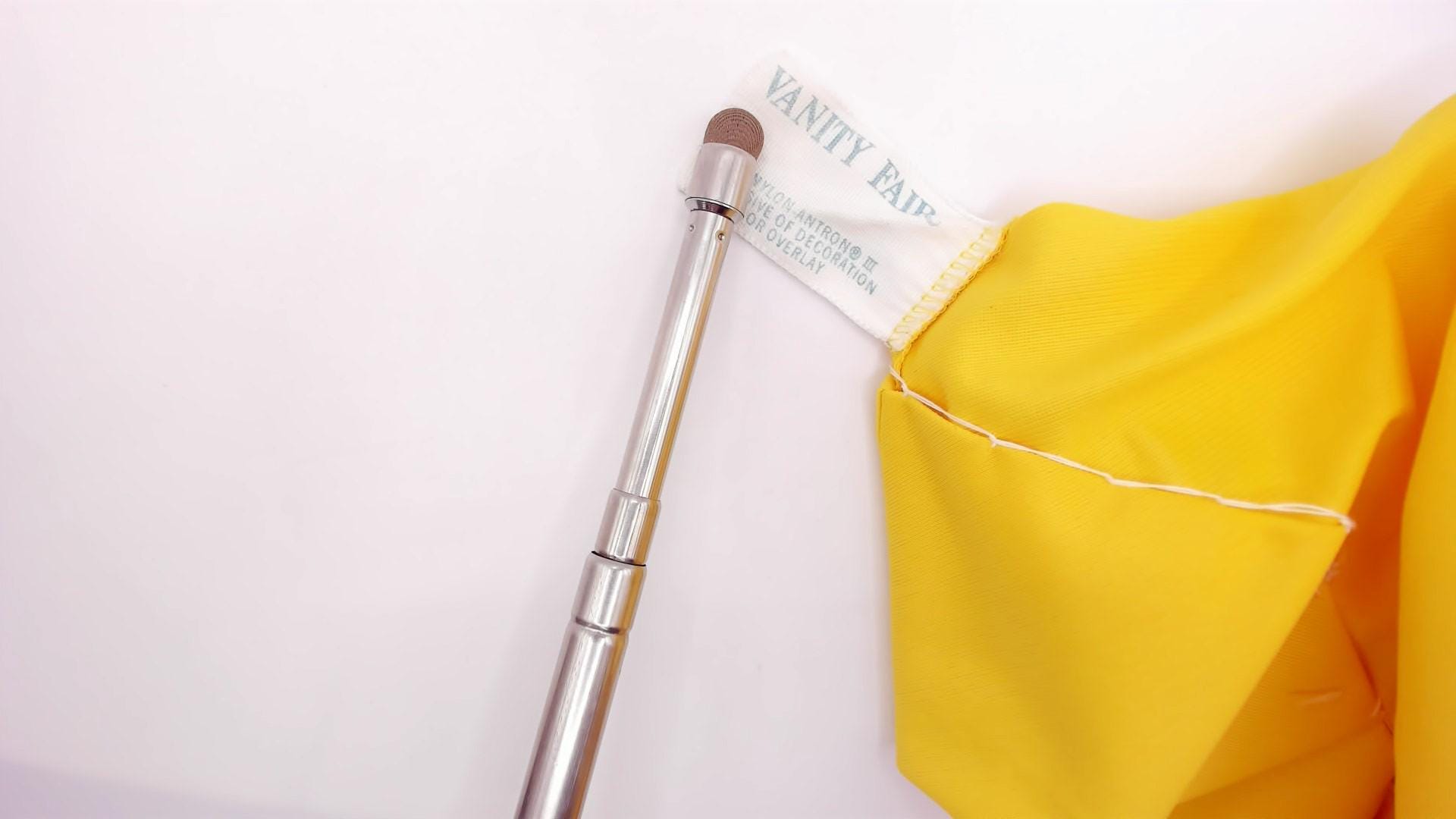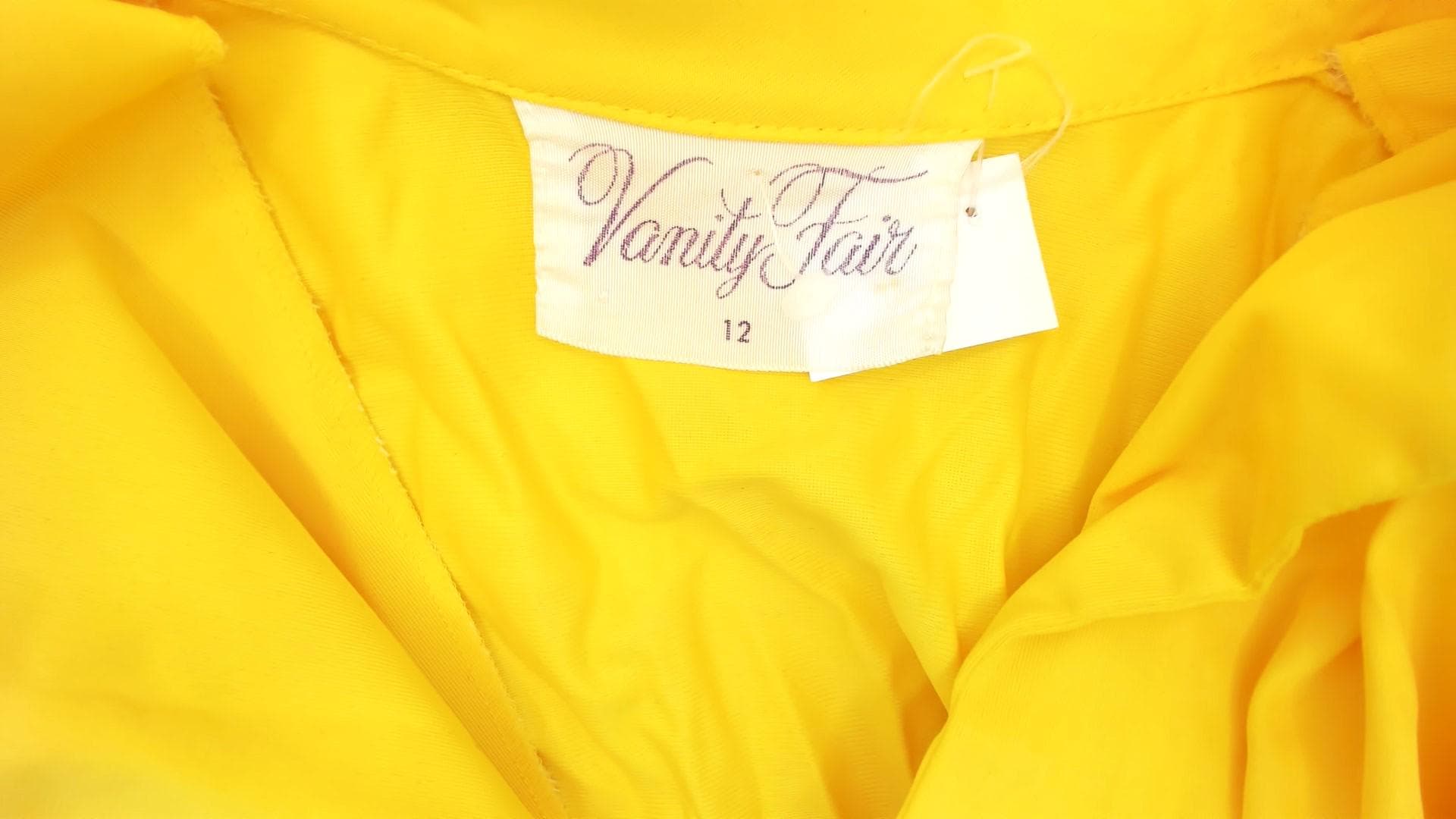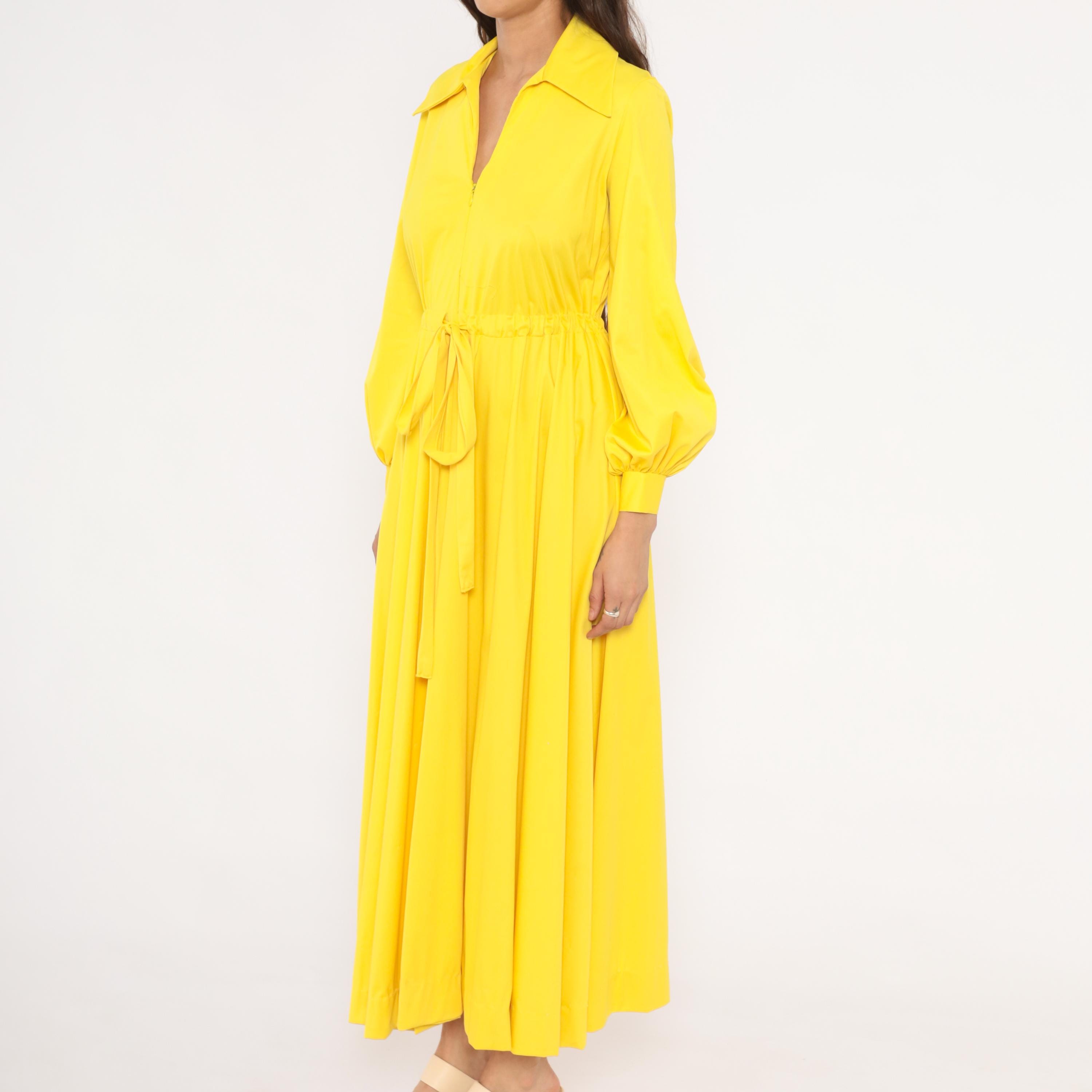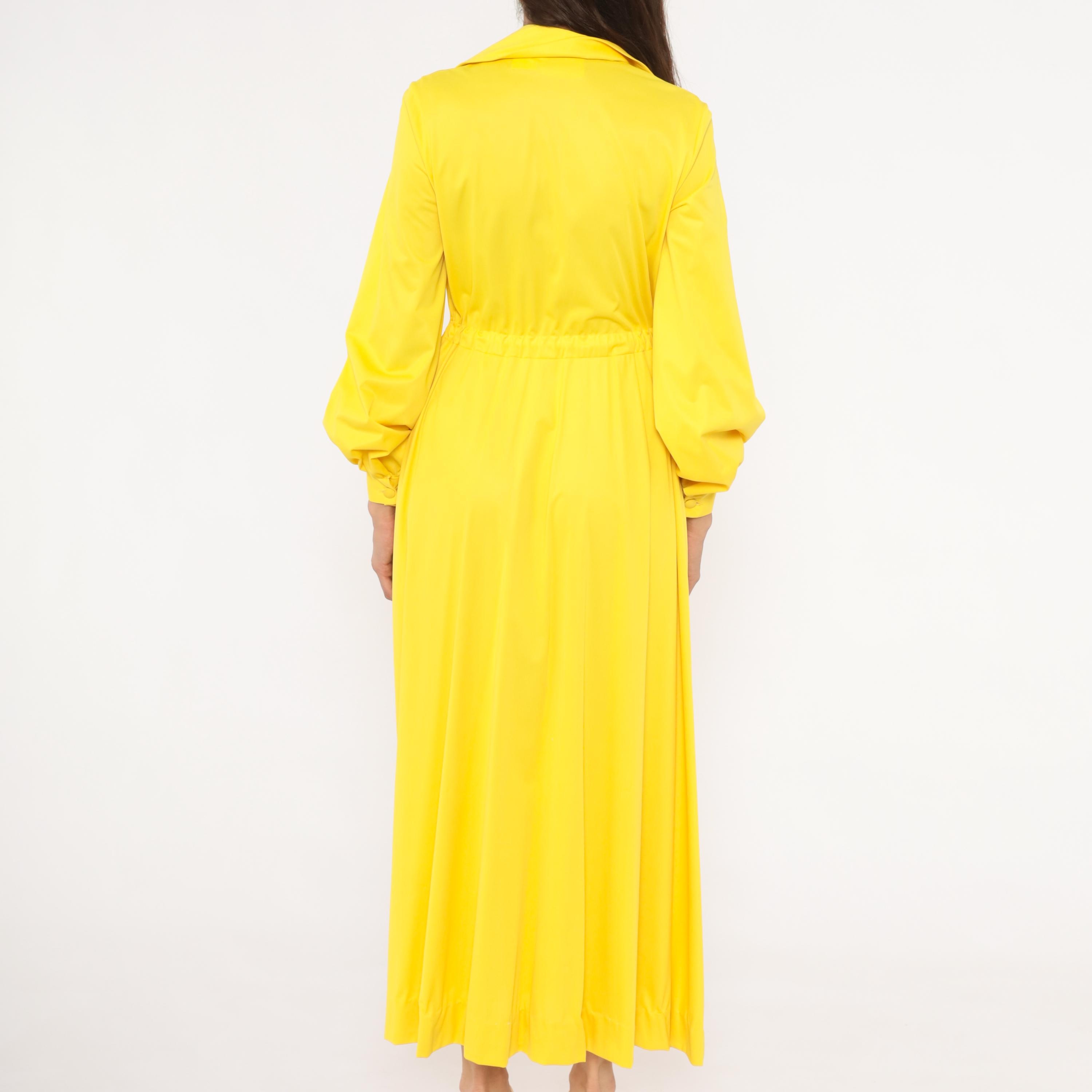 70s yellow maxi dress with a wide pointed collar and front zip closure from neckline to waist. Long balloon sleeves with fitted cuffs, elasticized drawstring waist with a front tie. Full gathered A-line skirt with a sweeping hem, in a bright lemon and butter gold tone.