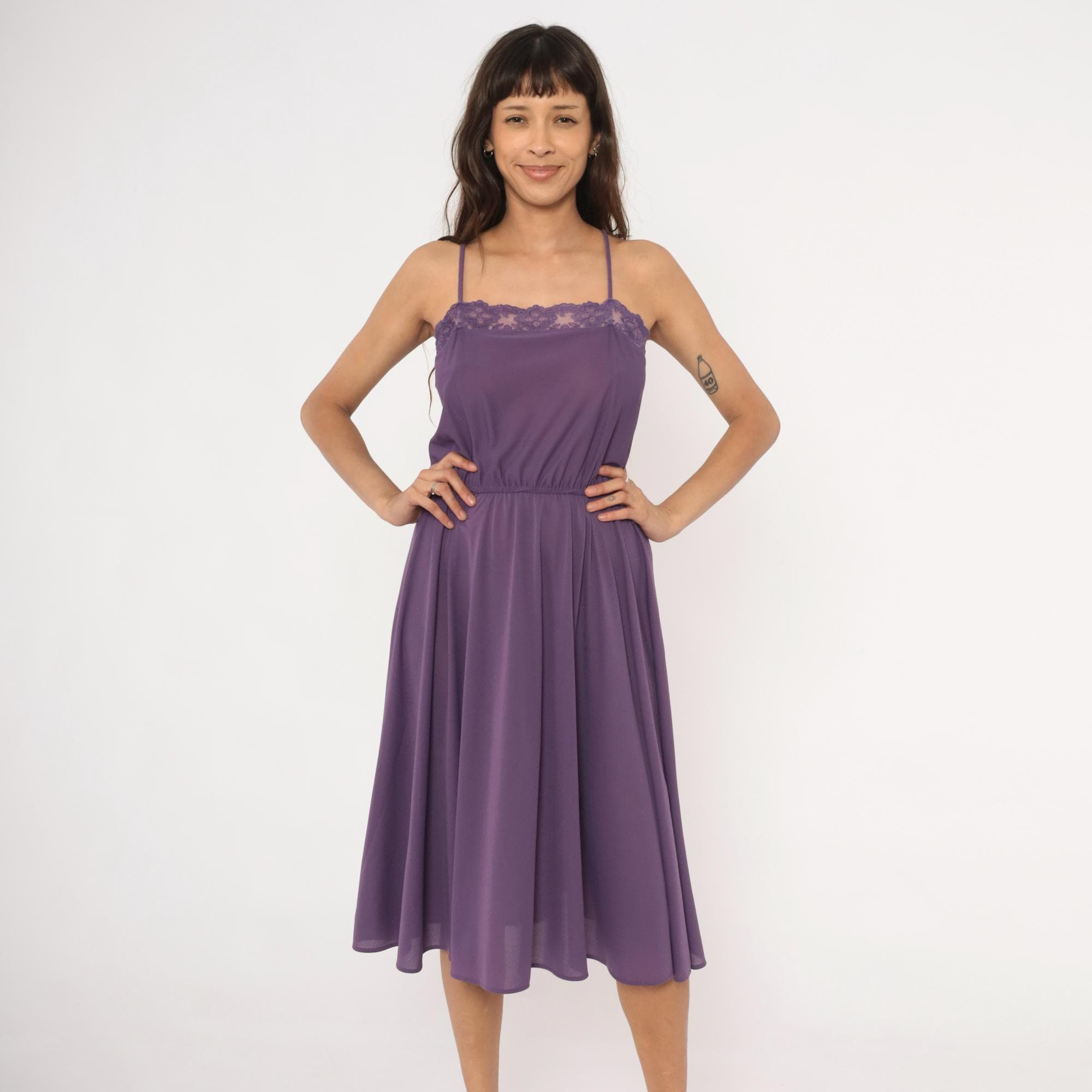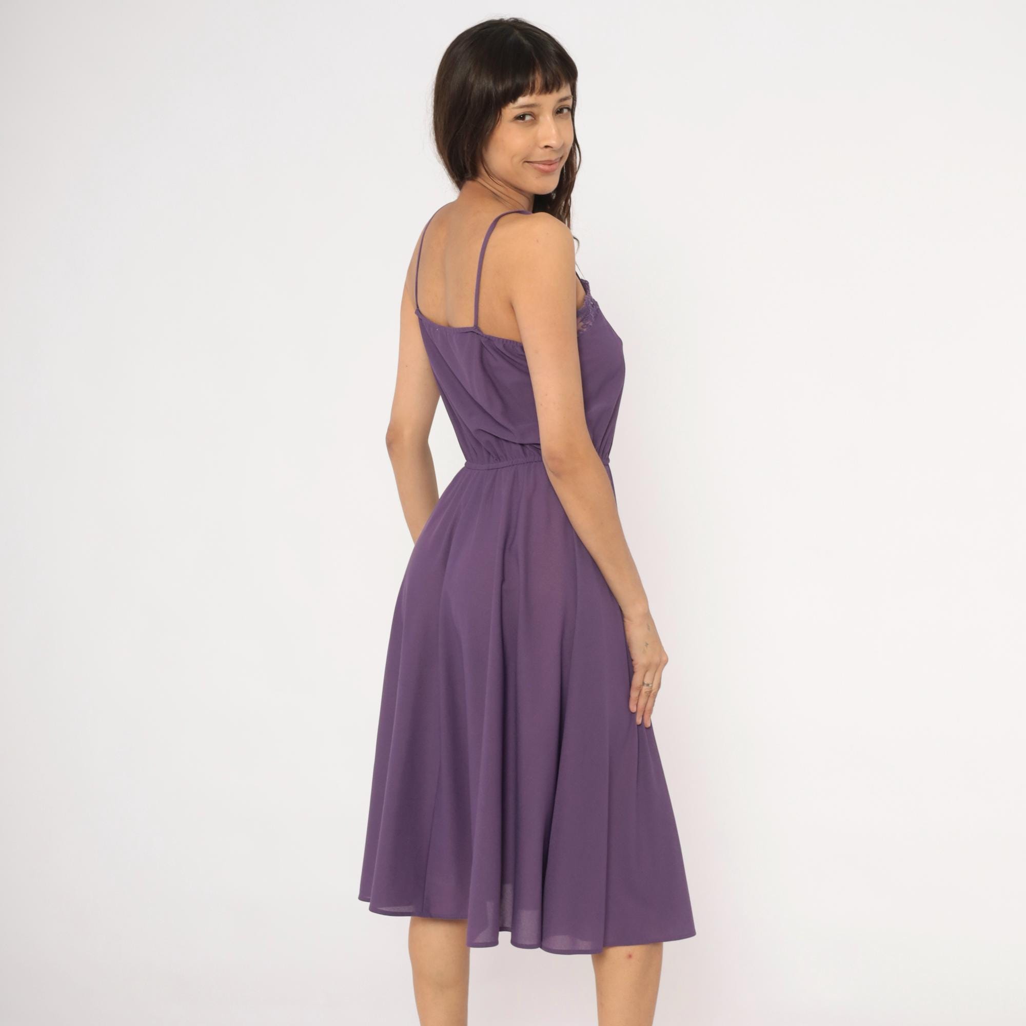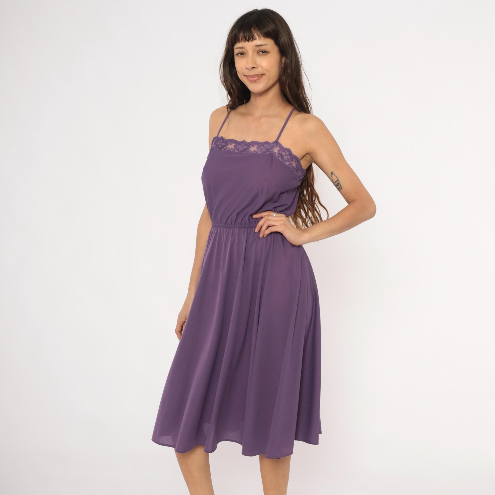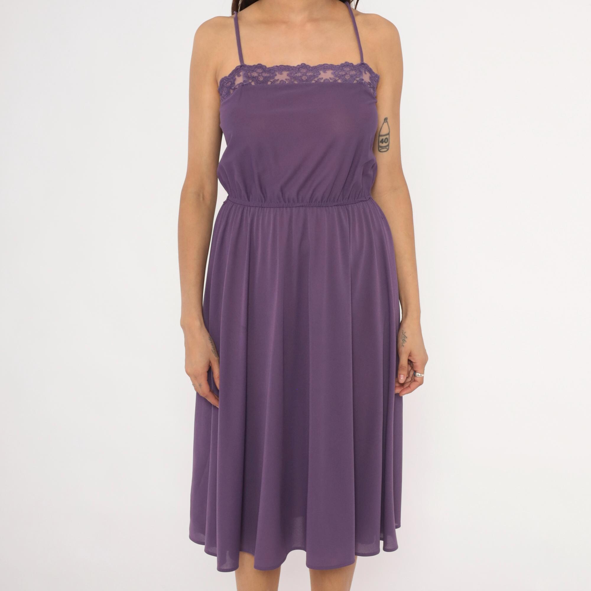 Purple spaghetti strap dress with a floral lace trim along the straight neckline. Elastic gathered waist with a blouson bodice and an A-line skirt falling to knee length. Violet tone throughout with matching lace detail and thin adjustable straps.