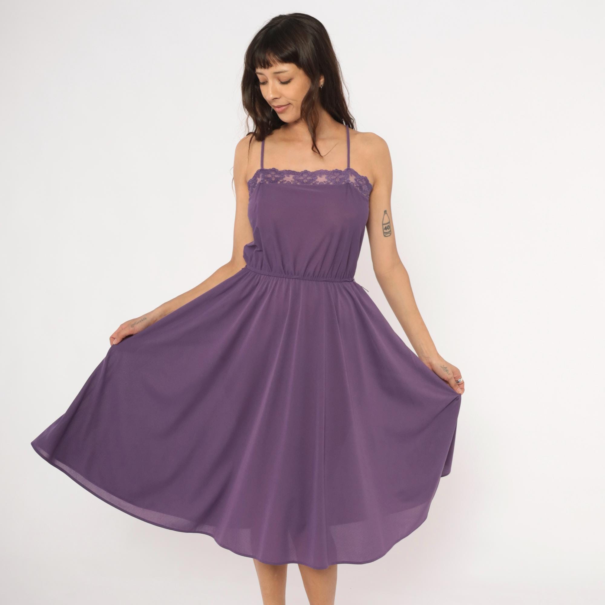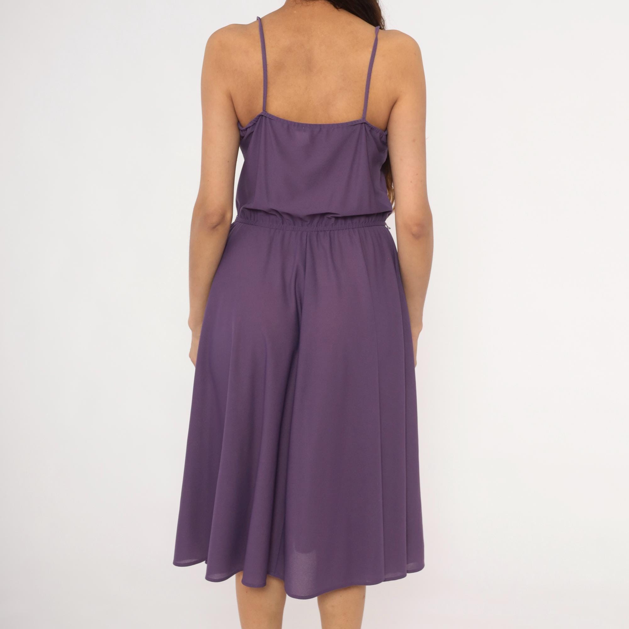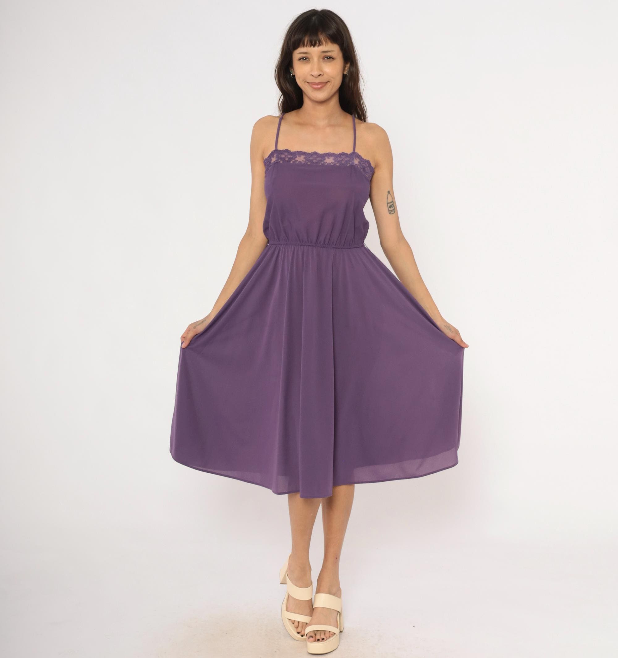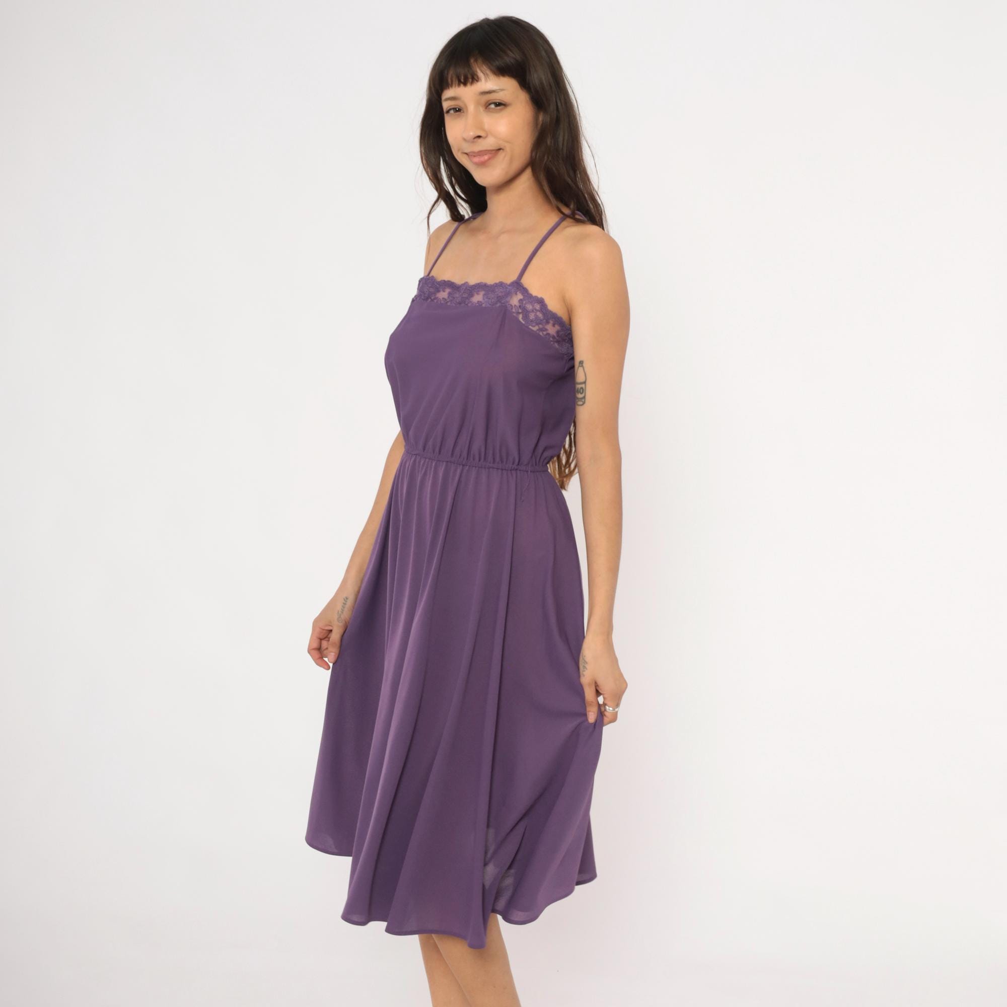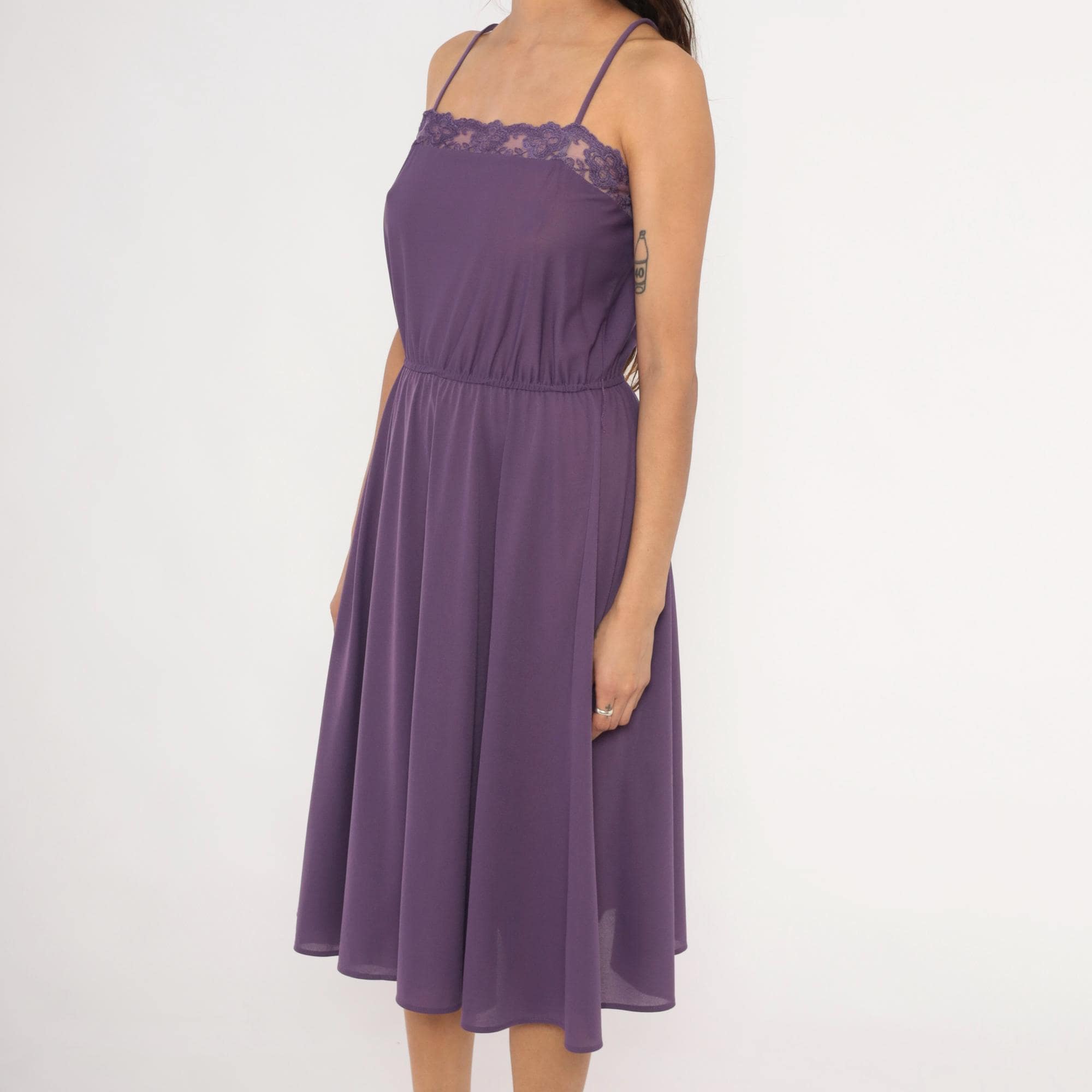 Purple spaghetti strap dress with a floral lace trim along the straight neckline. Elastic gathered waist with a blouson bodice and an A-line skirt falling to knee length. Violet tone throughout with matching lace detail and thin adjustable straps.