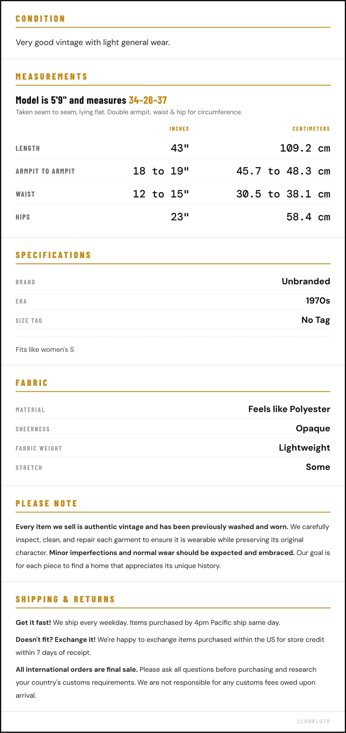 Measurements are taken laying flat and should be doubled where applicable. The "best fits" size is just an estimate, and vintage sizing can vary from modern sizing. Please use measurements to ensure proper fit. The best thing to do is measure a similar item of your own, and compare. When an item has stretch, we will list the unstretched dimensions with the stretched measurement afterwards.