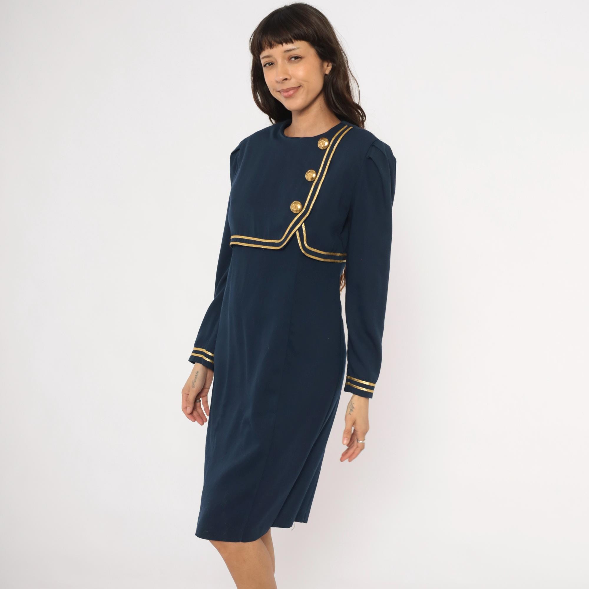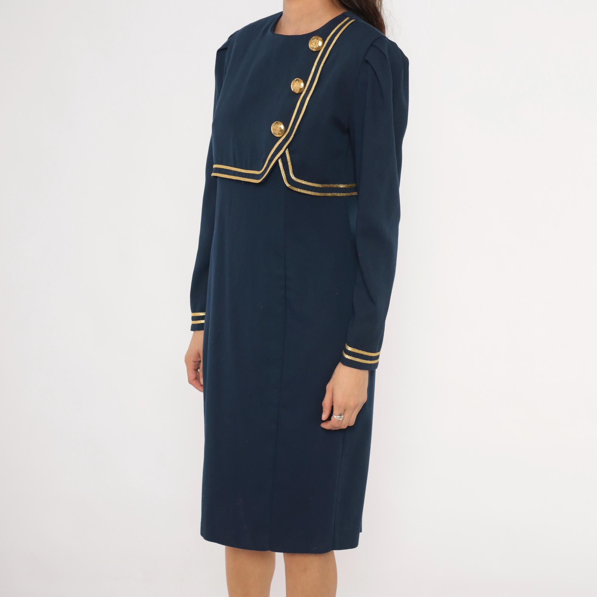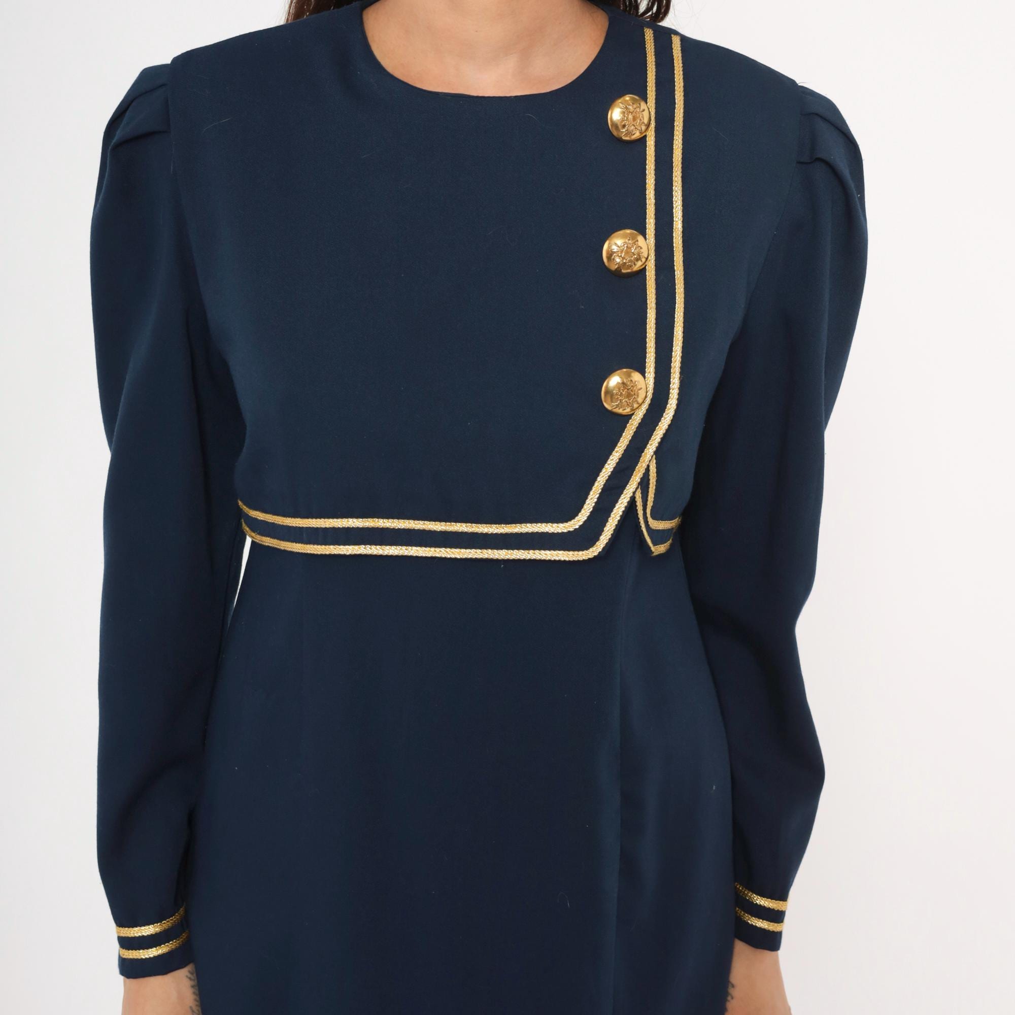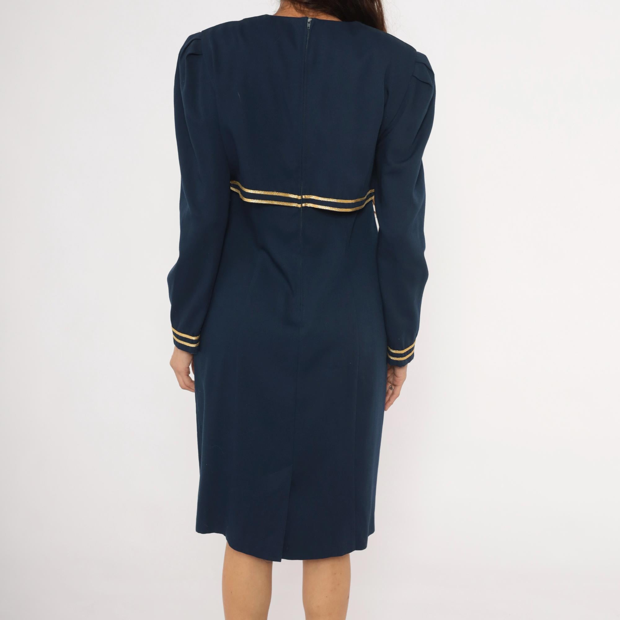 80s navy blue dress with military-inspired gold braided trim across the bodice, waist, cuffs, and hemline. Three decorative gold crest buttons sit along a diagonal front panel with double gold braid edging. Puff shoulders with pleated shoulder caps, long tapered sleeves, round neckline, and back zipper closure. Gold braided trim wraps around the waist and continues across the back.