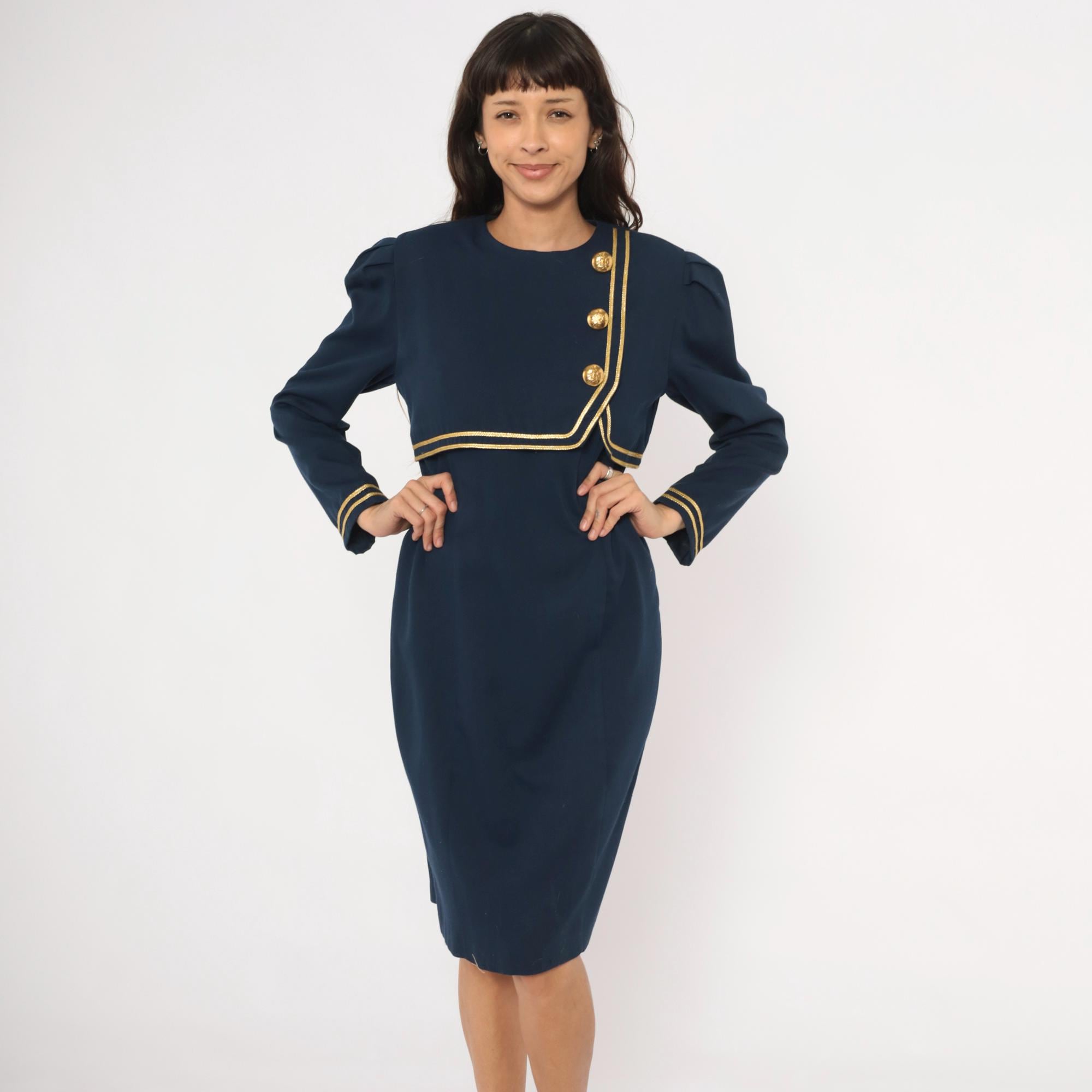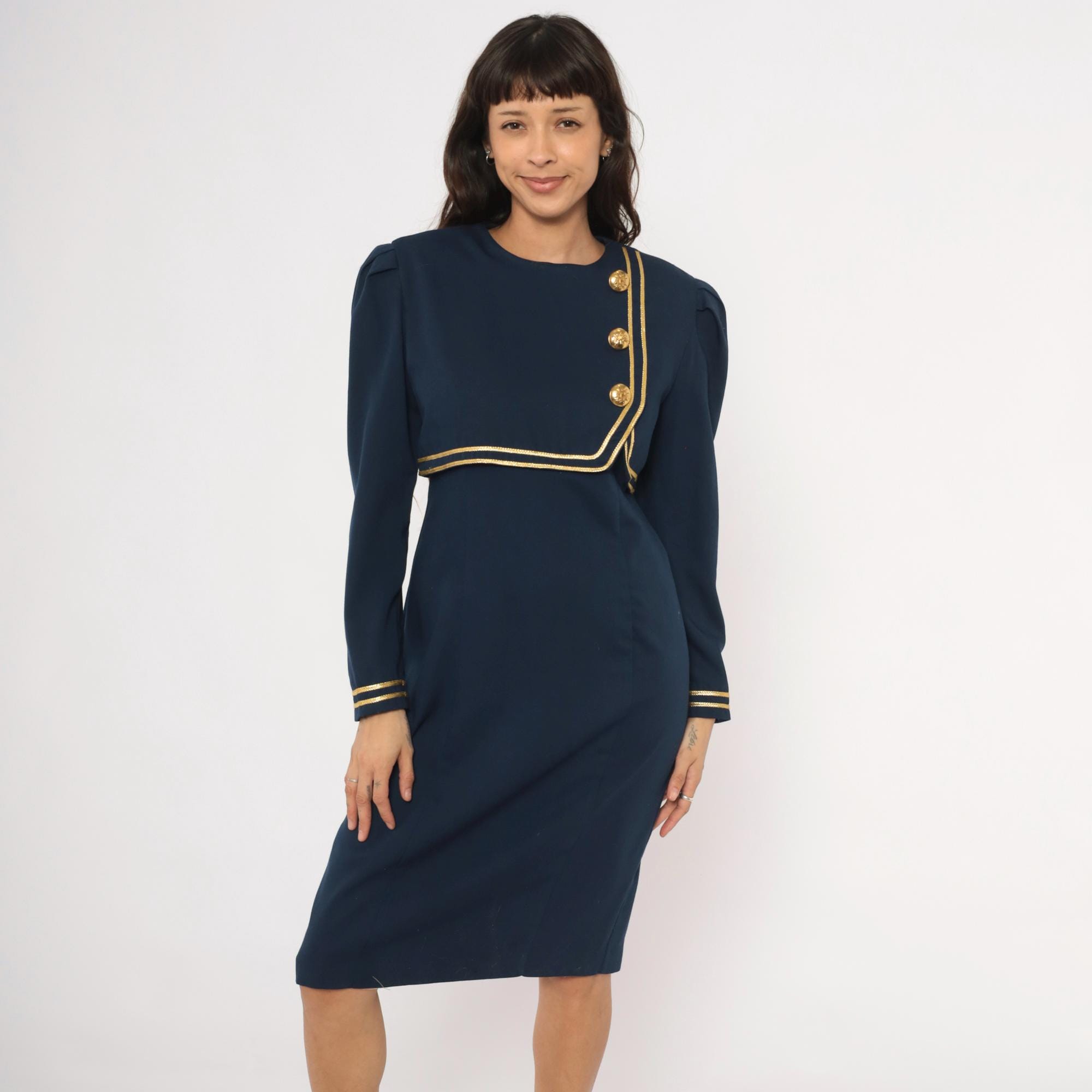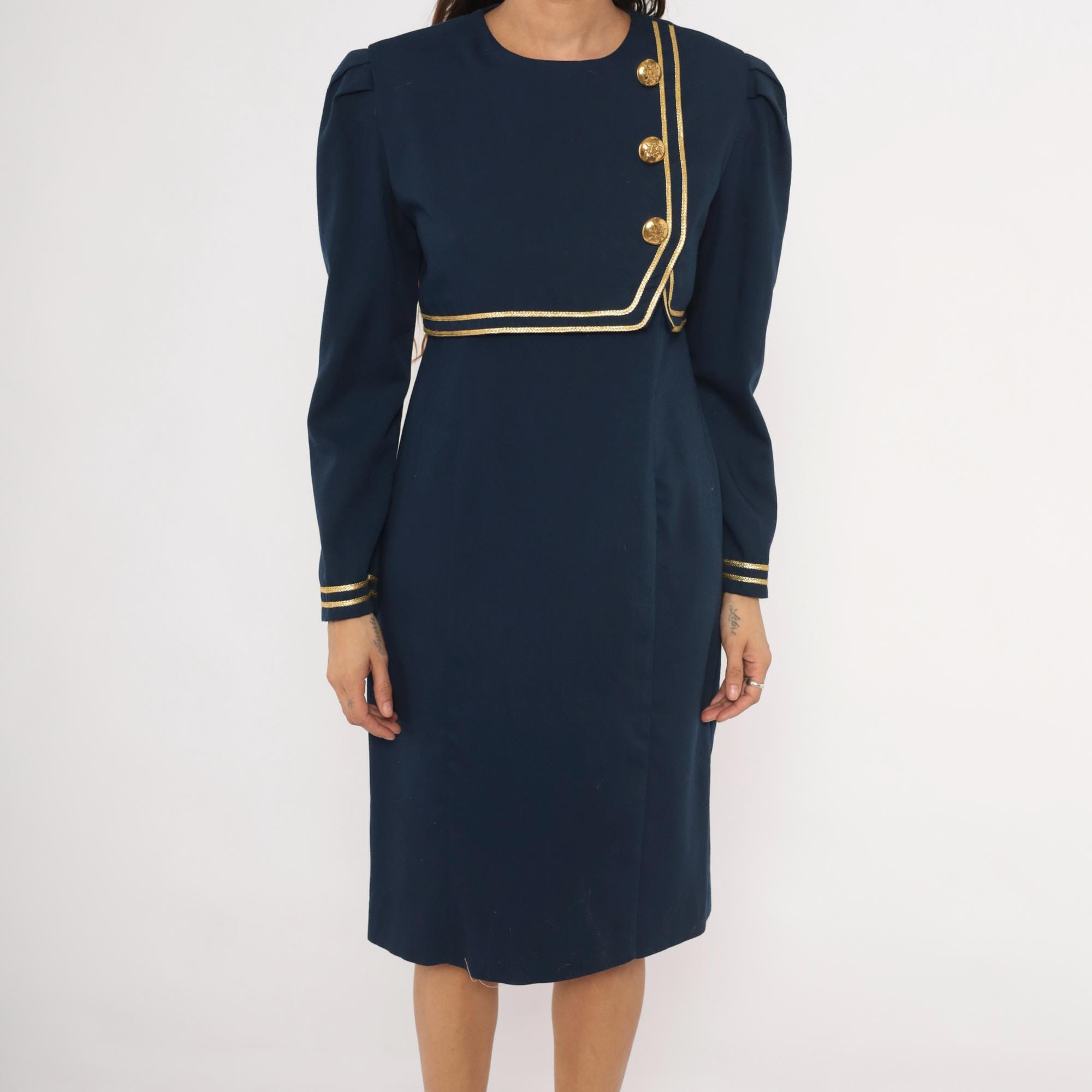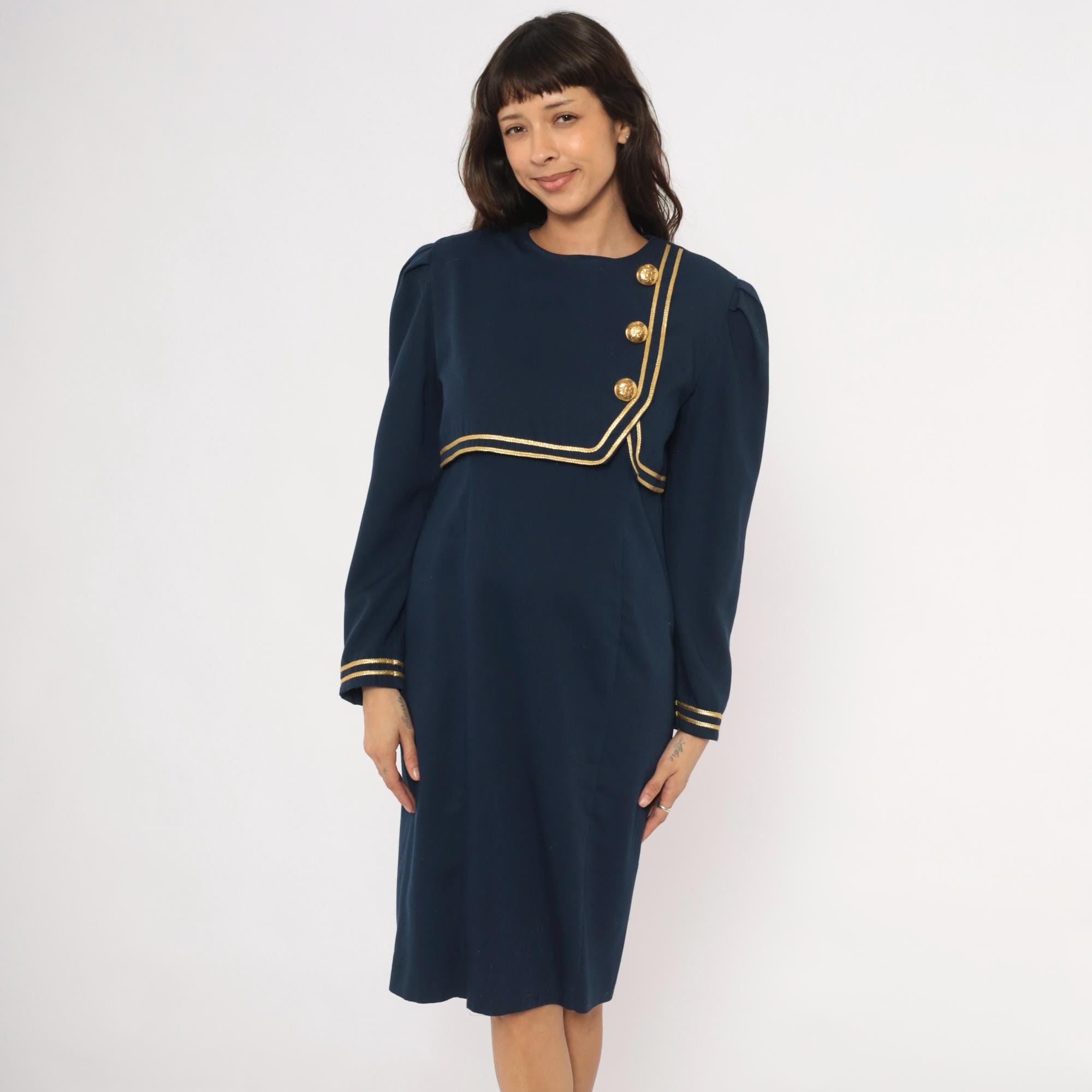 80s navy blue dress with military-inspired gold braided trim across the bodice, waist, cuffs, and hemline. Three decorative gold crest buttons sit along a diagonal front panel with double gold braid edging. Puff shoulders with pleated shoulder caps, long tapered sleeves, round neckline, and back zipper closure. Gold braided trim wraps around the waist and continues across the back.