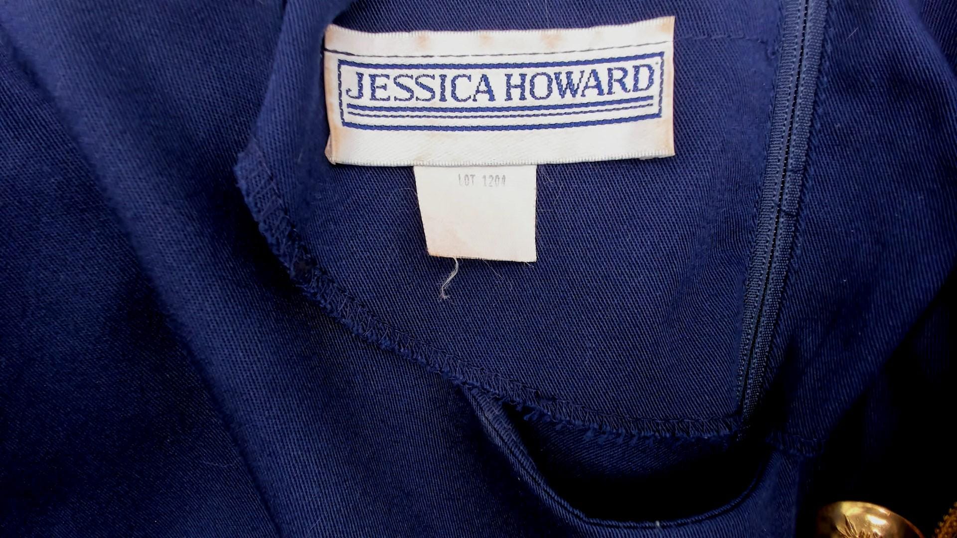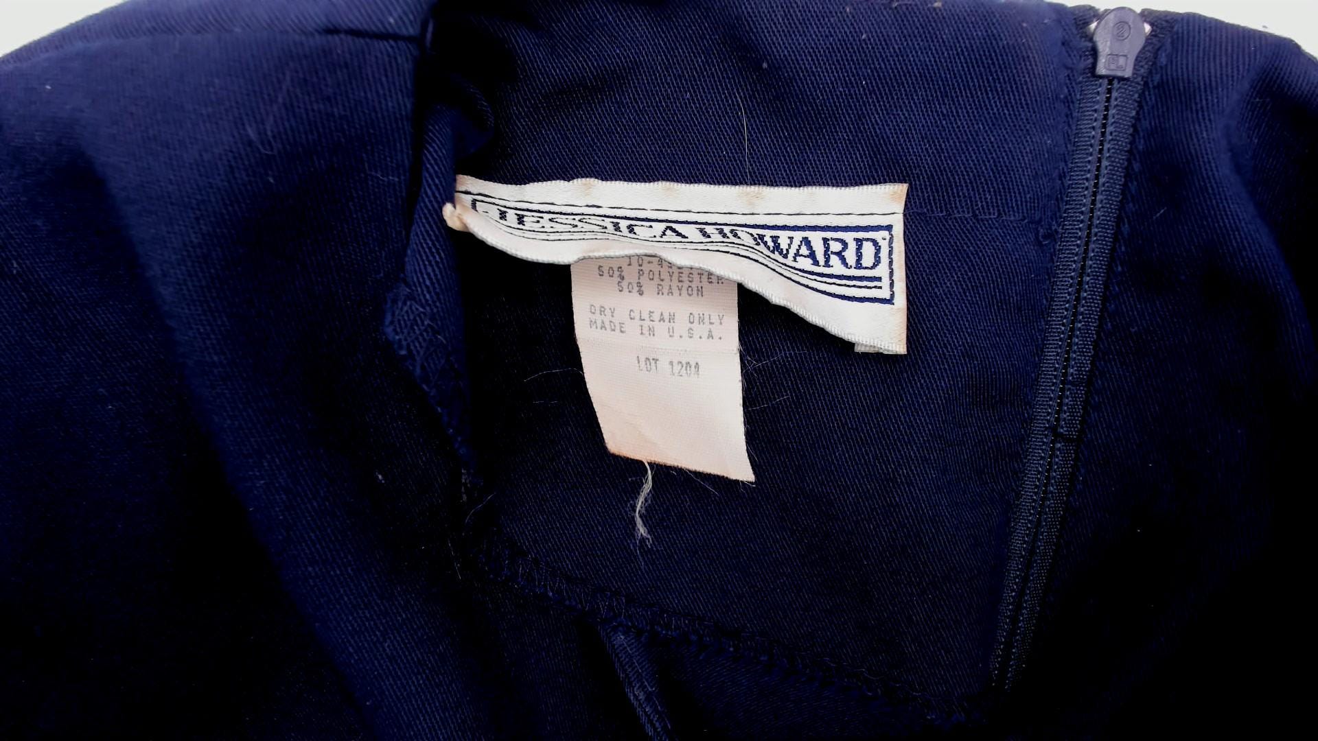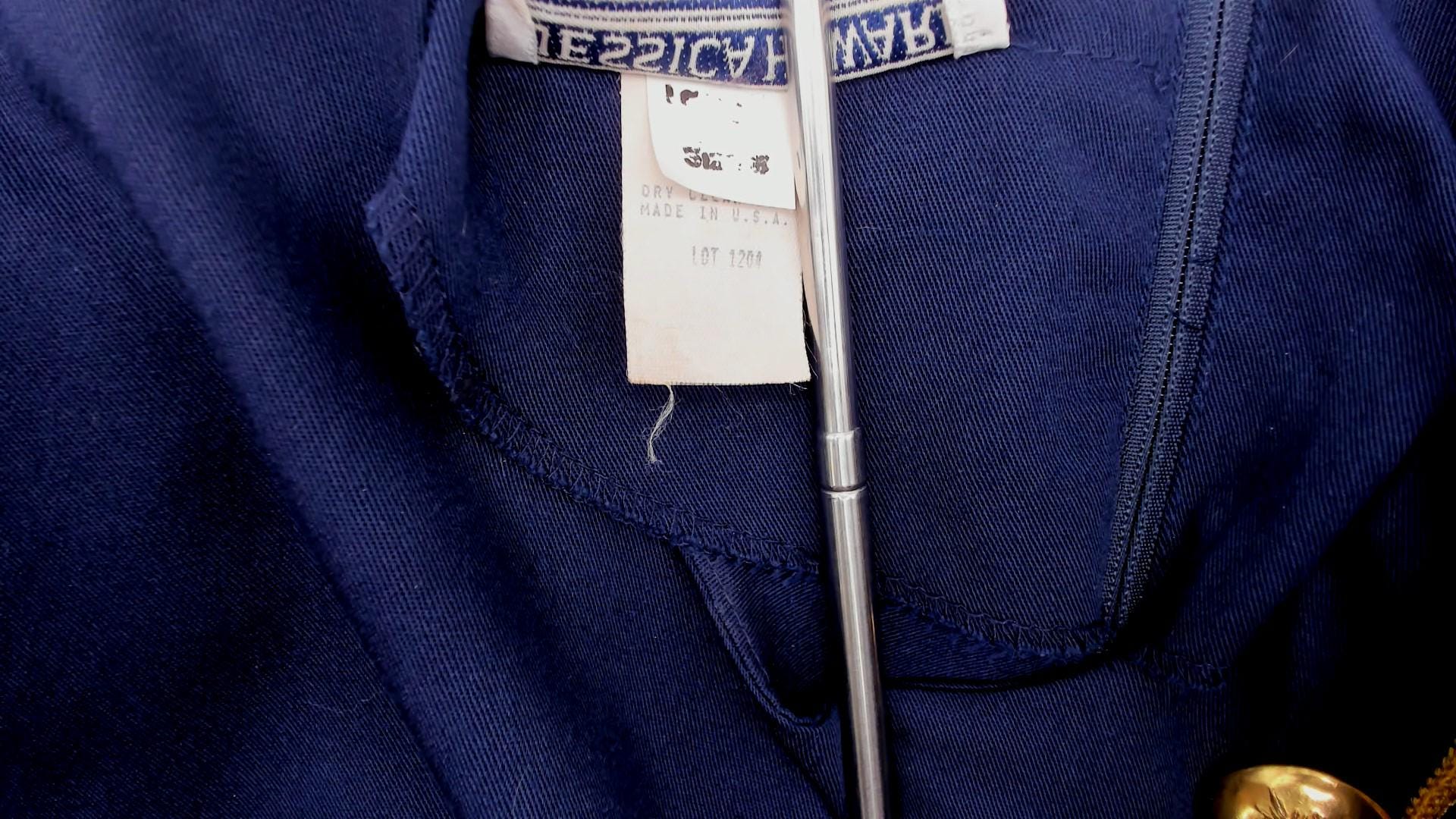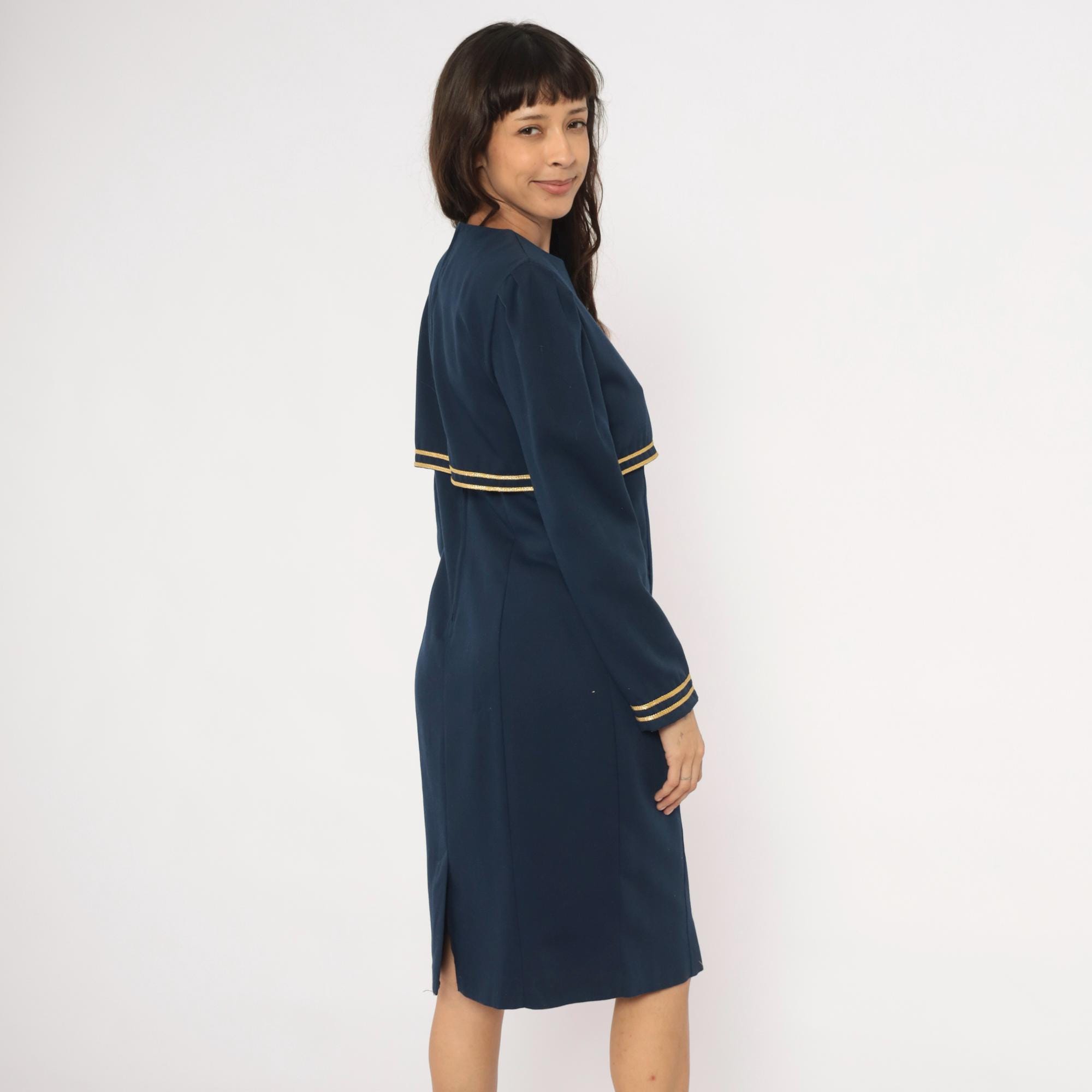 80s navy blue dress with military-inspired gold braided trim across the bodice, waist, cuffs, and hemline. Three decorative gold crest buttons sit along a diagonal front panel with double gold braid edging. Puff shoulders with pleated shoulder caps, long tapered sleeves, round neckline, and back zipper closure. Gold braided trim wraps around the waist and continues across the back.