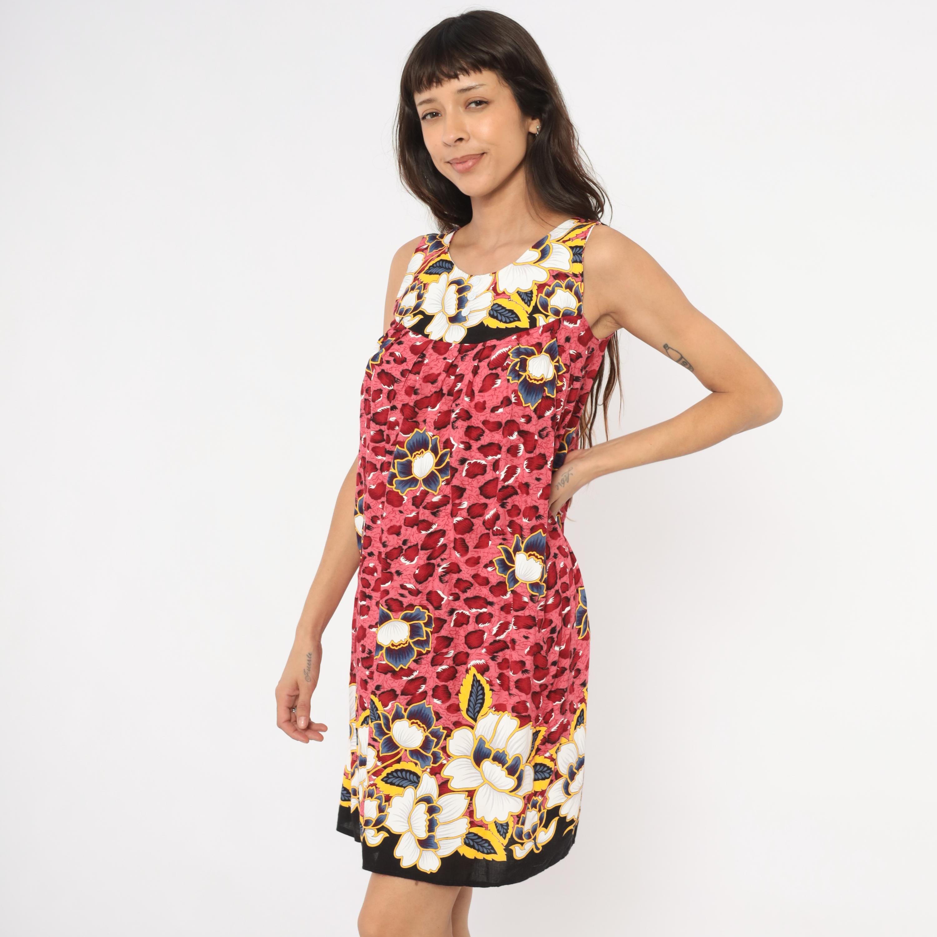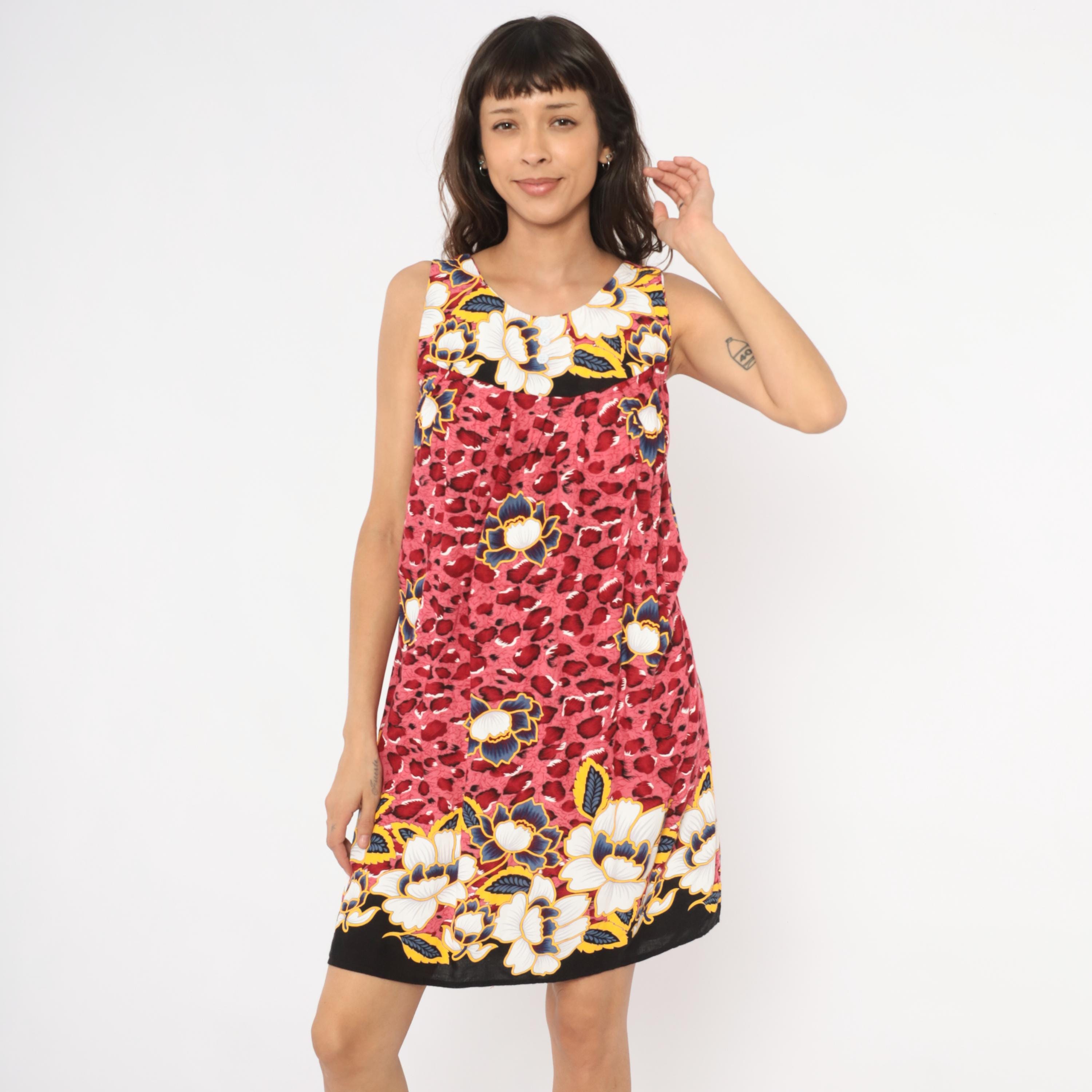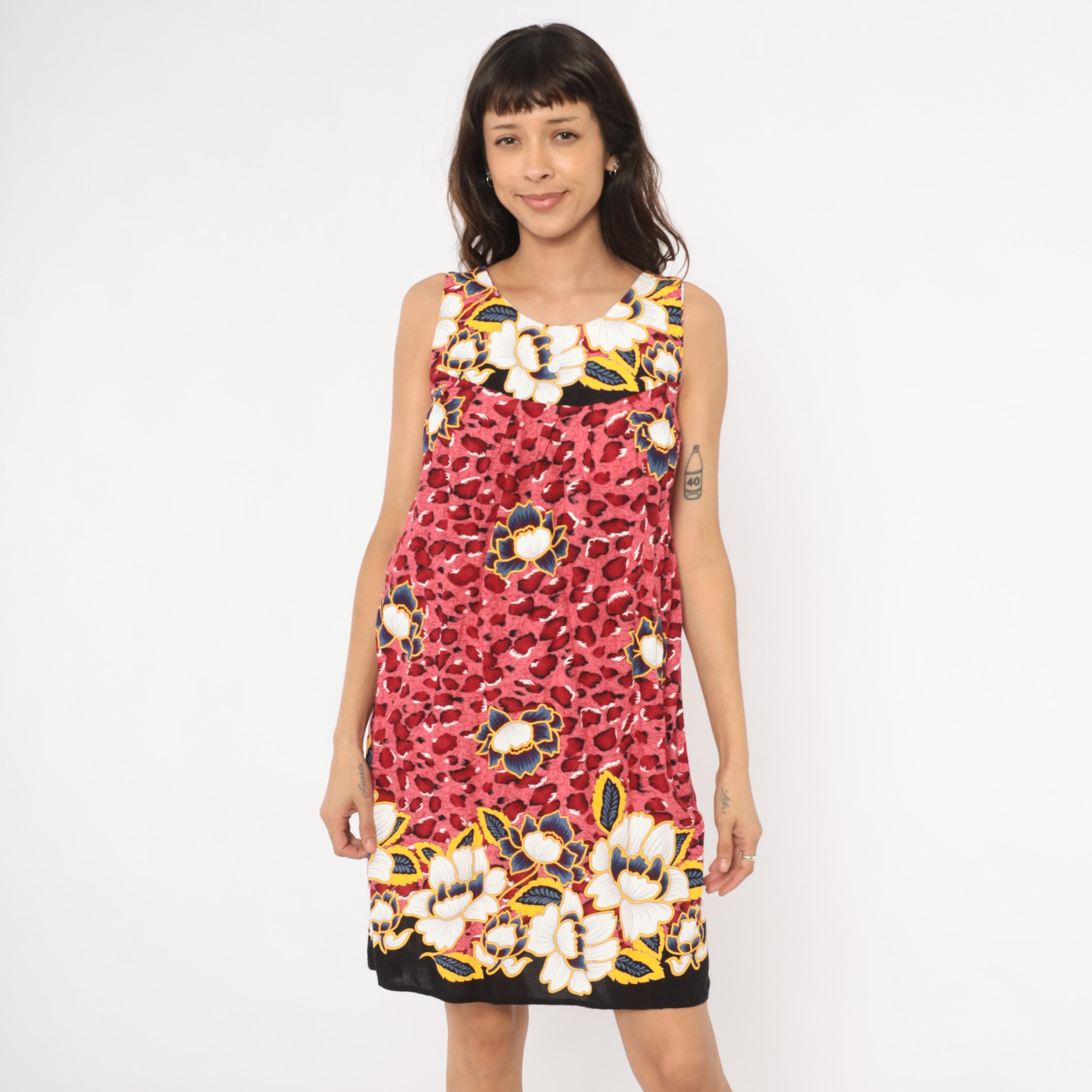 Pink and deep red leopard print sleeveless dress with large navy, gold, white, and cream floral motifs scattered across the body. Scoop neckline with small button detail at center front, gathered bust seam, and loose A-line silhouette. Floral border print bands at the neckline and hemline sit against a black background. Knee-length cut with wide tank-style shoulder straps.