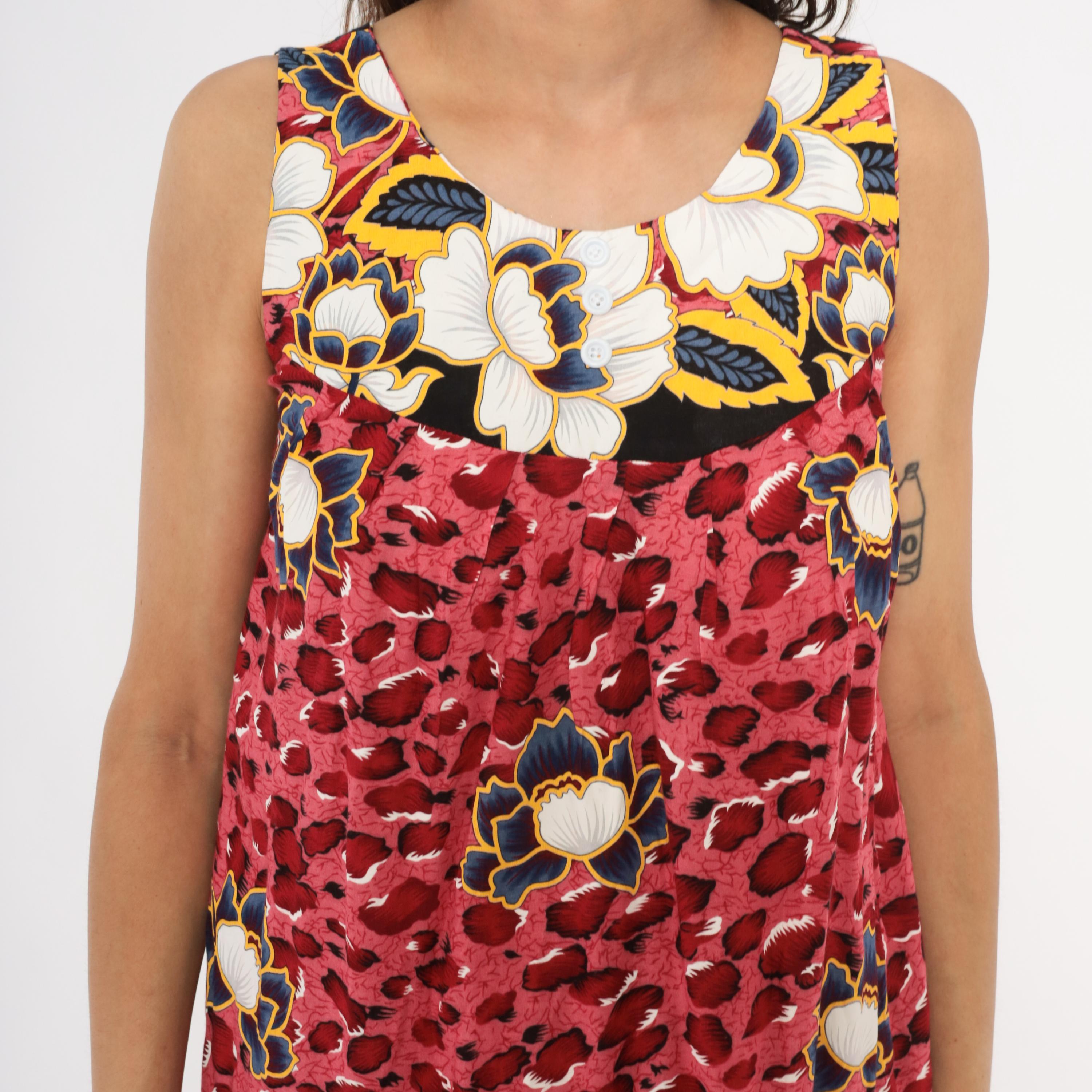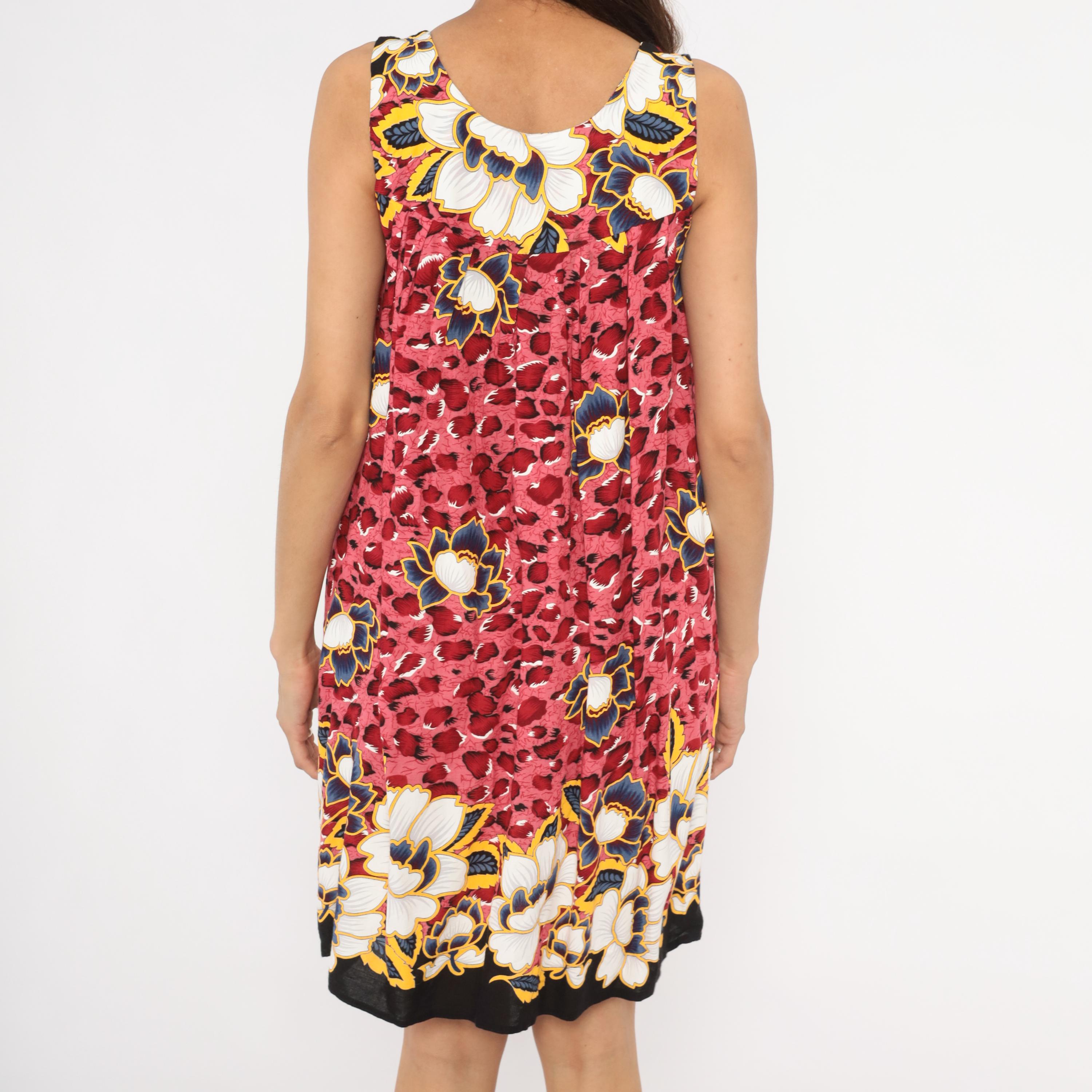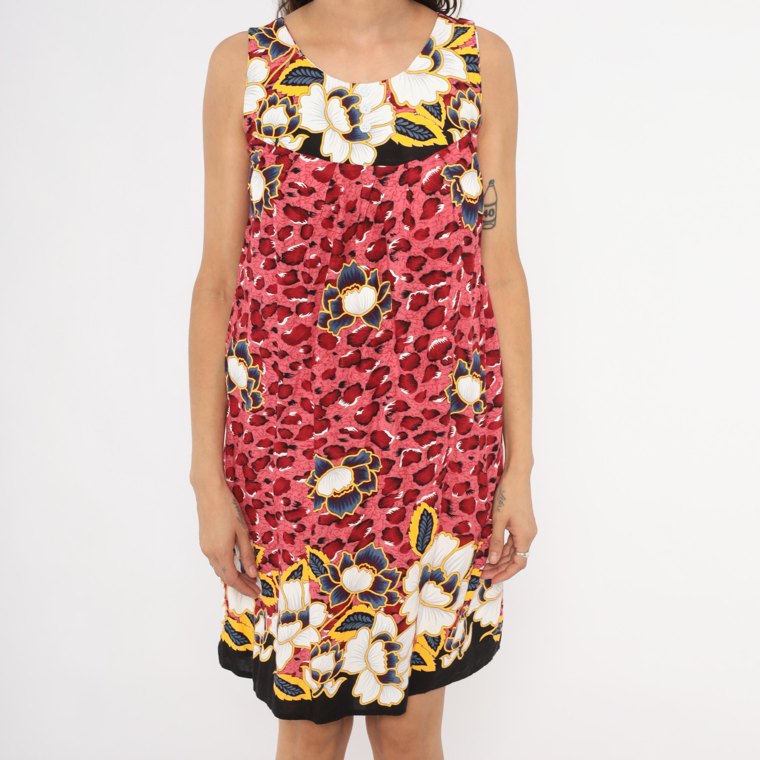 Pink and deep red leopard print sleeveless dress with large navy, gold, white, and cream floral motifs scattered across the body. Scoop neckline with small button detail at center front, gathered bust seam, and loose A-line silhouette. Floral border print bands at the neckline and hemline sit against a black background. Knee-length cut with wide tank-style shoulder straps.